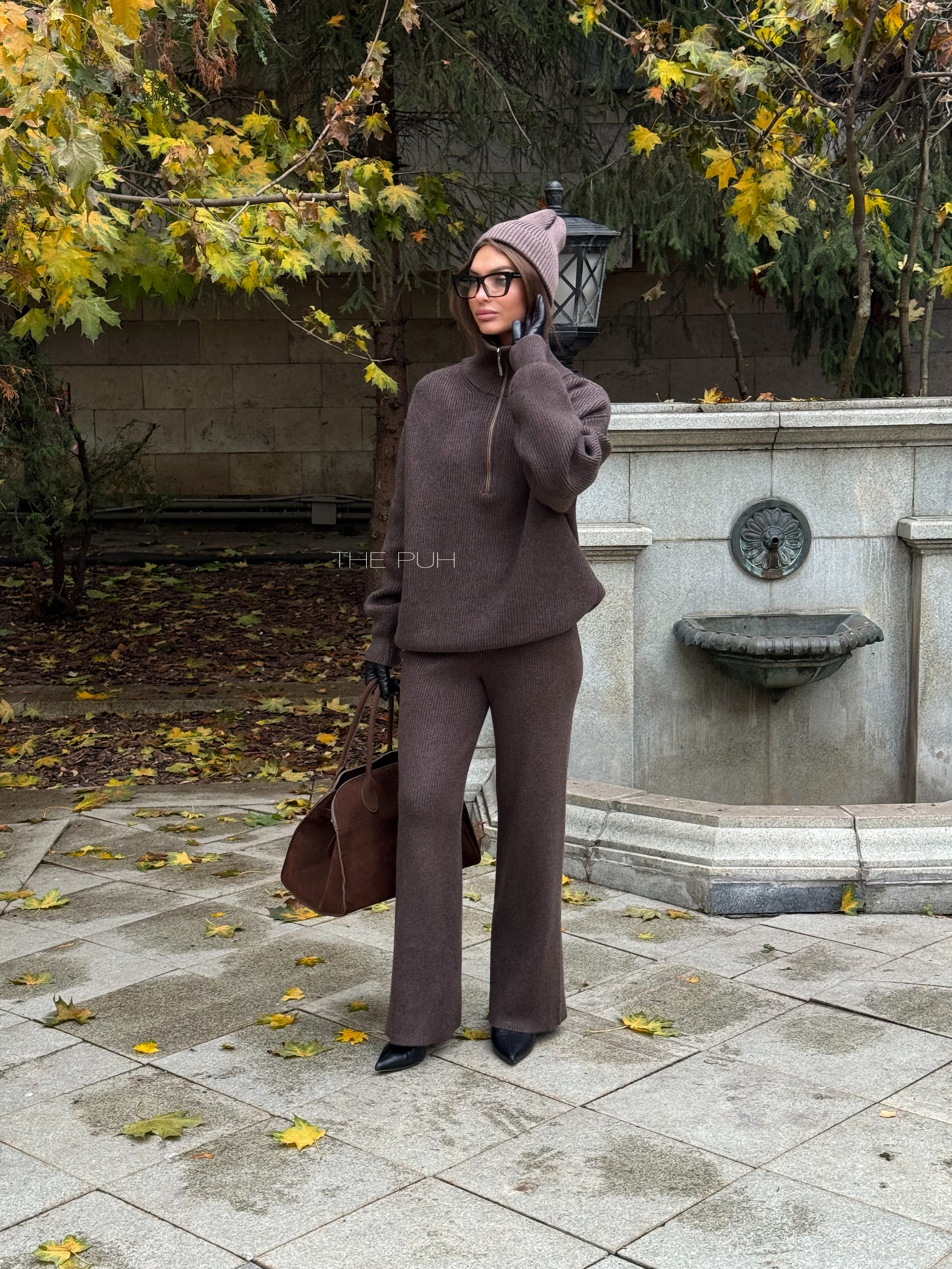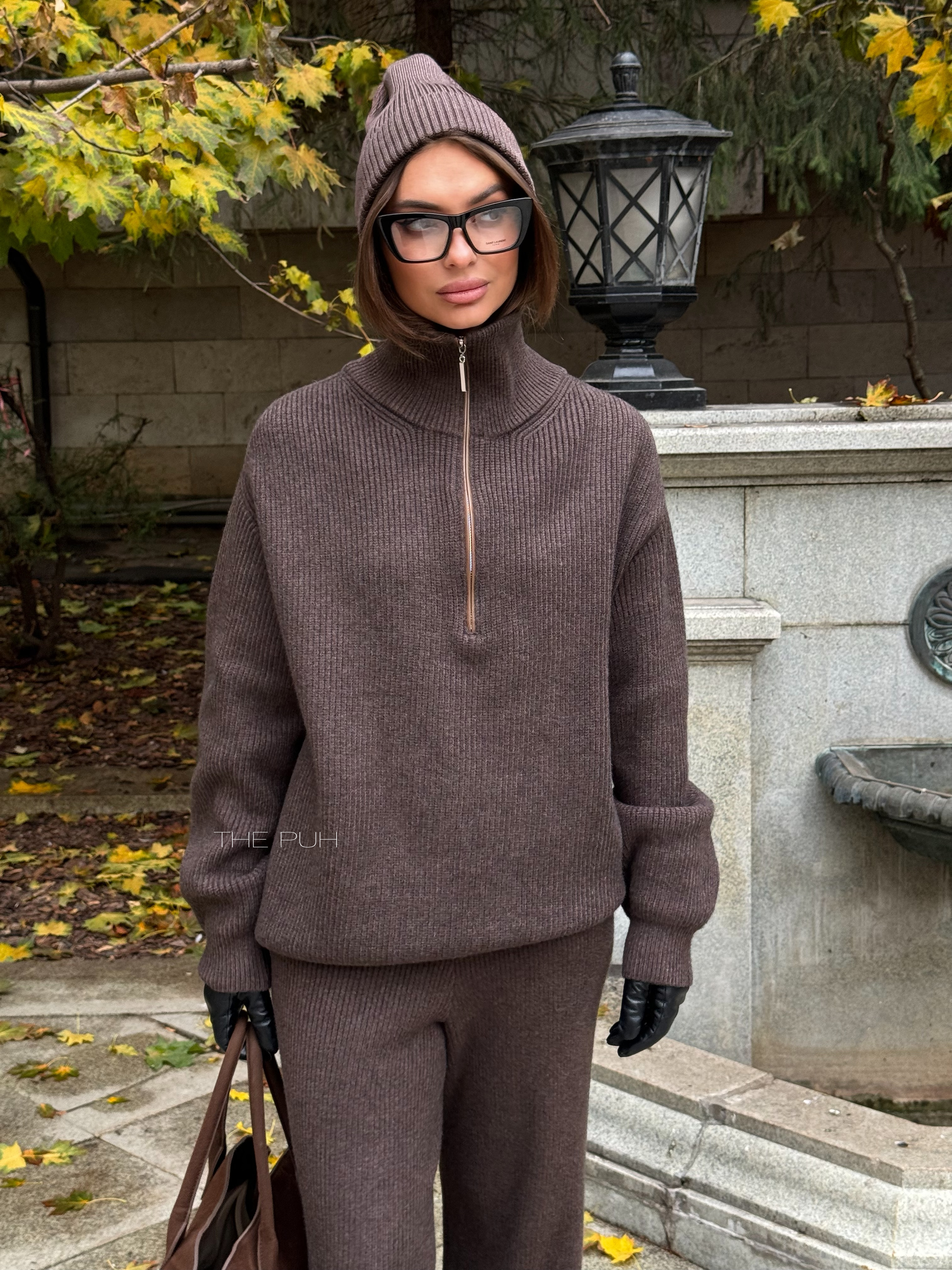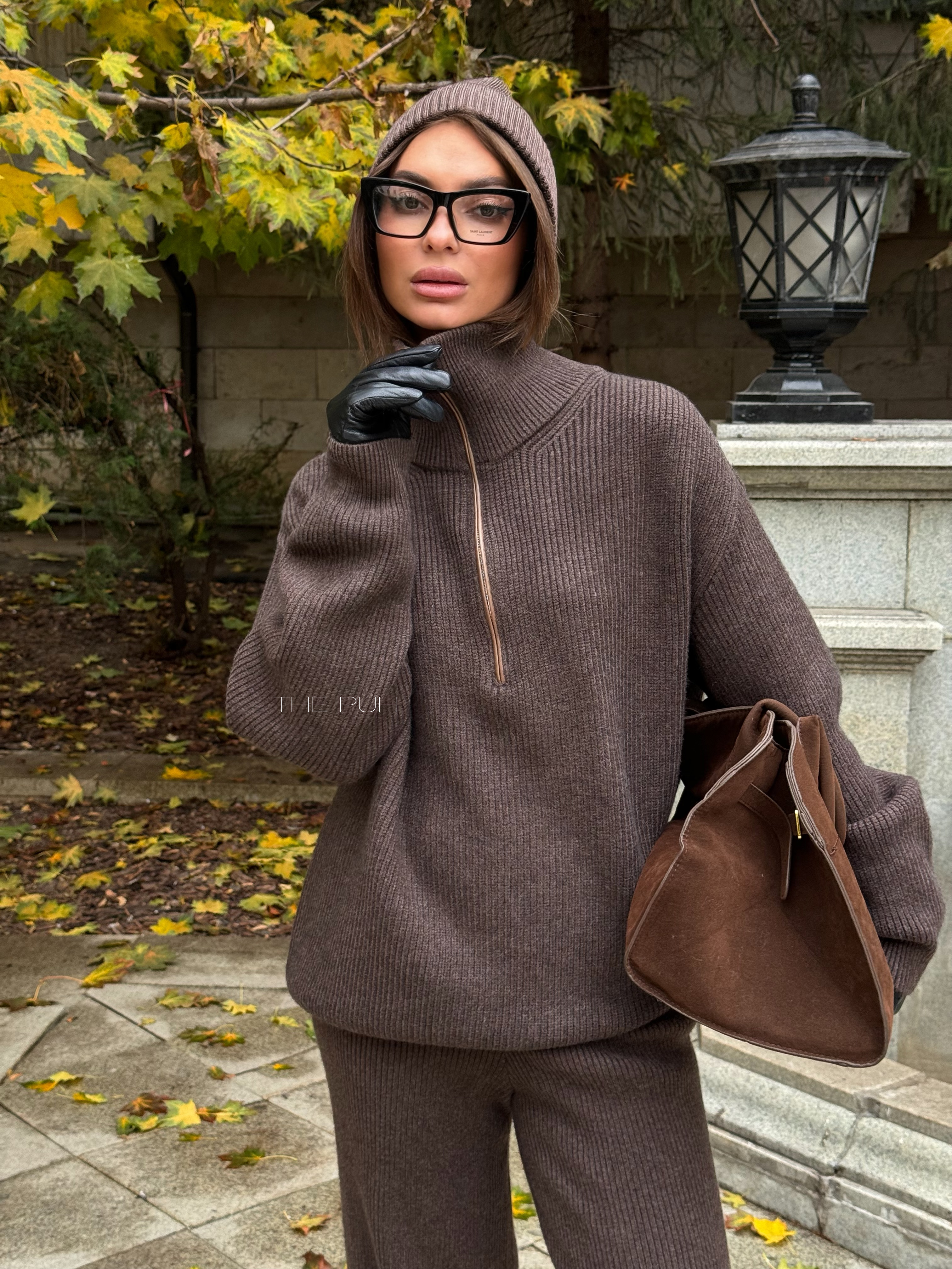 Трикотажный костюм в шоколадном цвете состоит из объемного свитера на молнии и брюк на резинке. Мягкая объемная вязка, свободный крой и удобная посадка создают расслабленный, но стильный образ. Такой комплект идеален для прогулок, встреч с друзьями или отдыха дома – тепло, комфортно и при этом не безлико.