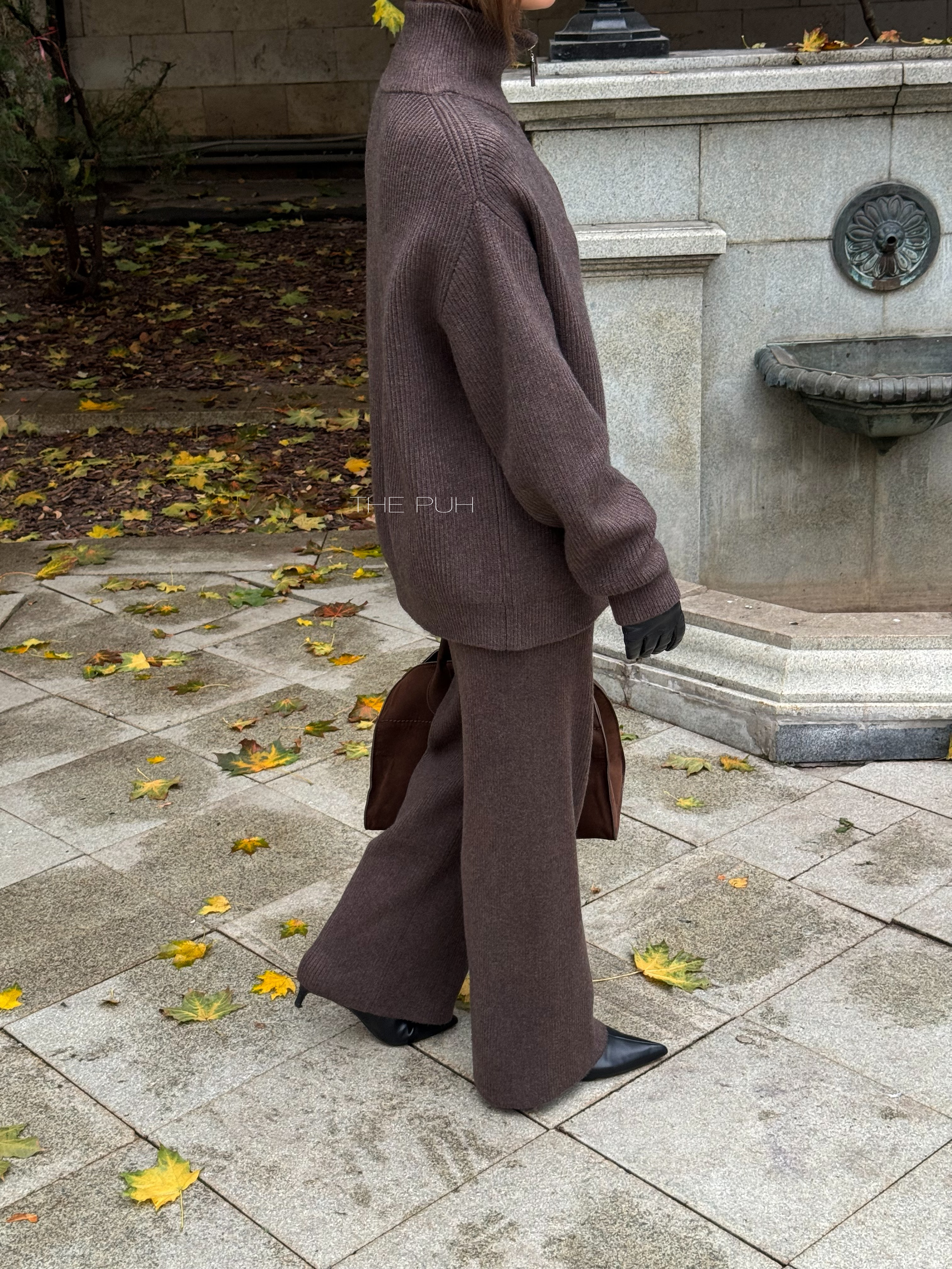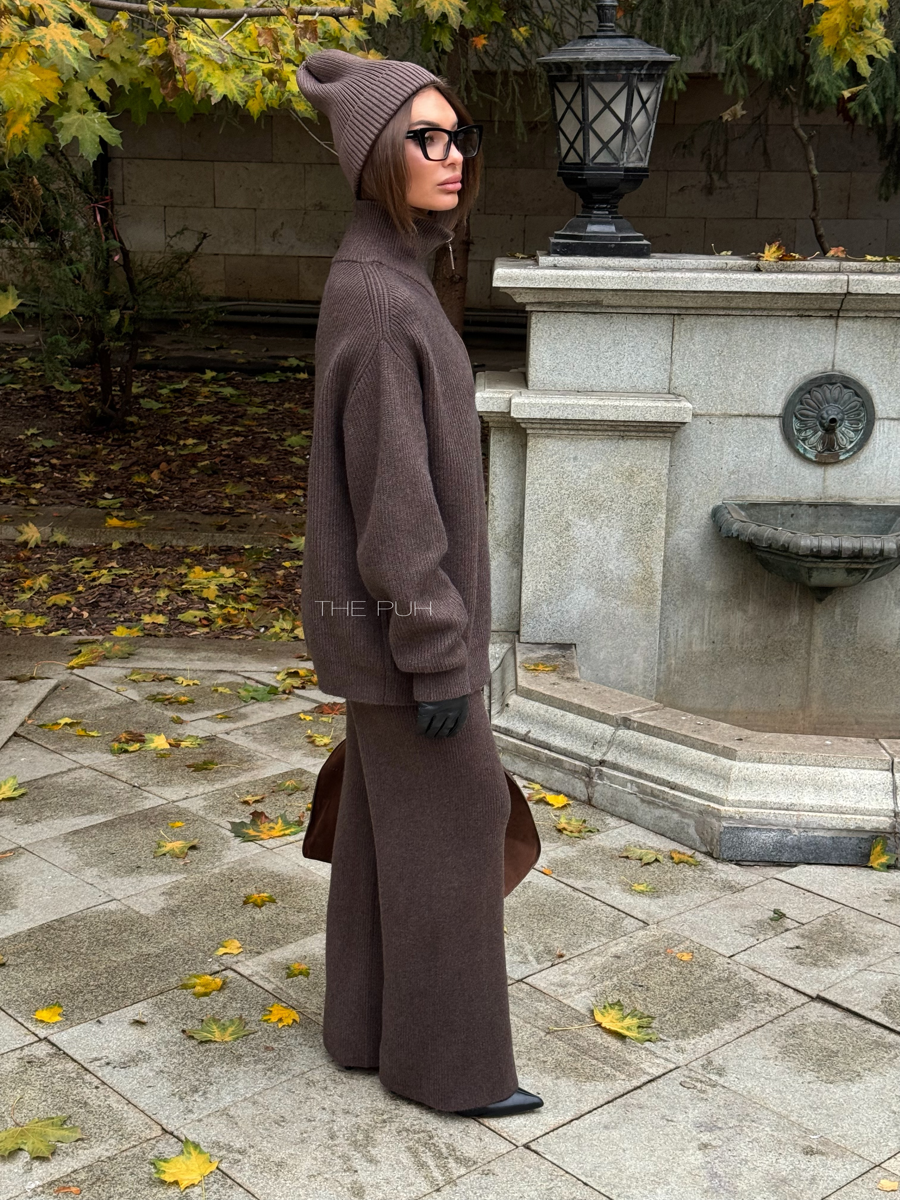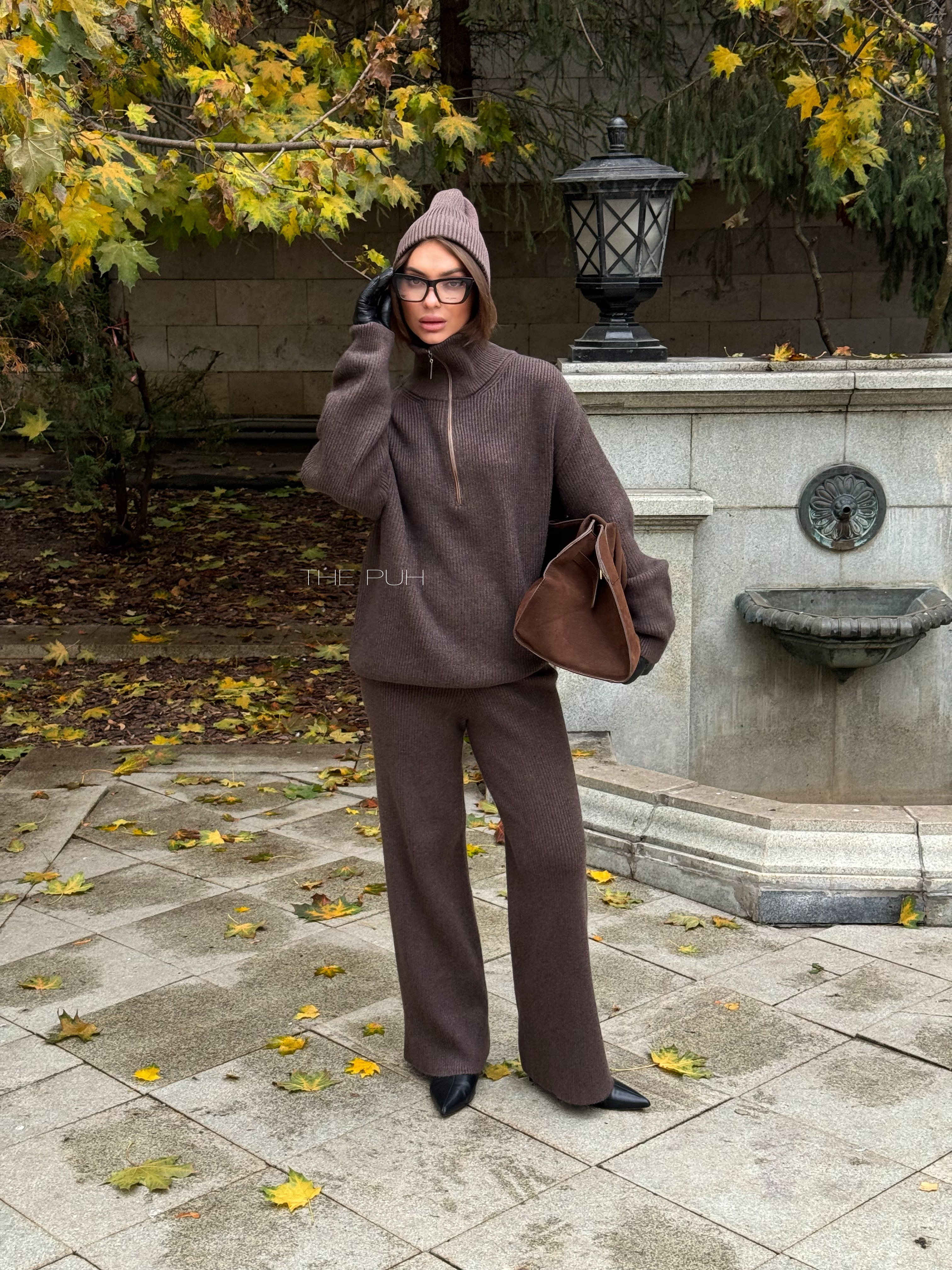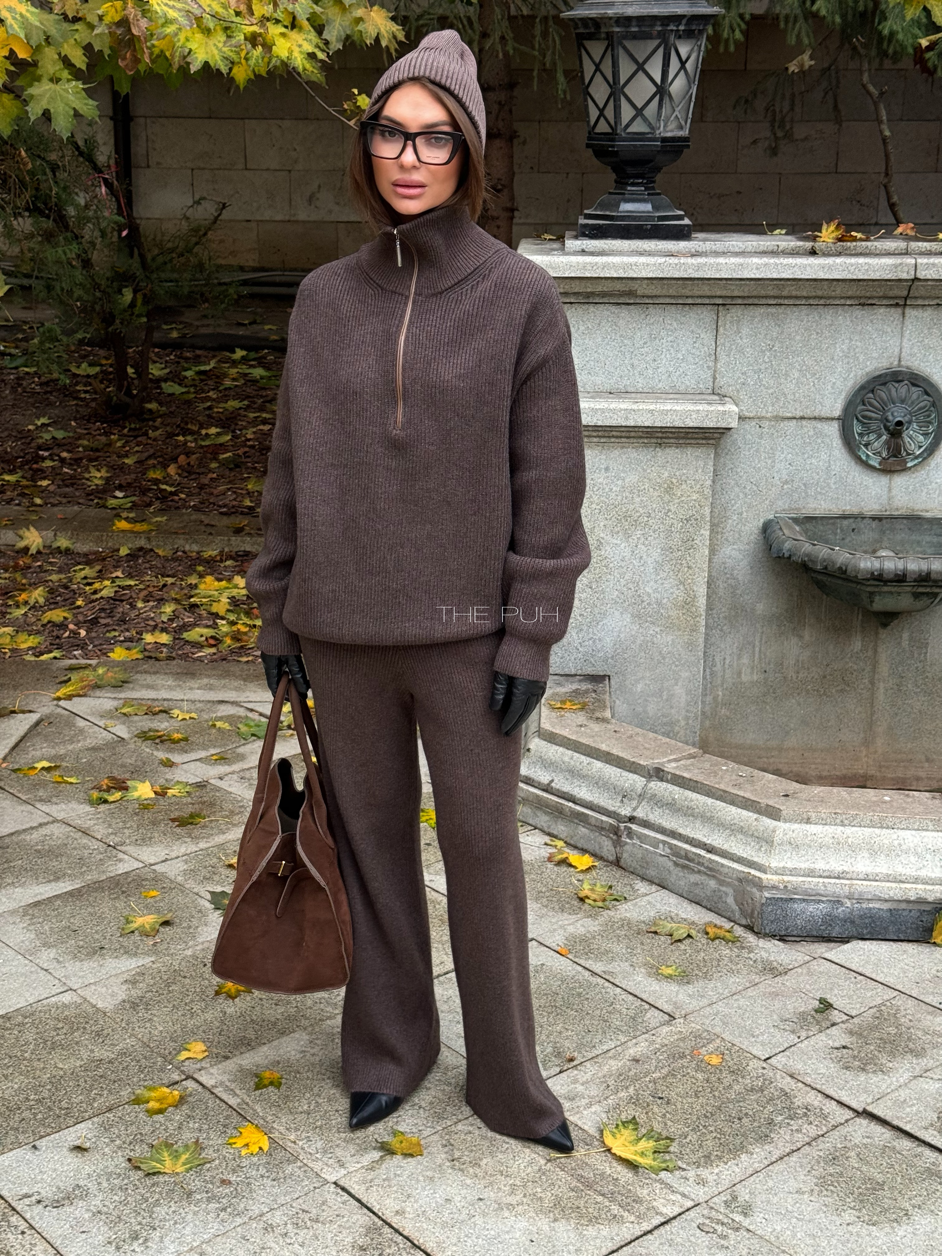 Трикотажный костюм в шоколадном цвете состоит из объемного свитера на молнии и брюк на резинке. Мягкая объемная вязка, свободный крой и удобная посадка создают расслабленный, но стильный образ. Такой комплект идеален для прогулок, встреч с друзьями или отдыха дома – тепло, комфортно и при этом не безлико.