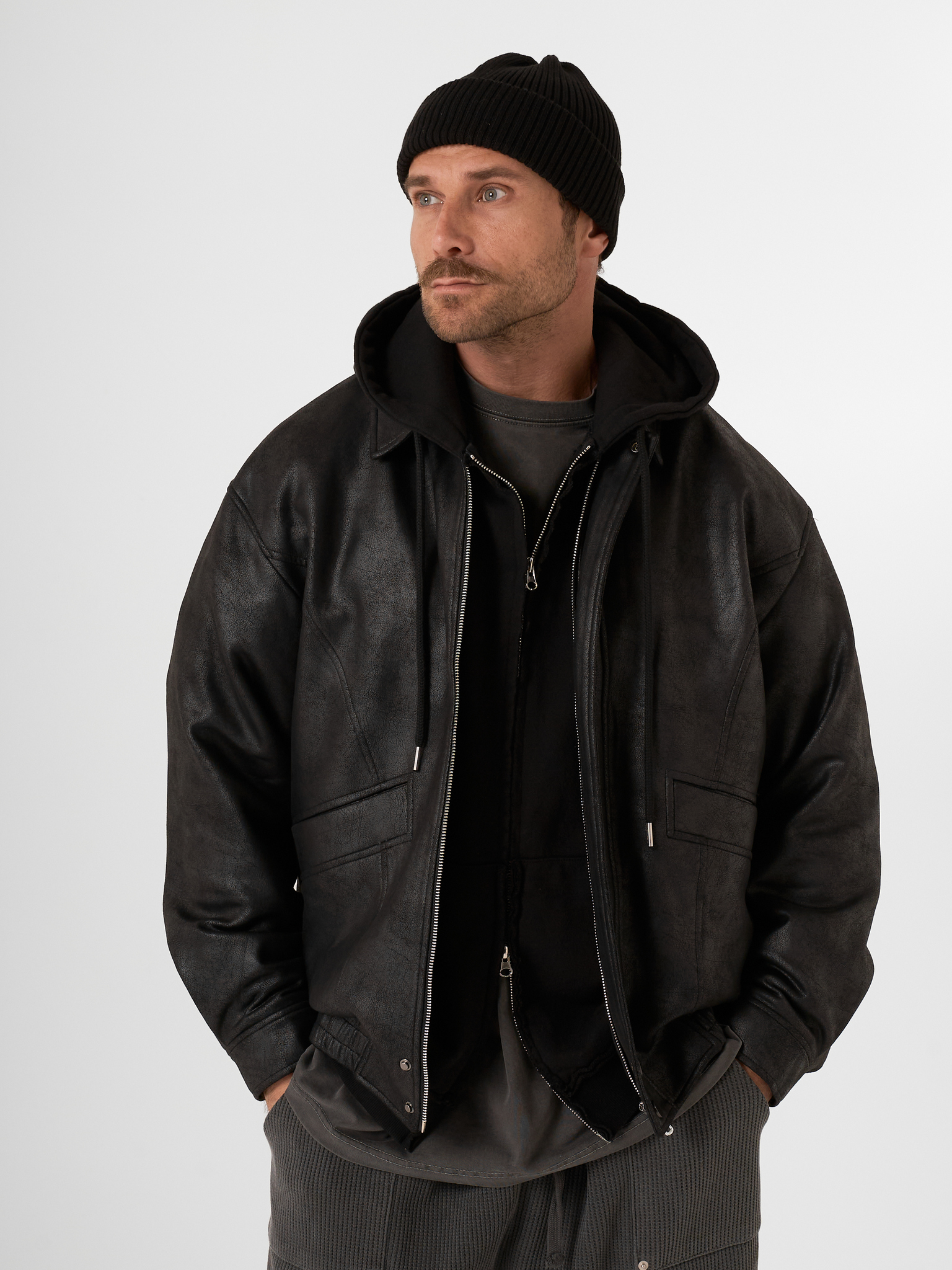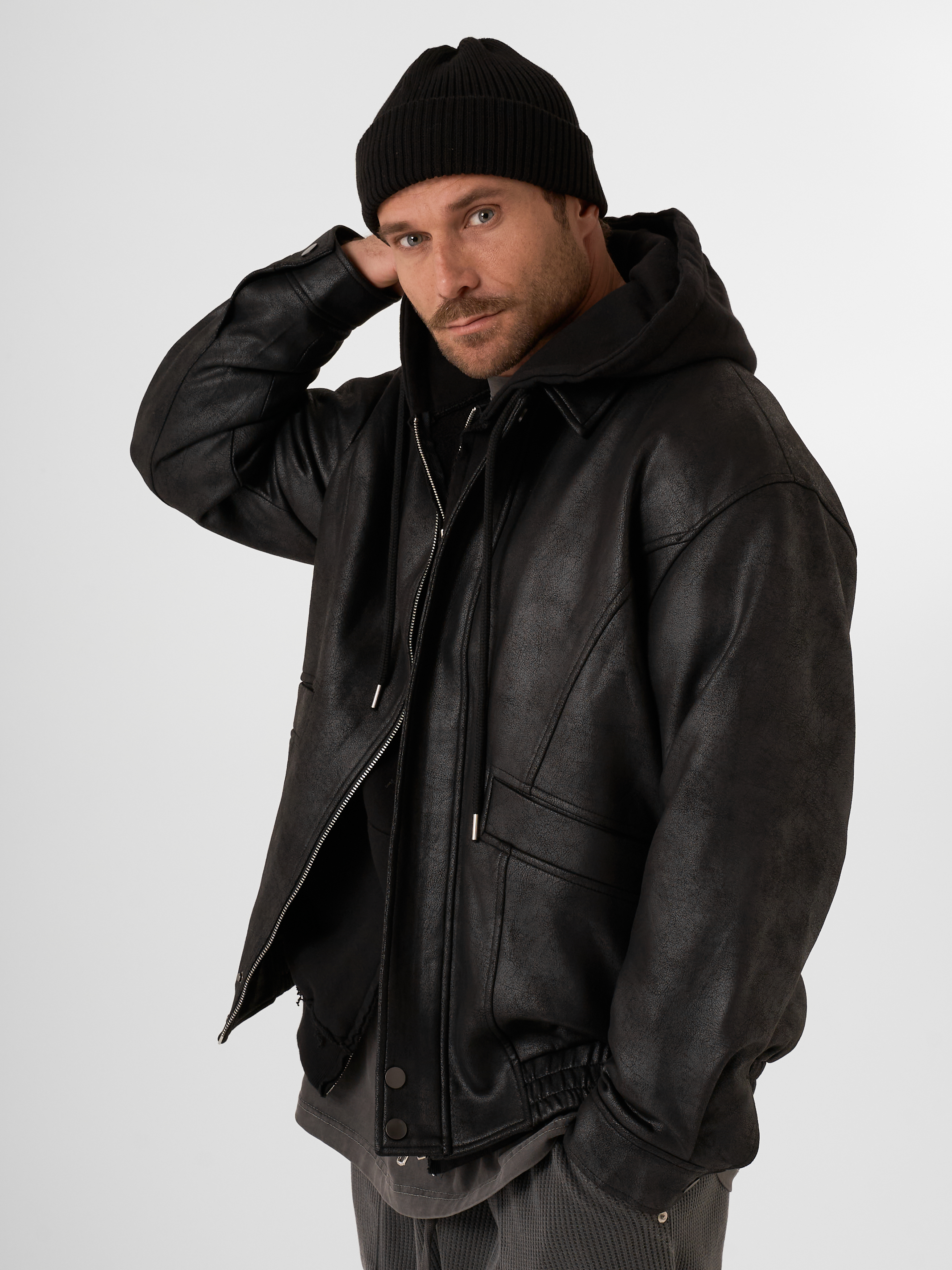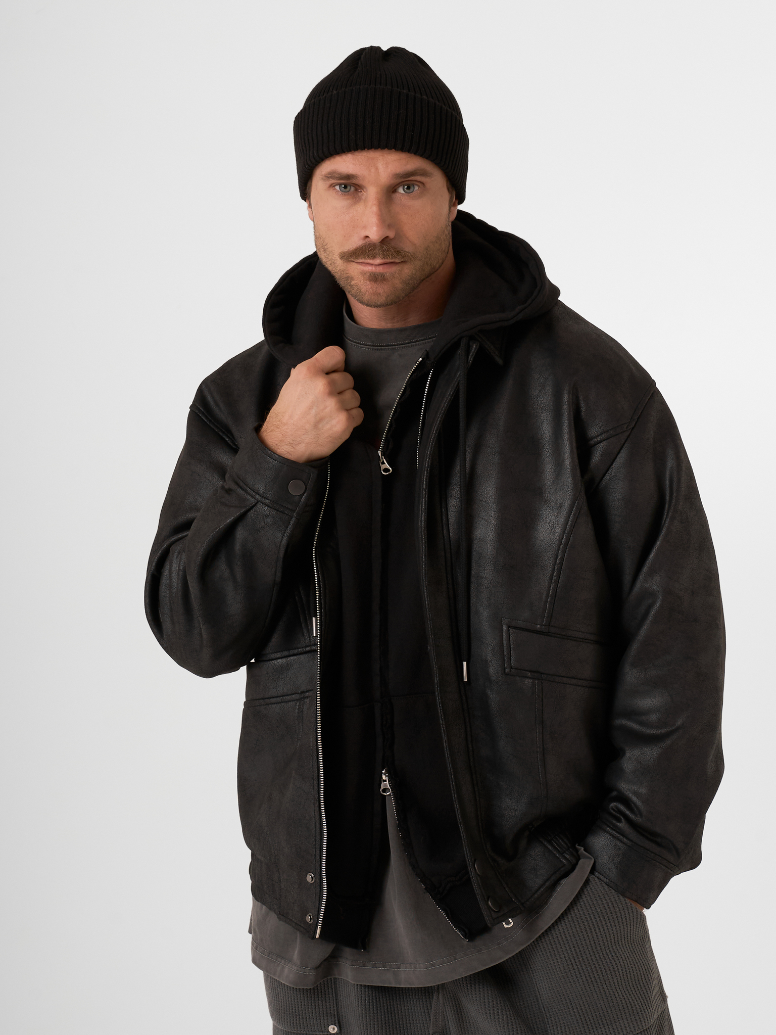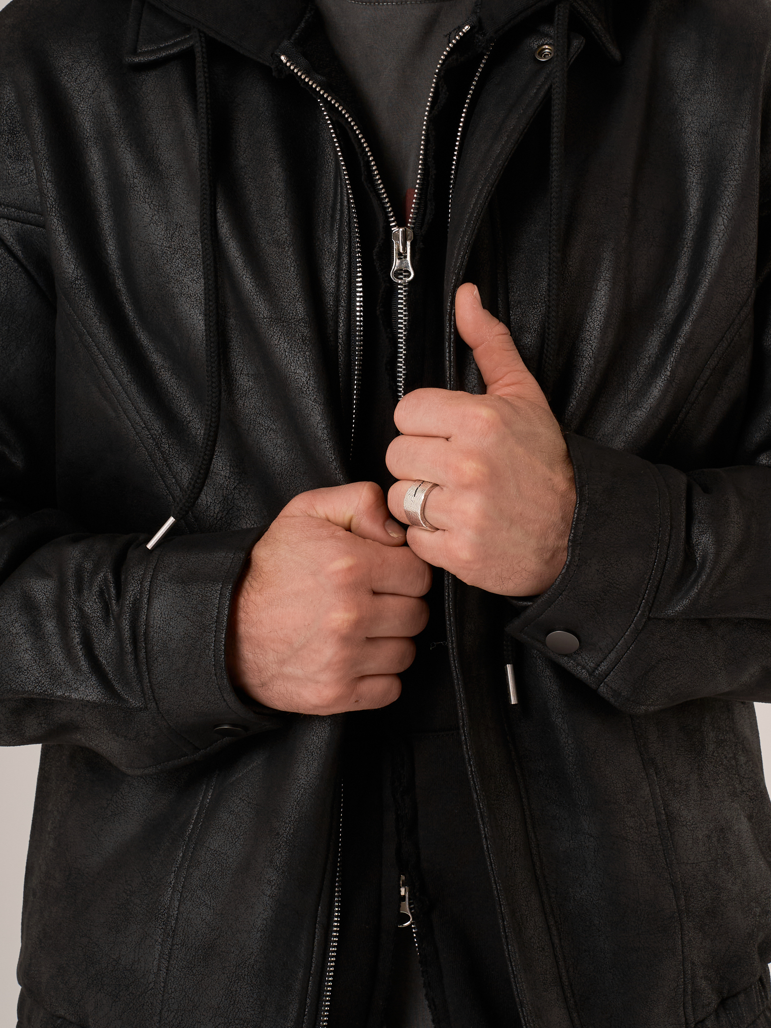Черная куртка-бомбер выполнена из матовой эко-кожи. Модель с резинкой по низу и отложенным воротничком.