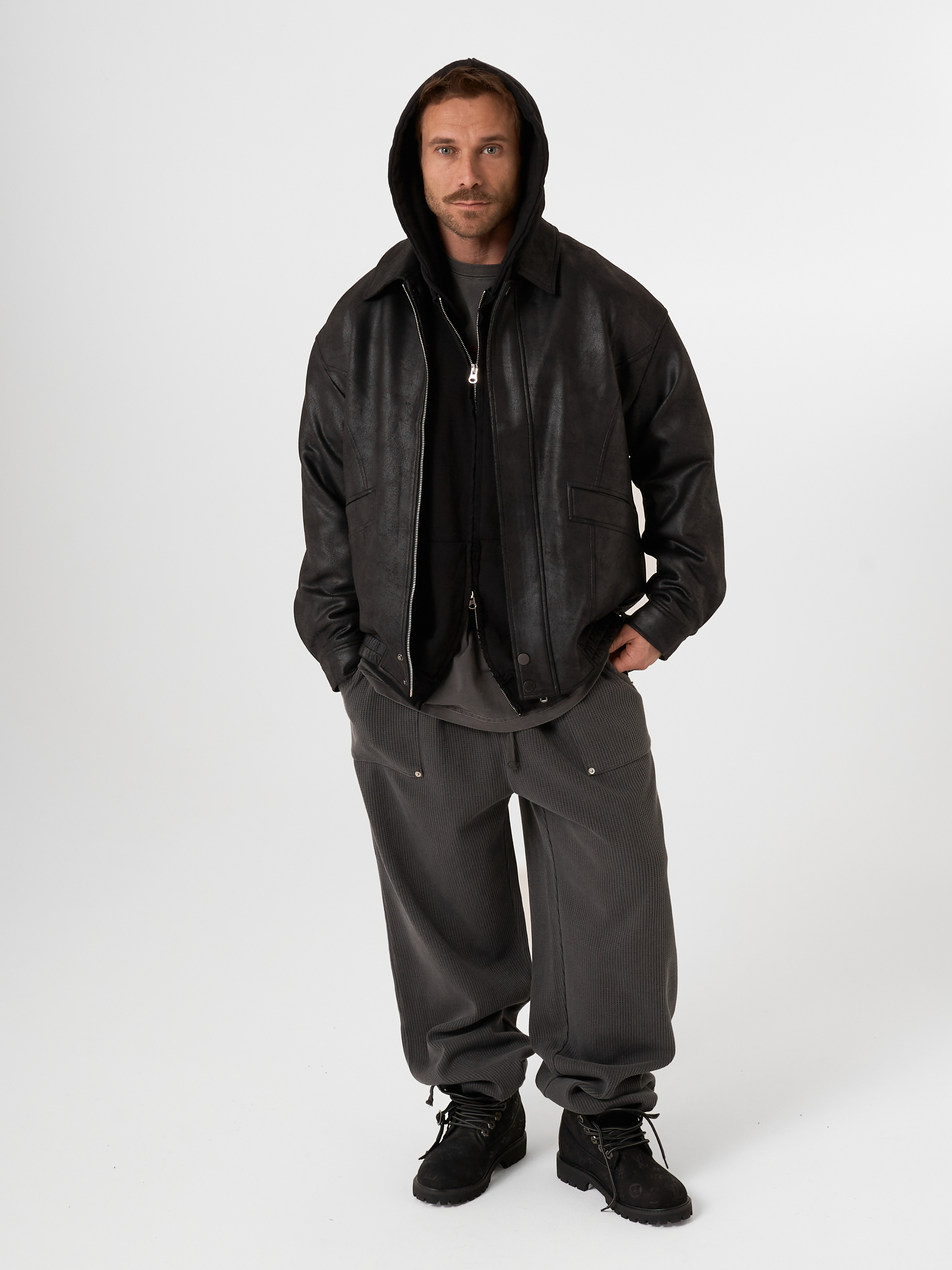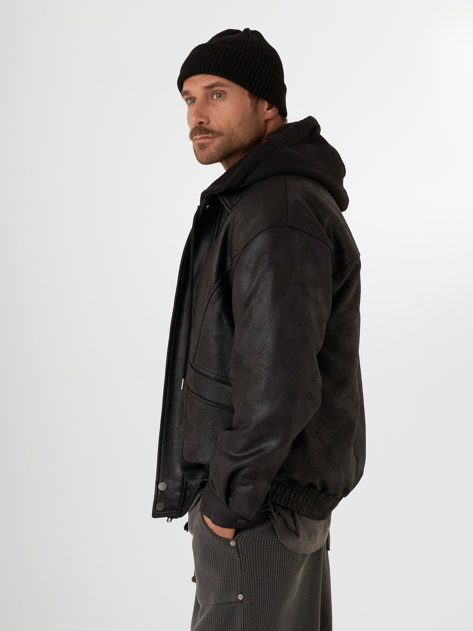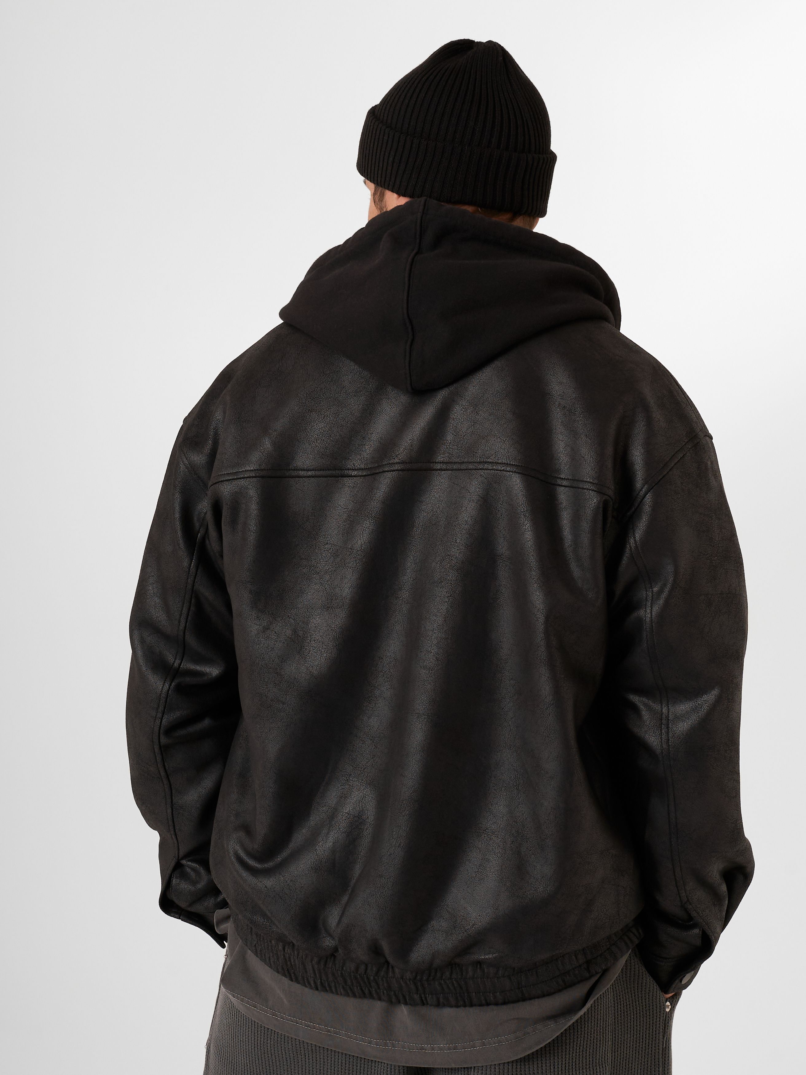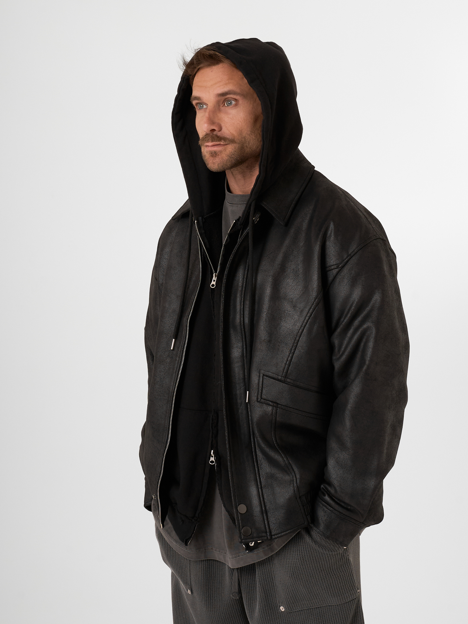 Черная куртка-бомбер выполнена из матовой эко-кожи. Модель с резинкой по низу и отложенным воротничком.