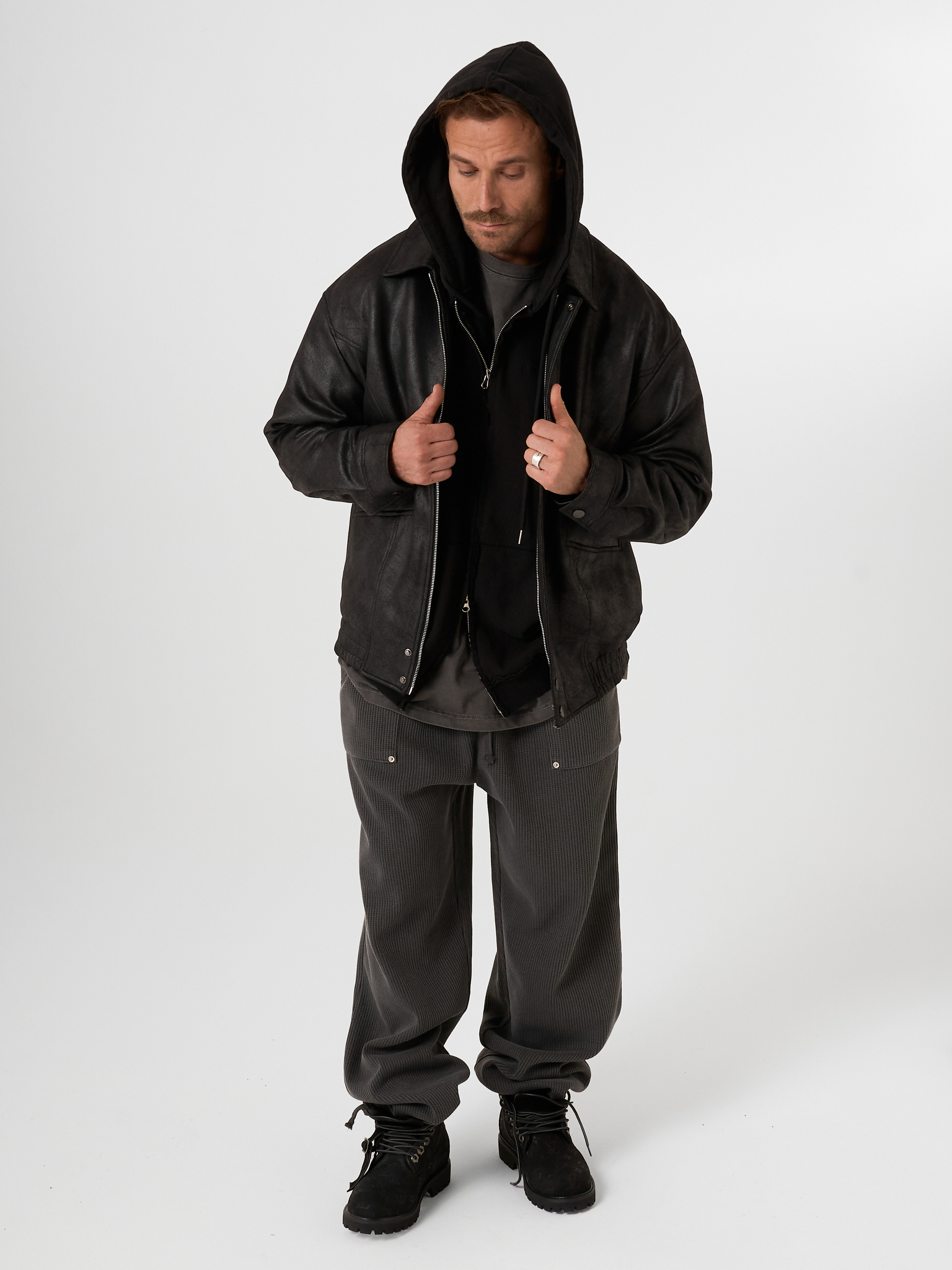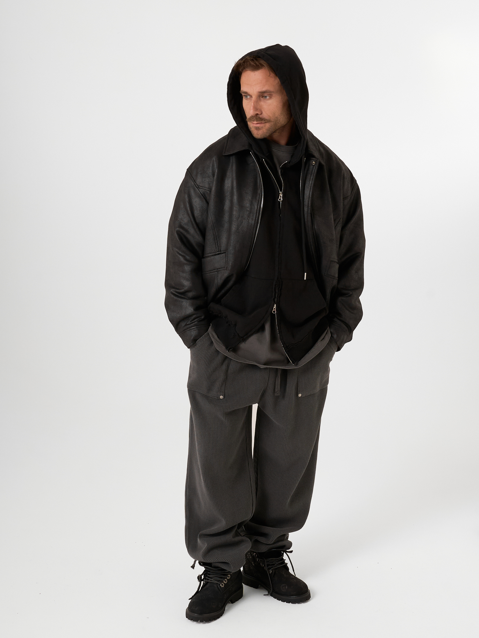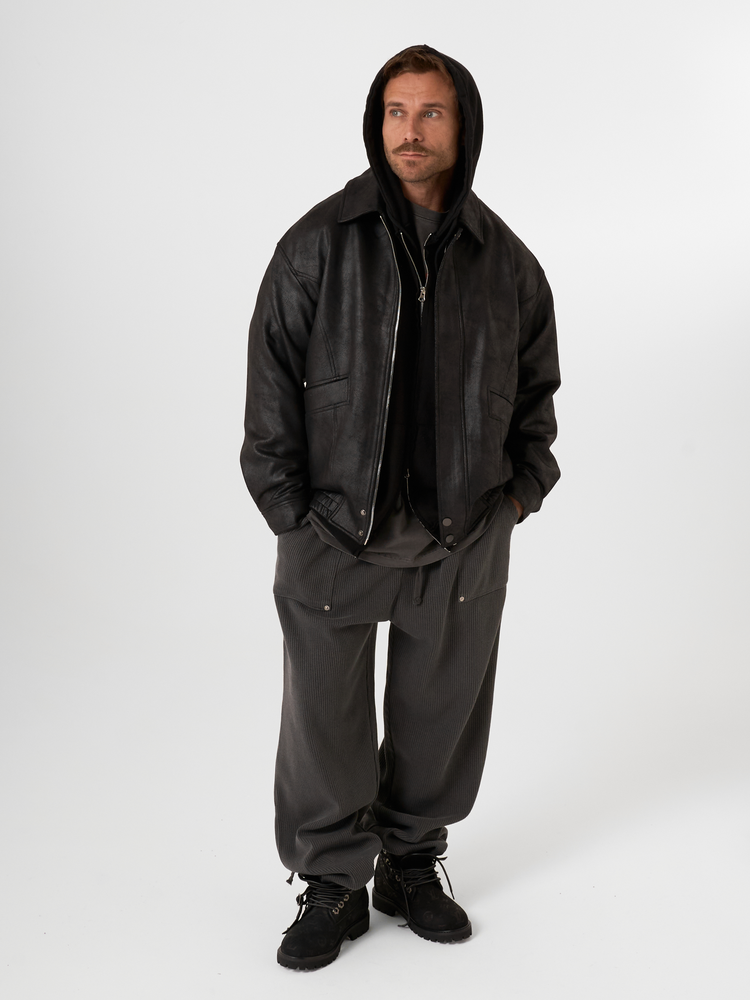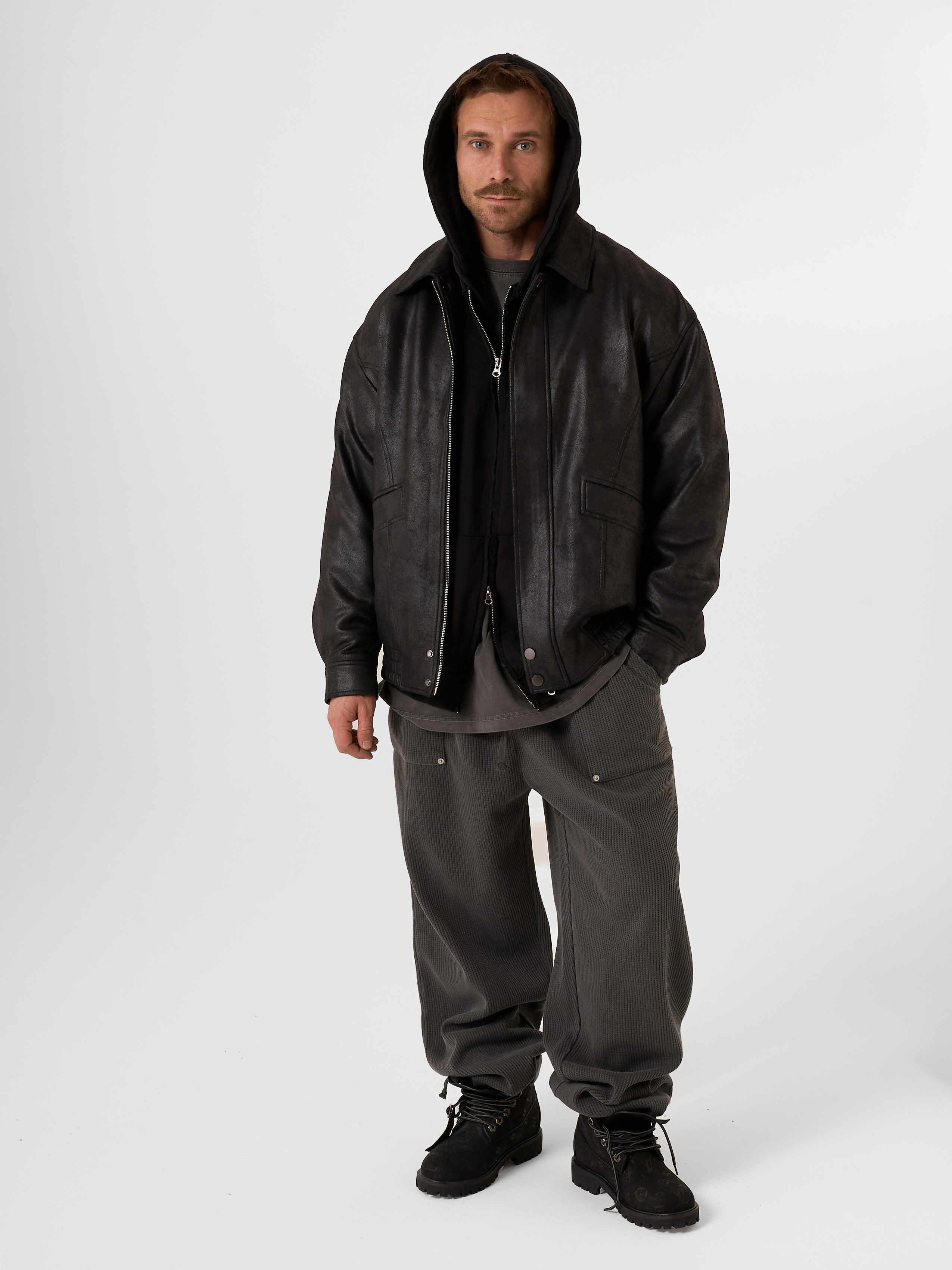 Черная куртка-бомбер выполнена из матовой эко-кожи. Модель с резинкой по низу и отложенным воротничком.