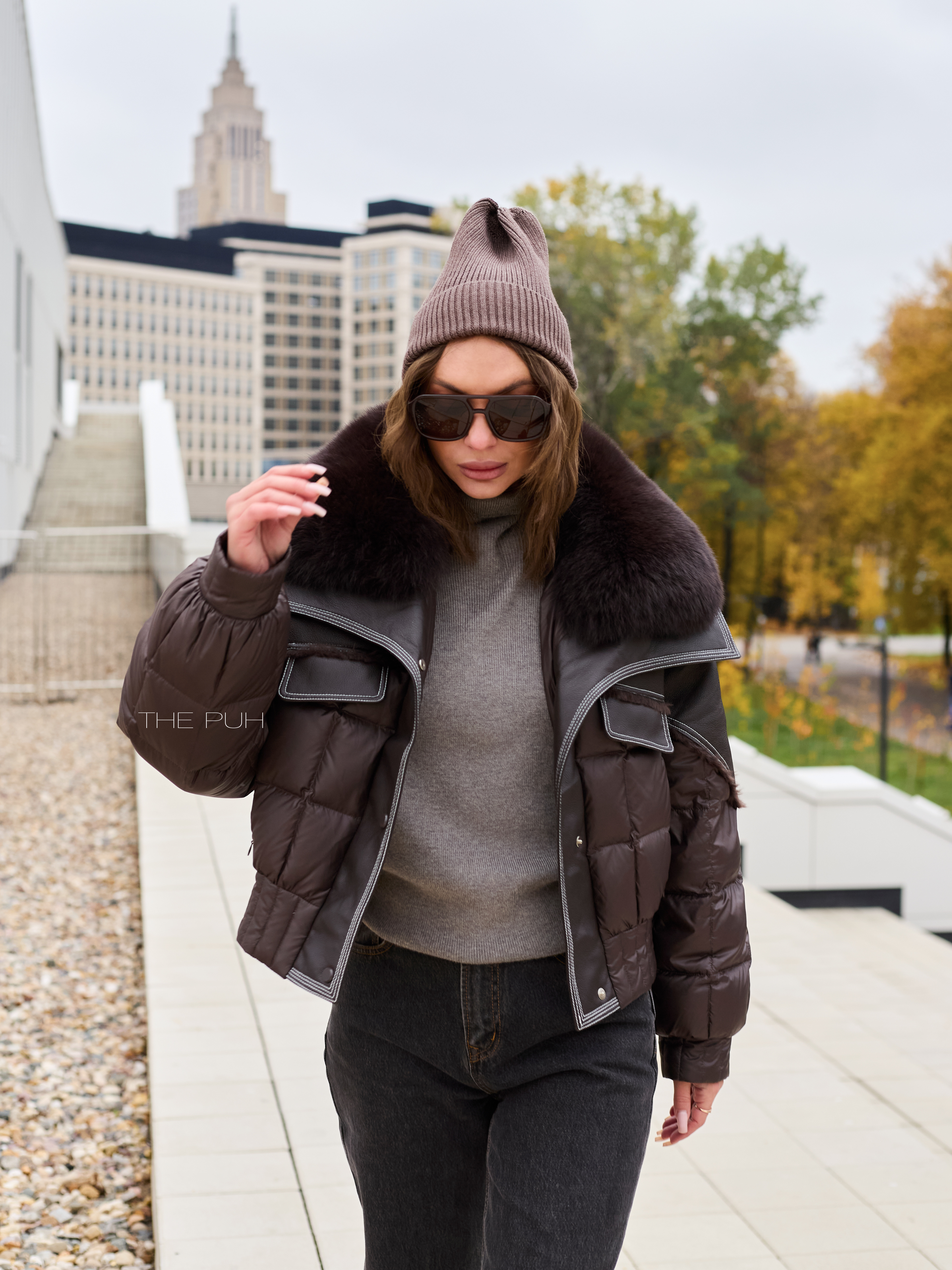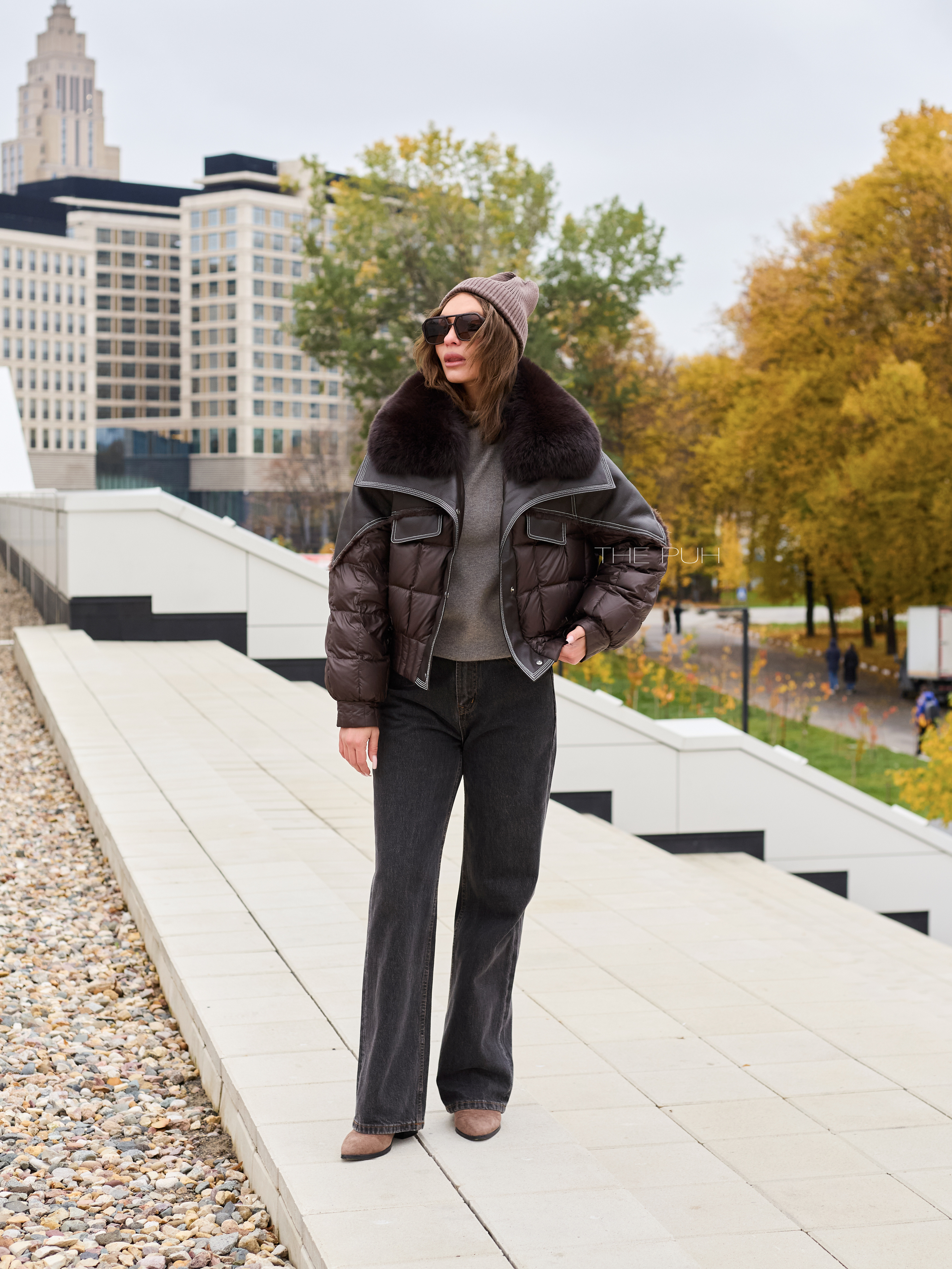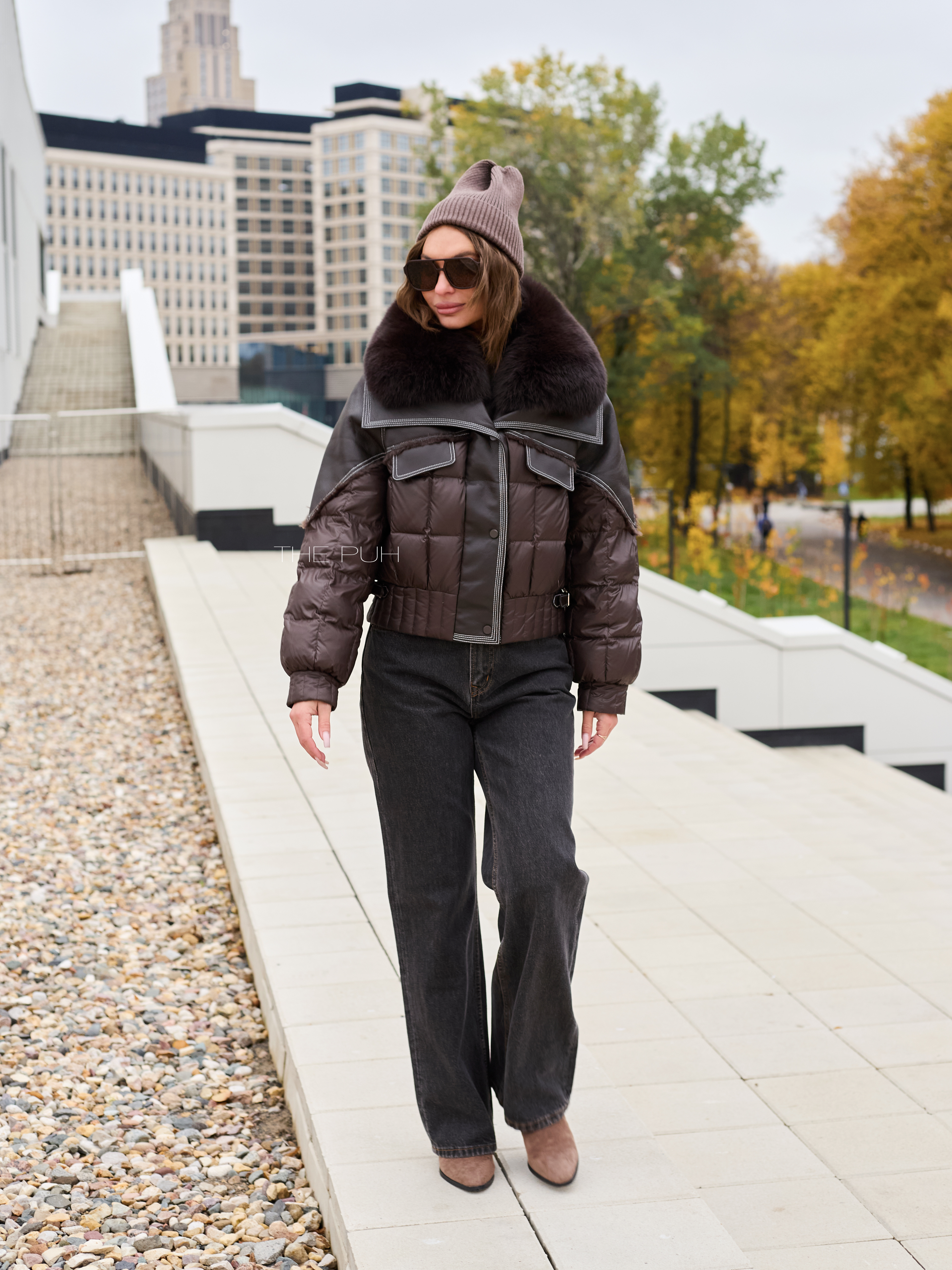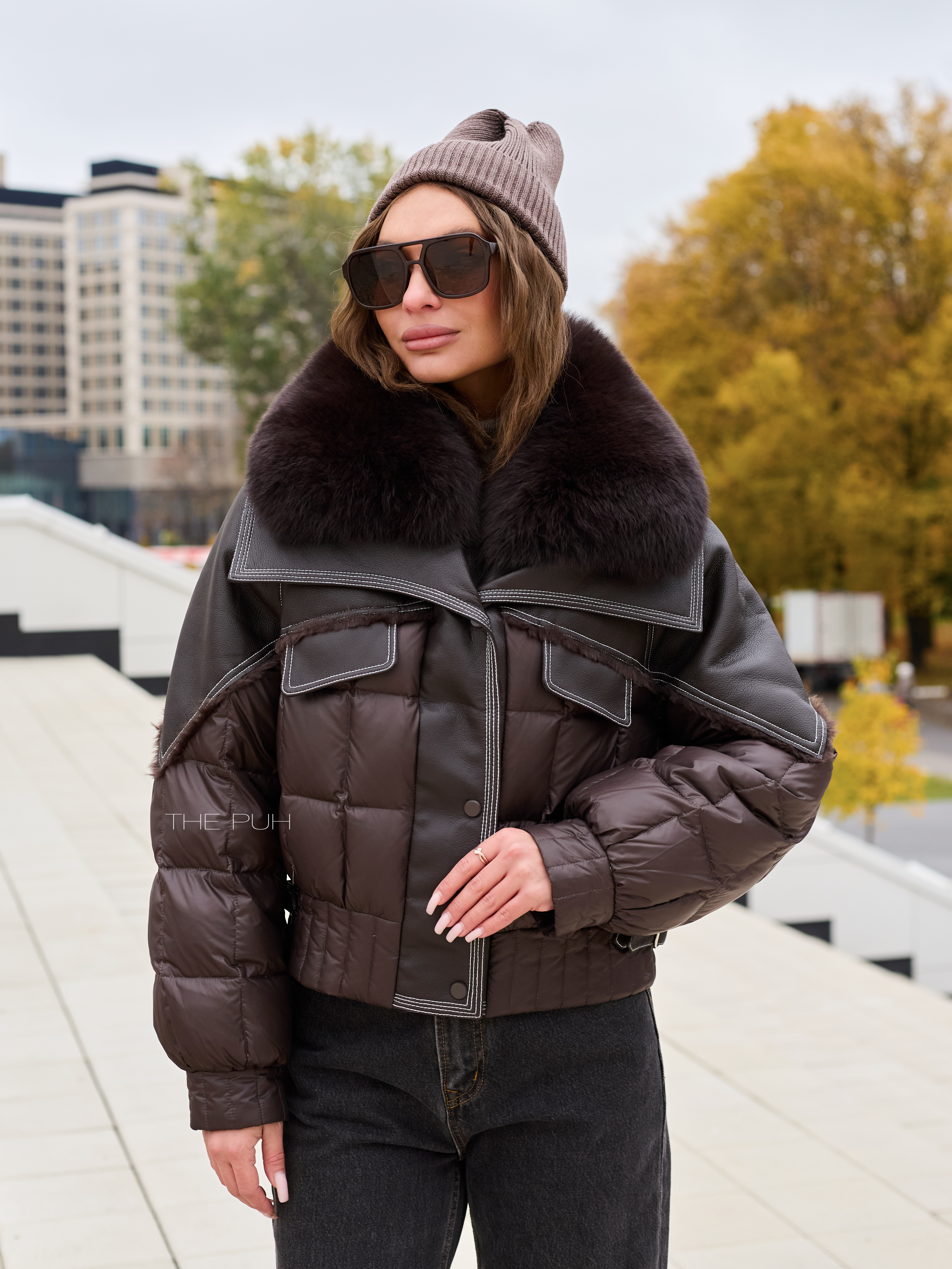 Укороченный шоколадный пуховик выполнен из эко-кожи и нейлона и дополнен съемным воротником из меха песца в тон. Модель утеплена натуральным гусиным пухом и пером, так что спокойно выдерживает сильные морозы.