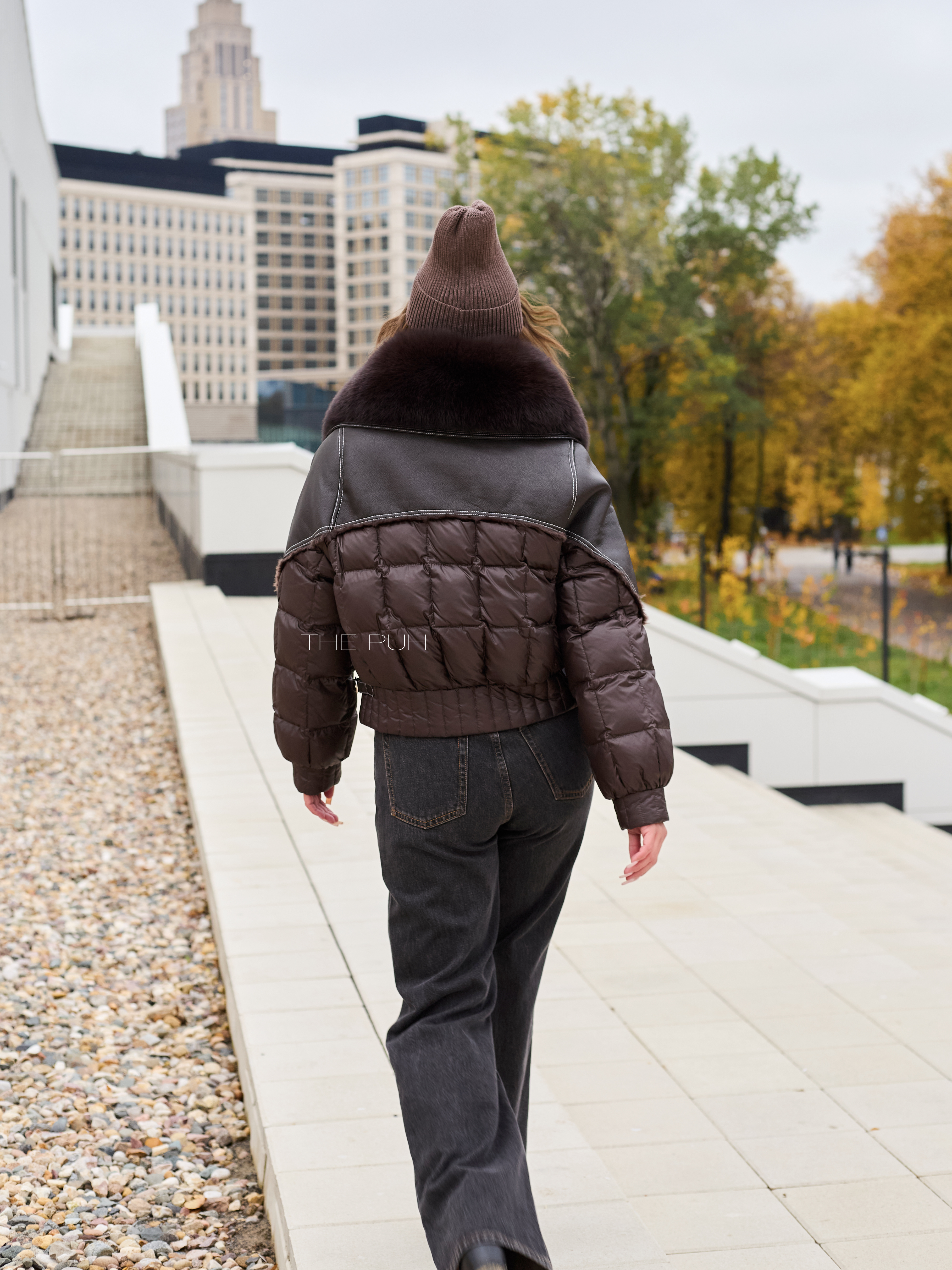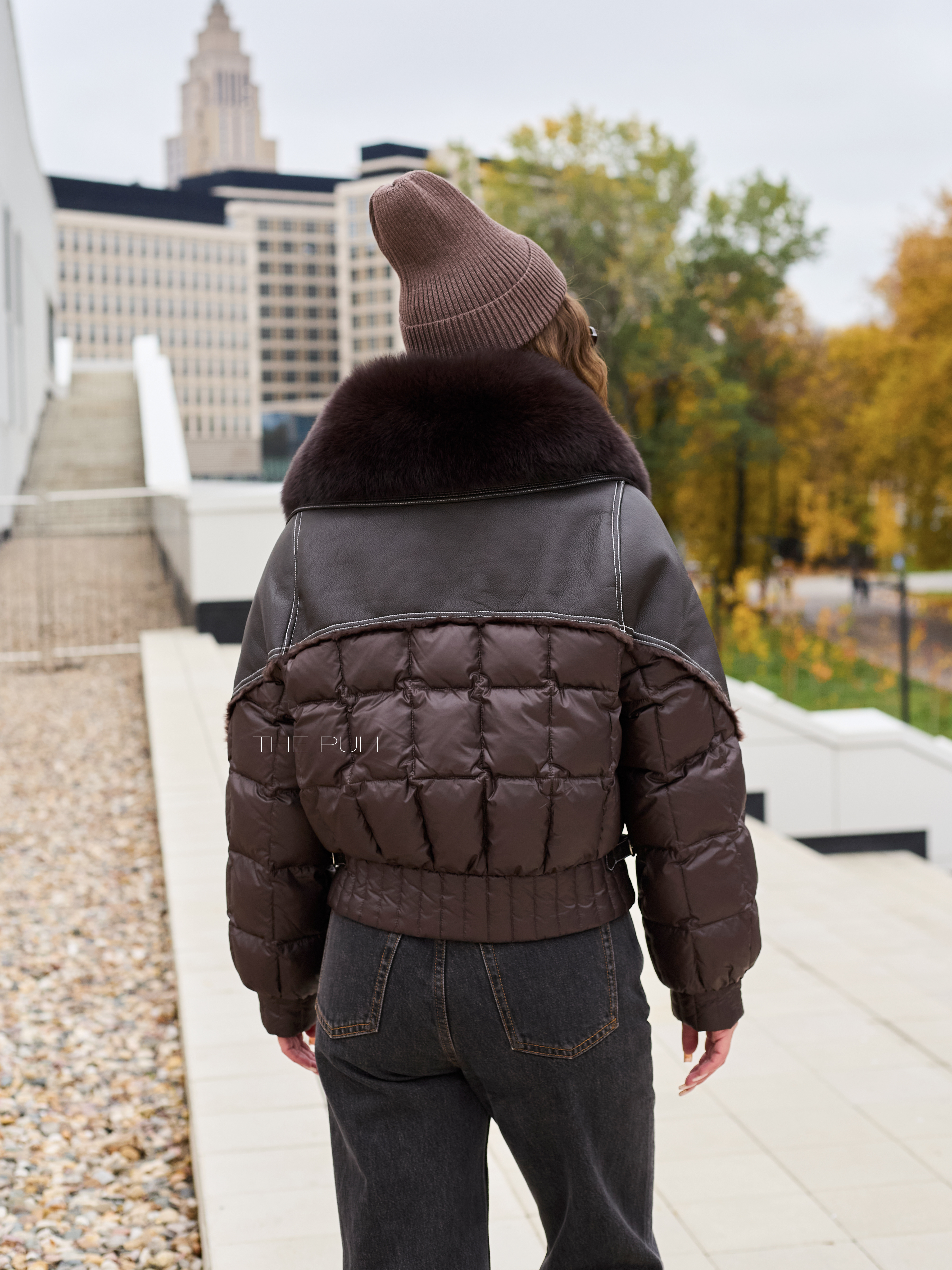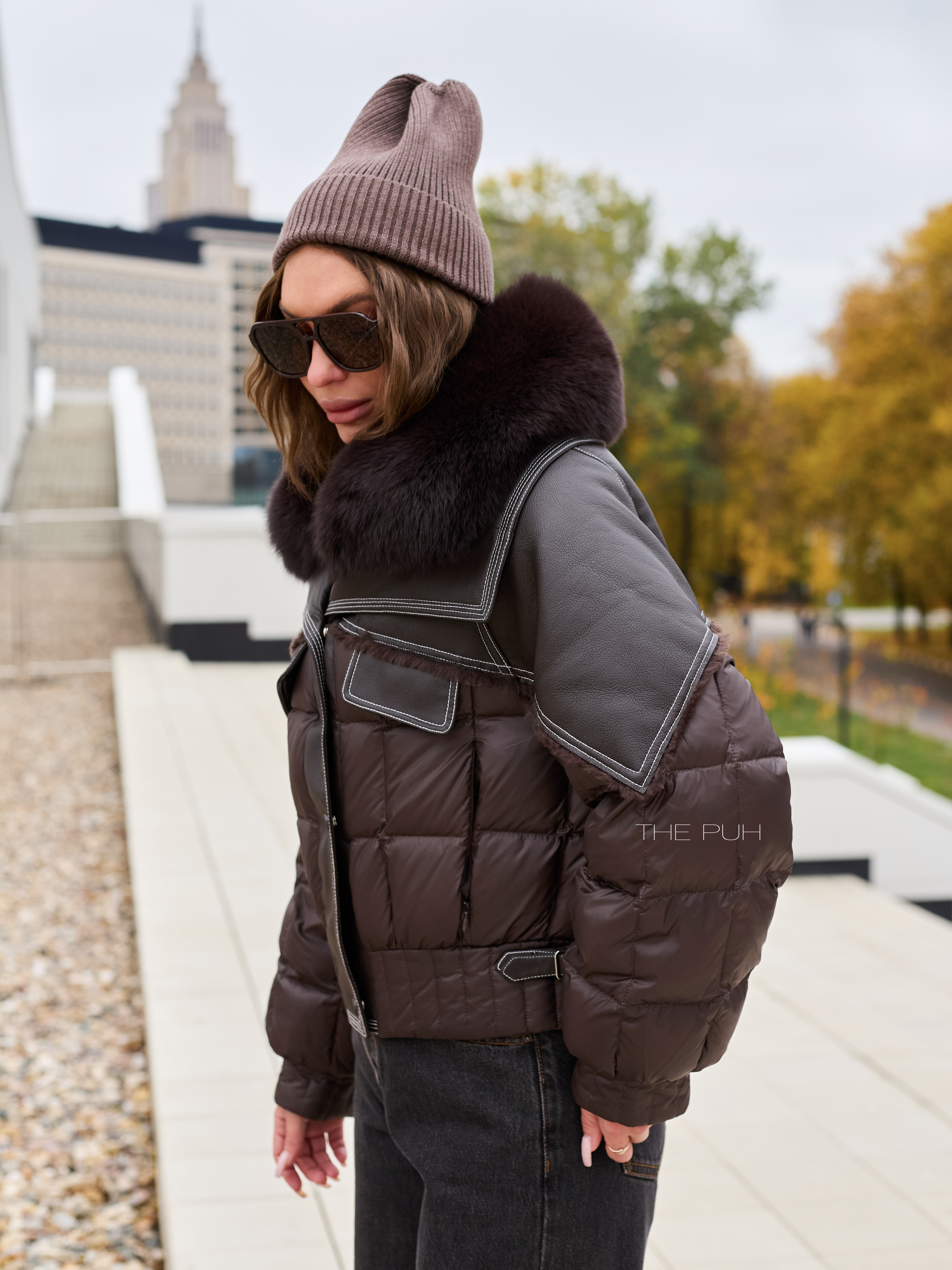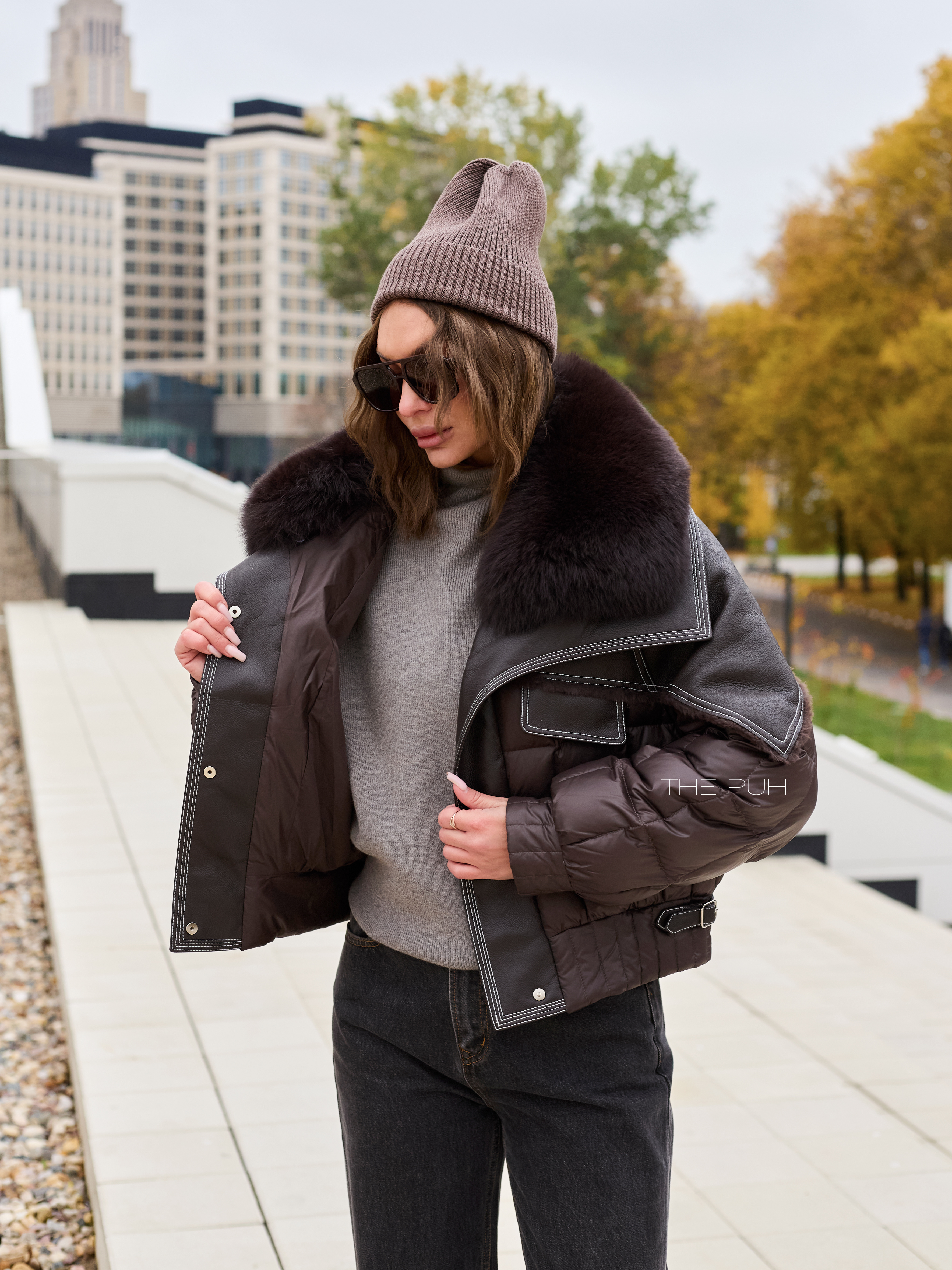 Укороченный шоколадный пуховик выполнен из эко-кожи и нейлона и дополнен съемным воротником из меха песца в тон. Модель утеплена натуральным гусиным пухом и пером, так что спокойно выдерживает сильные морозы.