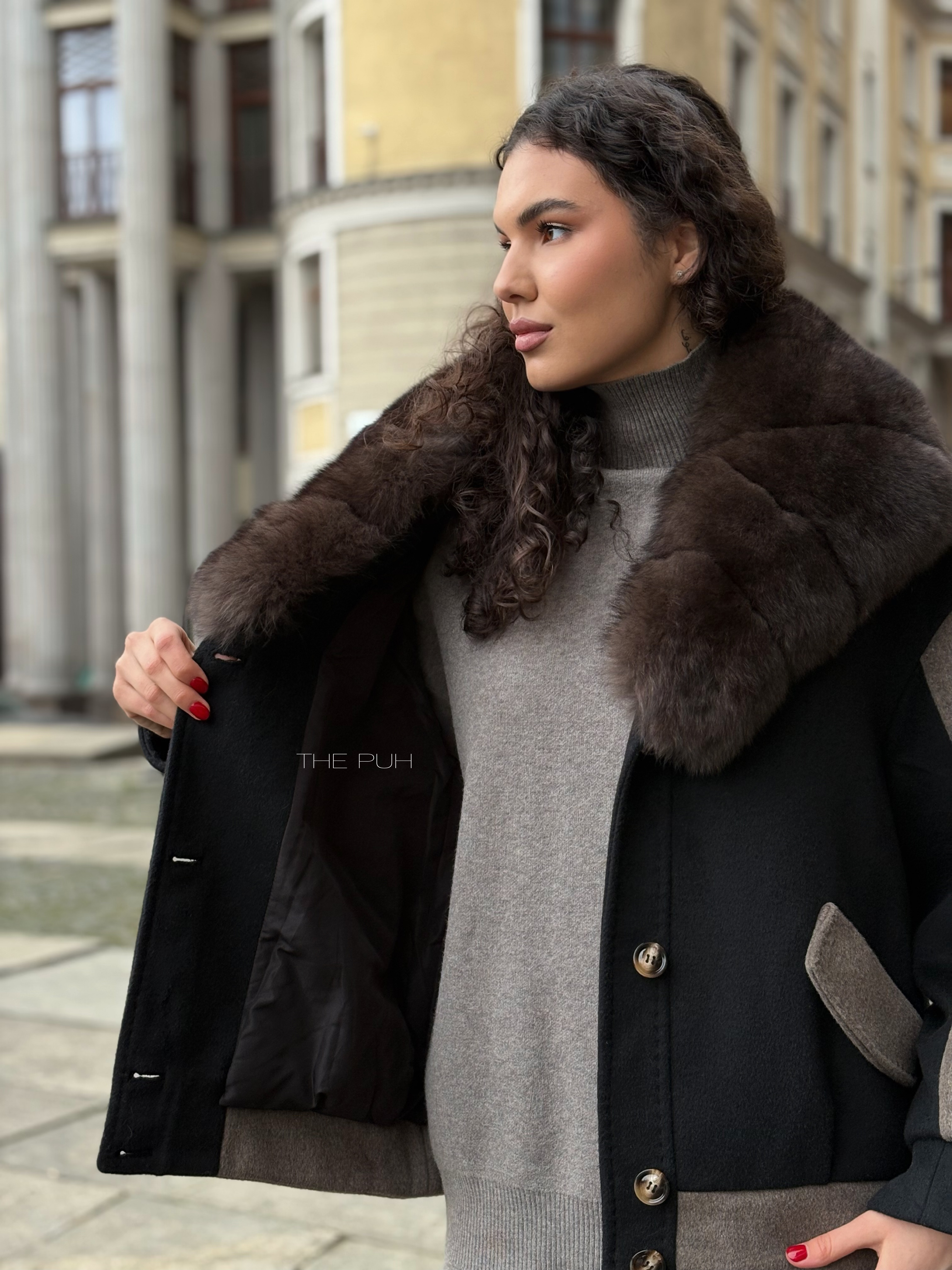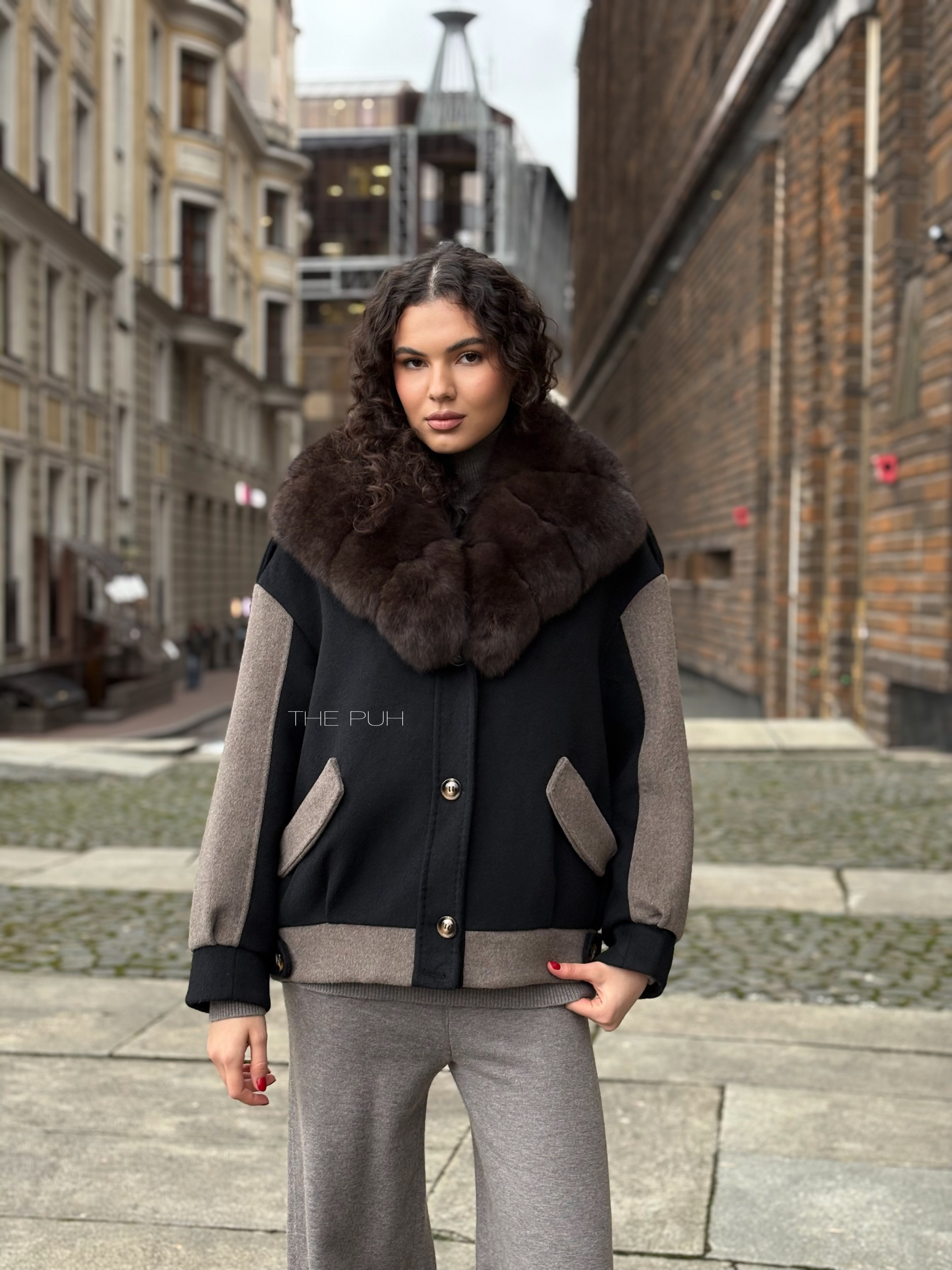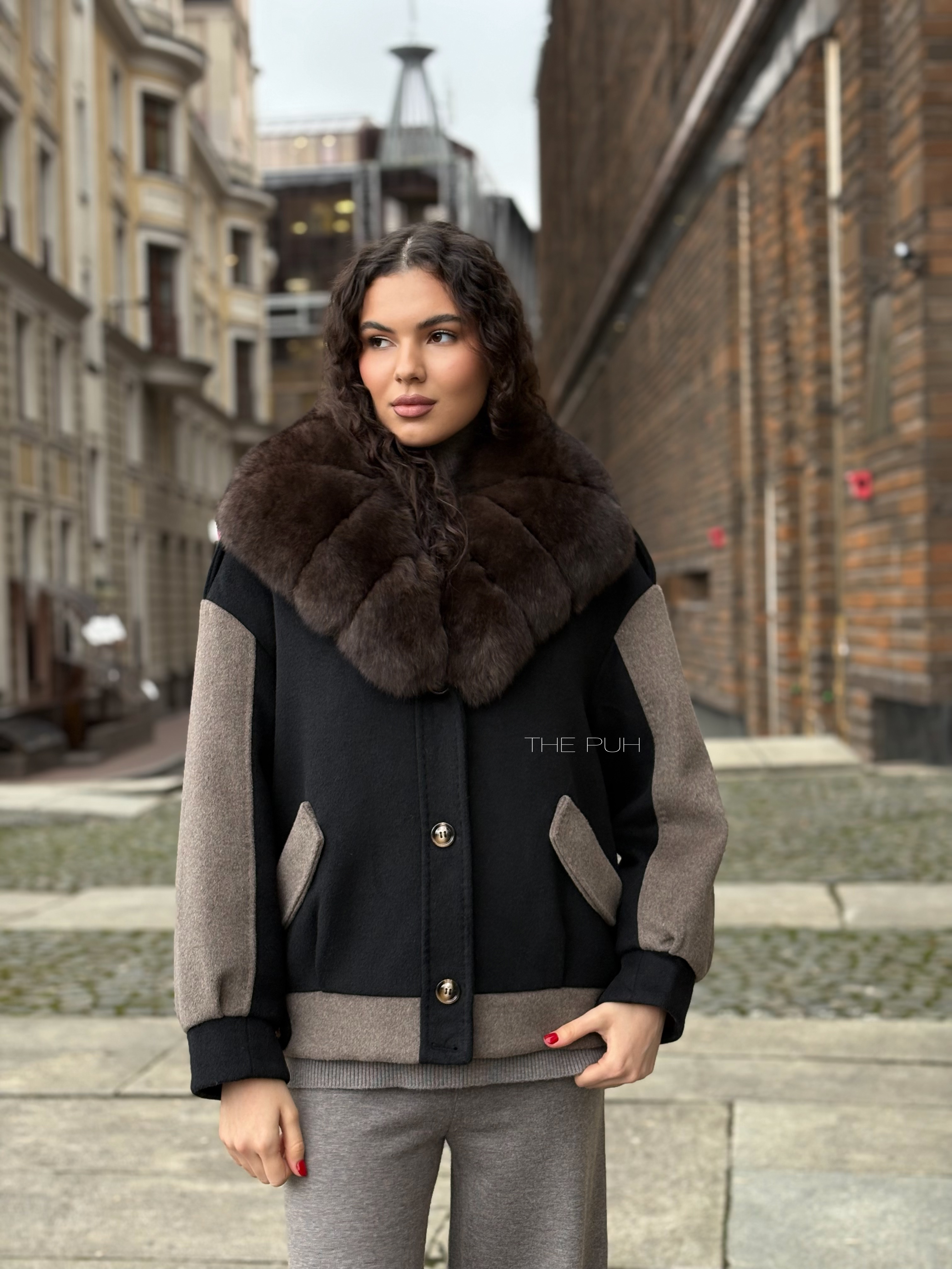 Черная куртка с коричневыми рукавами – стильная модель, где сочетание разных фактур создает современный образ. Она дополнена съемным меховым воротником, позволяющим легко менять стиль от повседневного до нарядного.