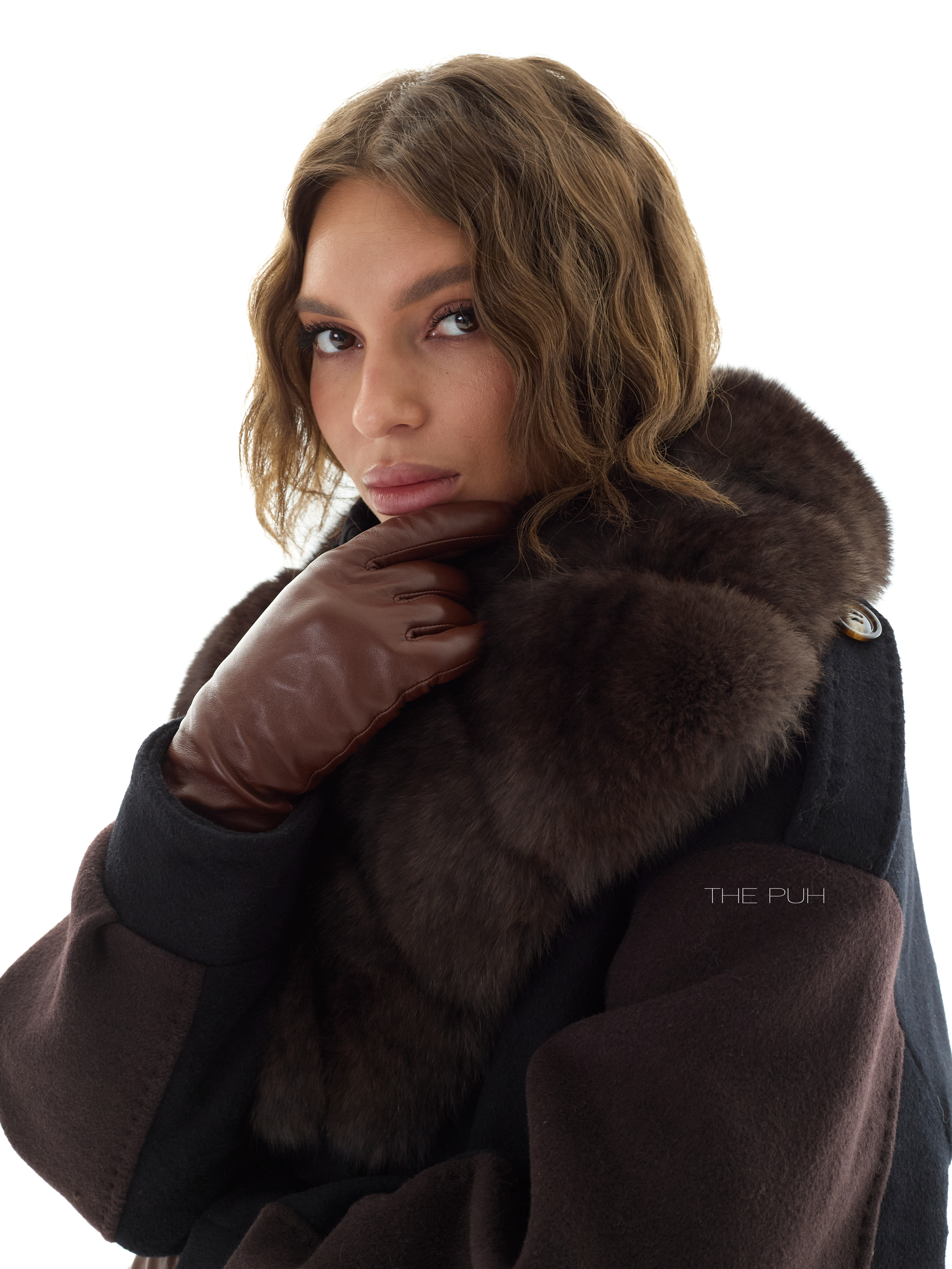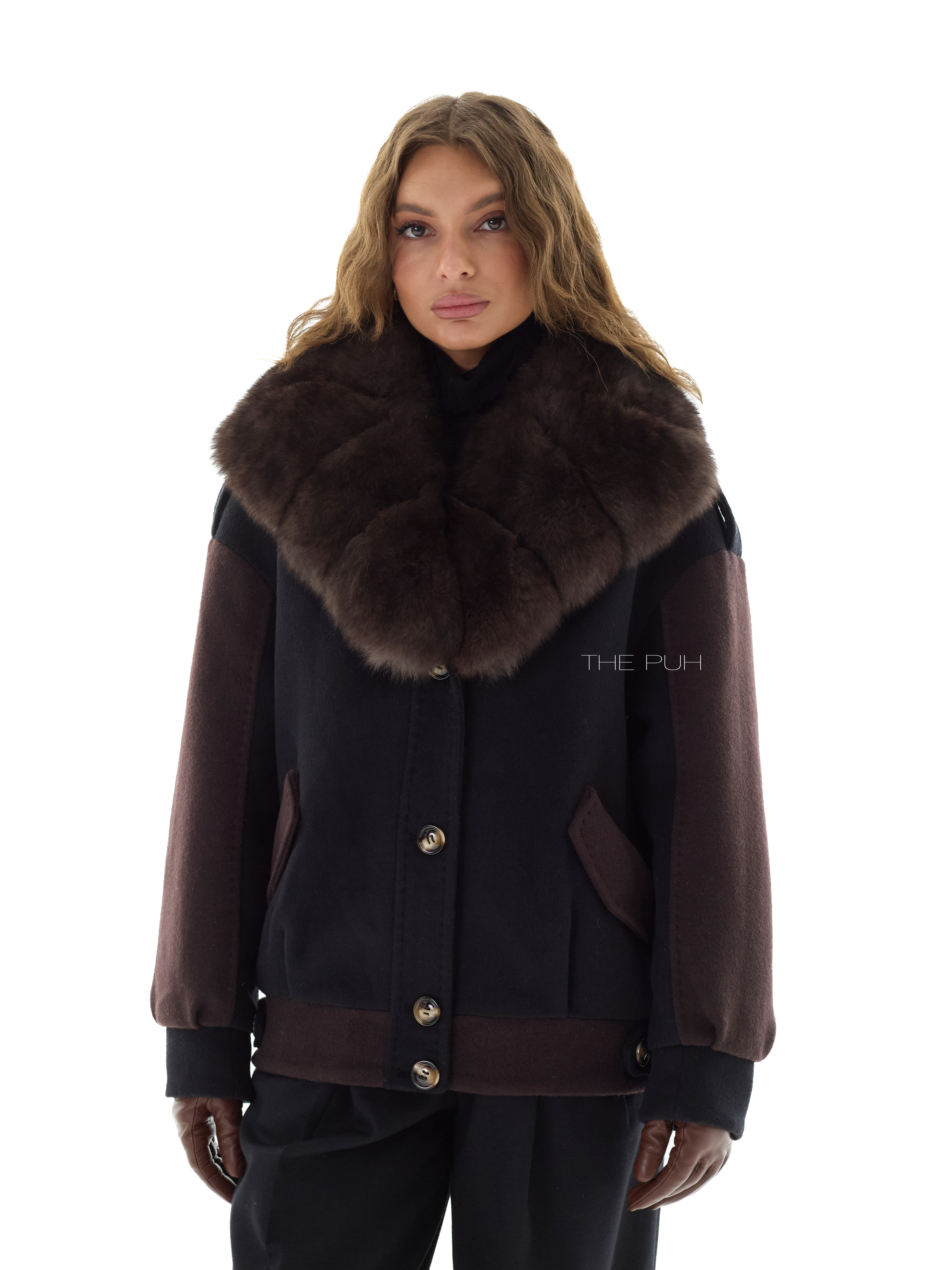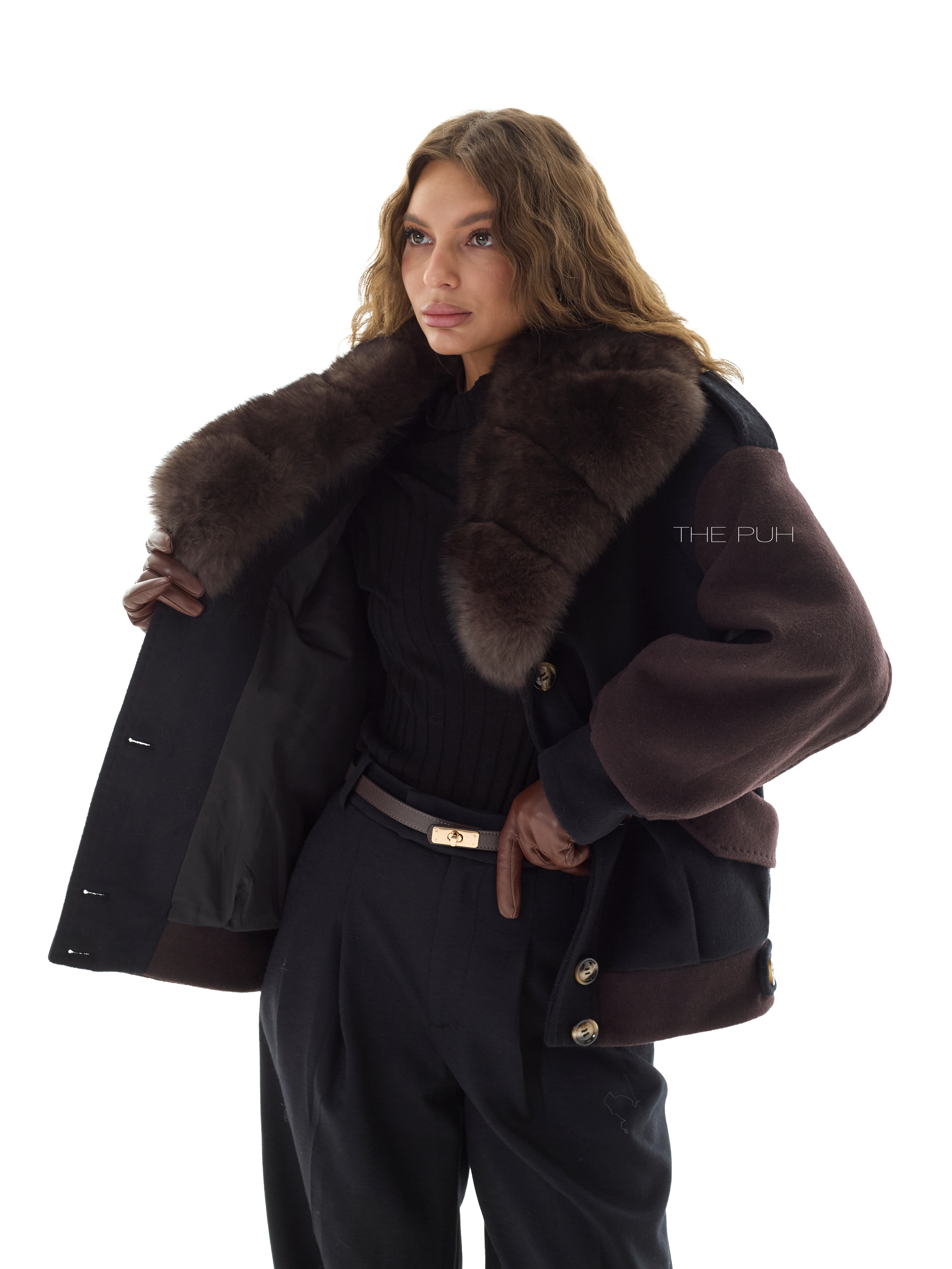Черная куртка с шоколадными рукавами – стильная модель, где сочетание разных фактур создает современный образ. Она дополнена съемным меховым воротником, позволяющим легко менять стиль от повседневного до нарядного.