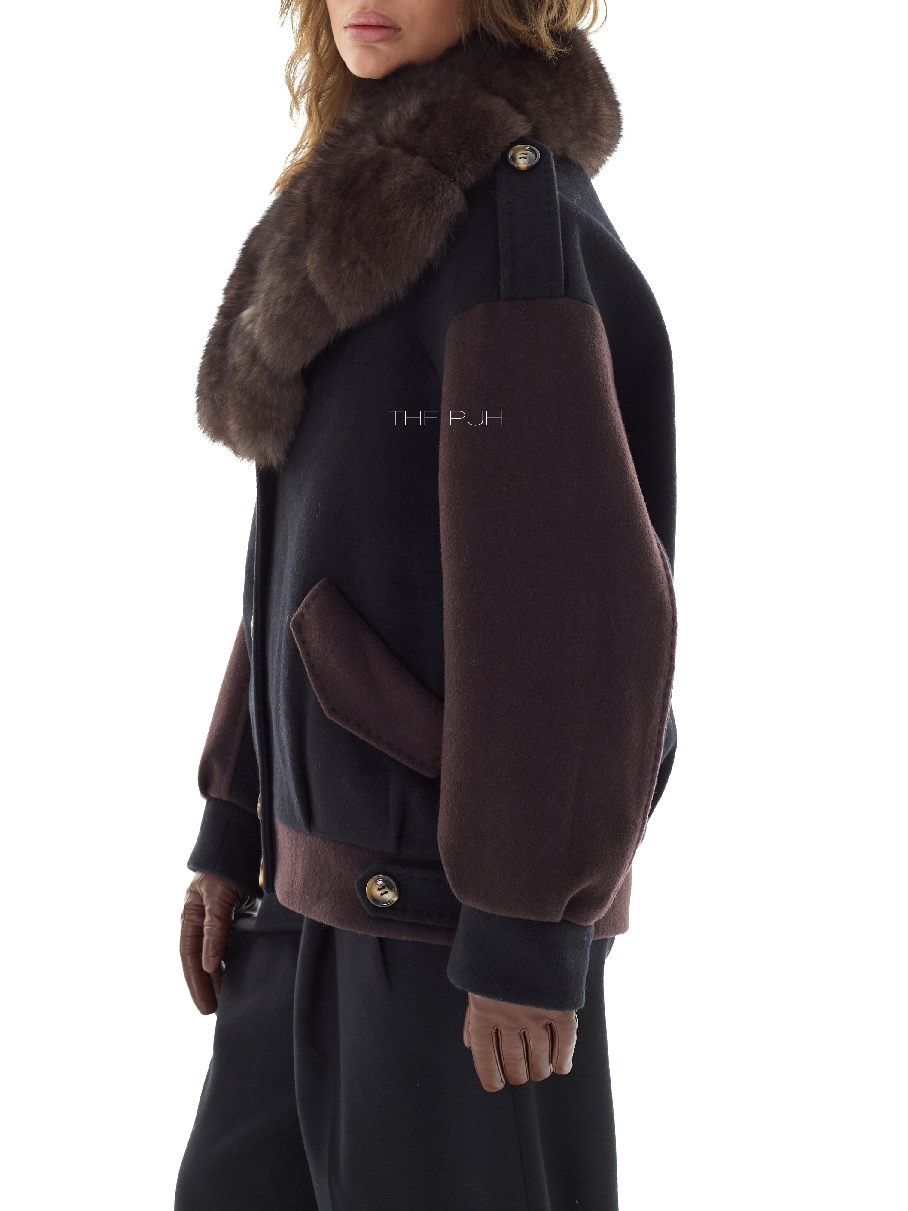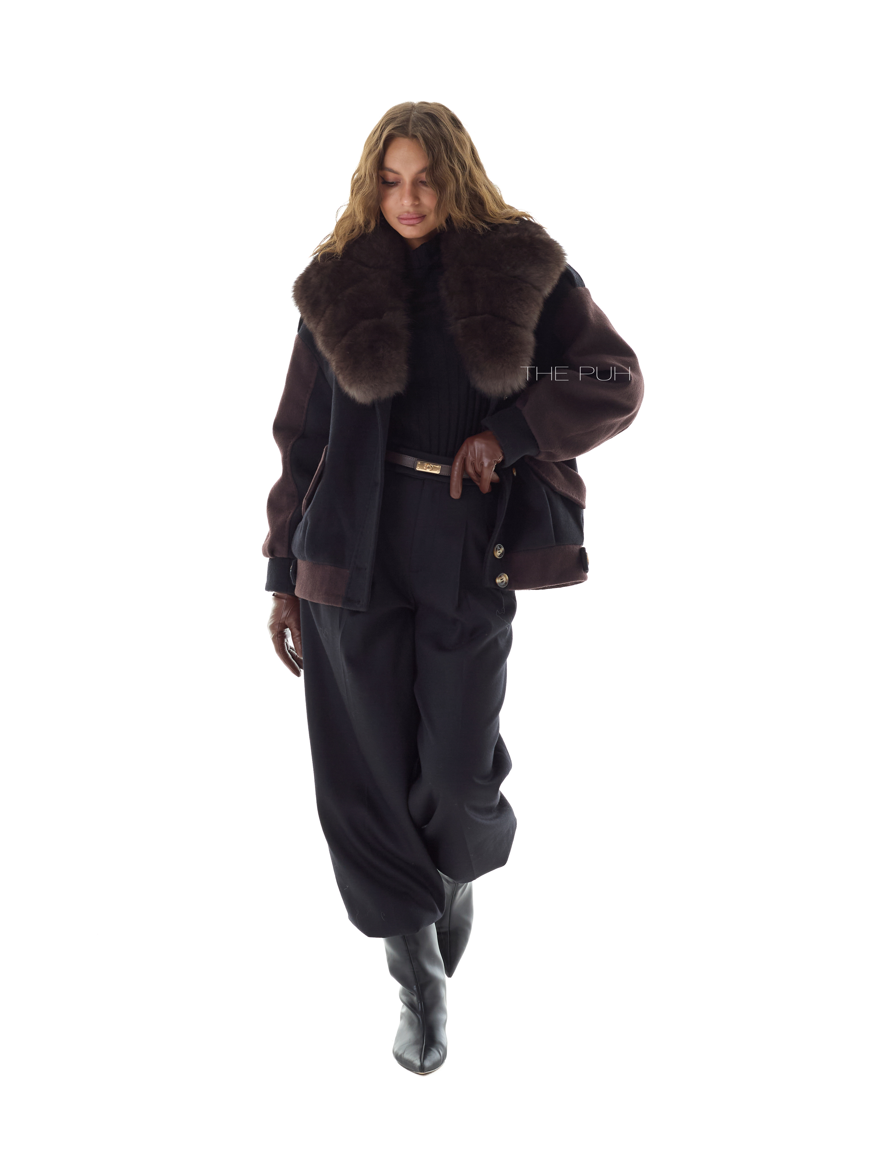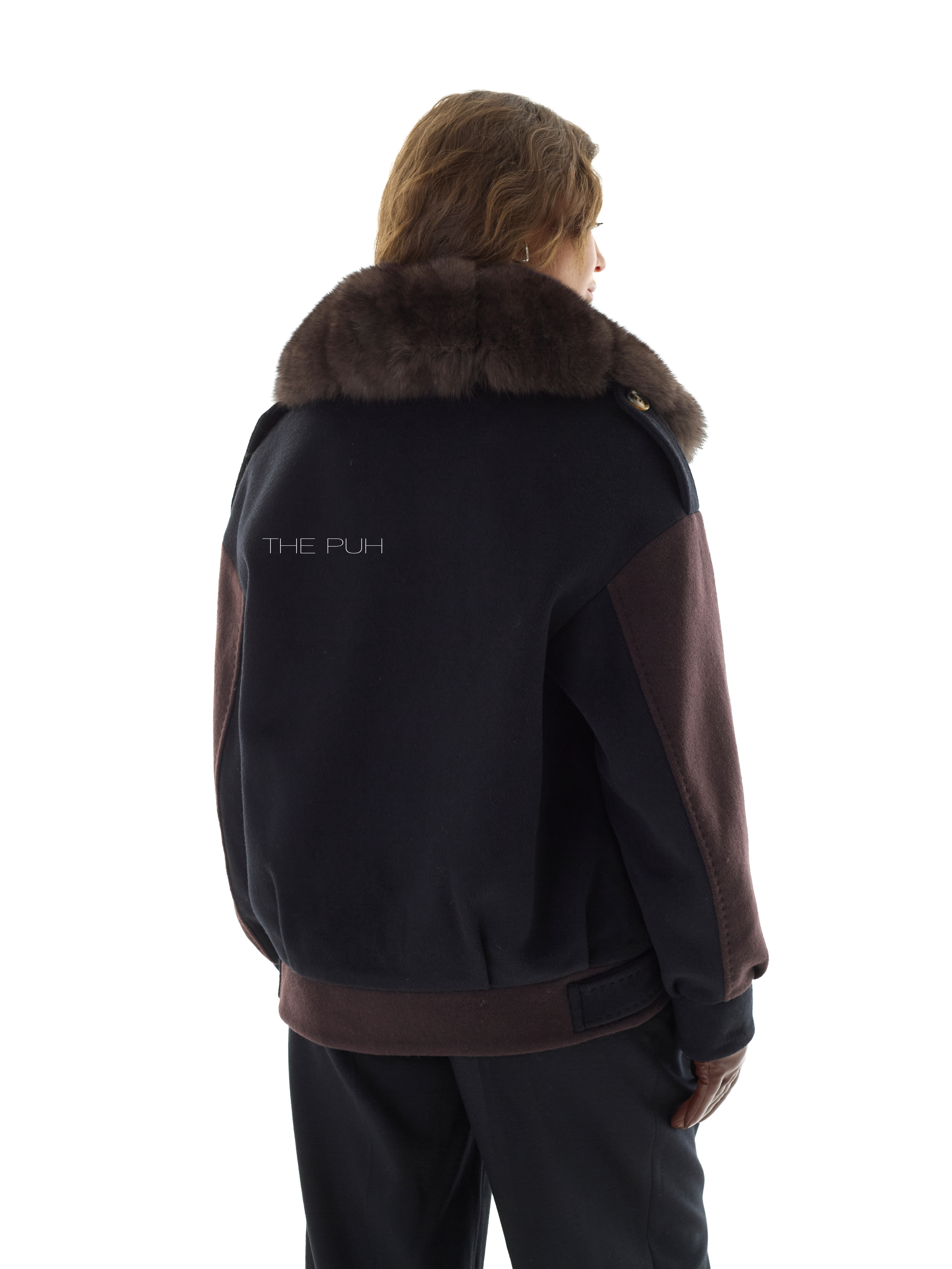 Черная куртка с шоколадными рукавами – стильная модель, где сочетание разных фактур создает современный образ. Она дополнена съемным меховым воротником, позволяющим легко менять стиль от повседневного до нарядного.