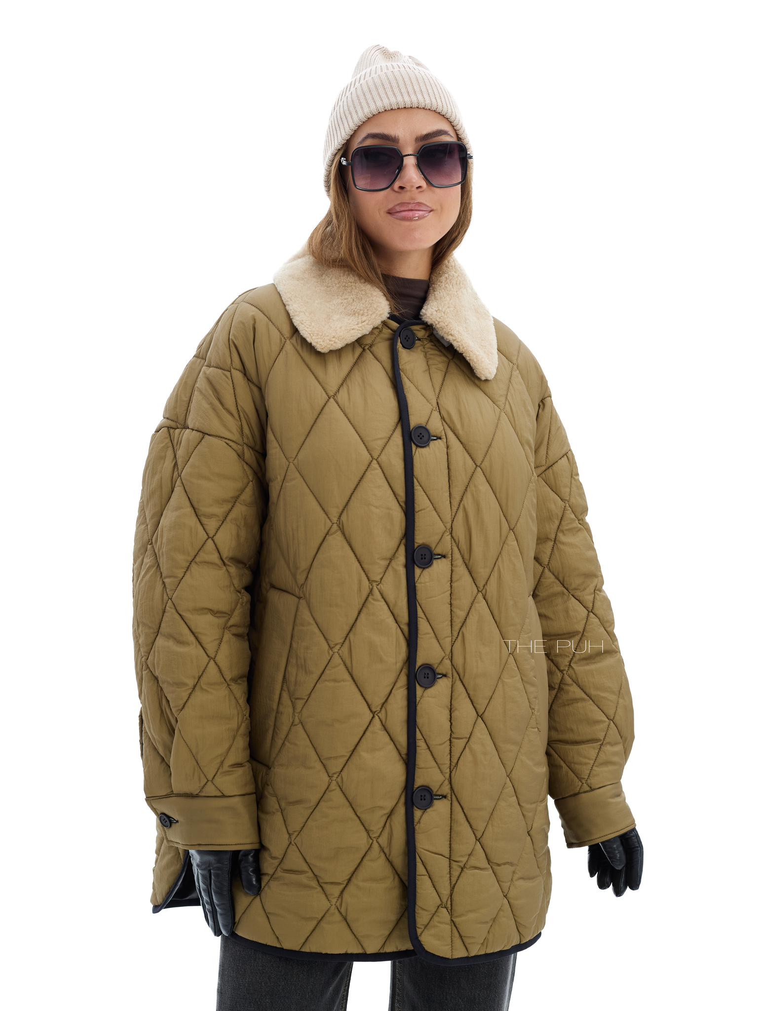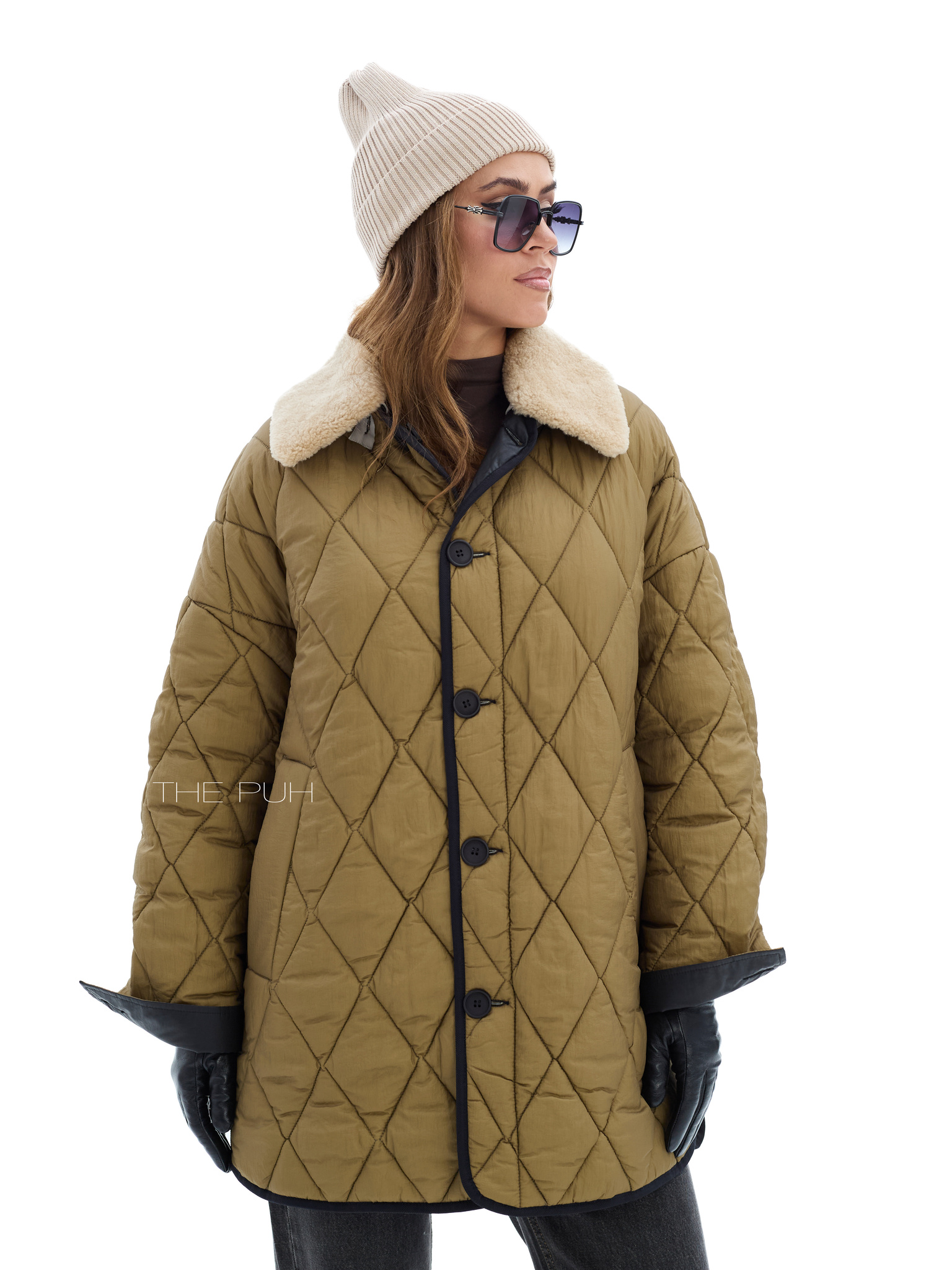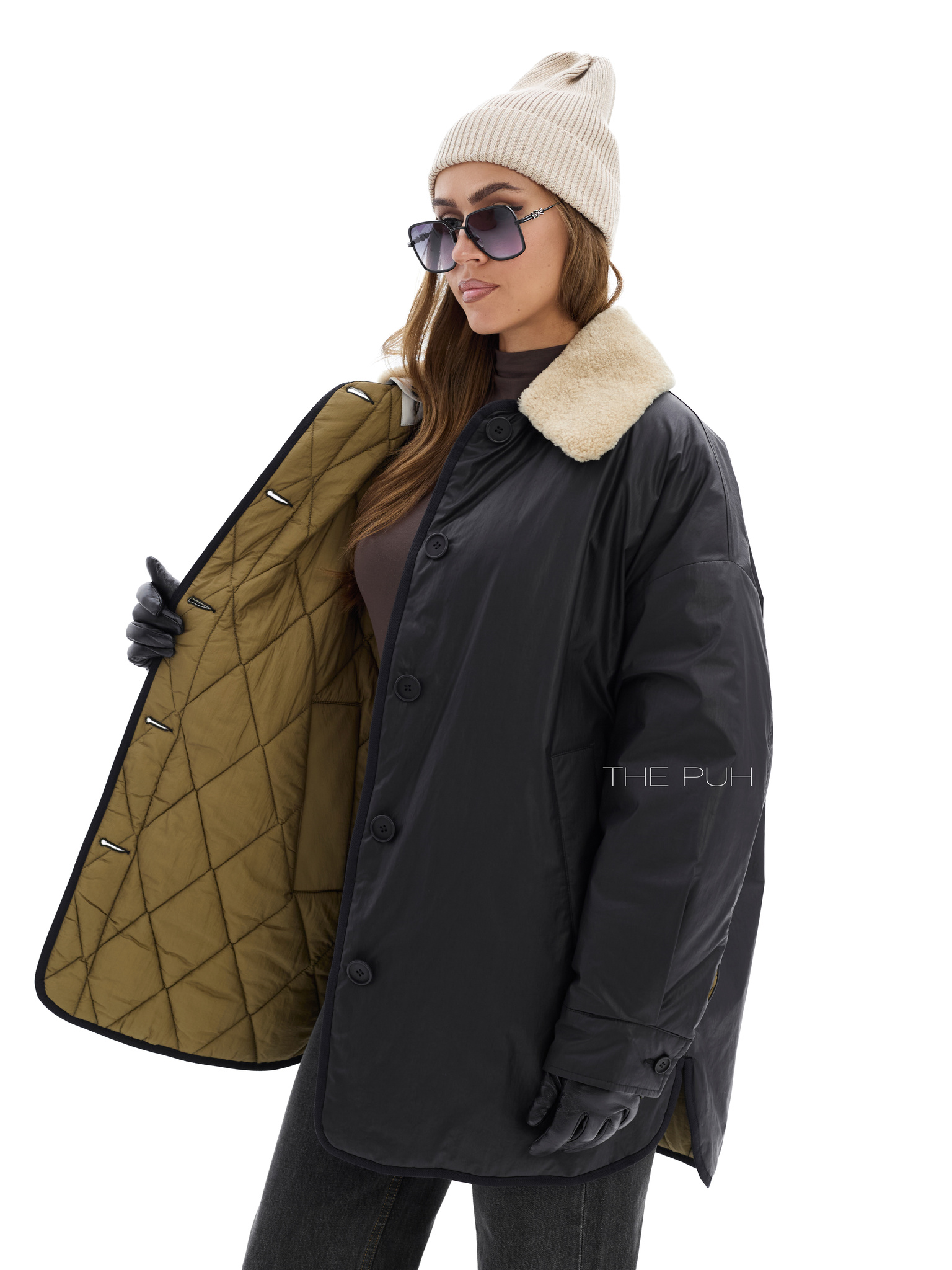 Удлиненная куртка прямого кроя на пуговицах со съемным воротником из эко-меха. Двусторонняя модель: с одной стороны выполнена из стеганого нейлона цвета хаки, а с другой из вощеного водонепроницаемого хлопка. Куртка утеплена пуховым наполнителем "thindown" и подойдет на позднюю осень и первые холода.