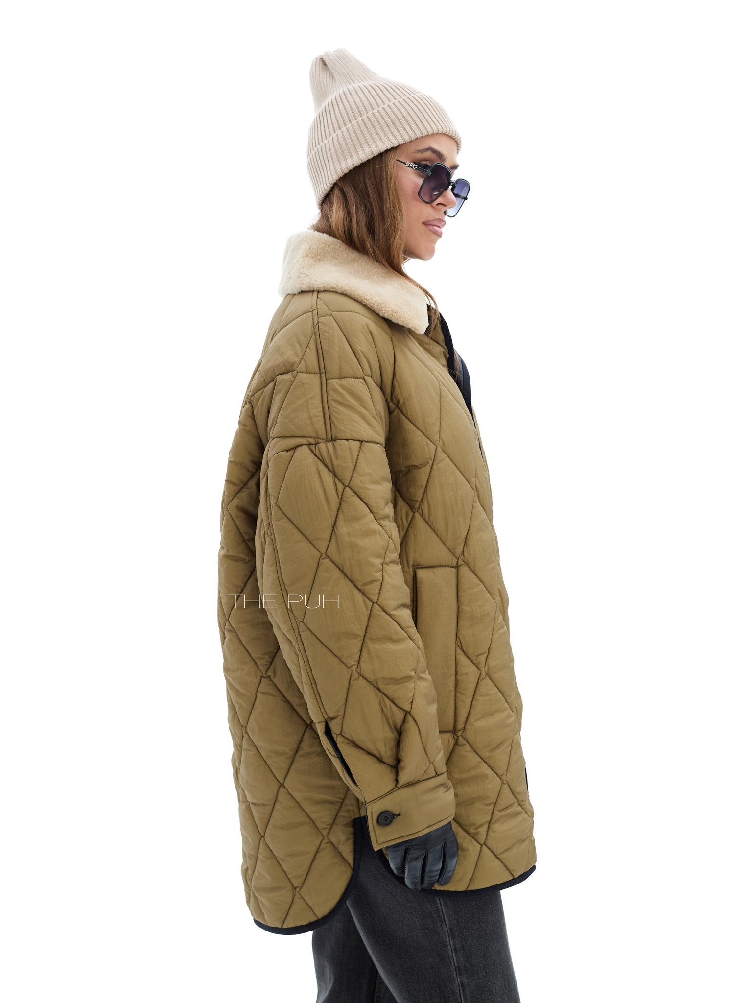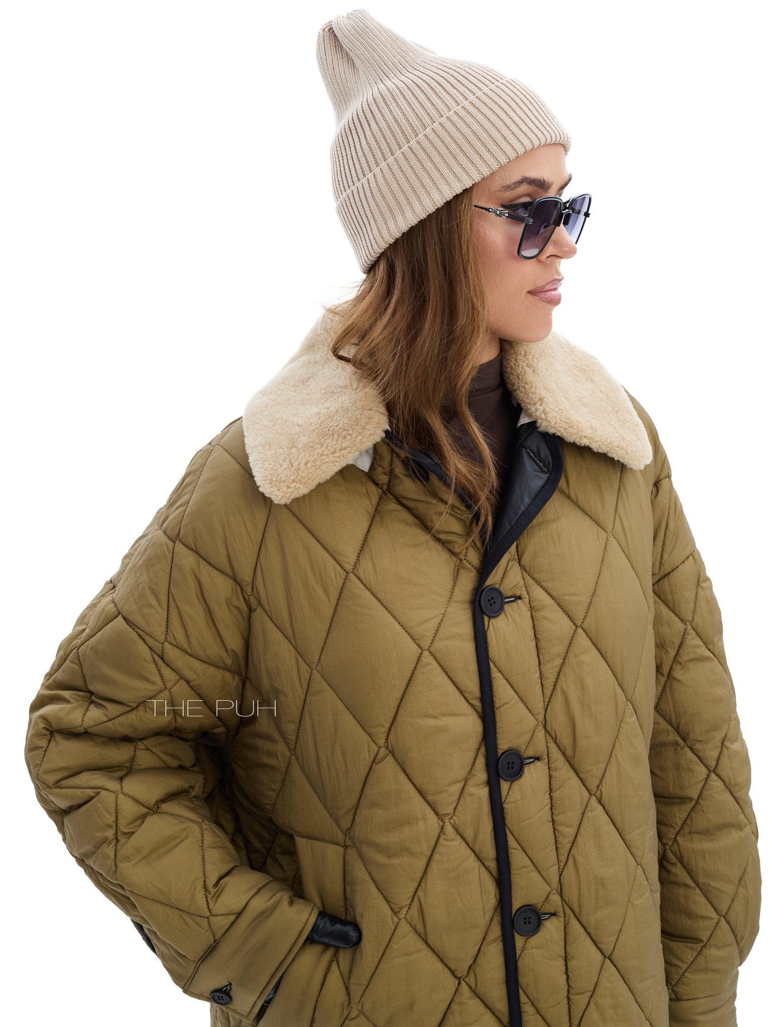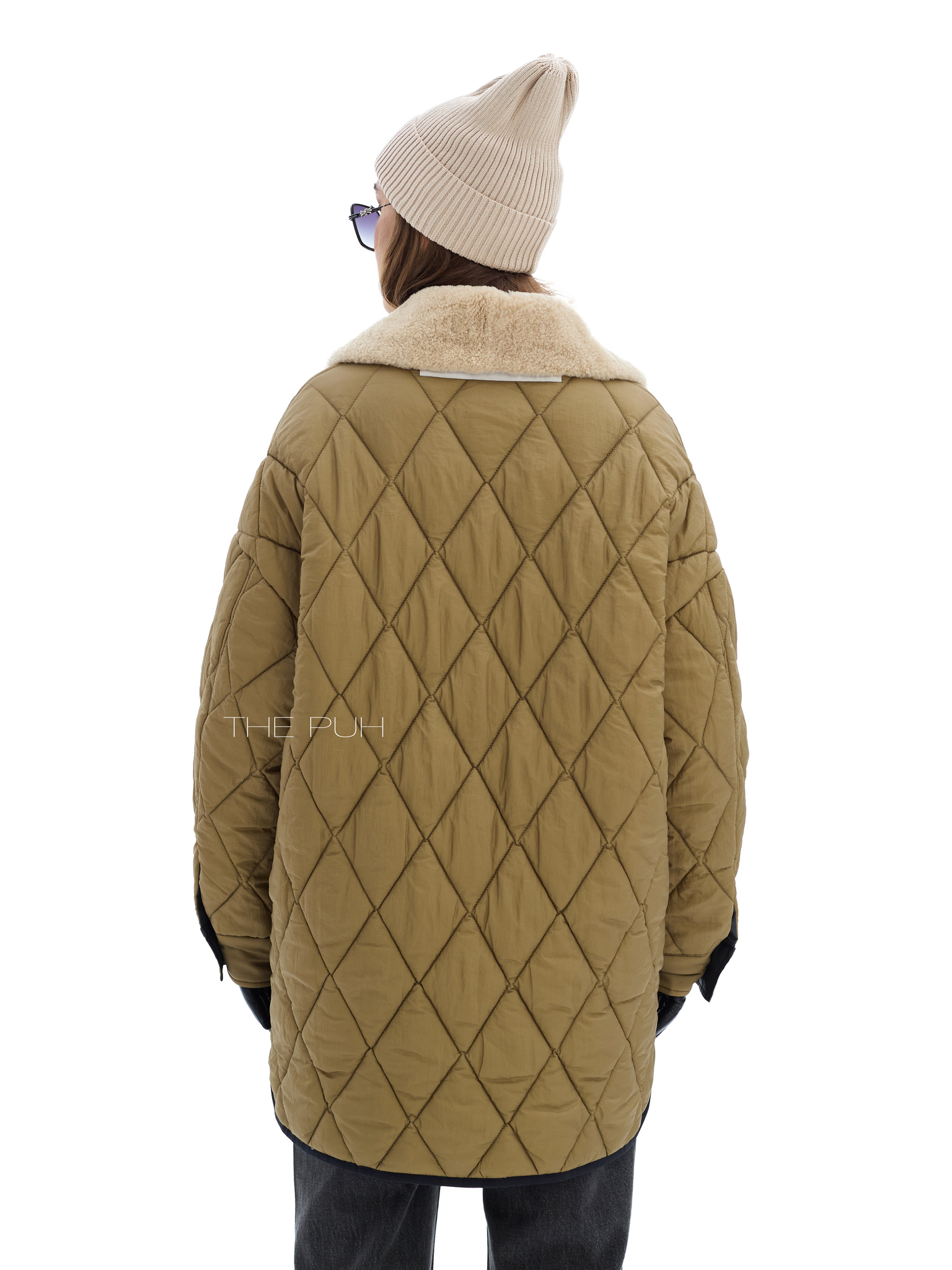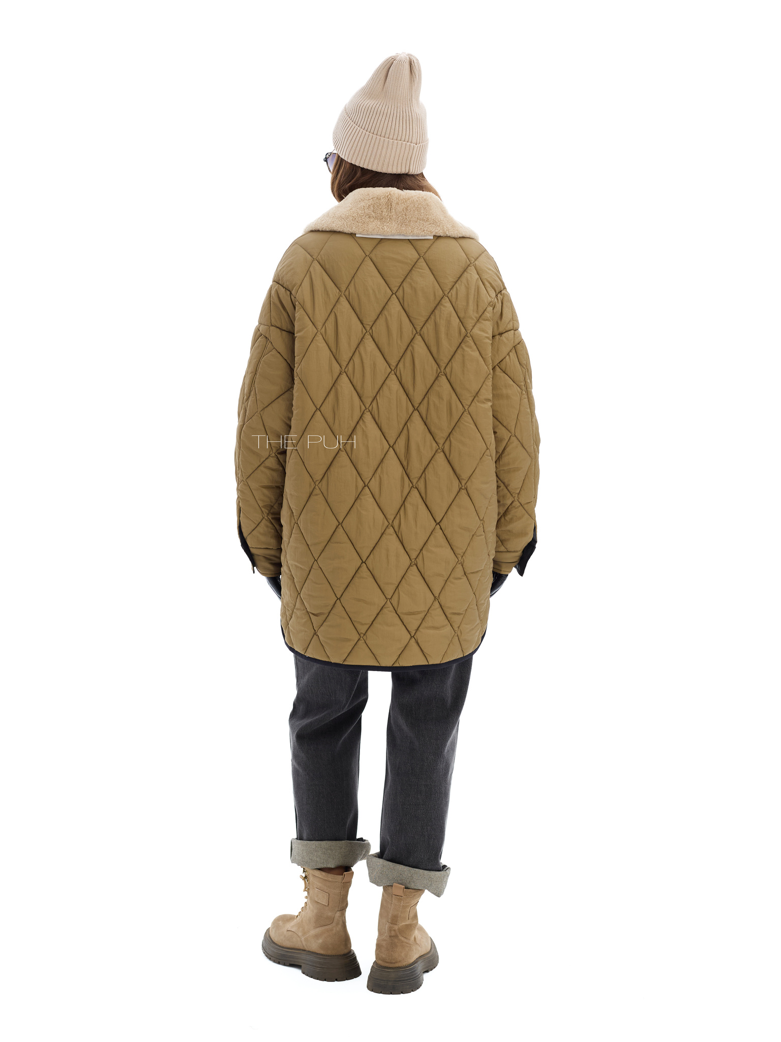 Удлиненная куртка прямого кроя на пуговицах со съемным воротником из эко-меха. Двусторонняя модель: с одной стороны выполнена из стеганого нейлона цвета хаки, а с другой из вощеного водонепроницаемого хлопка. Куртка утеплена пуховым наполнителем "thindown" и подойдет на позднюю осень и первые холода.