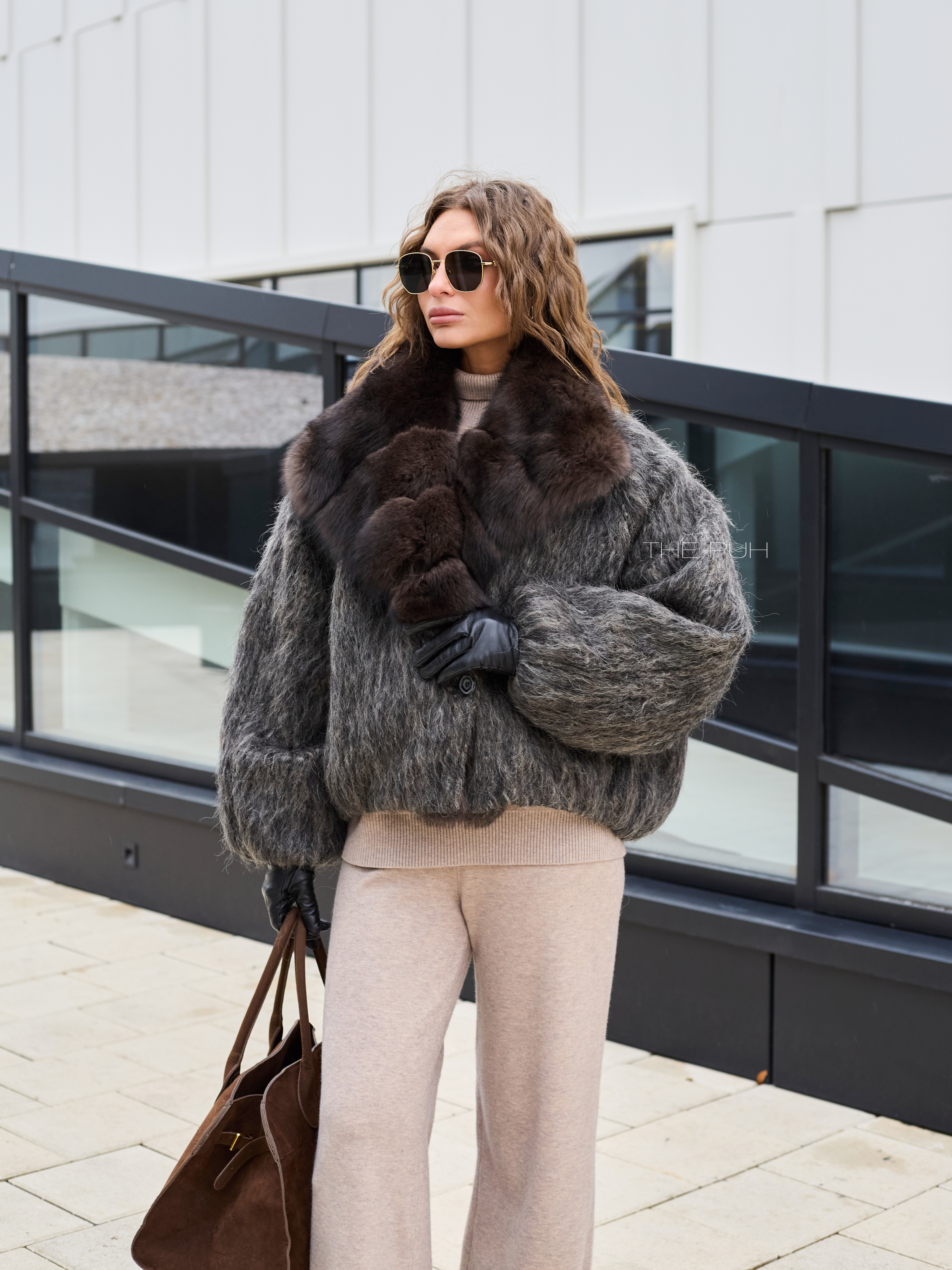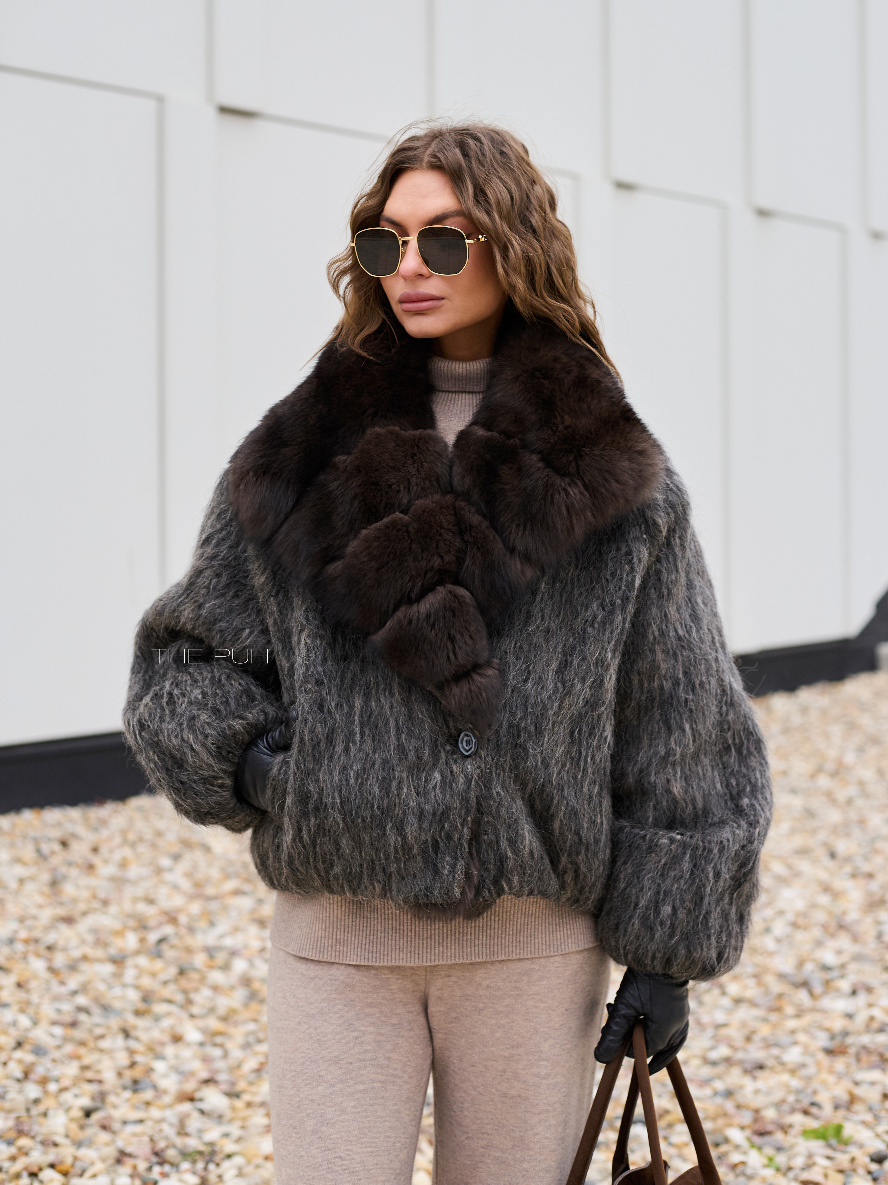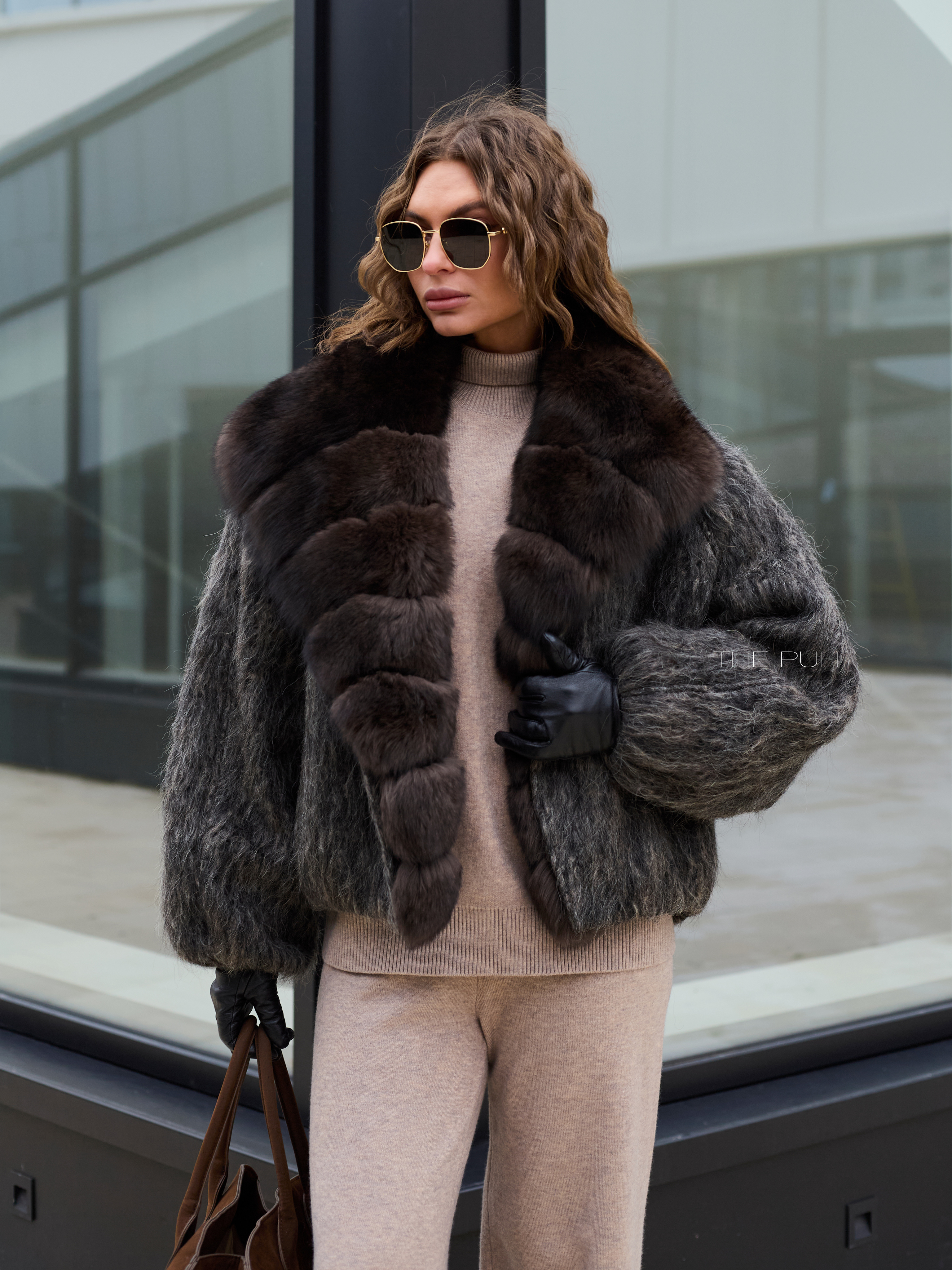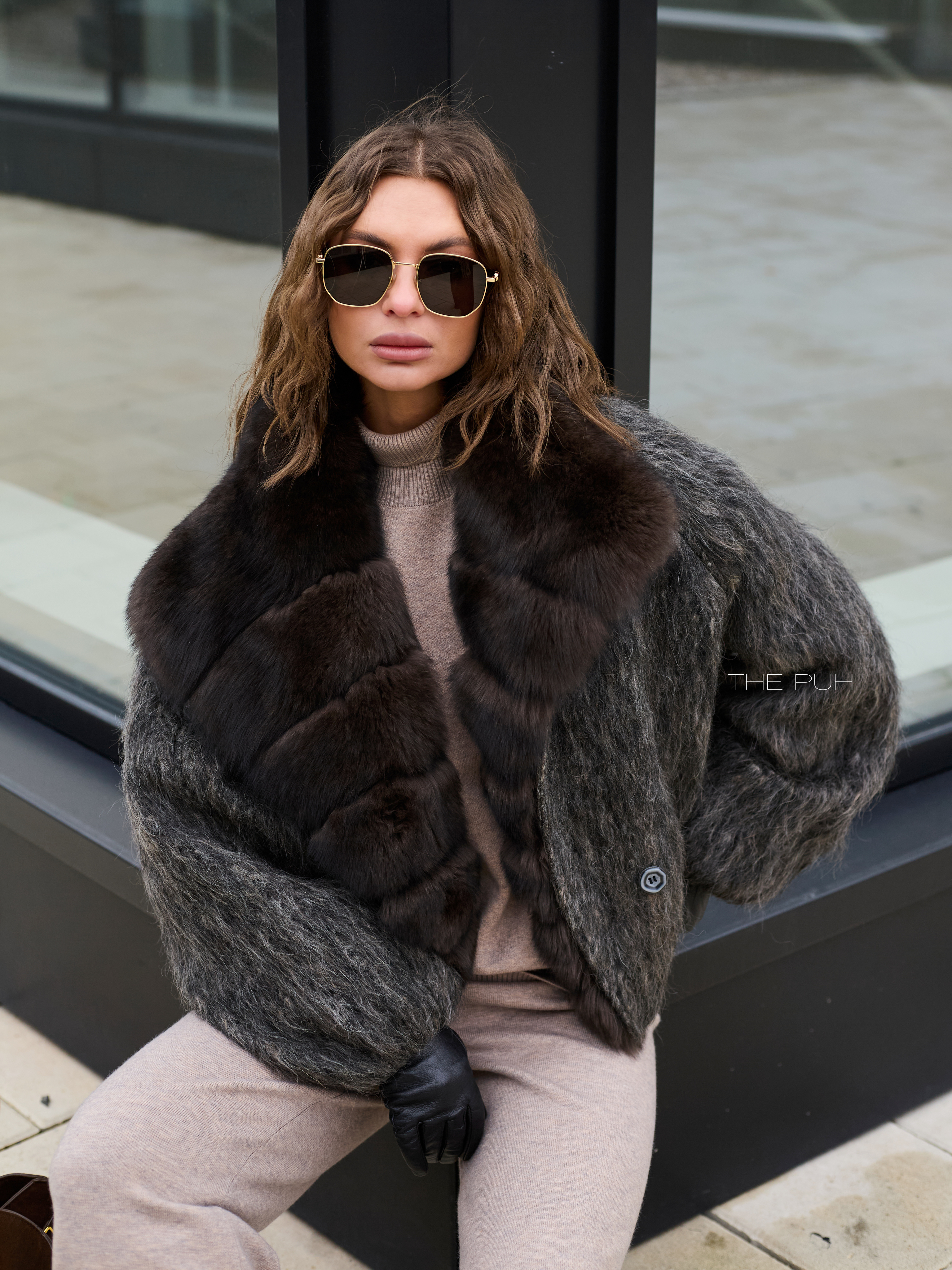 Укороченная куртка выполнена из фактурной шерсти с длинным ворсом серо-коричневого цвета и утеплена наполнителем из пуха и пера. Модель застегивается на пуговицу и декорирована роскошным воротником из меха лисы глубокого шоколадного цвета.