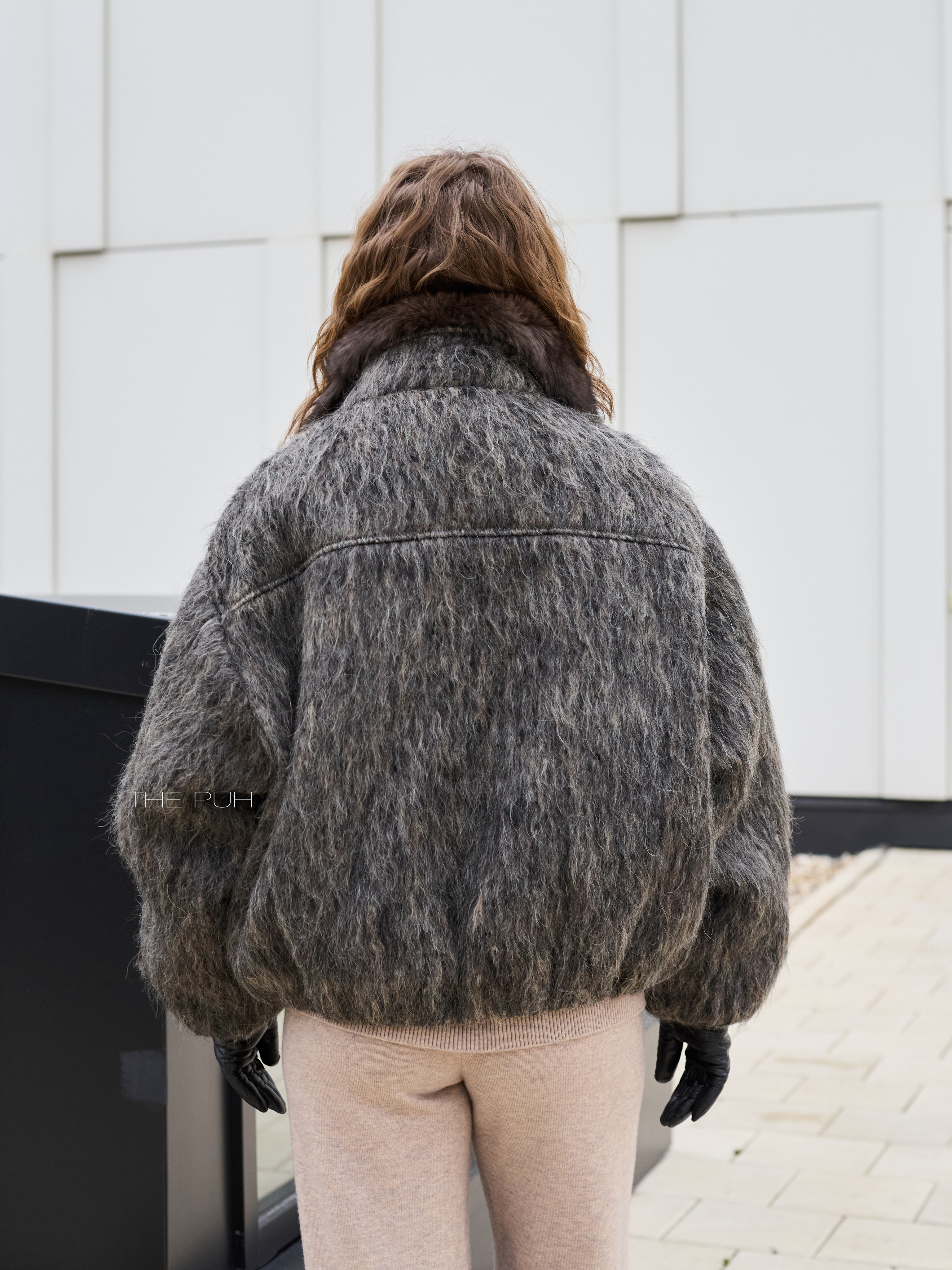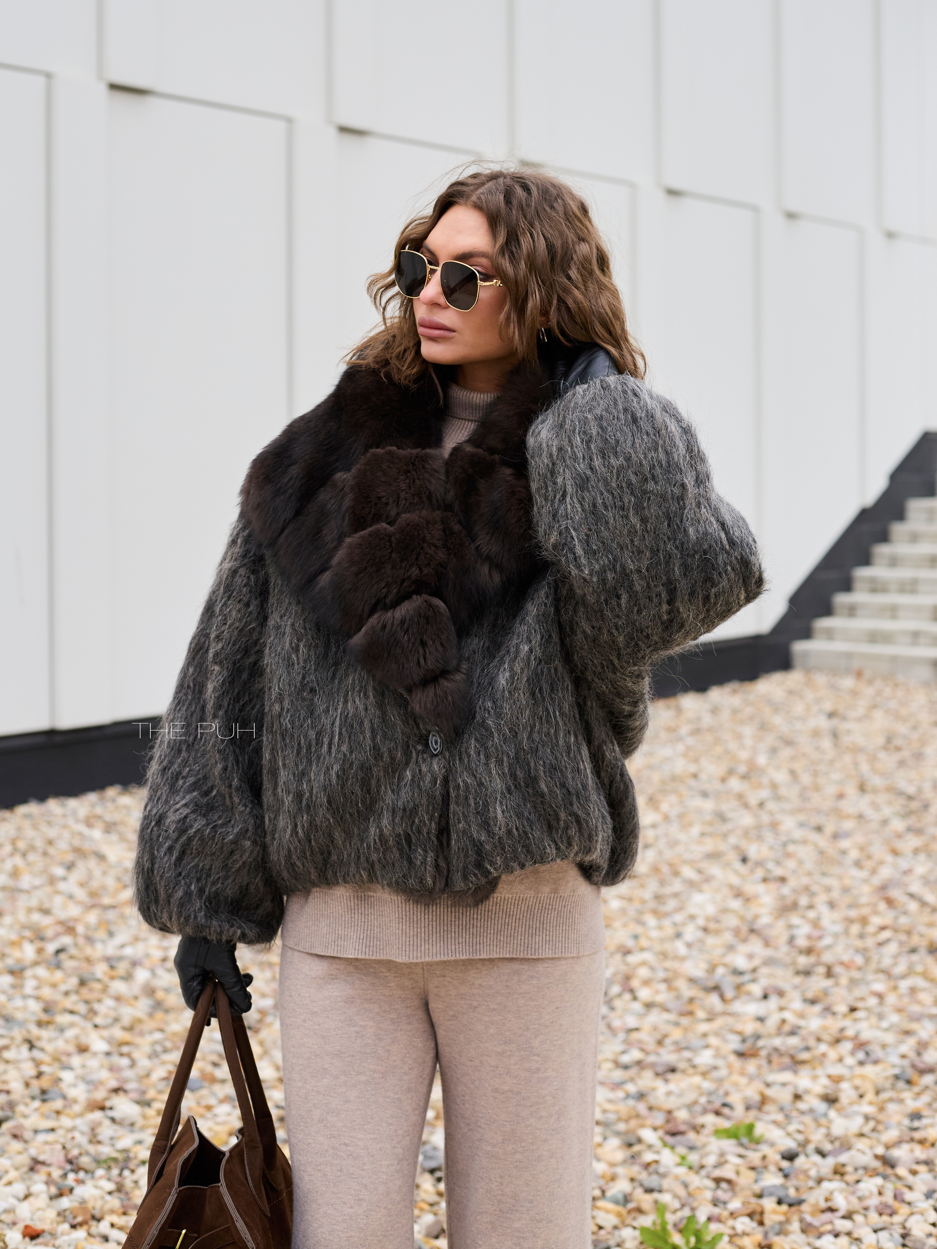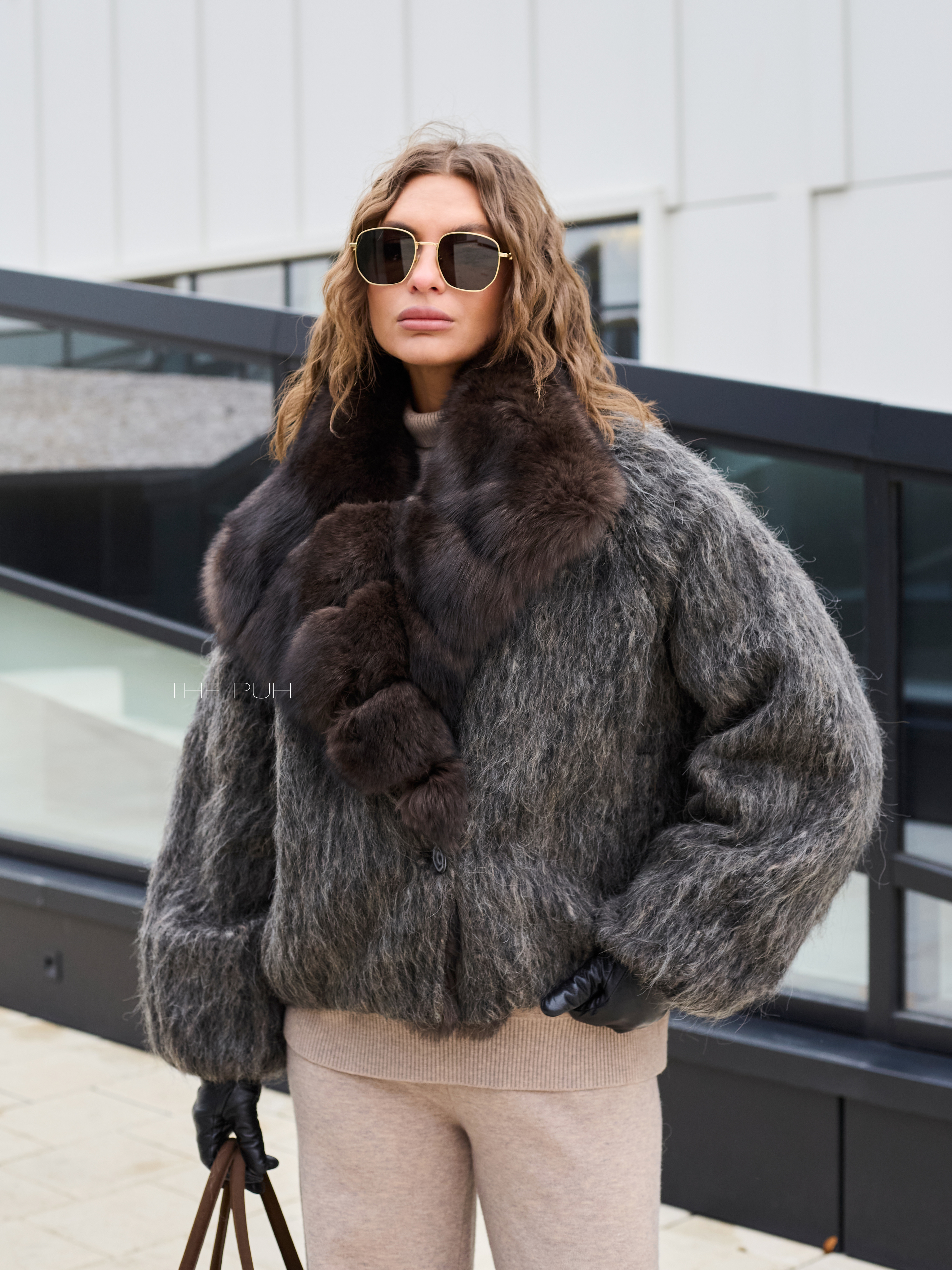 Укороченная куртка выполнена из фактурной шерсти с длинным ворсом серо-коричневого цвета и утеплена наполнителем из пуха и пера. Модель застегивается на пуговицу и декорирована роскошным воротником из меха лисы глубокого шоколадного цвета.