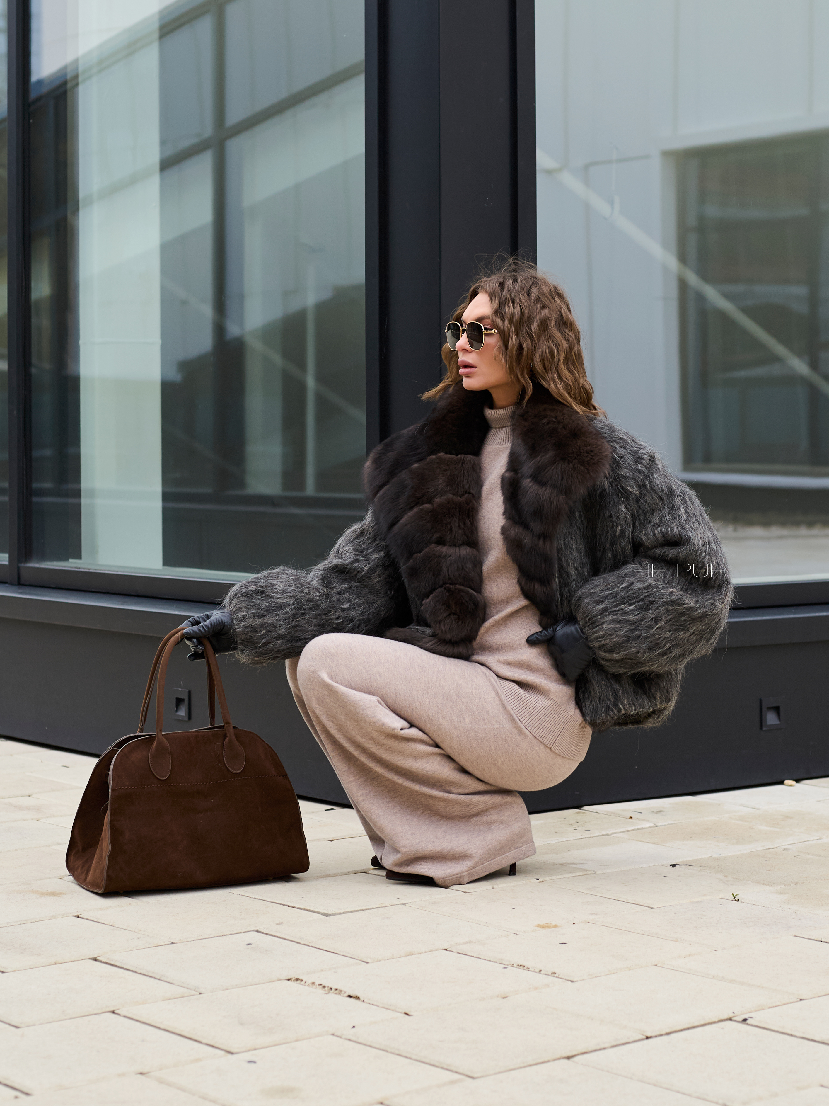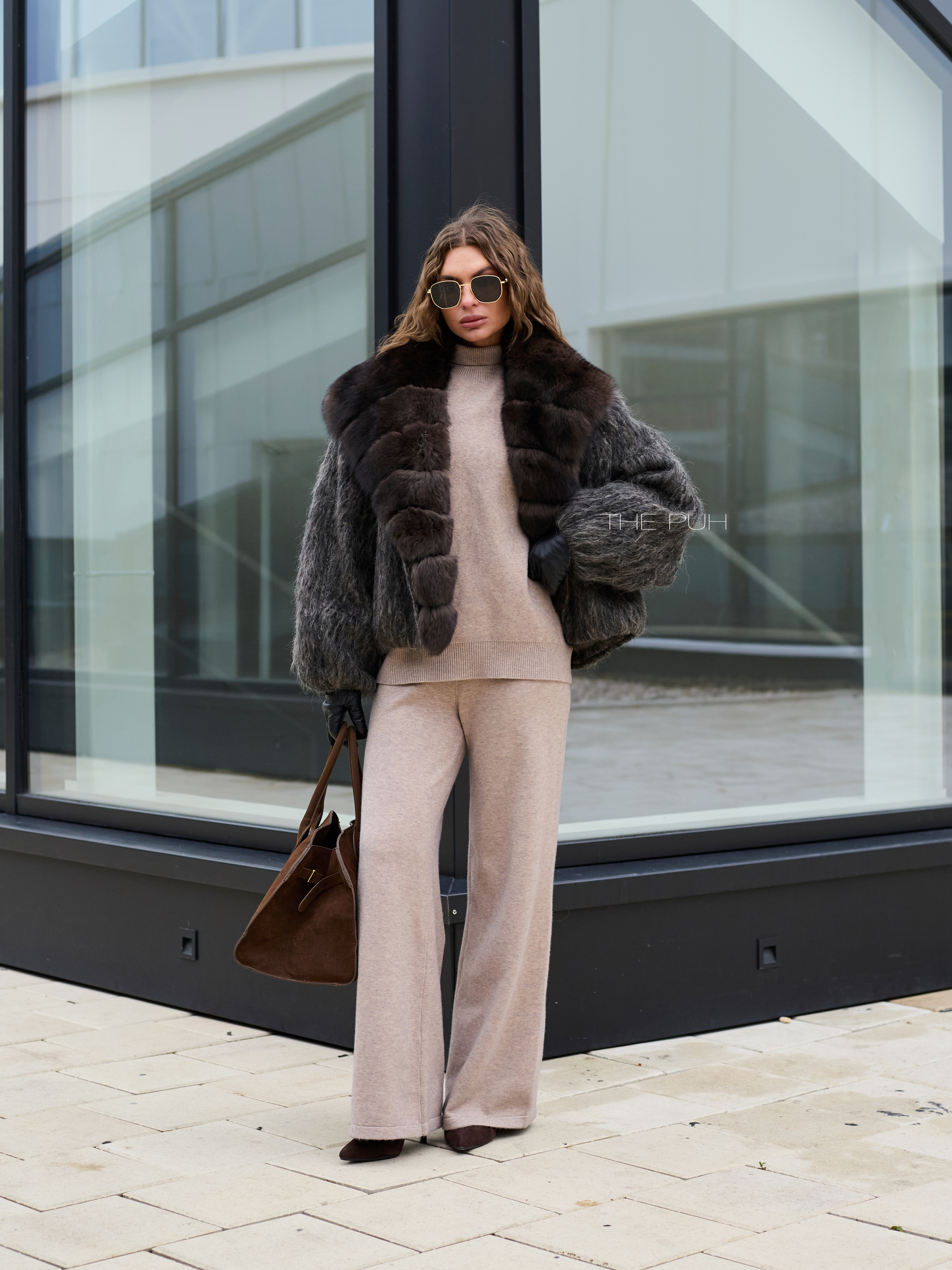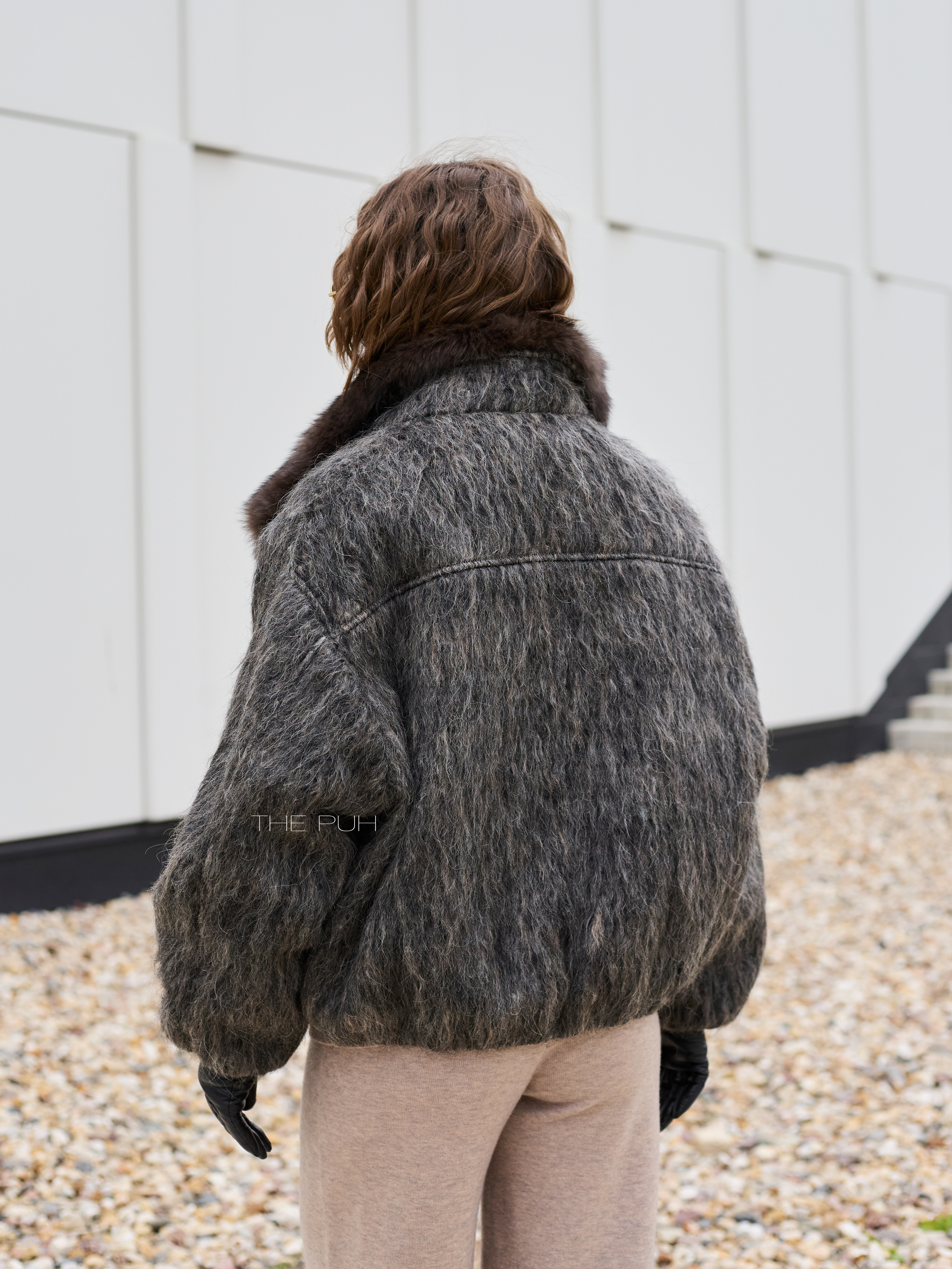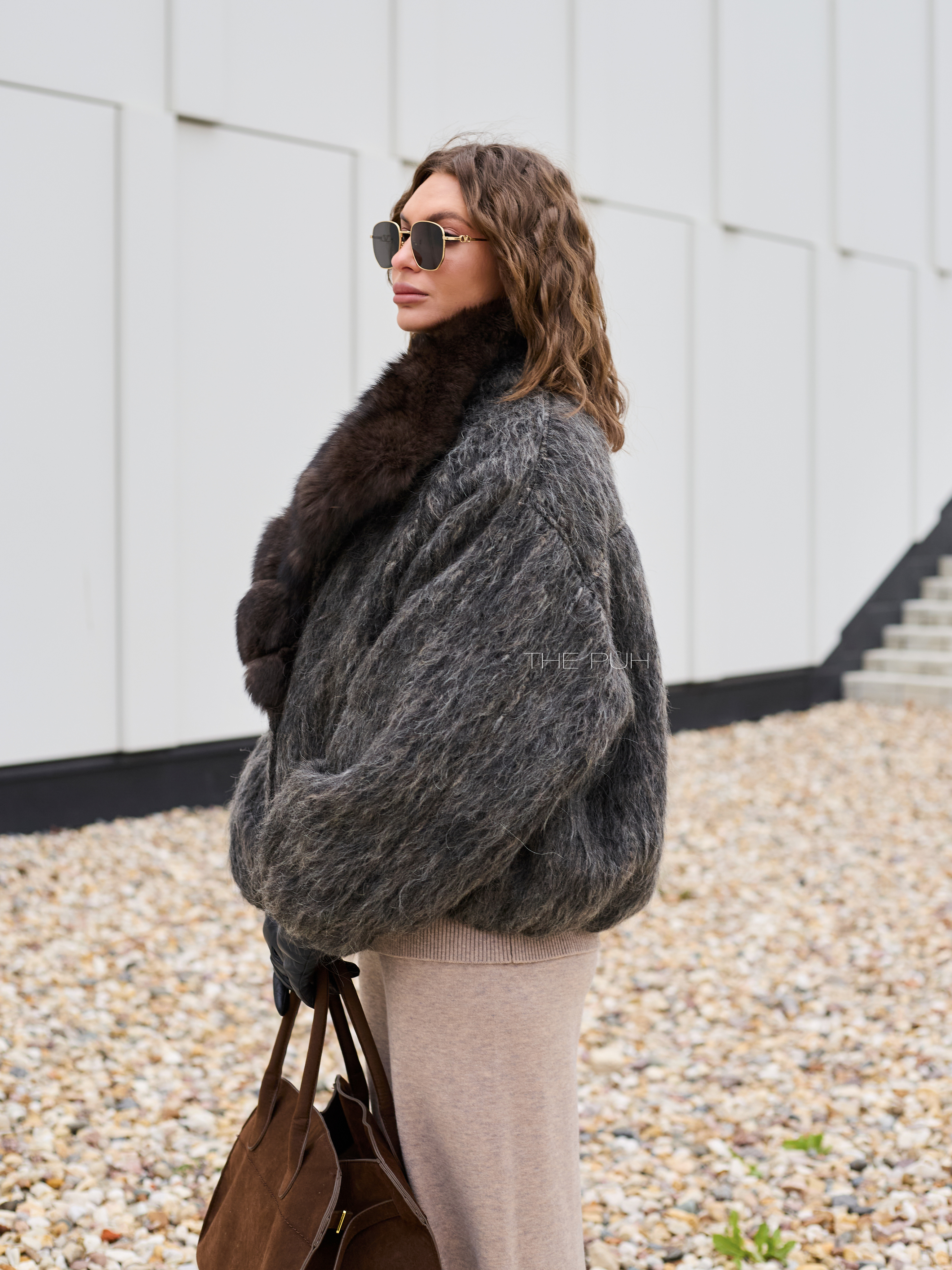 Укороченная куртка выполнена из фактурной шерсти с длинным ворсом серо-коричневого цвета и утеплена наполнителем из пуха и пера. Модель застегивается на пуговицу и декорирована роскошным воротником из меха лисы глубокого шоколадного цвета.