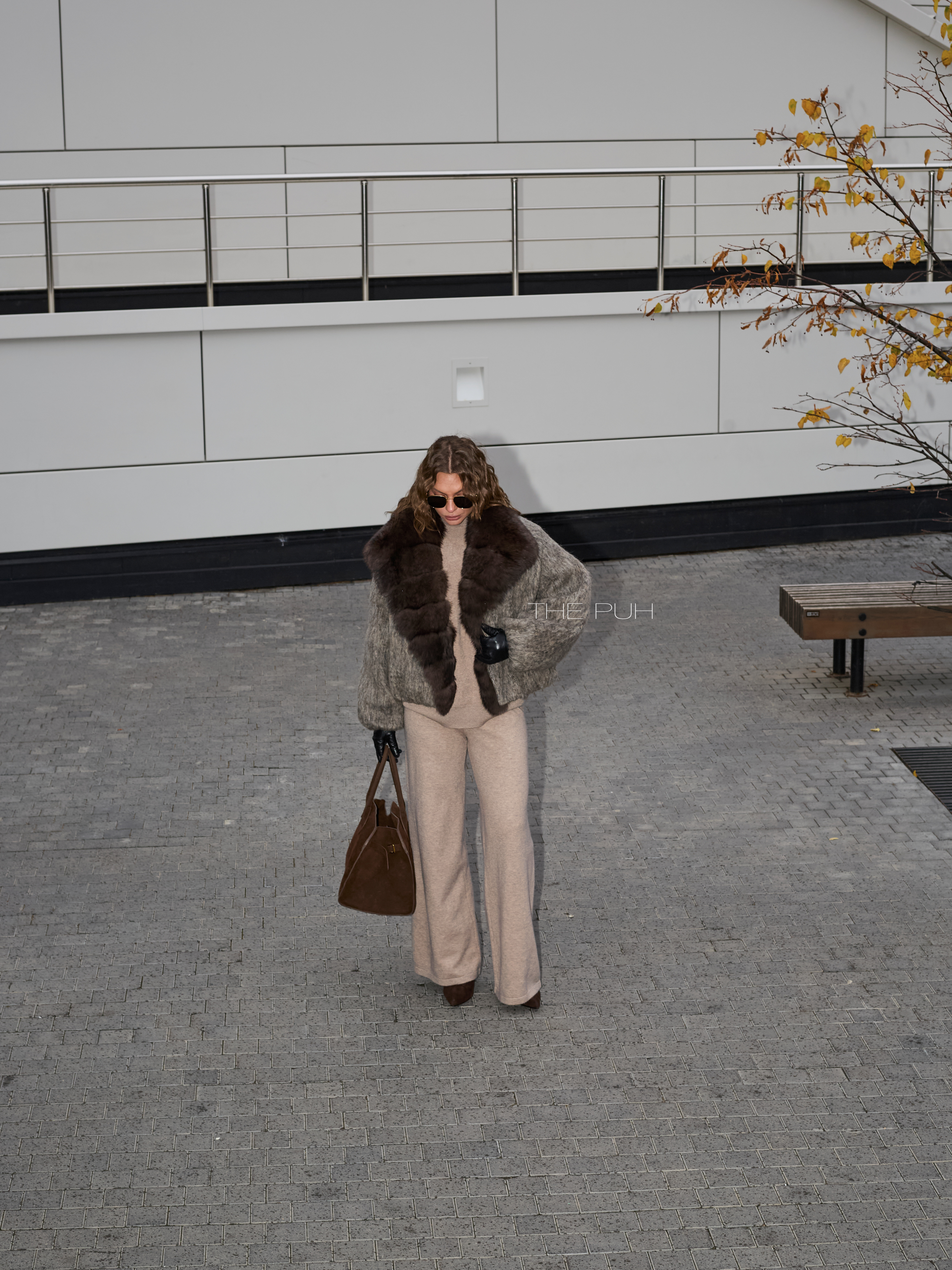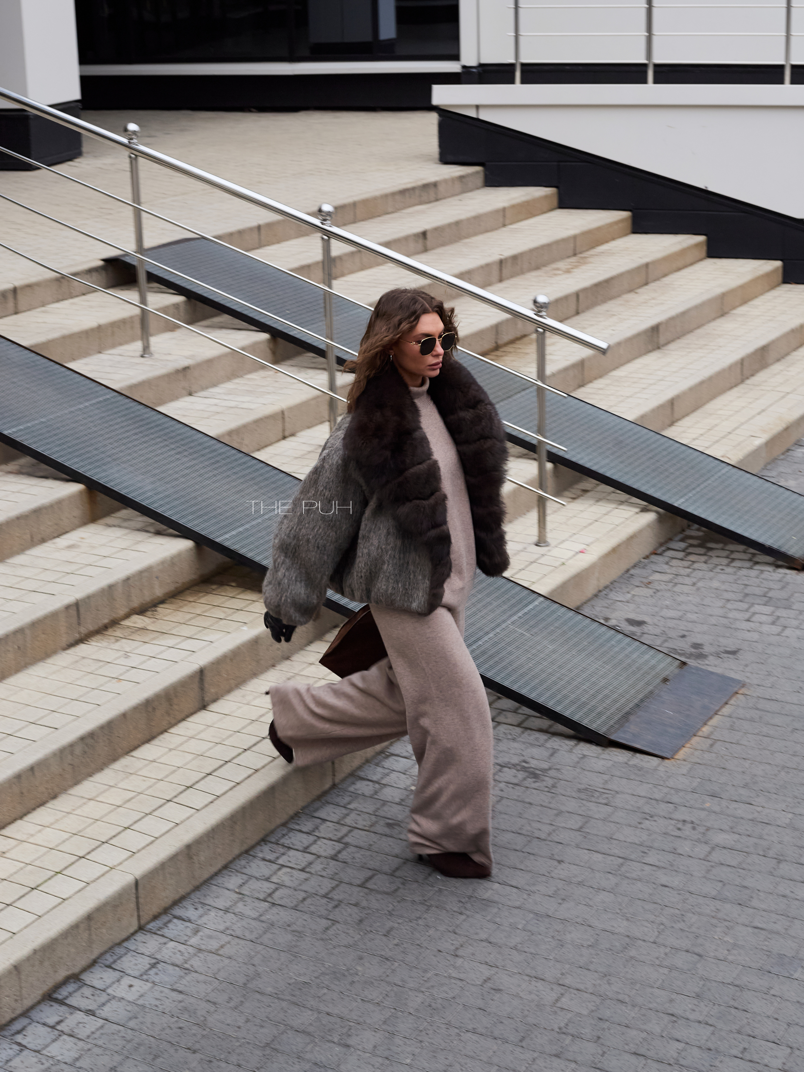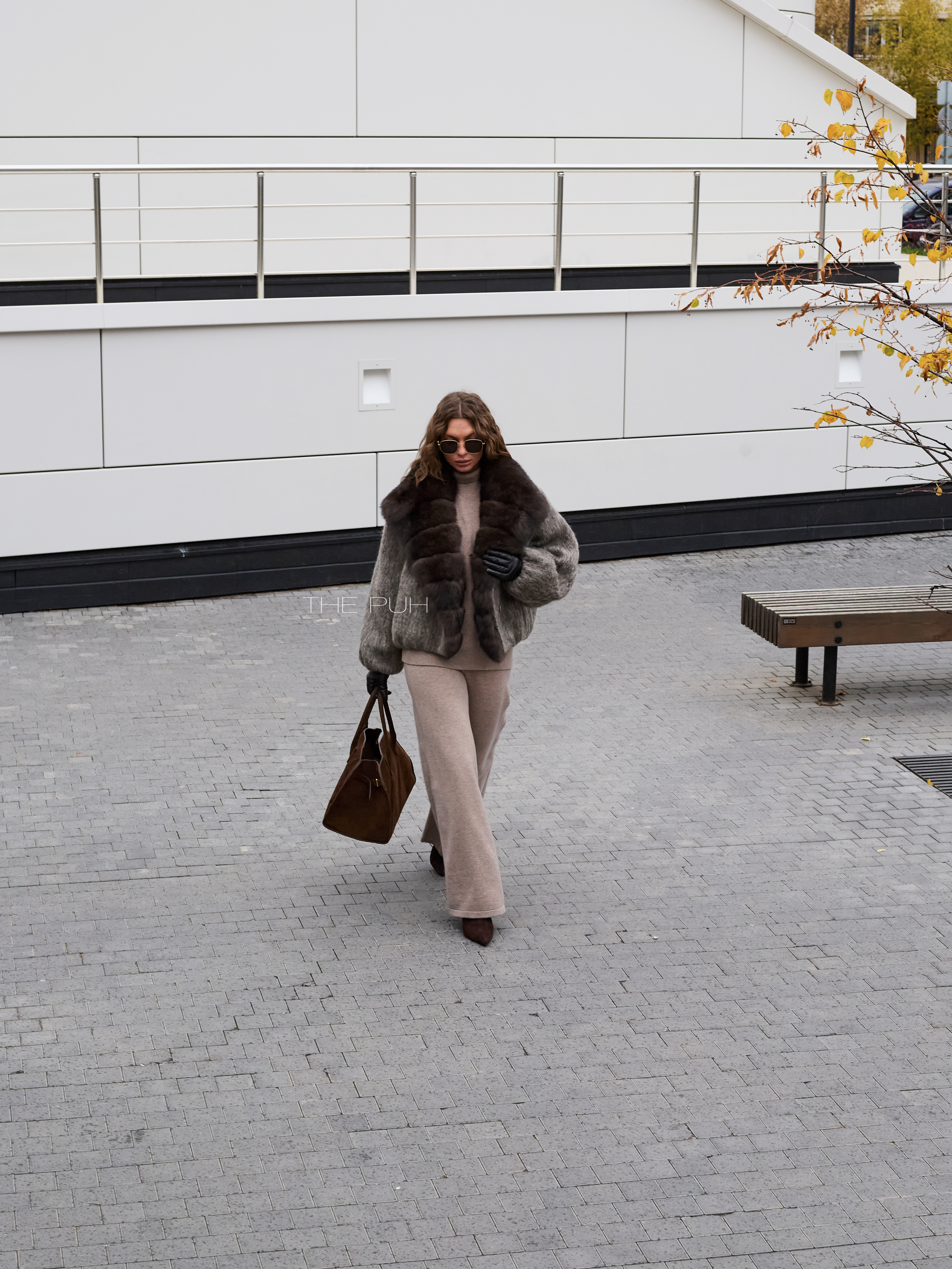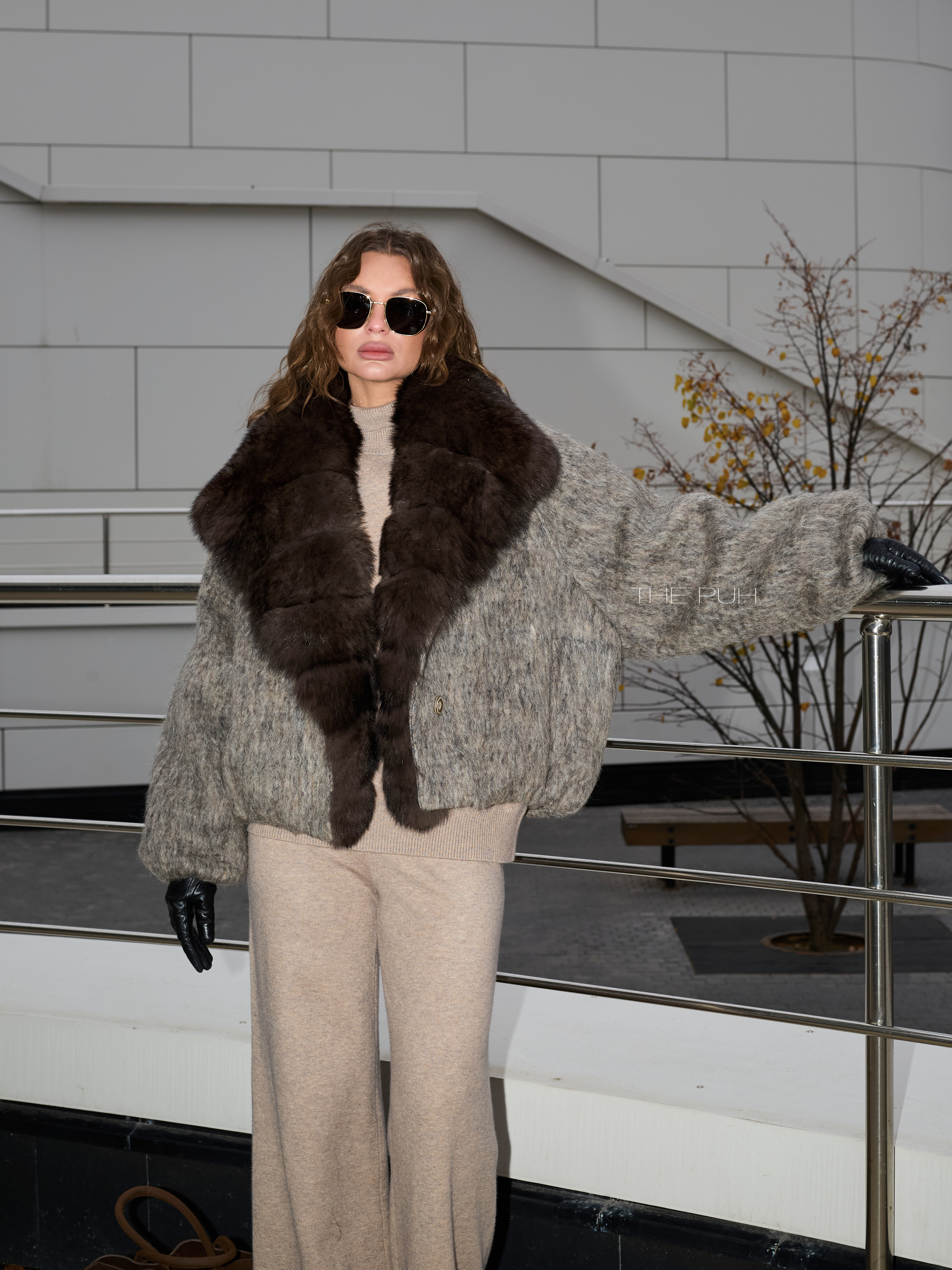 Укороченная куртка выполнена из фактурной шерсти с длинным ворсом цвета капучино и утеплена наполнителем из пуха и пера. Модель застегивается на пуговицу и декорирована роскошным воротником из меха лисы глубокого шоколадного цвета.