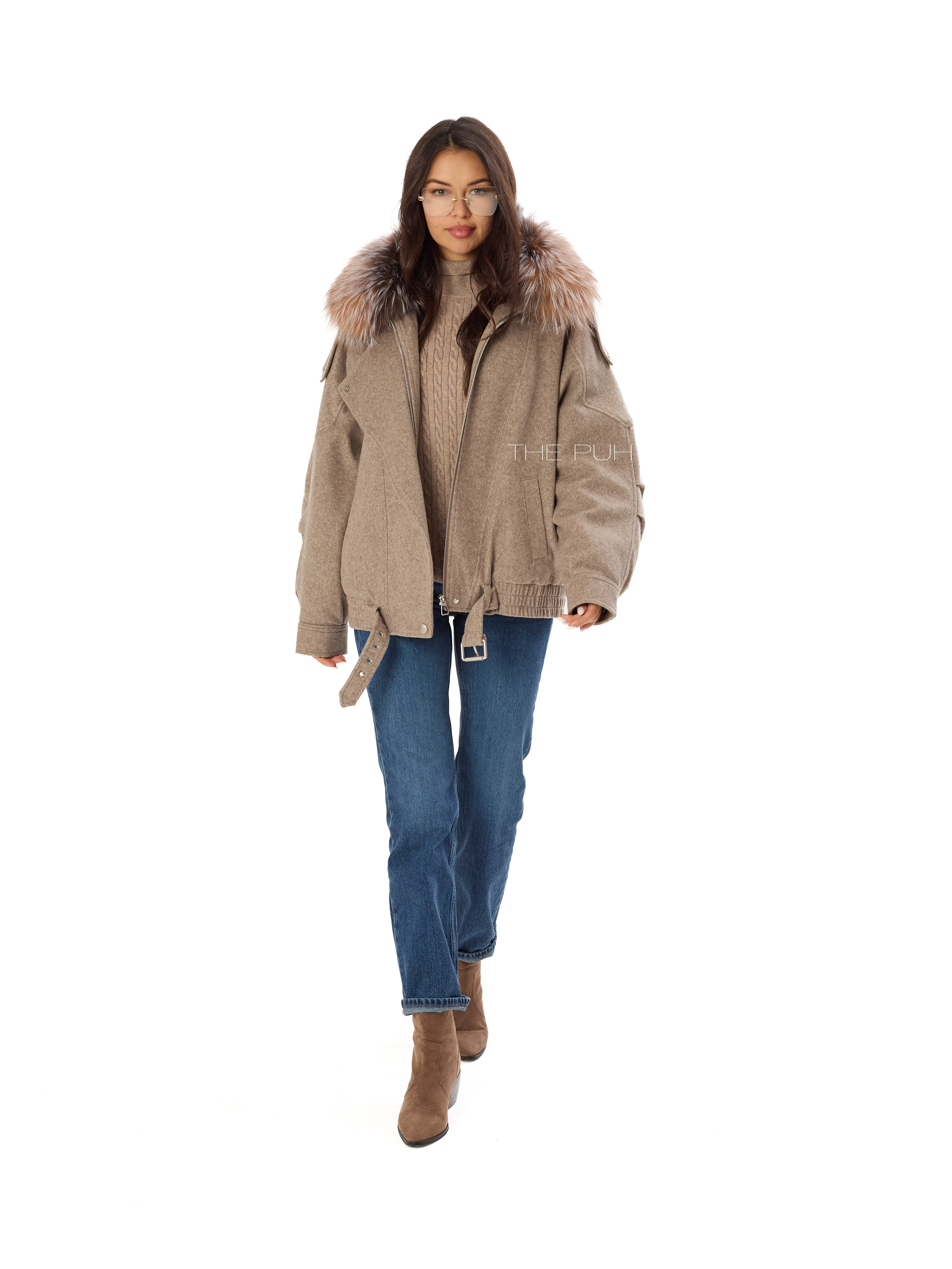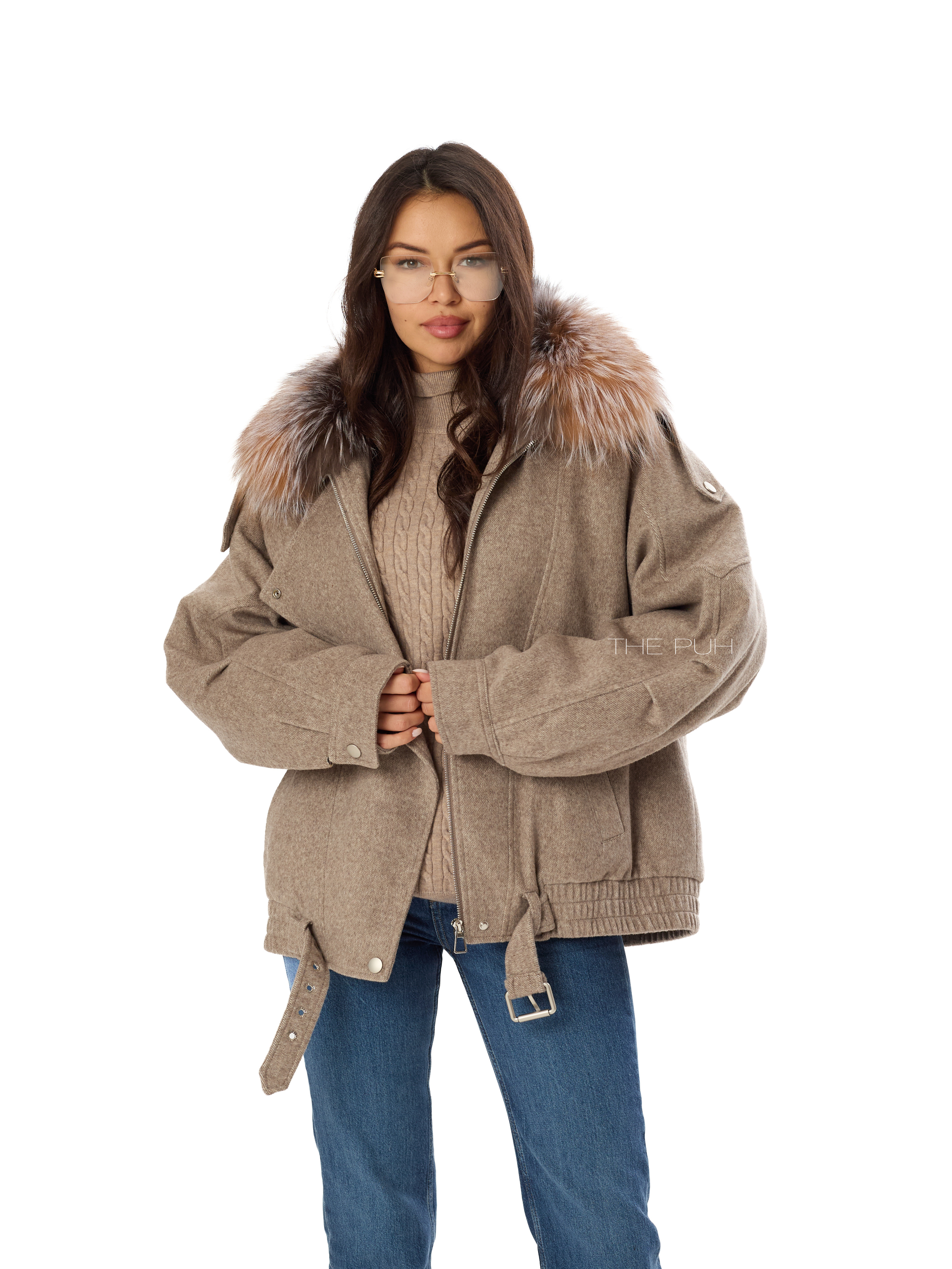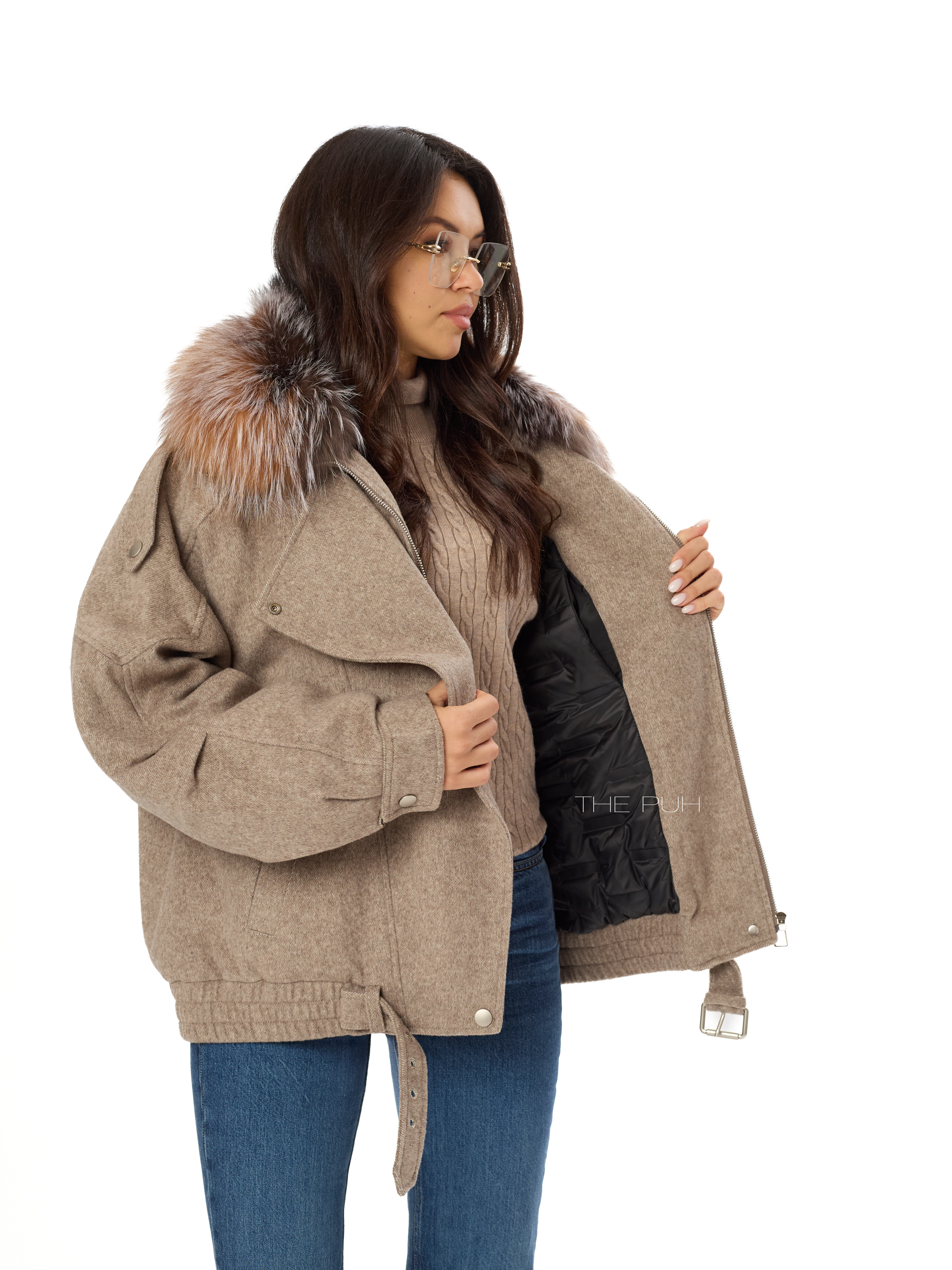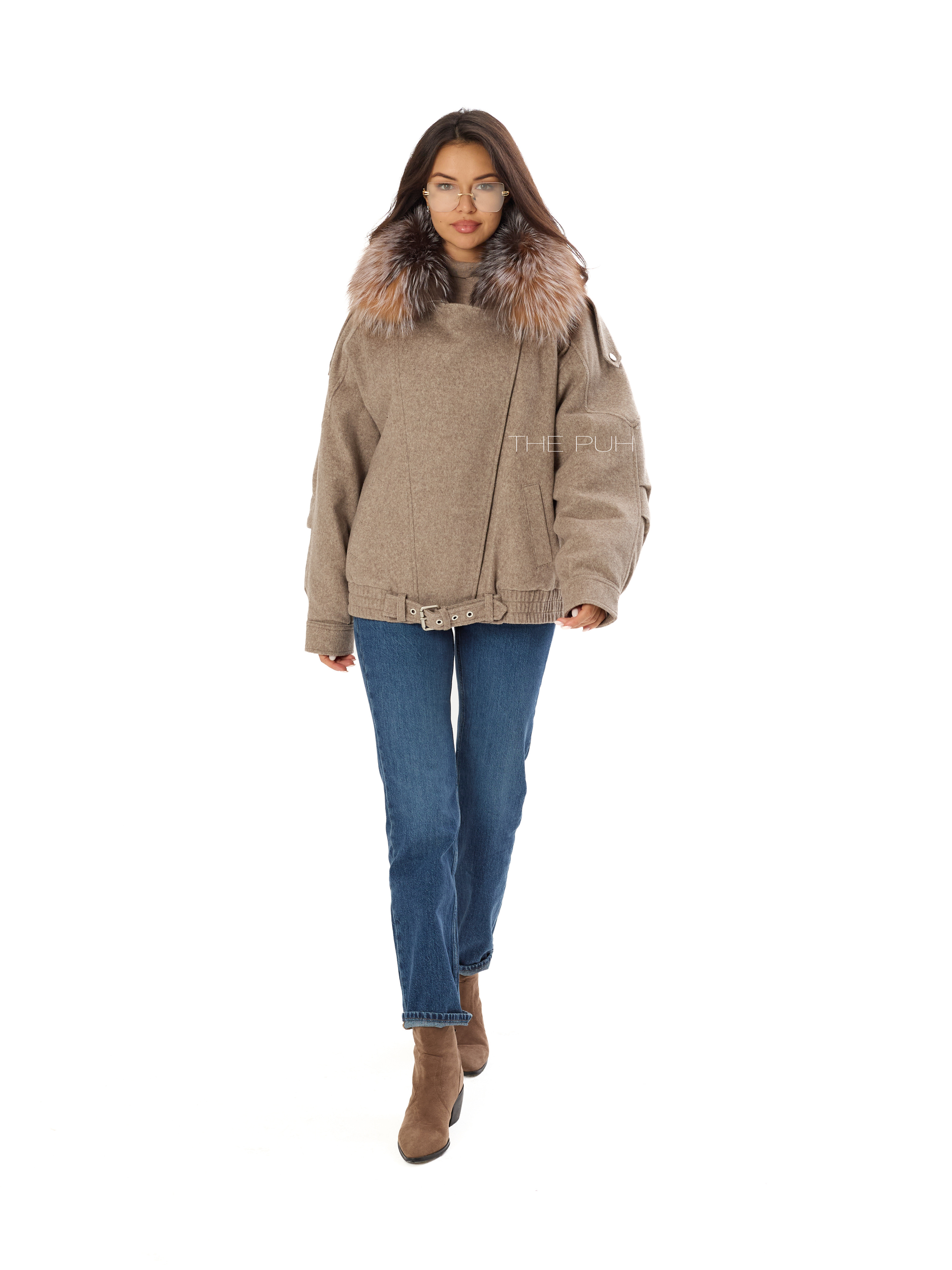 Шерстяная куртка цвета капучино с меховым воротником и утепленным подкладом с натуральным пухом. Модель до середины бедра дополнена широкой ветрозащитной планкой и ремешком с пряжкой. Воротник из меха енота снимается.
