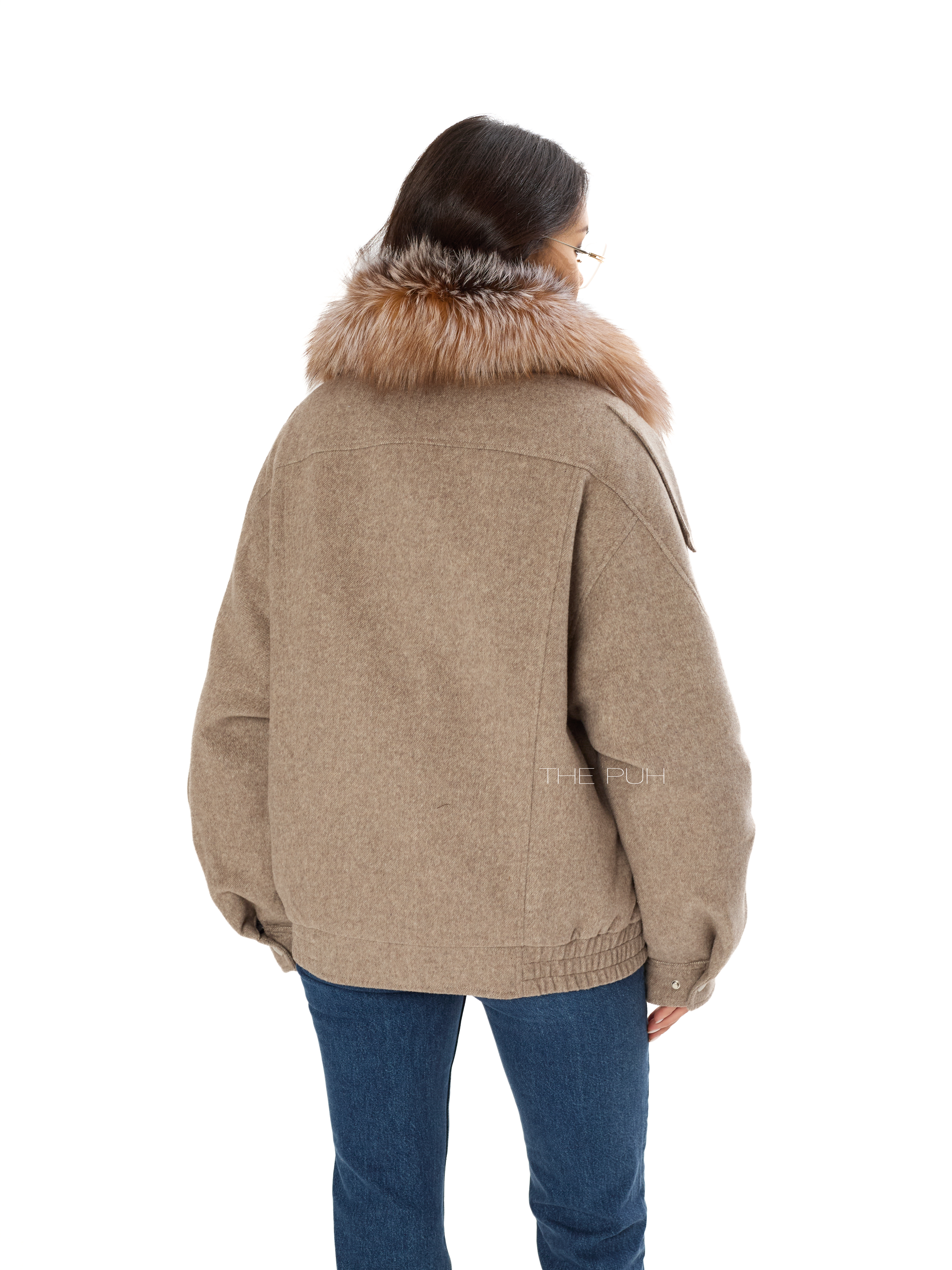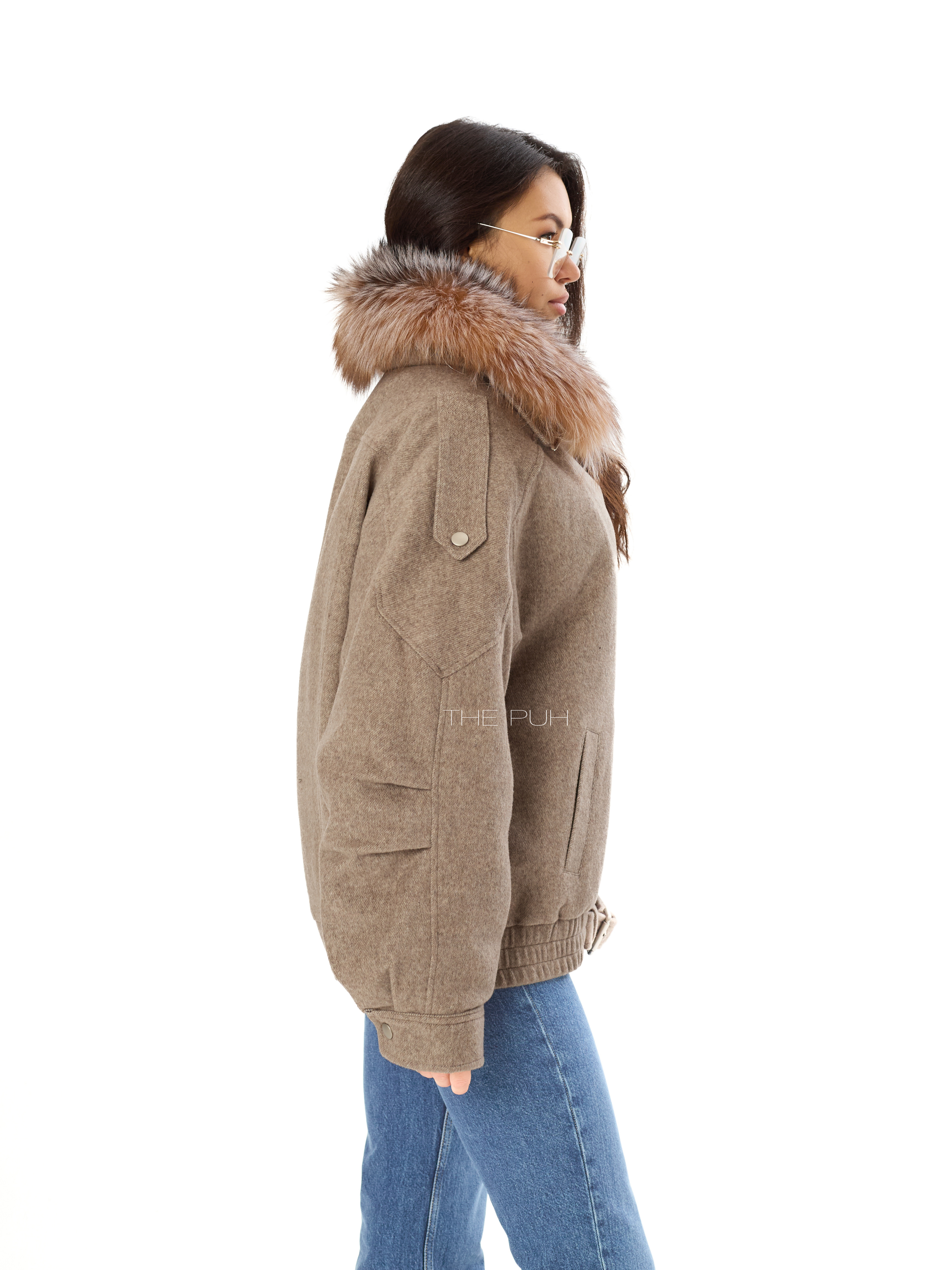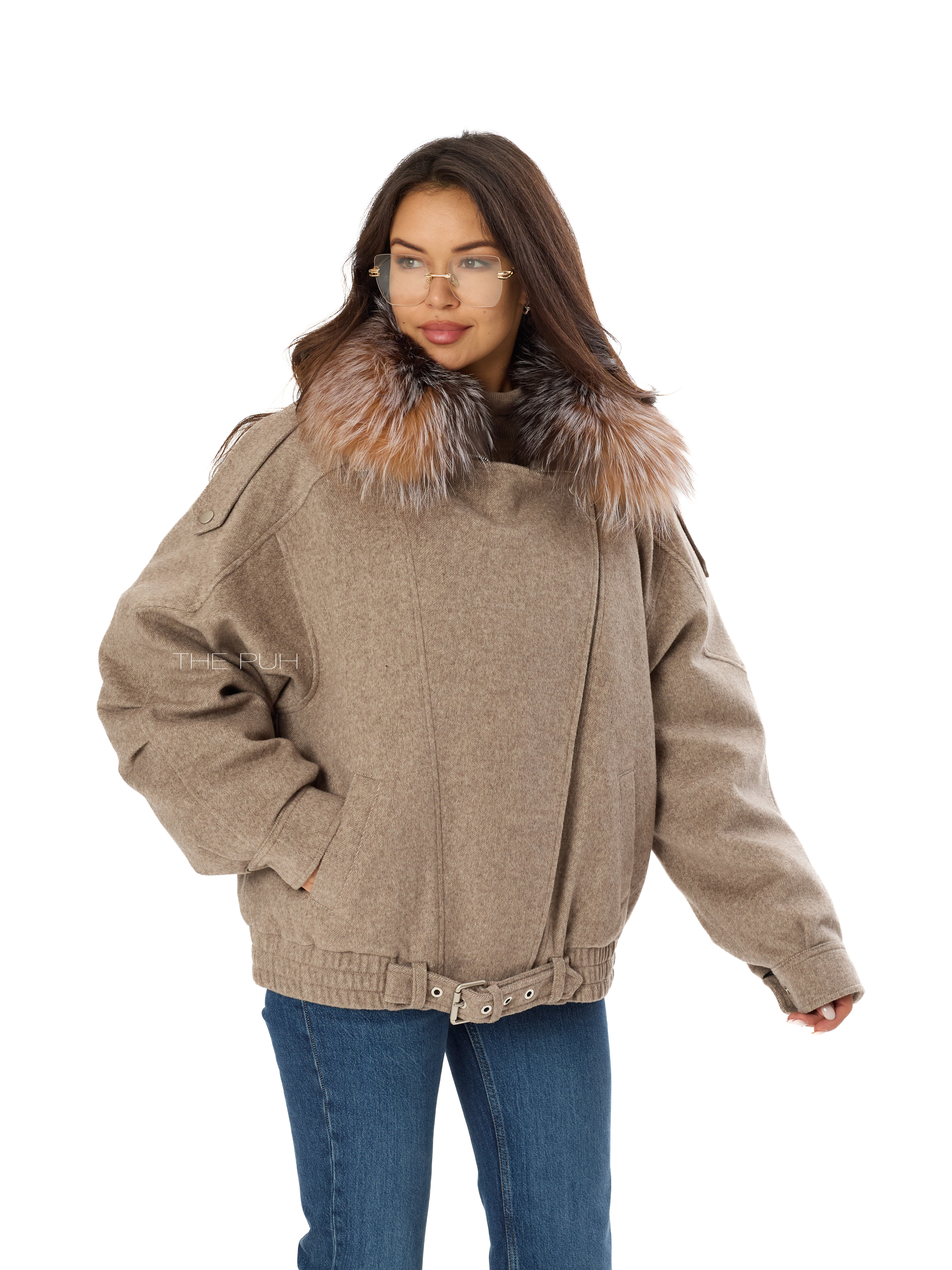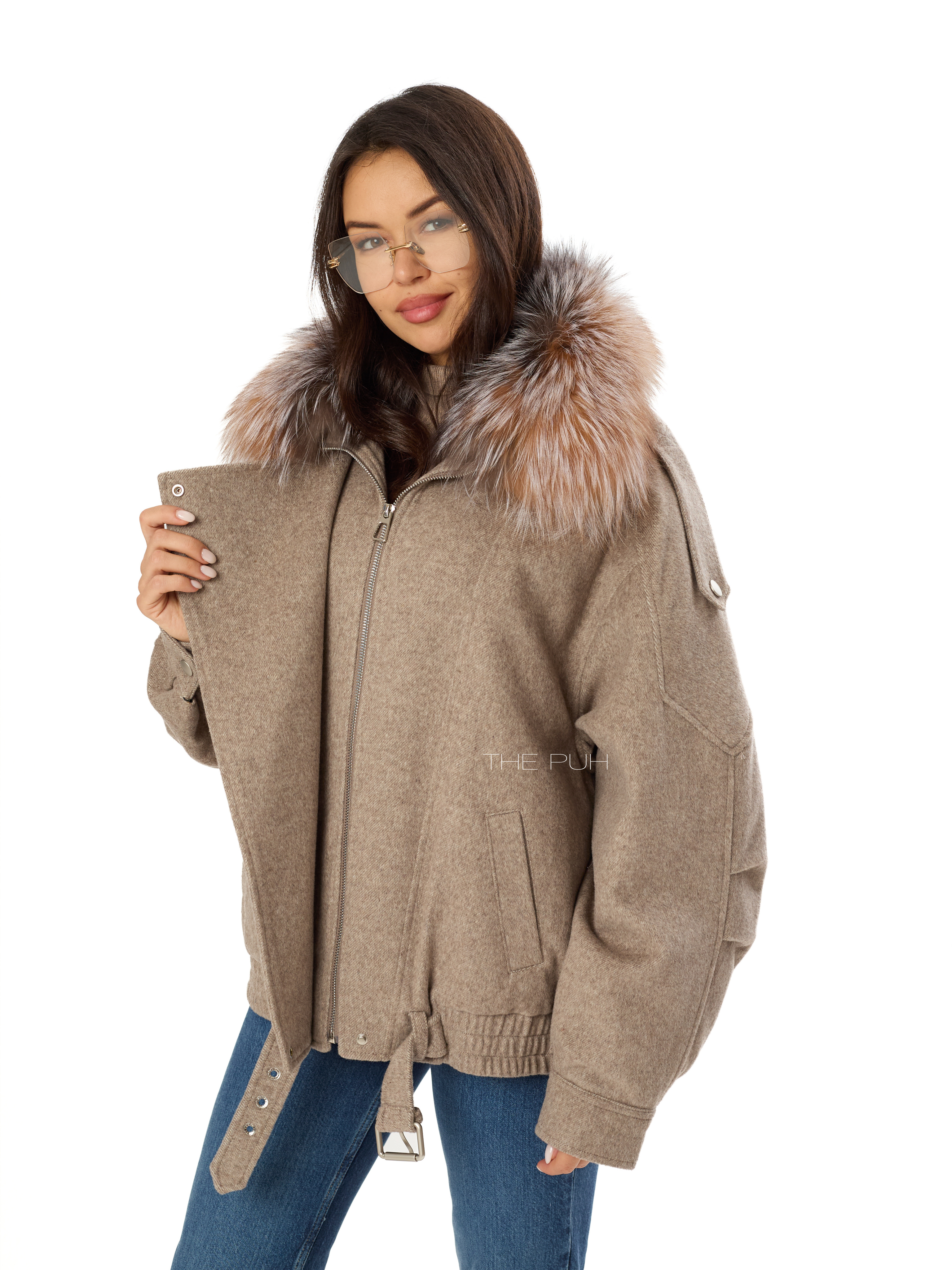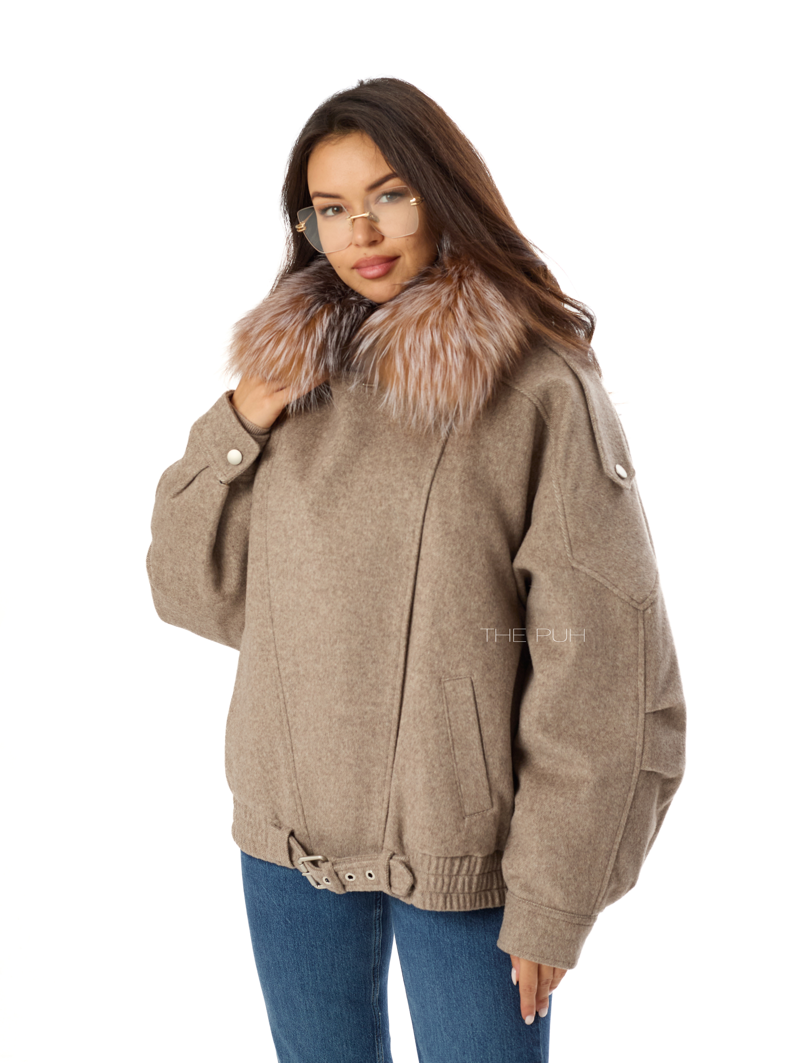 Шерстяная куртка цвета капучино с меховым воротником и утепленным подкладом с натуральным пухом. Модель до середины бедра дополнена широкой ветрозащитной планкой и ремешком с пряжкой. Воротник из меха енота снимается.