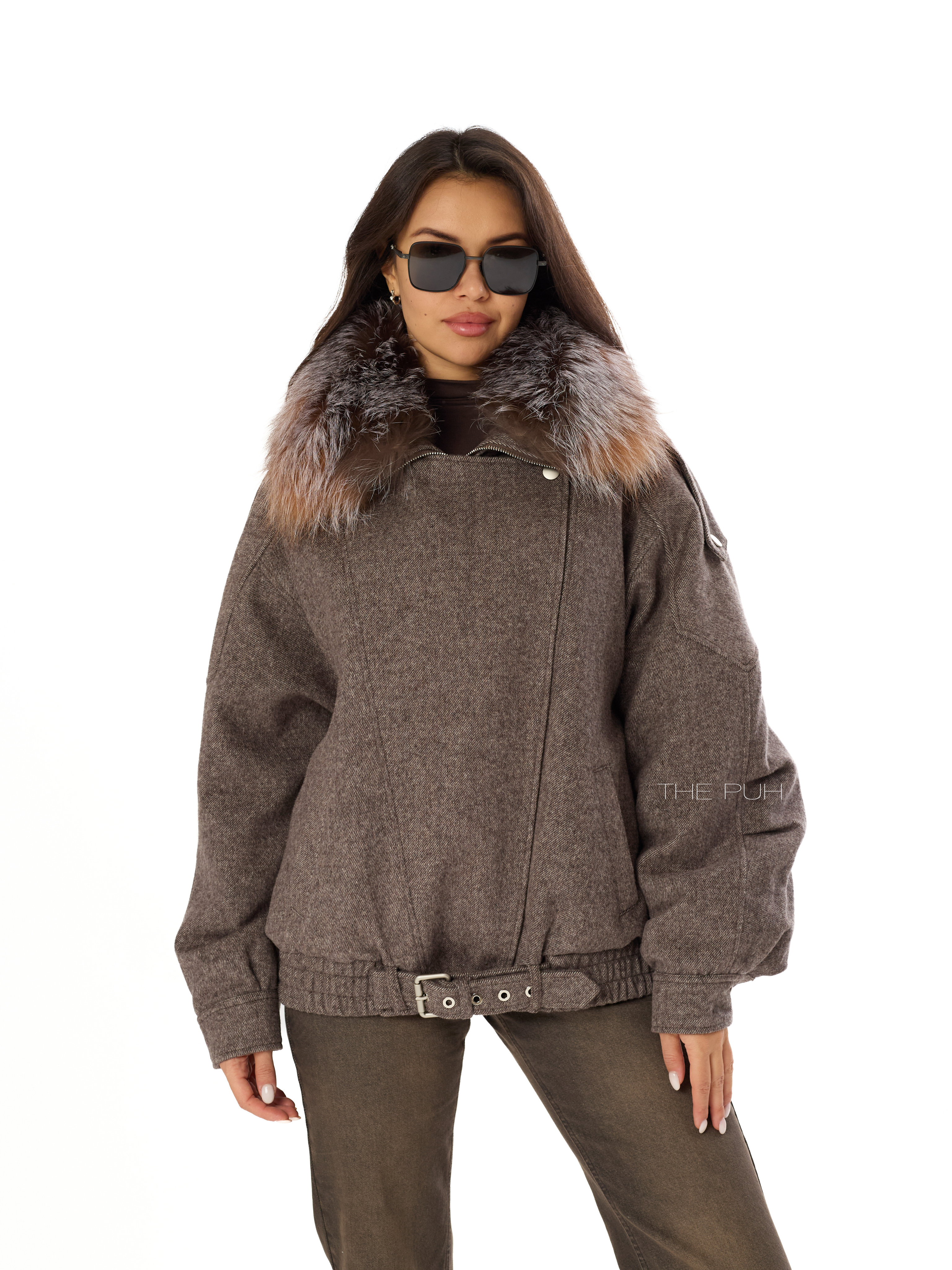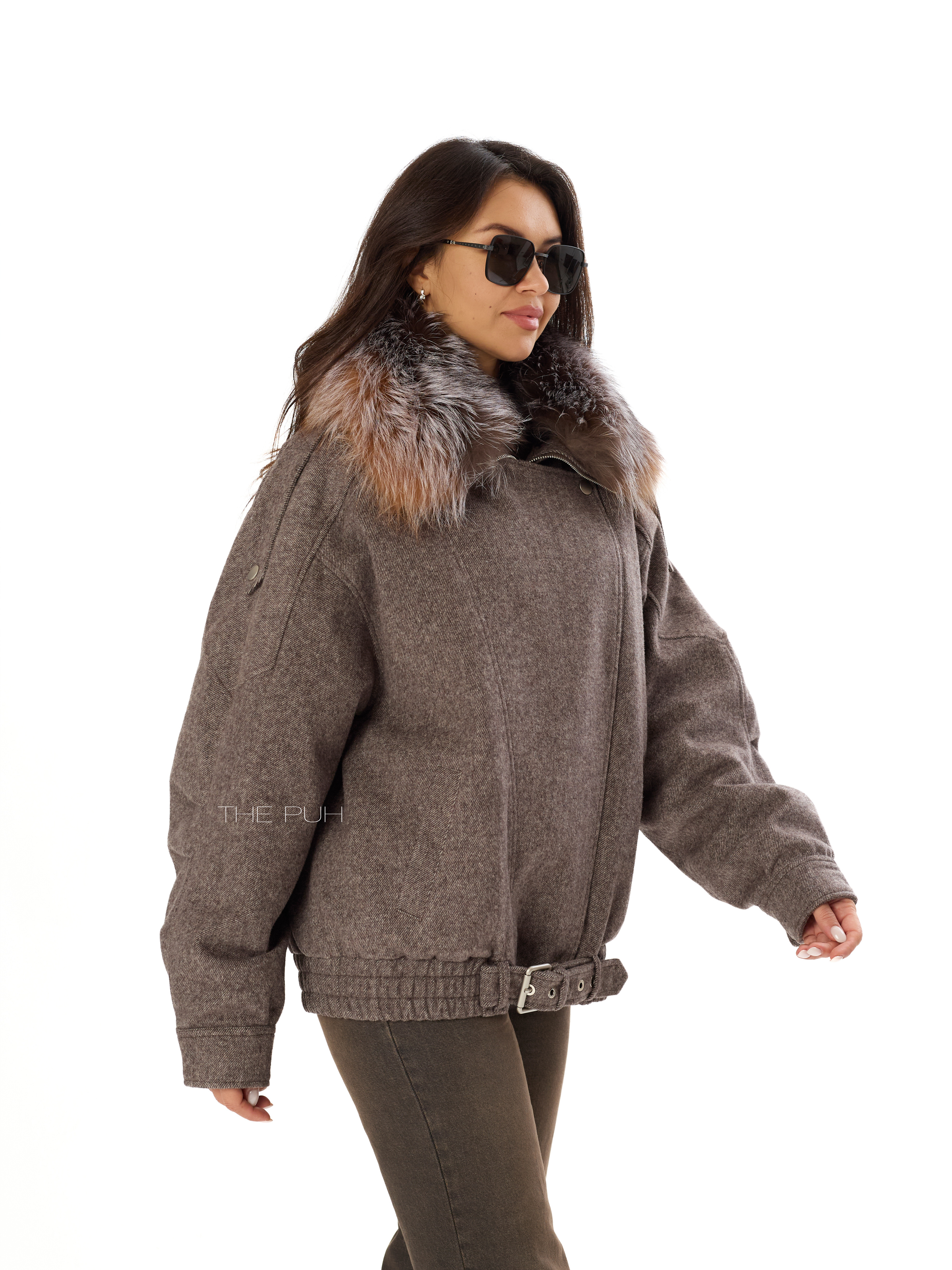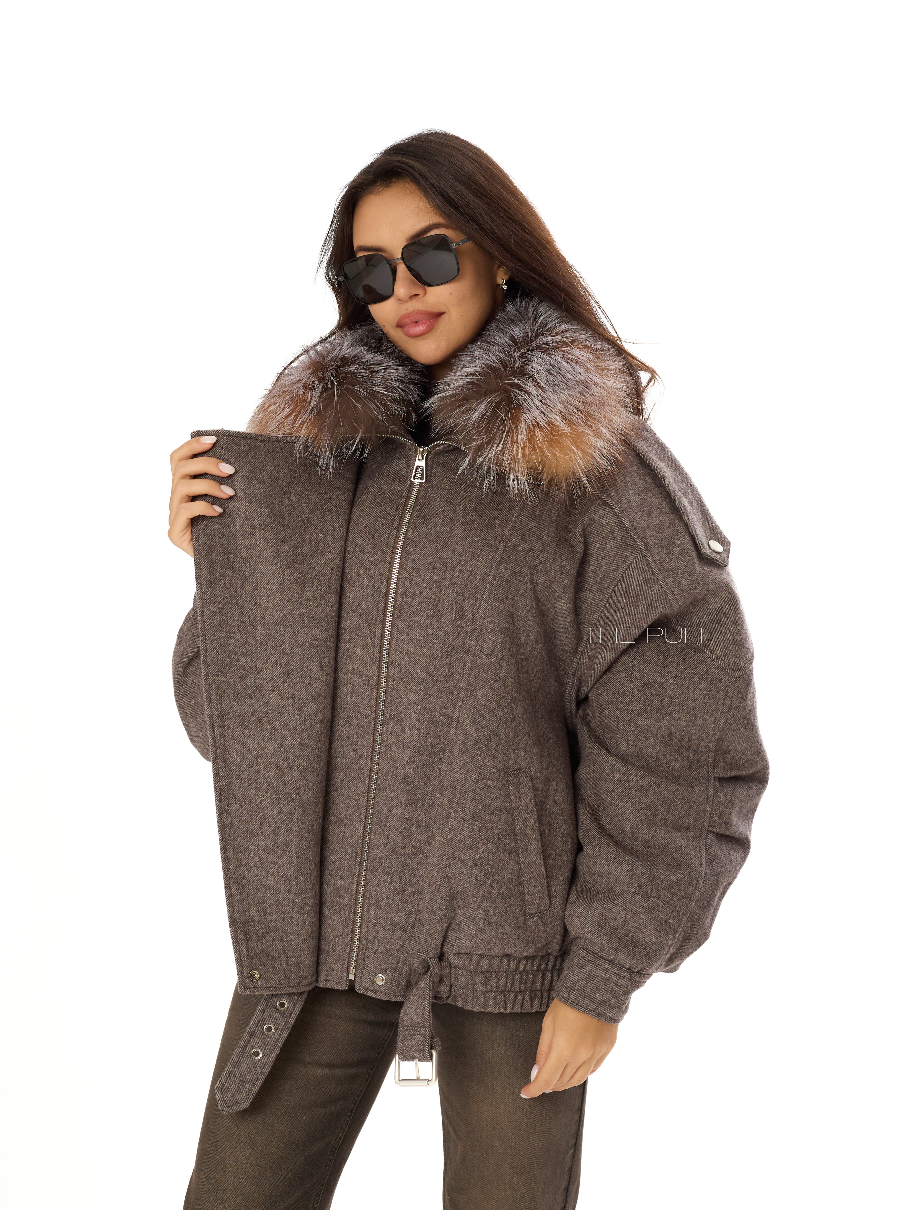 Шерстяная куртка шоколадного цвета с меховым воротником и утепленным подкладом с натуральным пухом. Модель до середины бедра дополнена широкой ветрозащитной планкой и ремешком с пряжкой. Воротник из меха енота снимается.