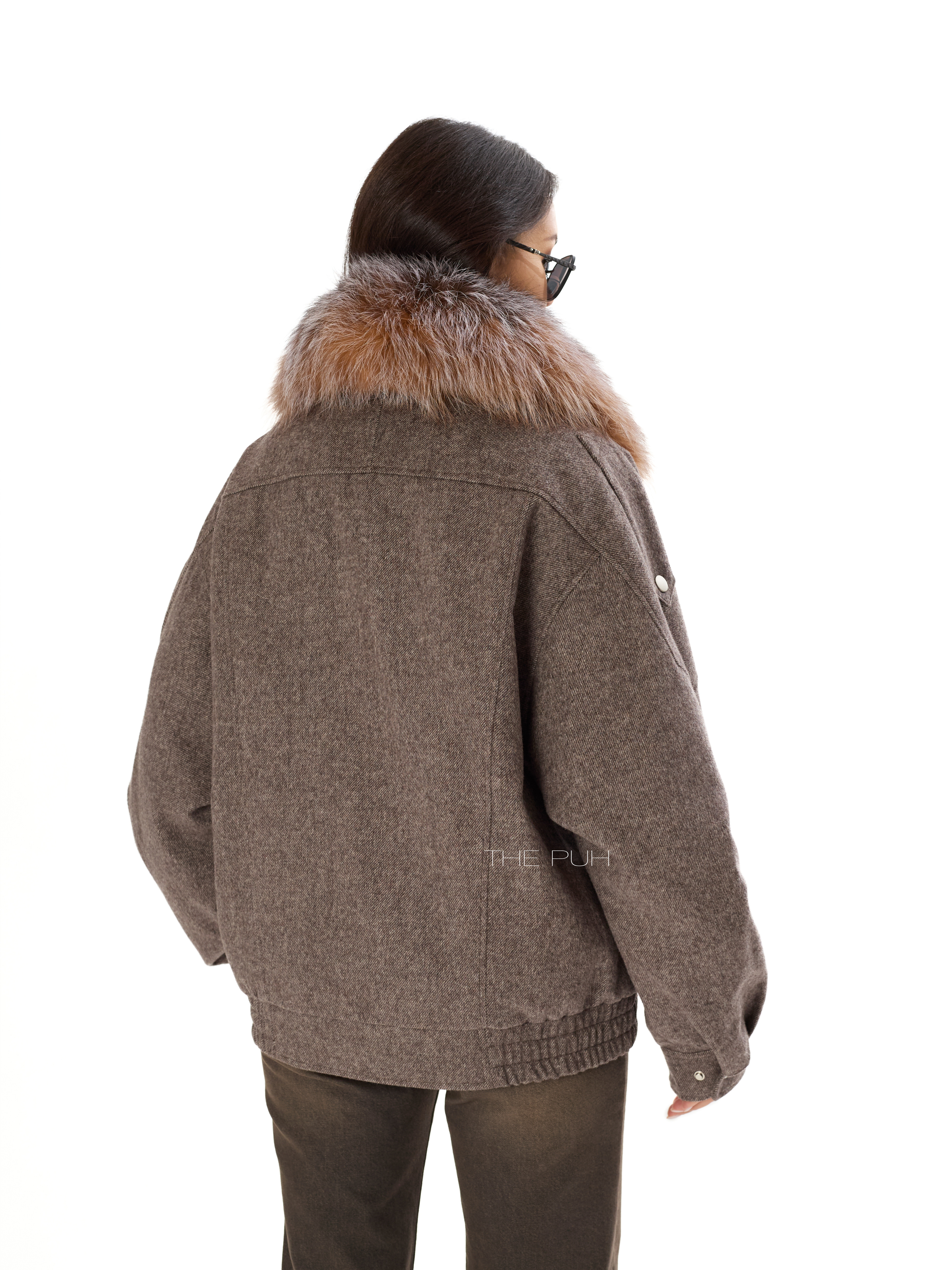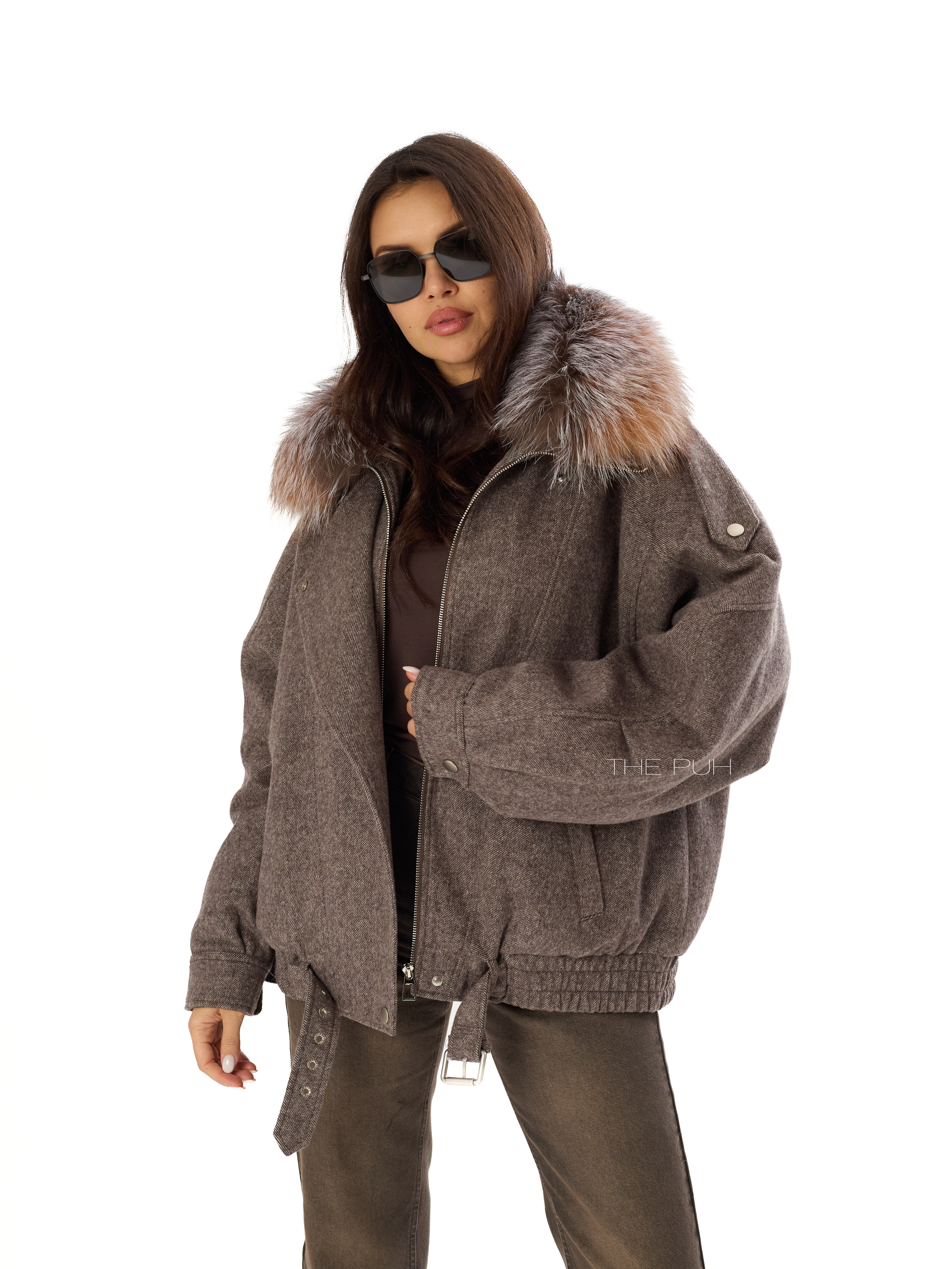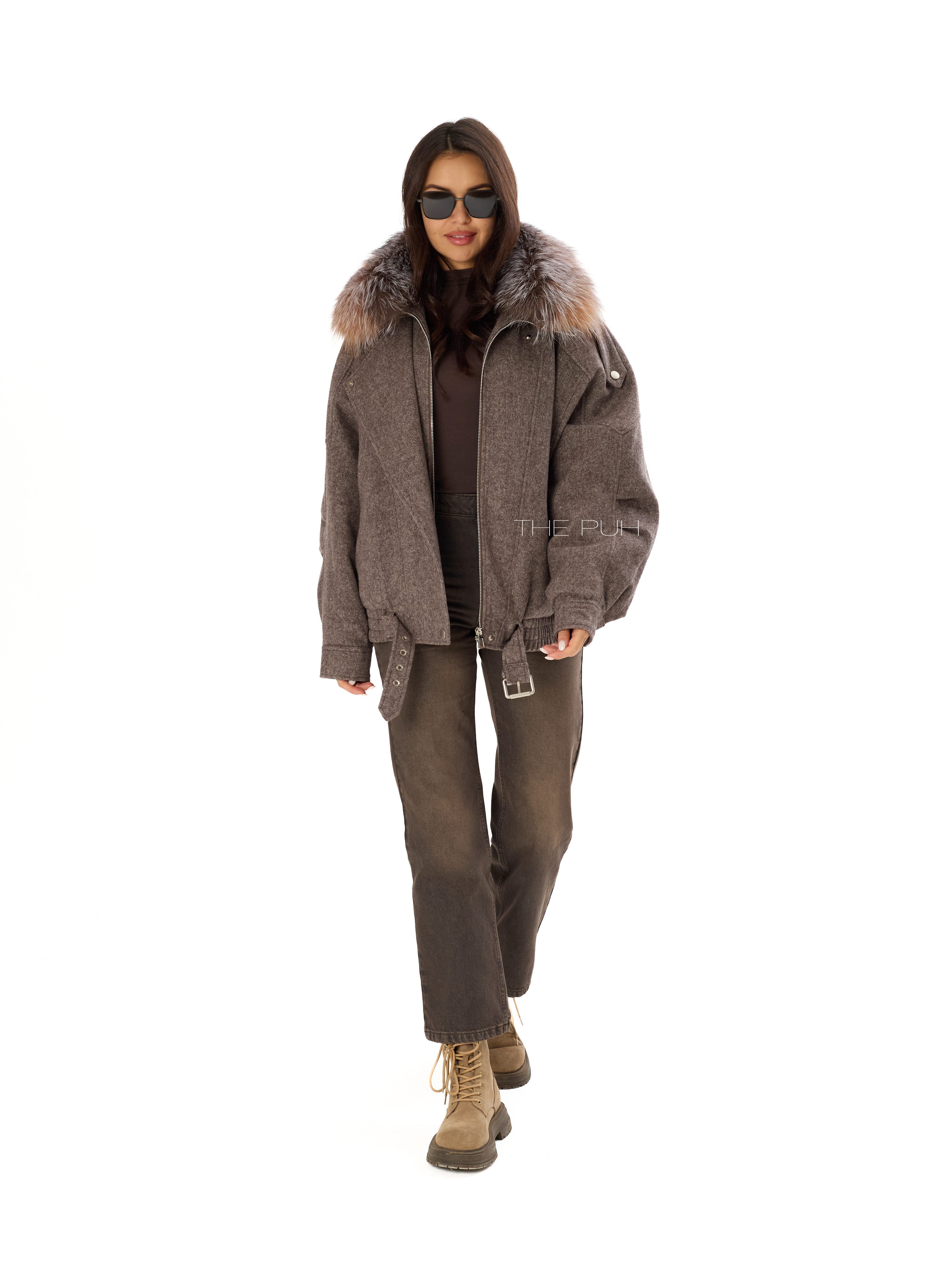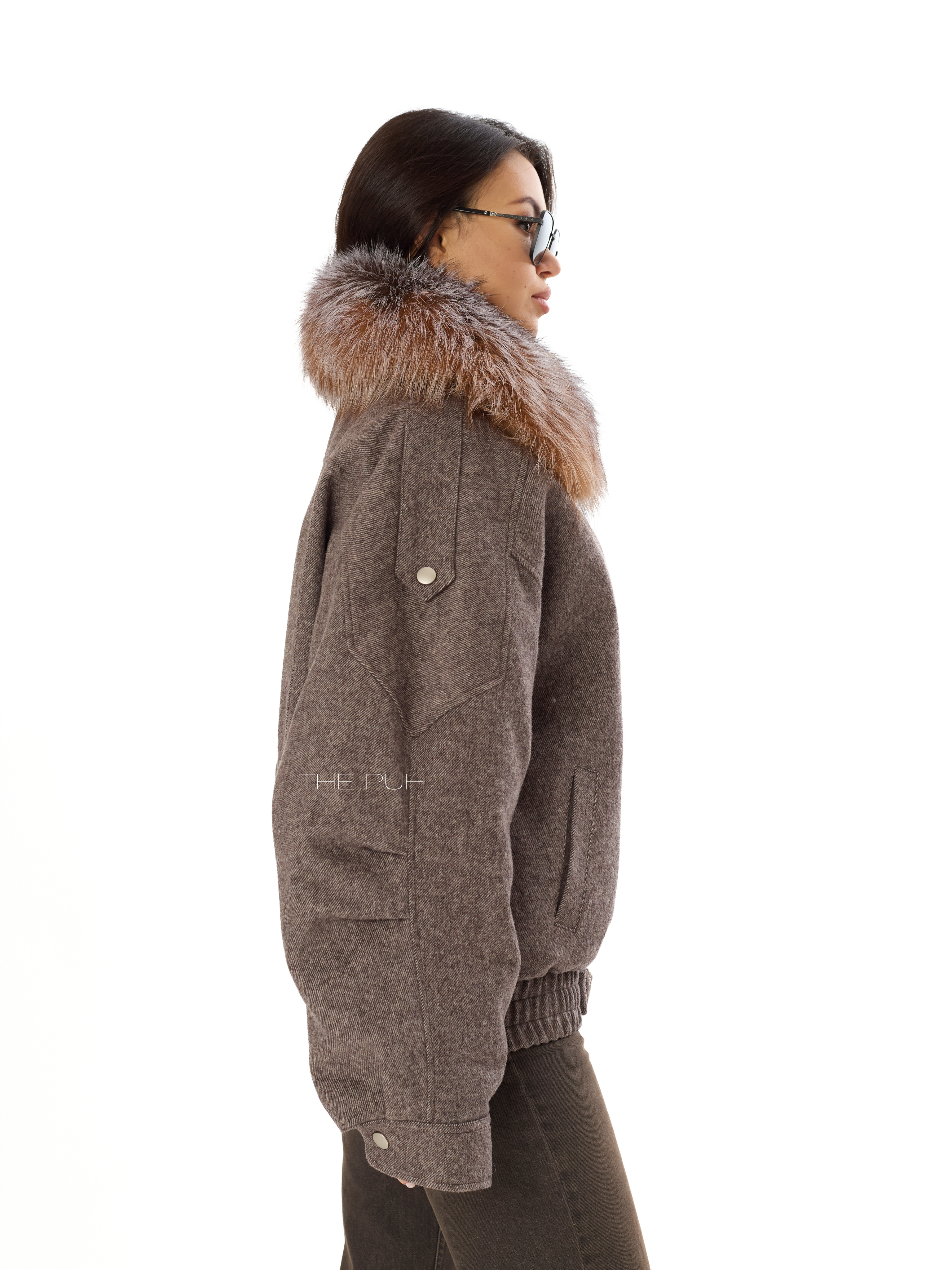 Шерстяная куртка шоколадного цвета с меховым воротником и утепленным подкладом с натуральным пухом. Модель до середины бедра дополнена широкой ветрозащитной планкой и ремешком с пряжкой. Воротник из меха енота снимается.