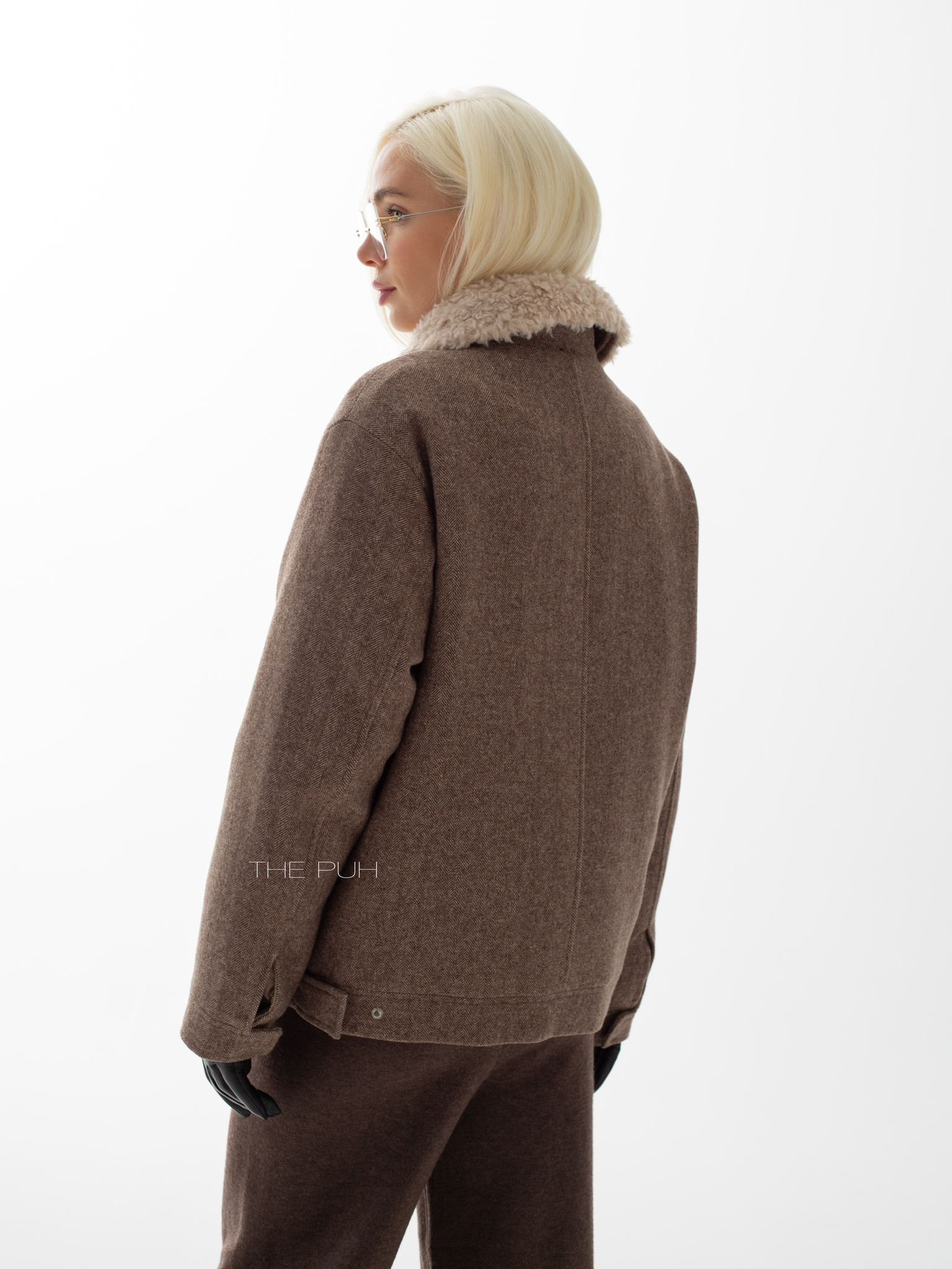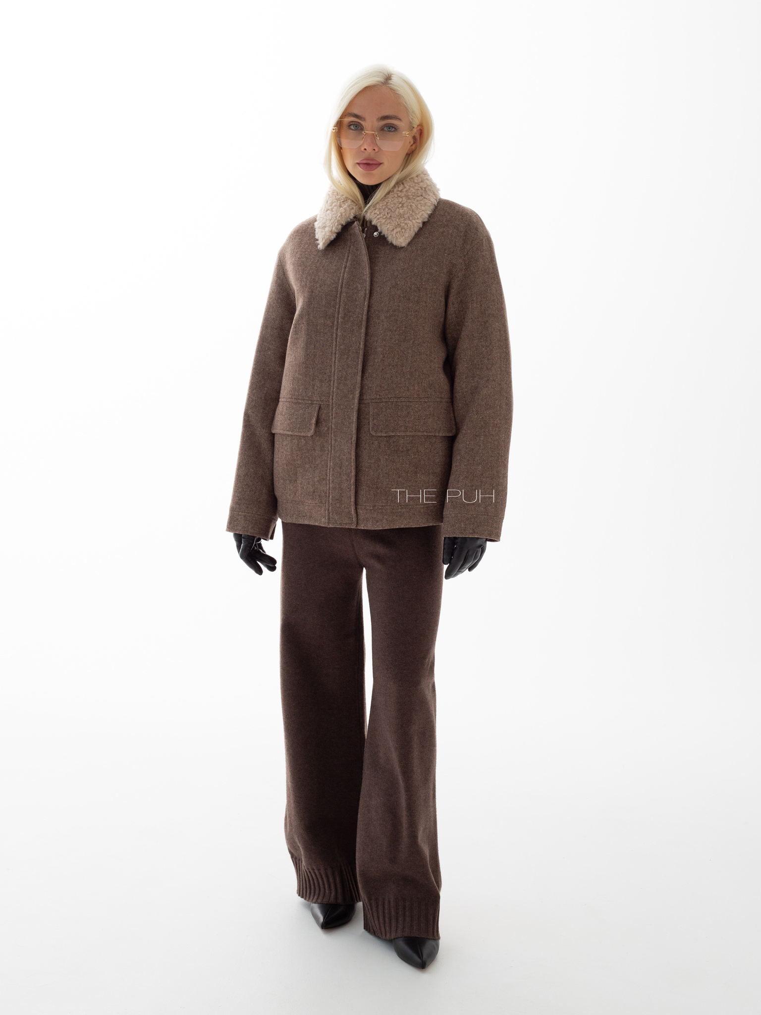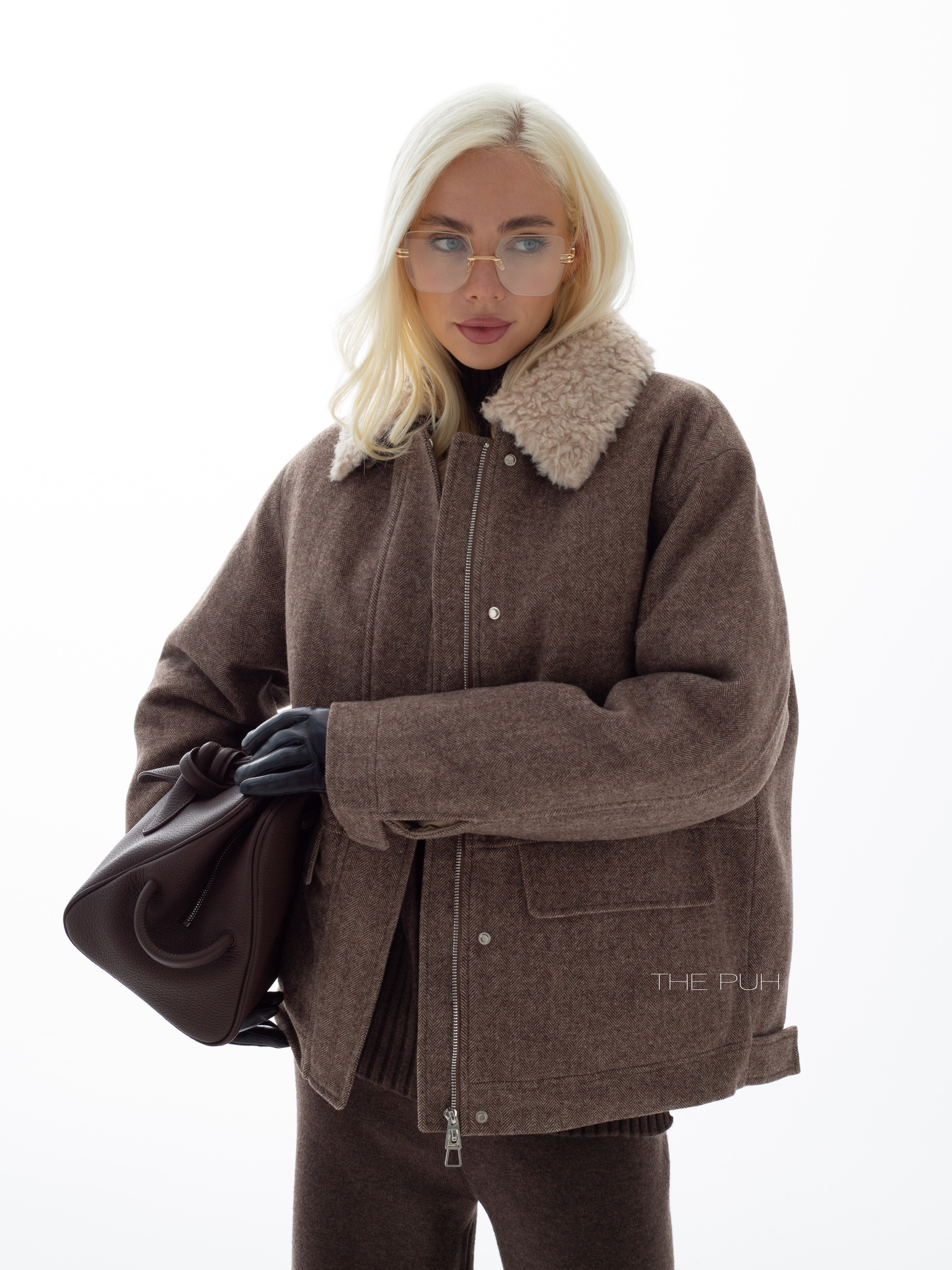 Коричневая шерстяная куртка в елочку на молнии со съемным меховым воротником – элегантное решение для холодов. Аккуратная меховая окантовка мягко обрамляет шею, придавая образу утончённость без лишней массивности, а натуральная шерсть в составе защитит от первых осенних холодов.