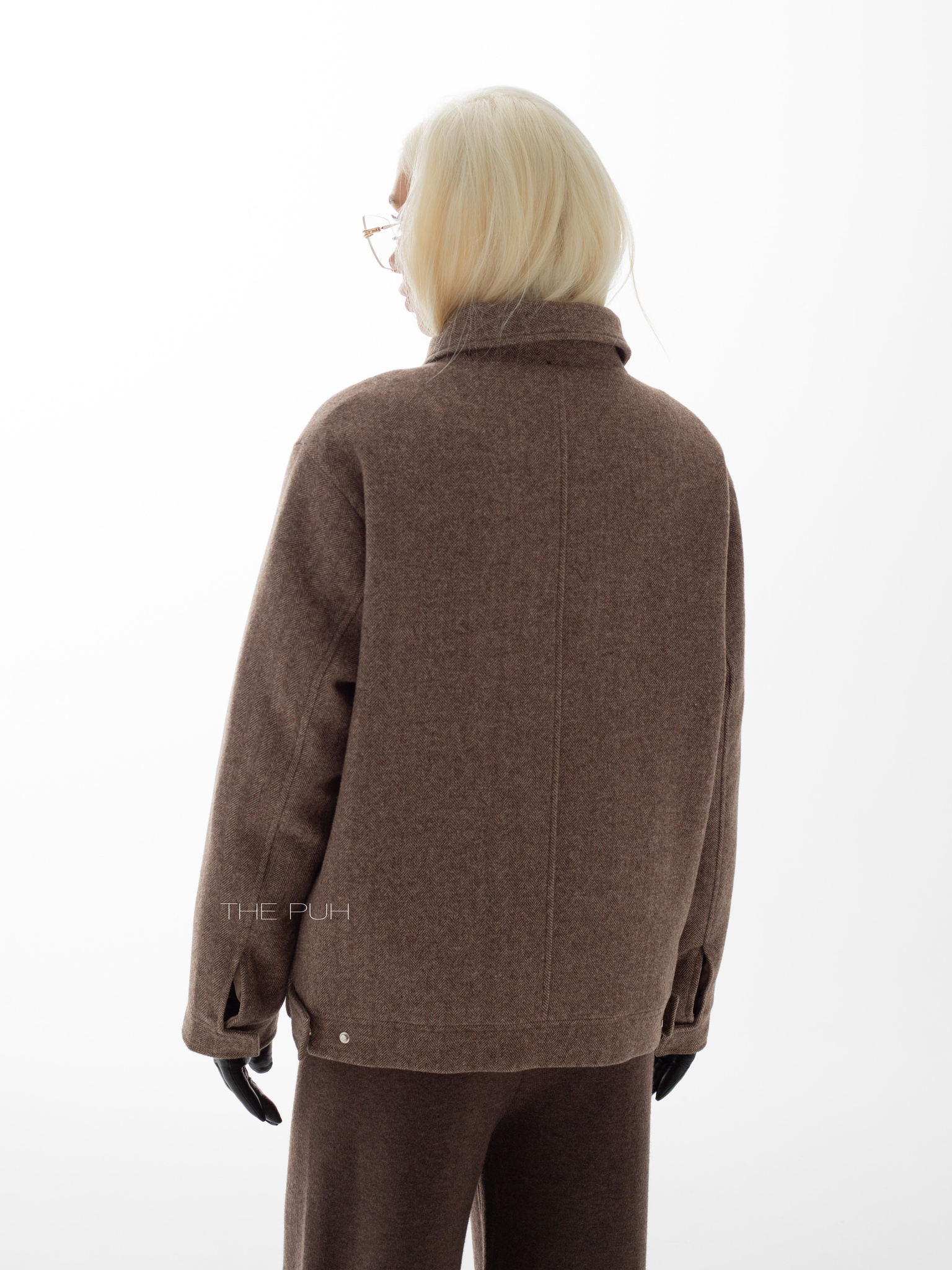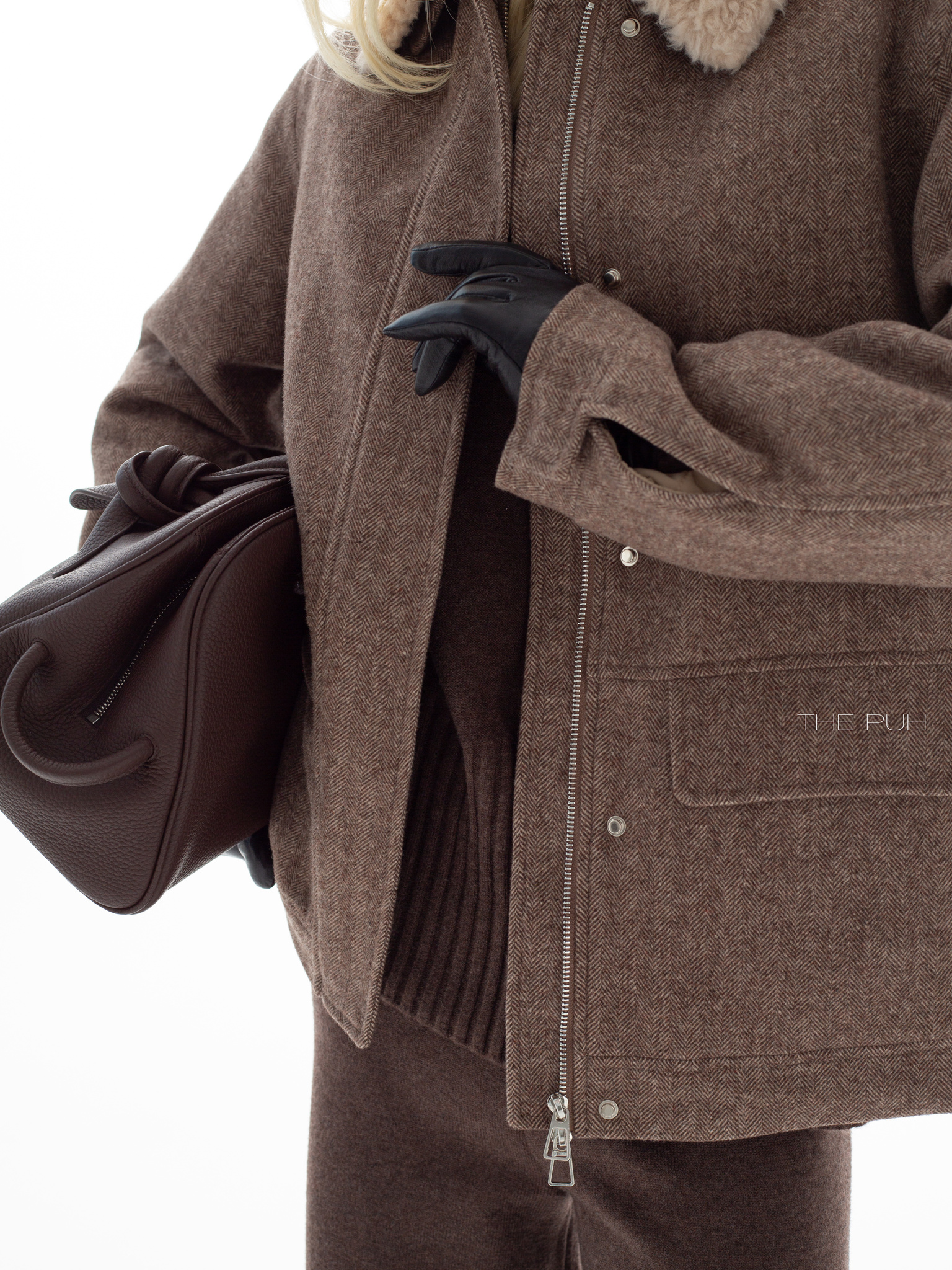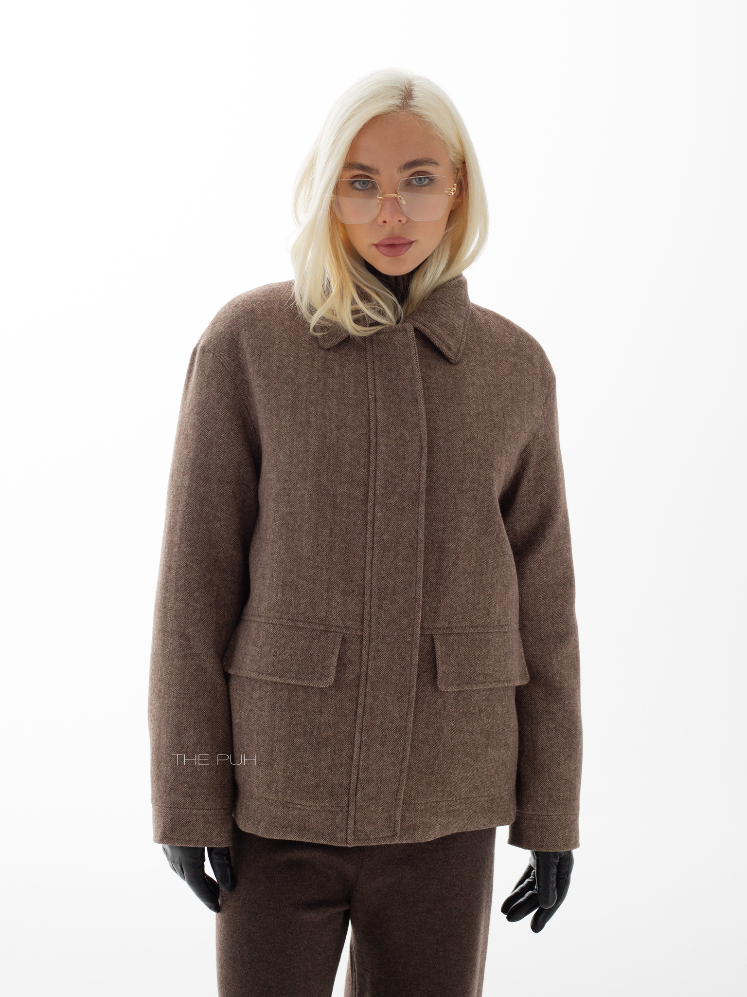 Коричневая шерстяная куртка в елочку на молнии со съемным меховым воротником – элегантное решение для холодов. Аккуратная меховая окантовка мягко обрамляет шею, придавая образу утончённость без лишней массивности, а натуральная шерсть в составе защитит от первых осенних холодов.
