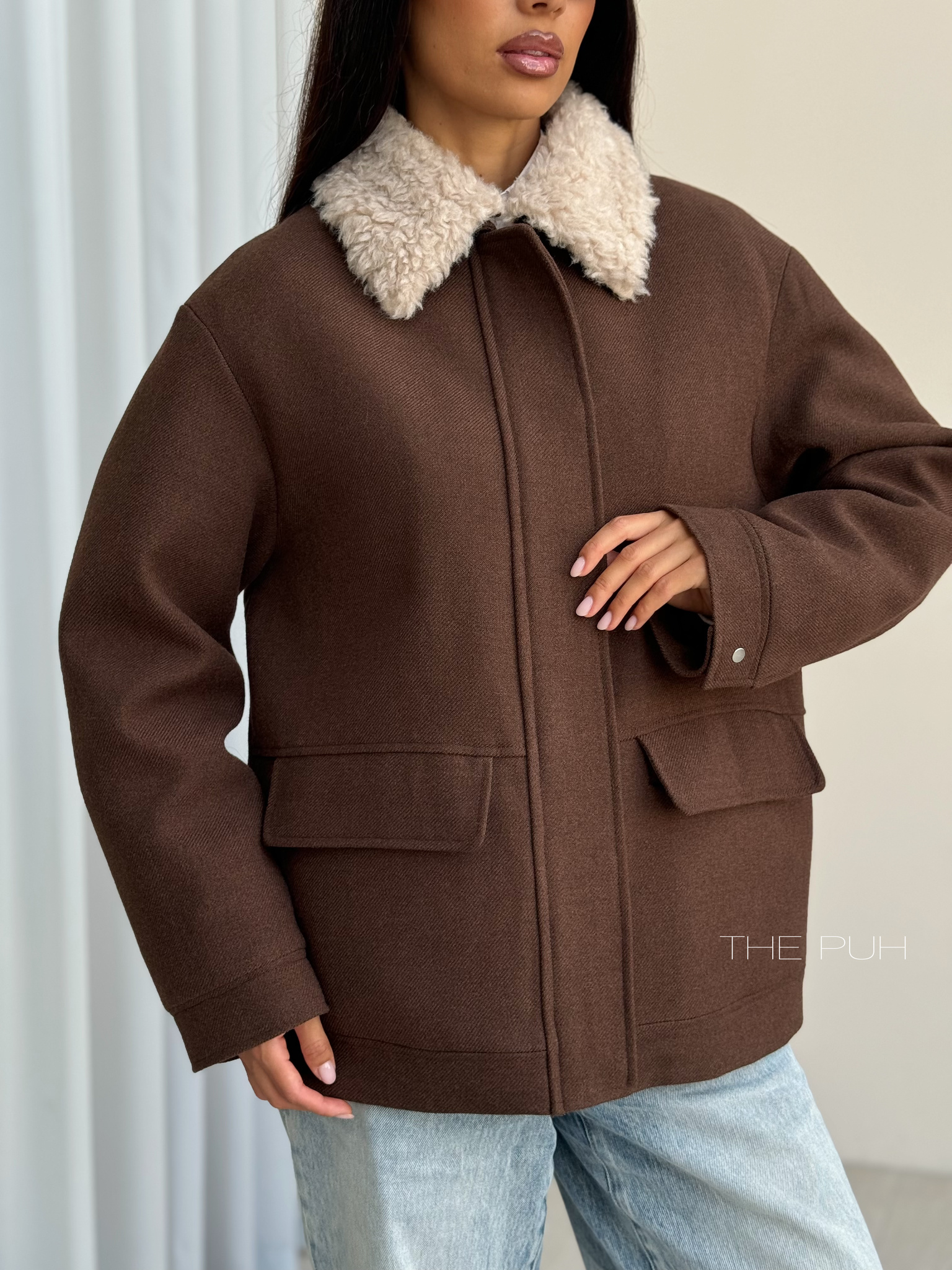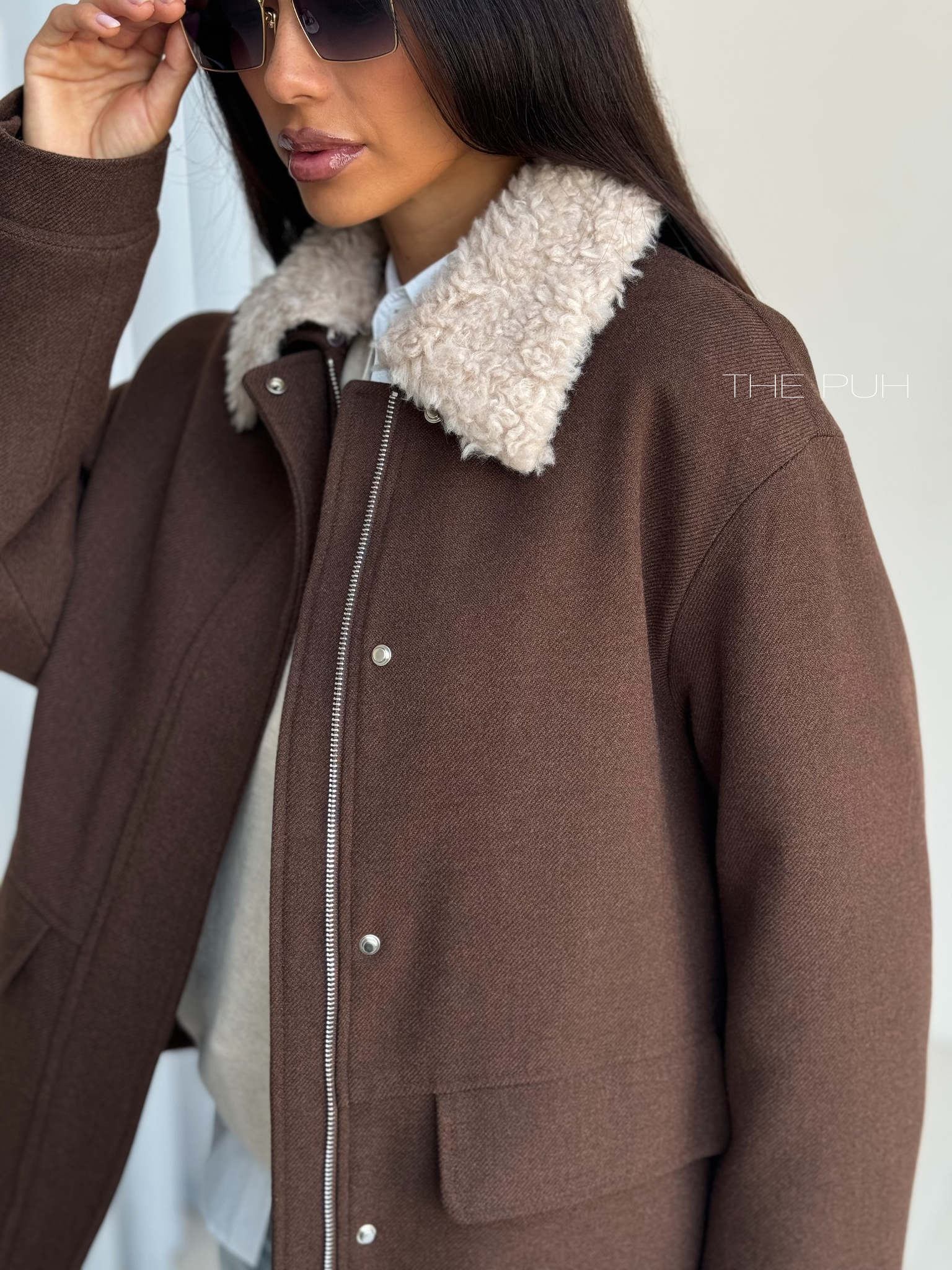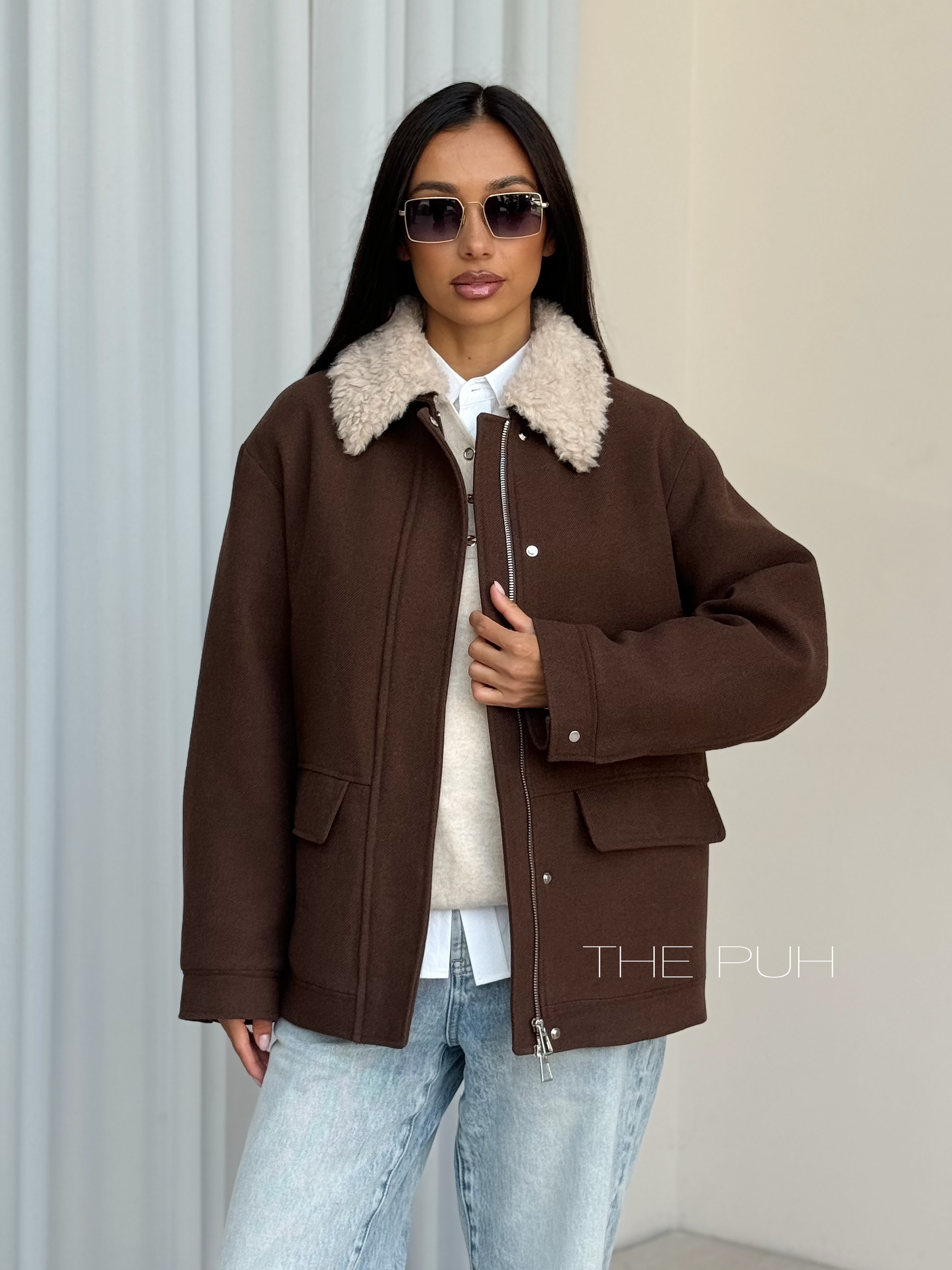 Шоколадная куртка из шерсти на молнии со съемным меховым воротником – элегантное решение для холодов. Аккуратная меховая окантовка мягко обрамляет шею, придавая образу утончённость без лишней массивности.