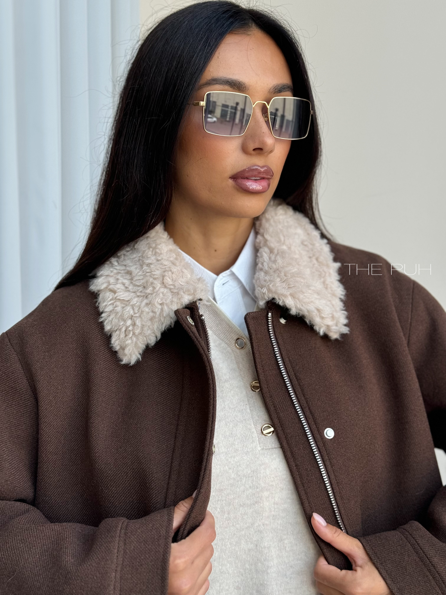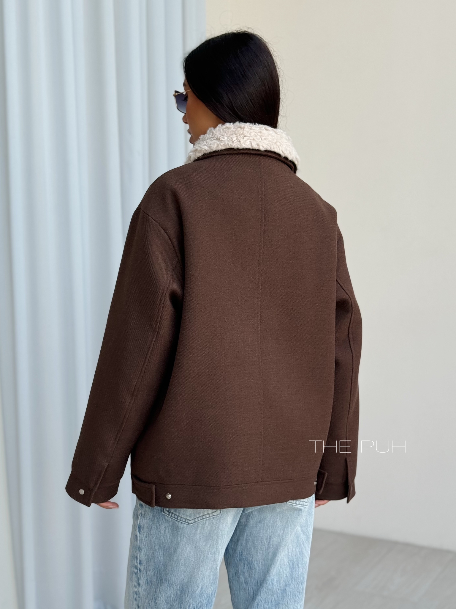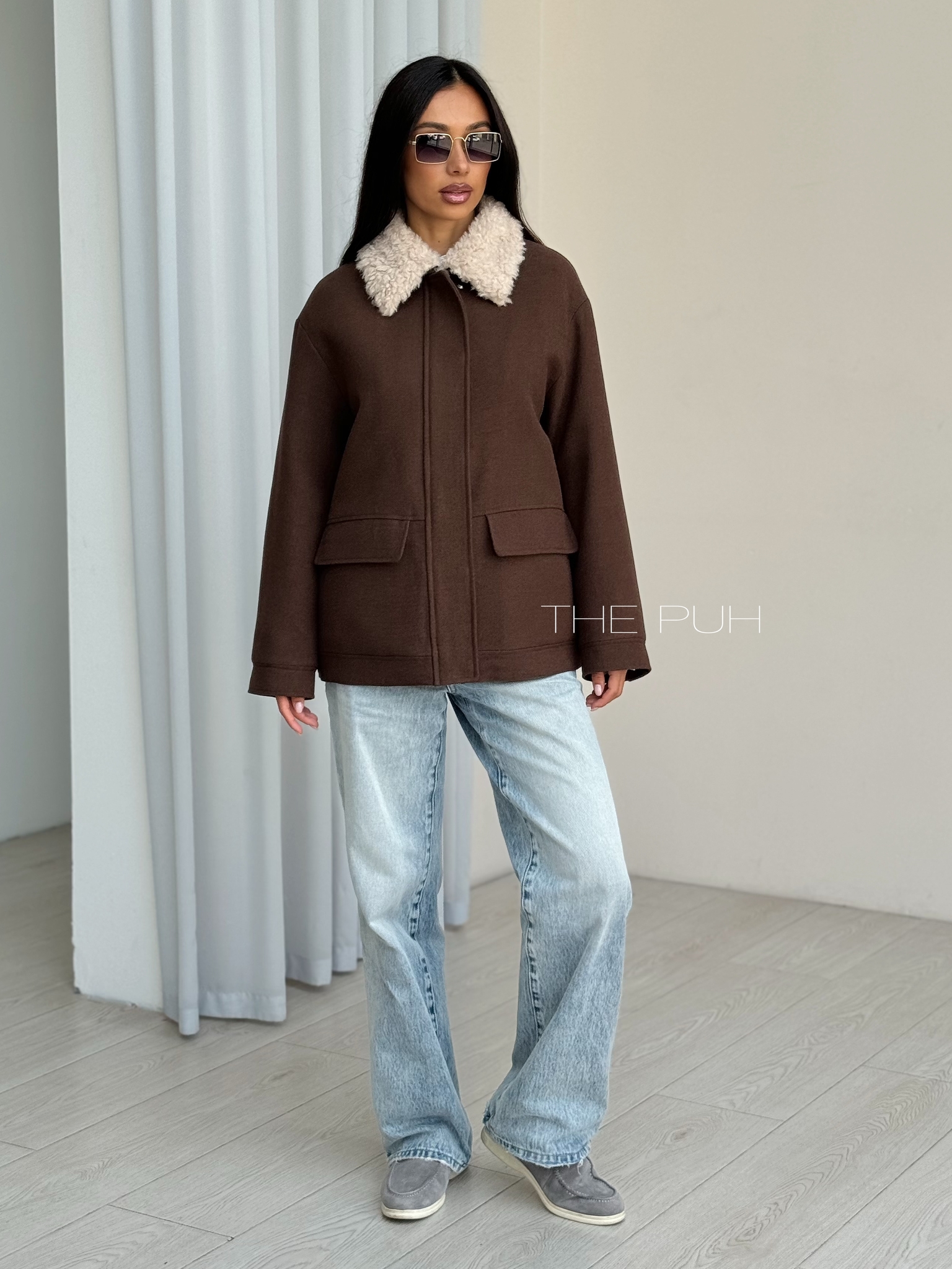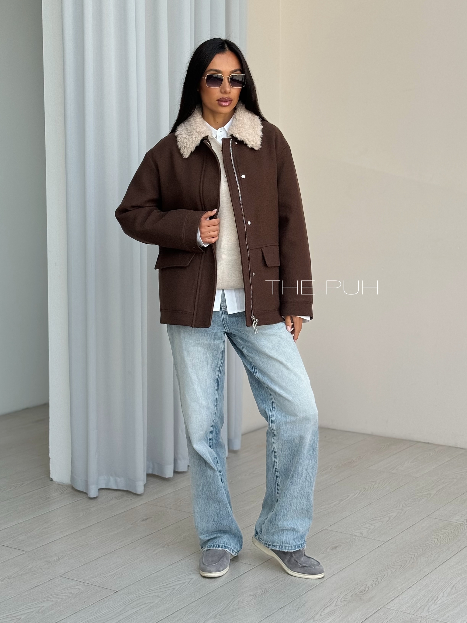 Шоколадная куртка из шерсти на молнии со съемным меховым воротником – элегантное решение для холодов. Аккуратная меховая окантовка мягко обрамляет шею, придавая образу утончённость без лишней массивности.
