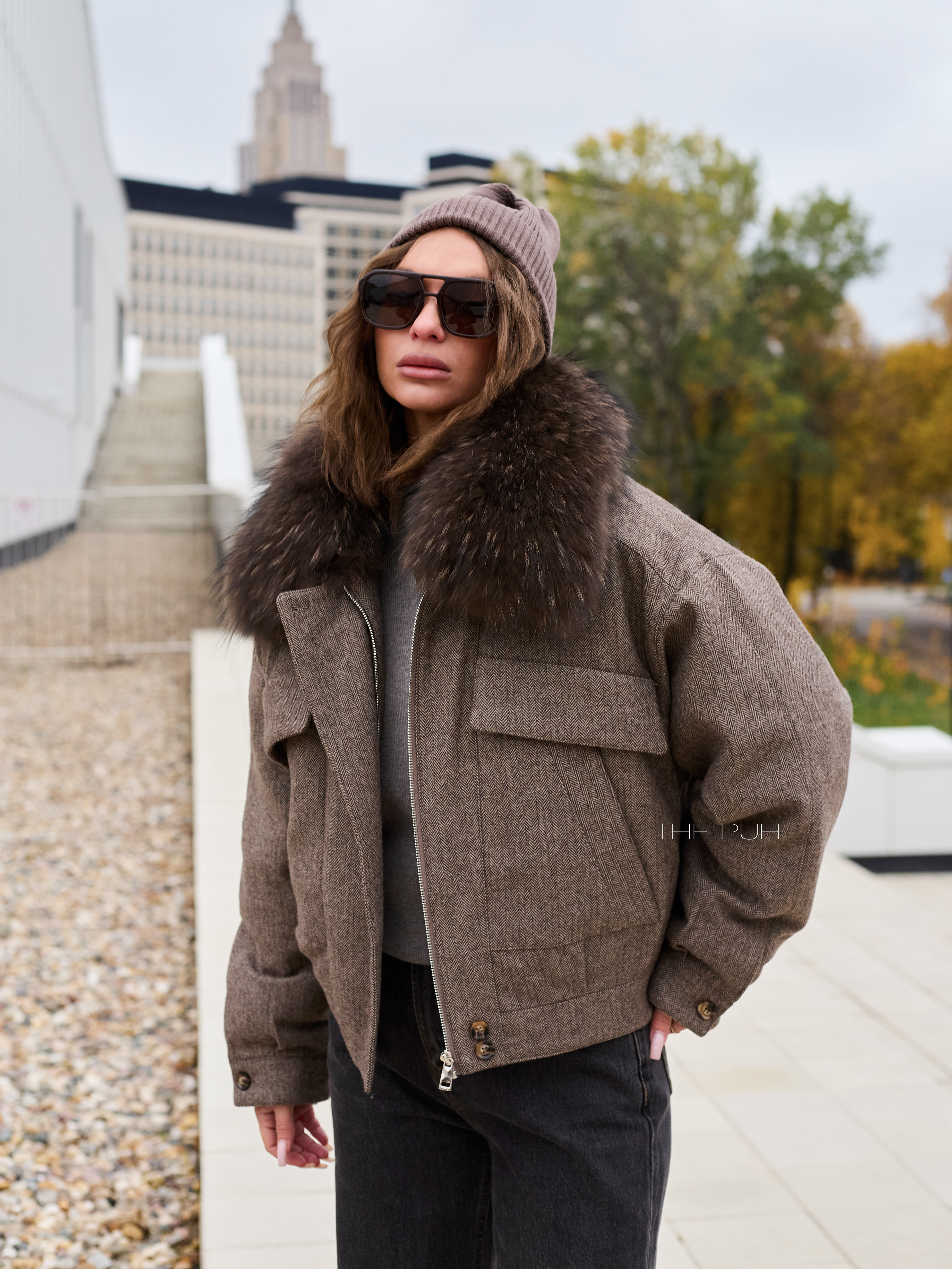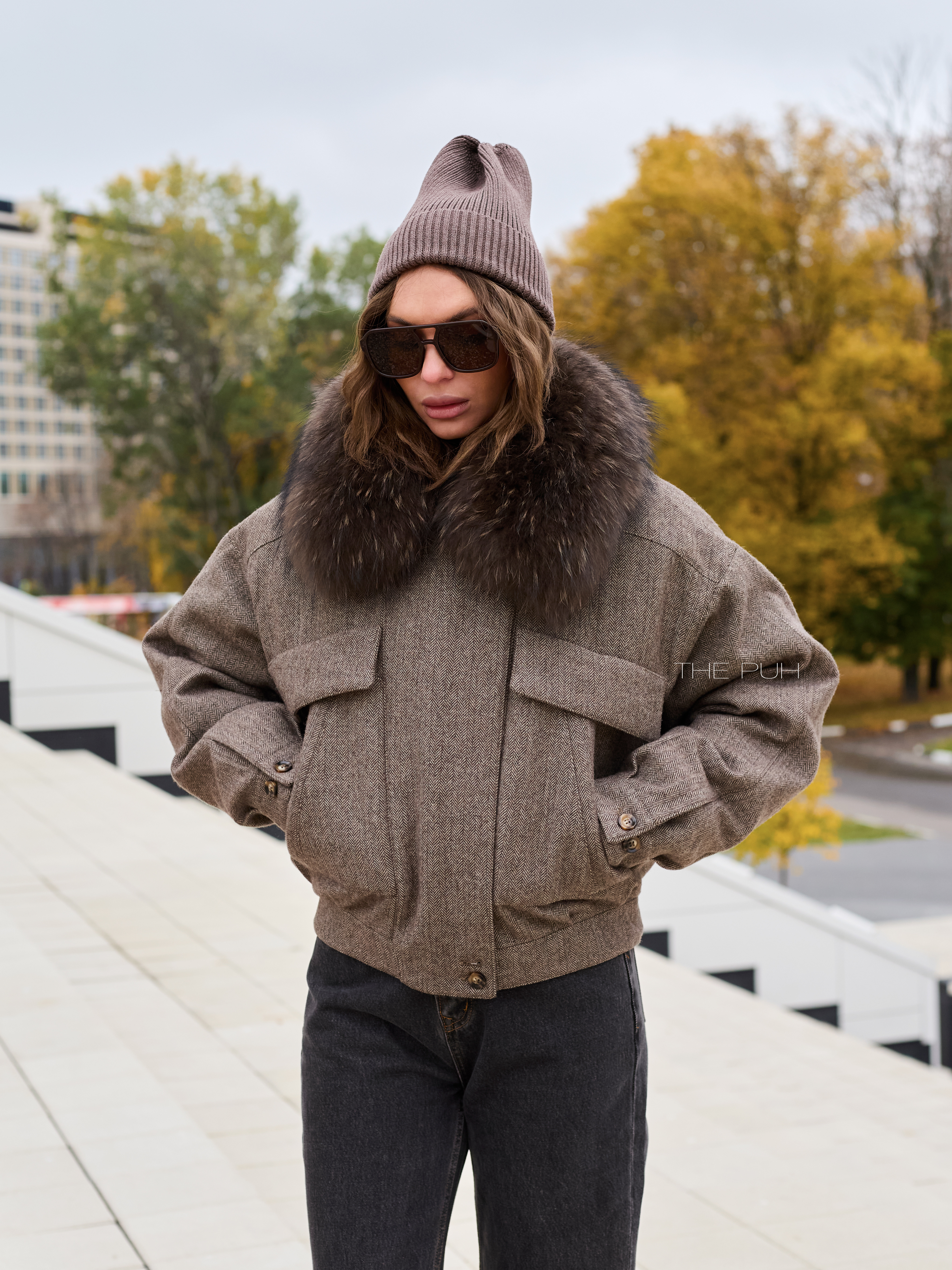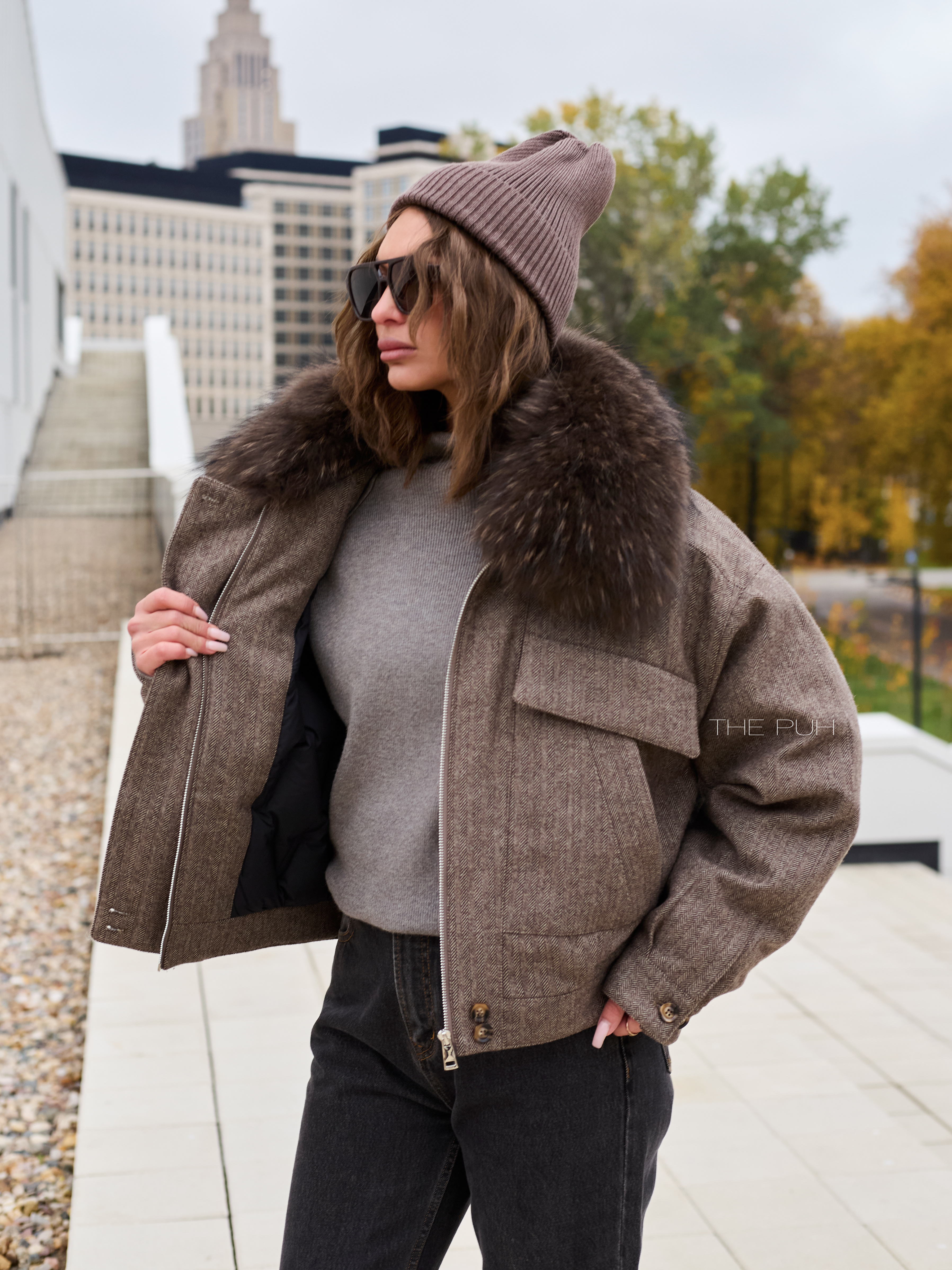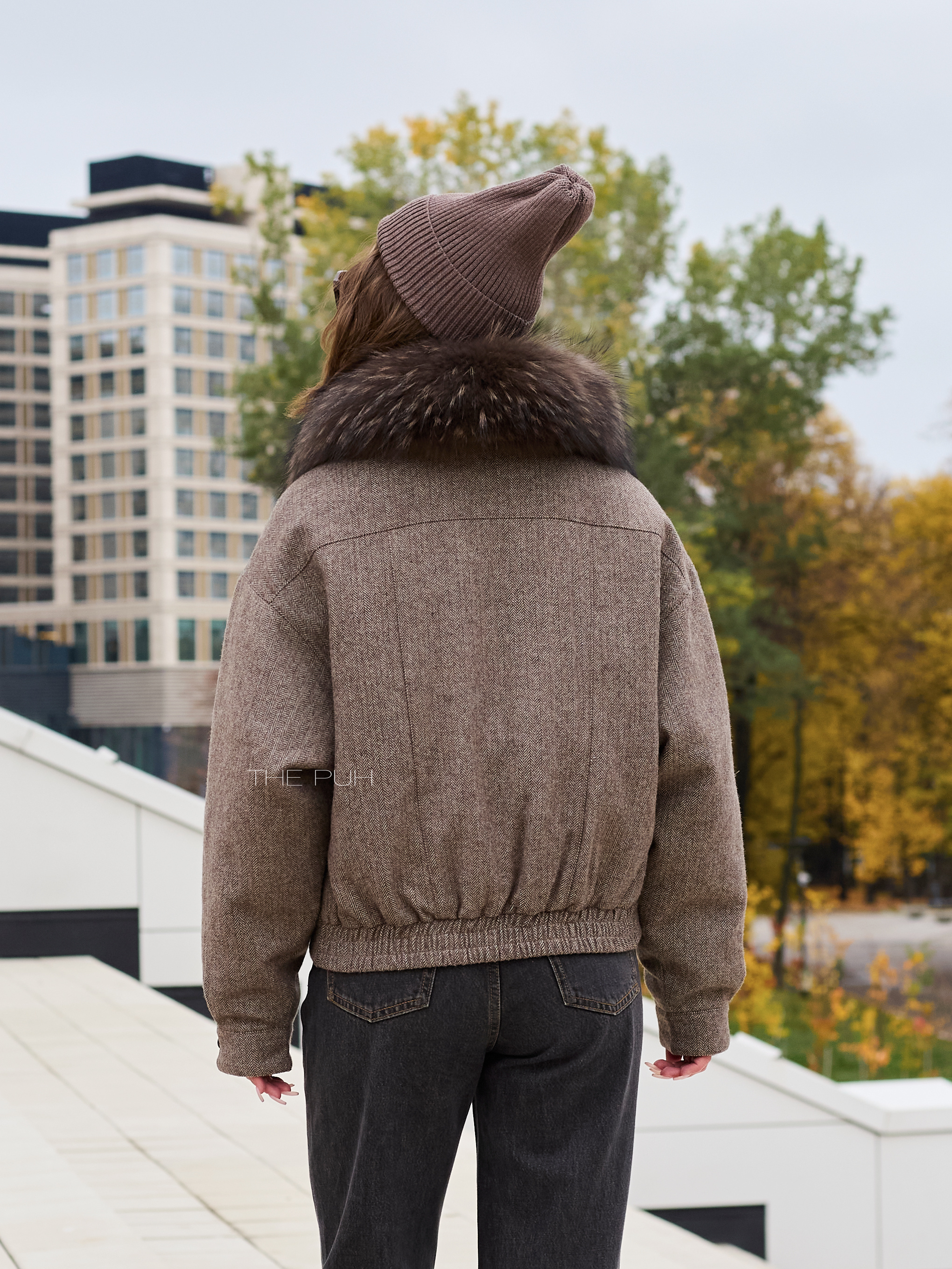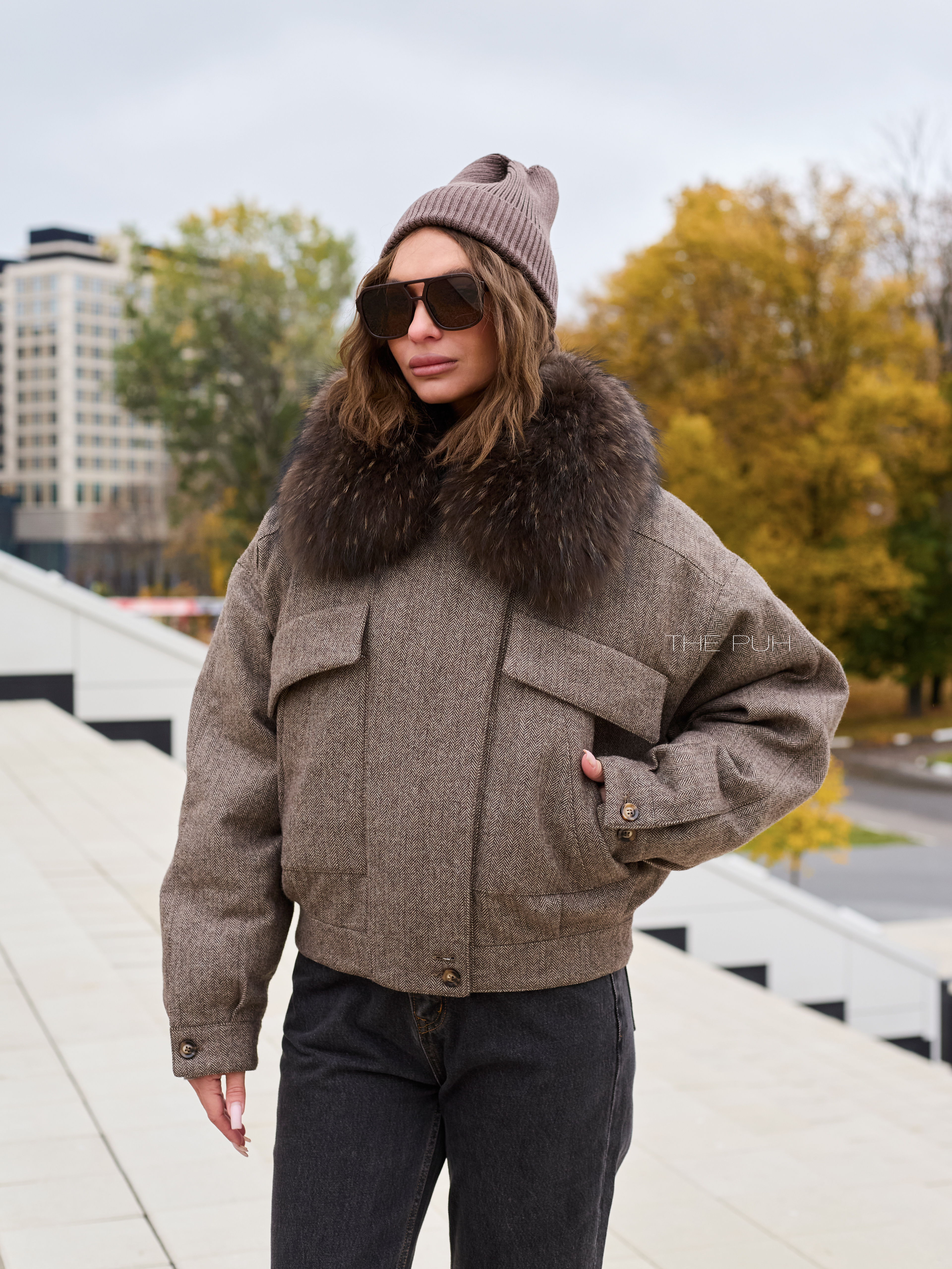 Укороченная куртка-пуховик выполнена из смесовой шерсти коричневого цвета и дополнена съемным воротником их меха енота. Модель утеплена натуральным гусиным пухом, так что спокойно выдерживает сильные морозы.