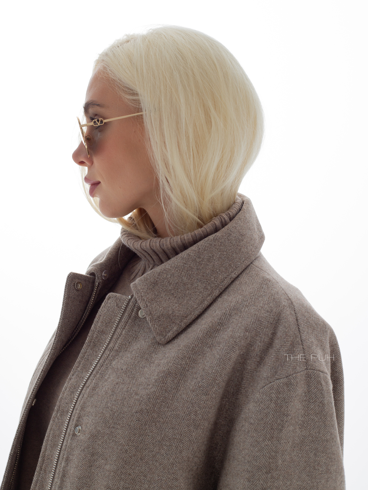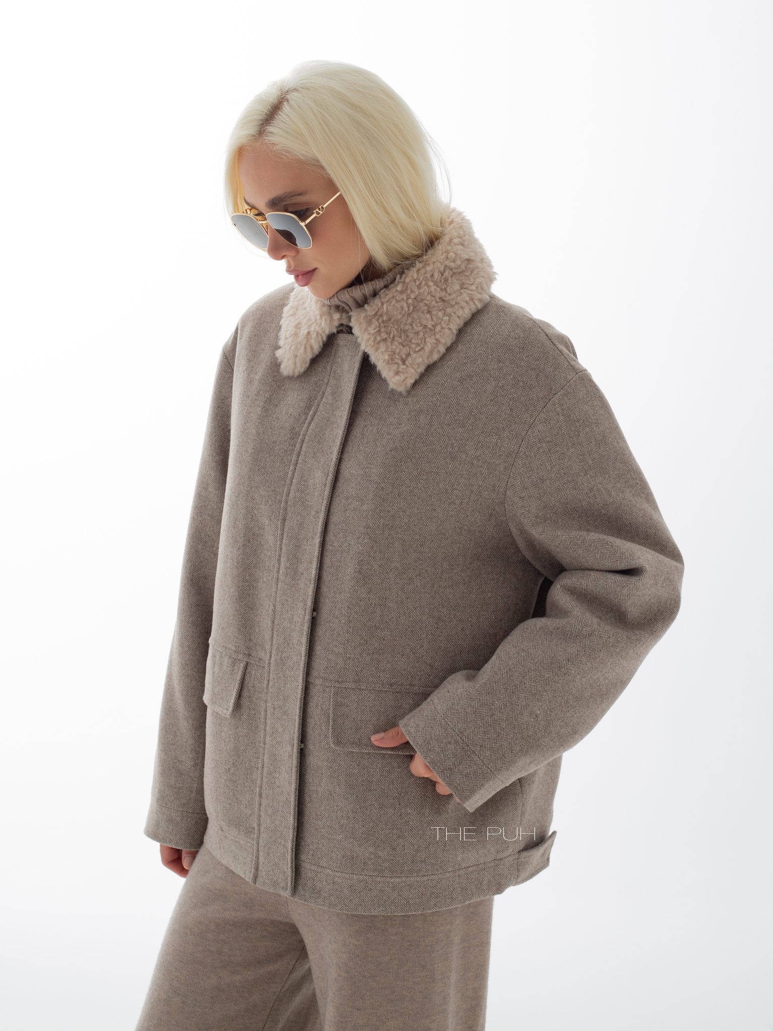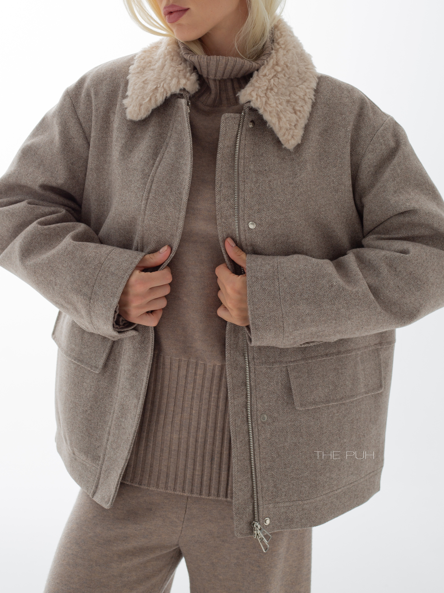 Бежевая шерстяная куртка в елочку на молнии со съемным меховым воротником – элегантное решение для холодов. Аккуратная меховая окантовка мягко обрамляет шею, придавая образу утончённость без лишней массивности, а натуральная шерсть в составе защитит от первых осенних холодов.