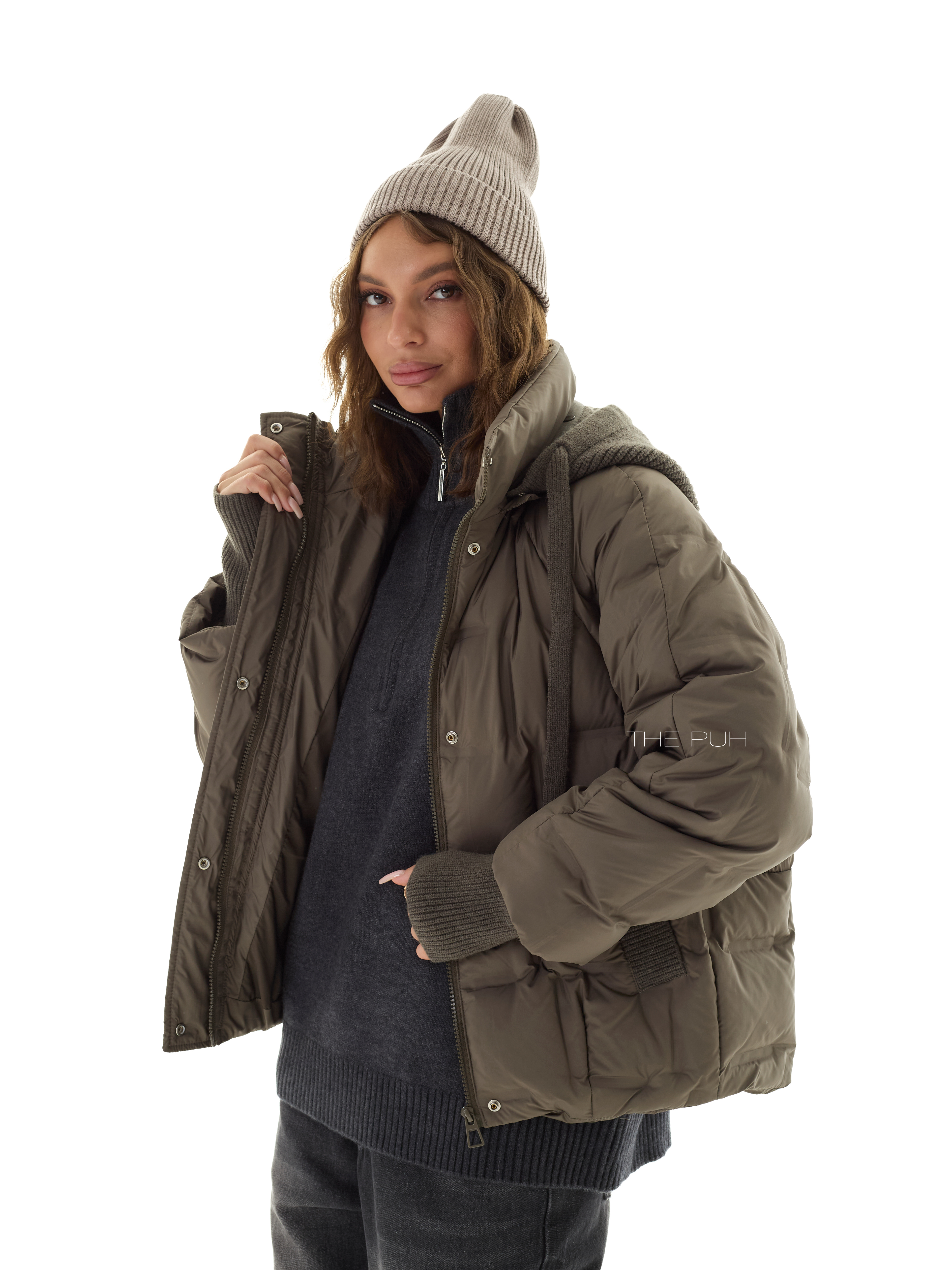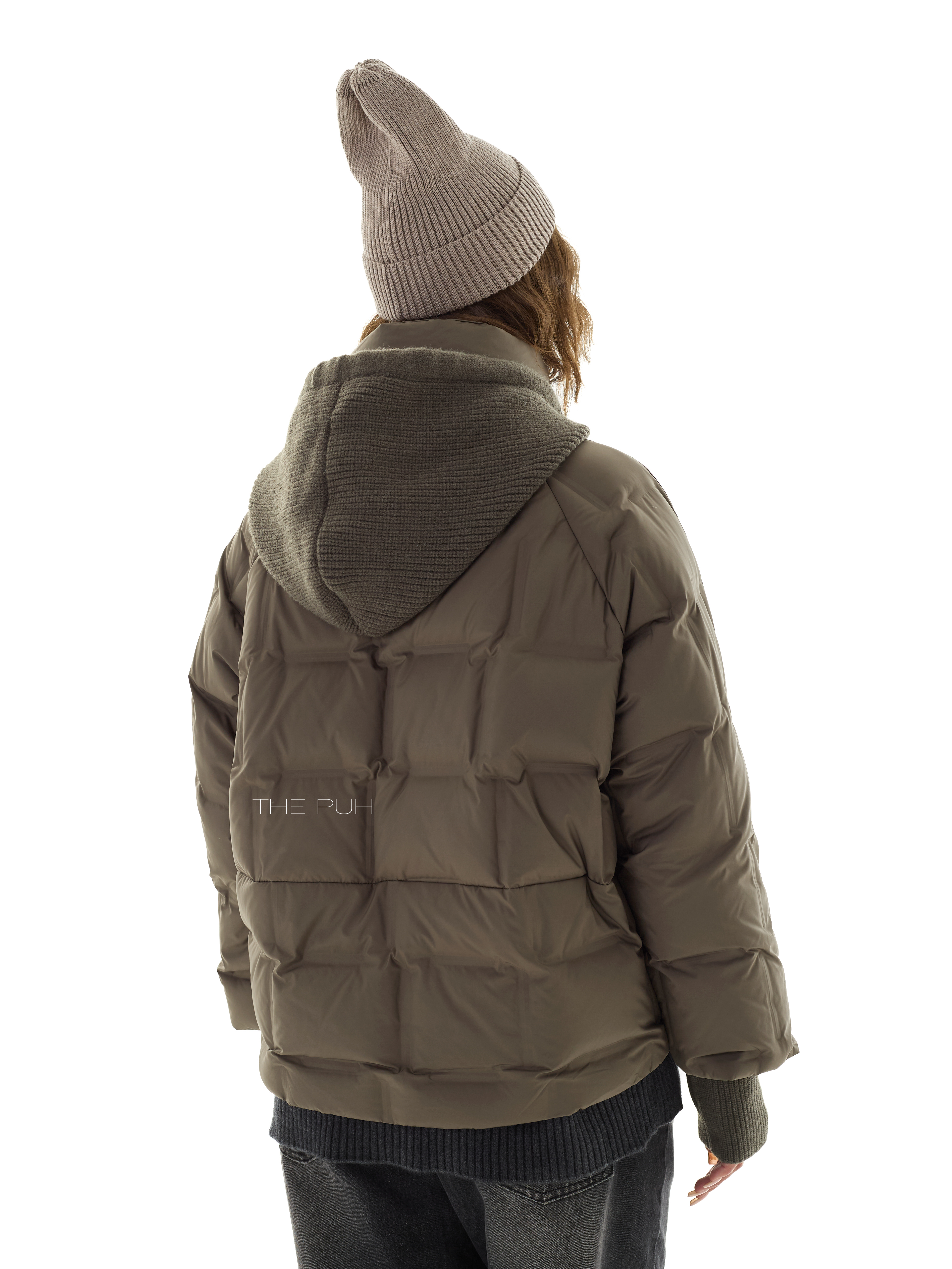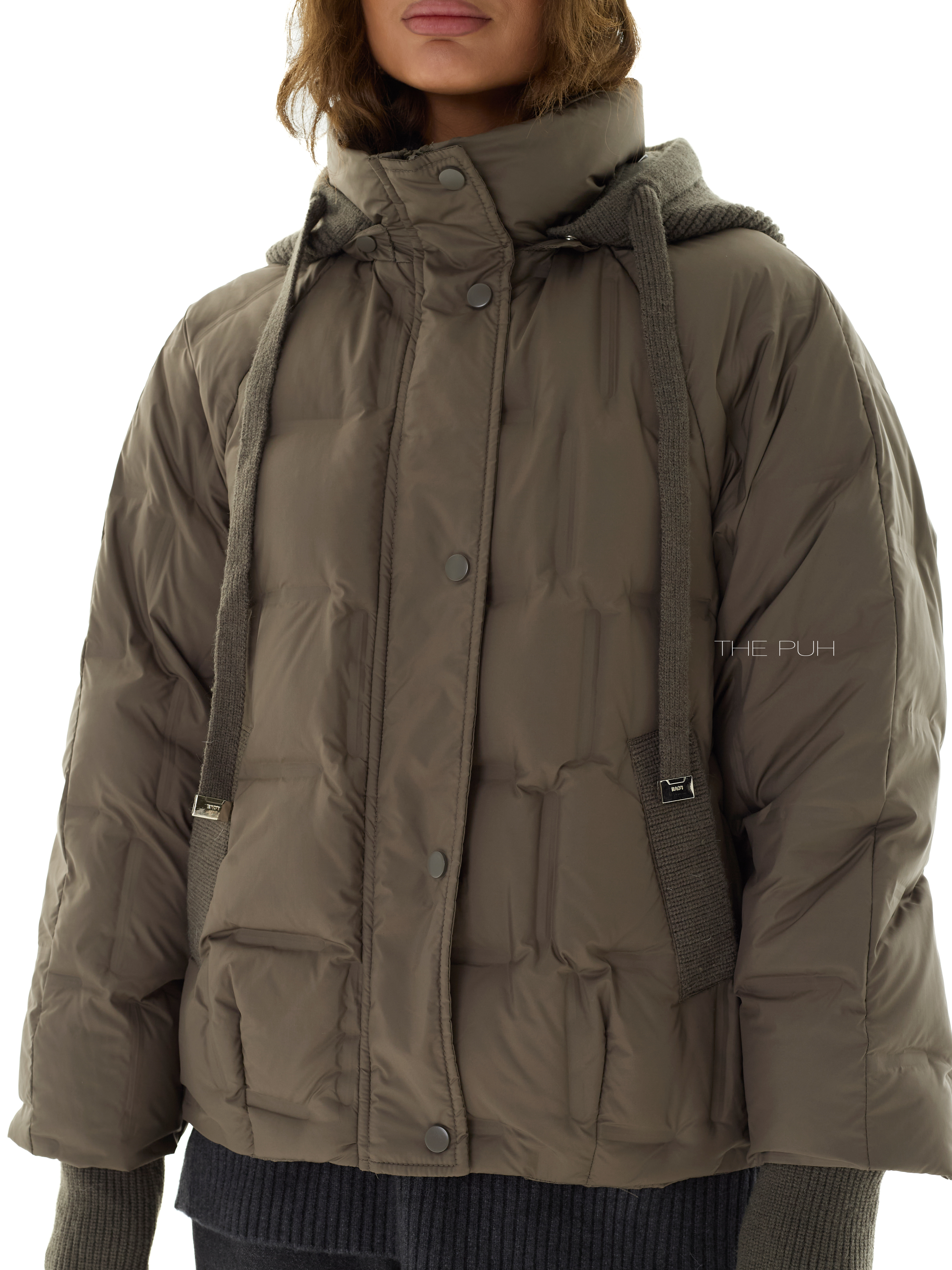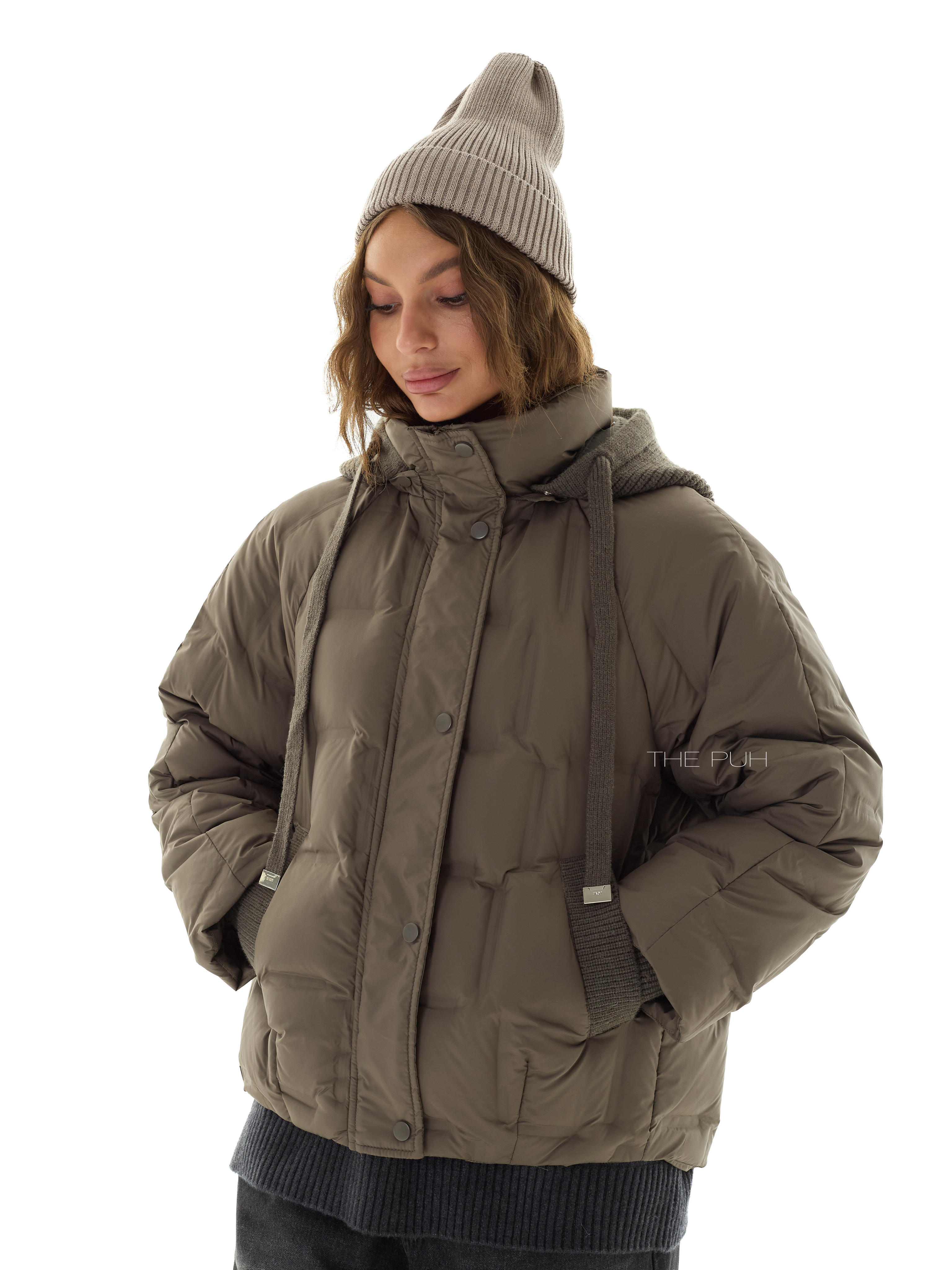 Короткая куртка-пуховик в цвете хаки со съемным вязаным капюшоном. Модель утеплена натуральным гусиным пухом и идеально подойдет на позднюю осень и первые заморозки.