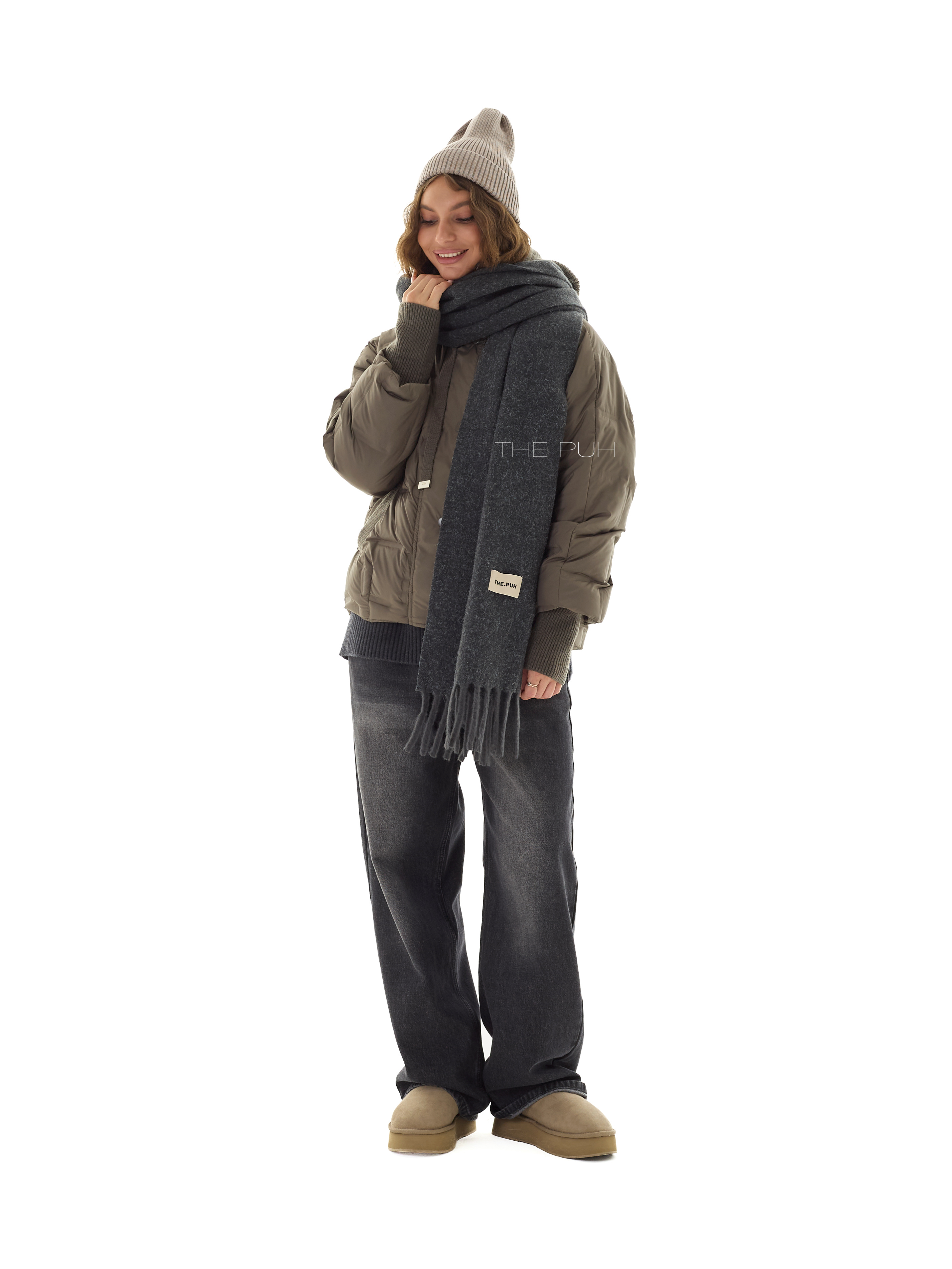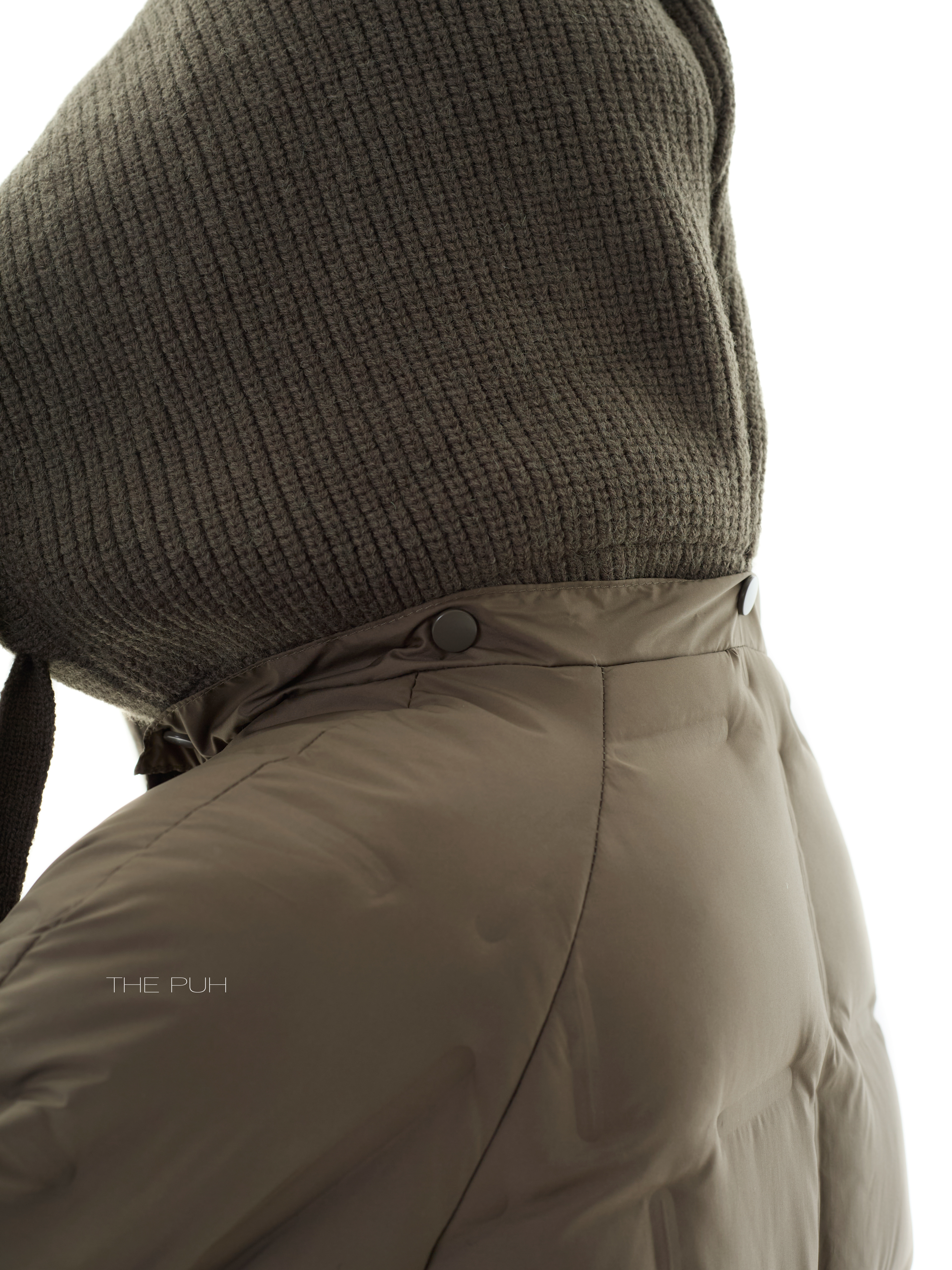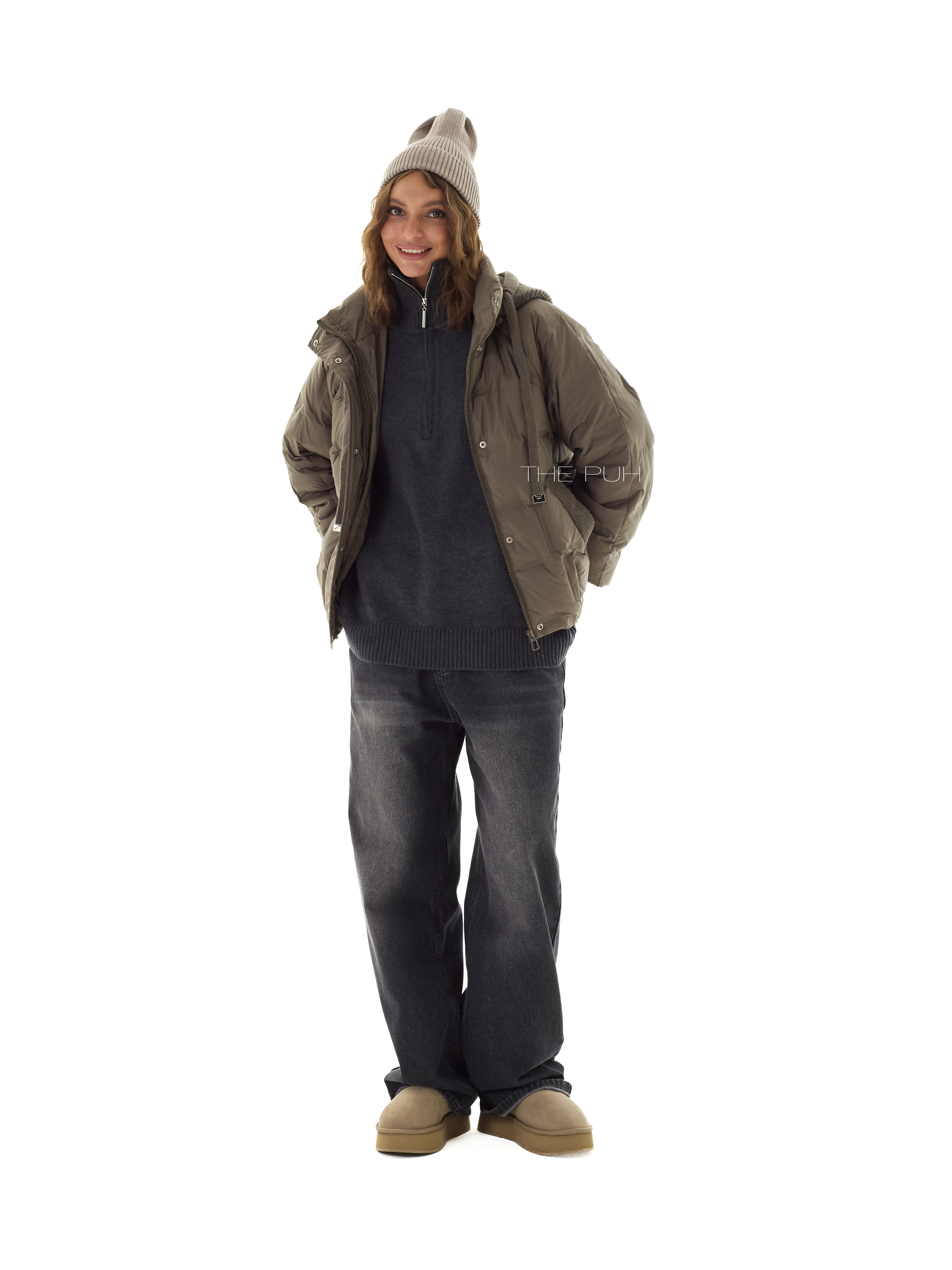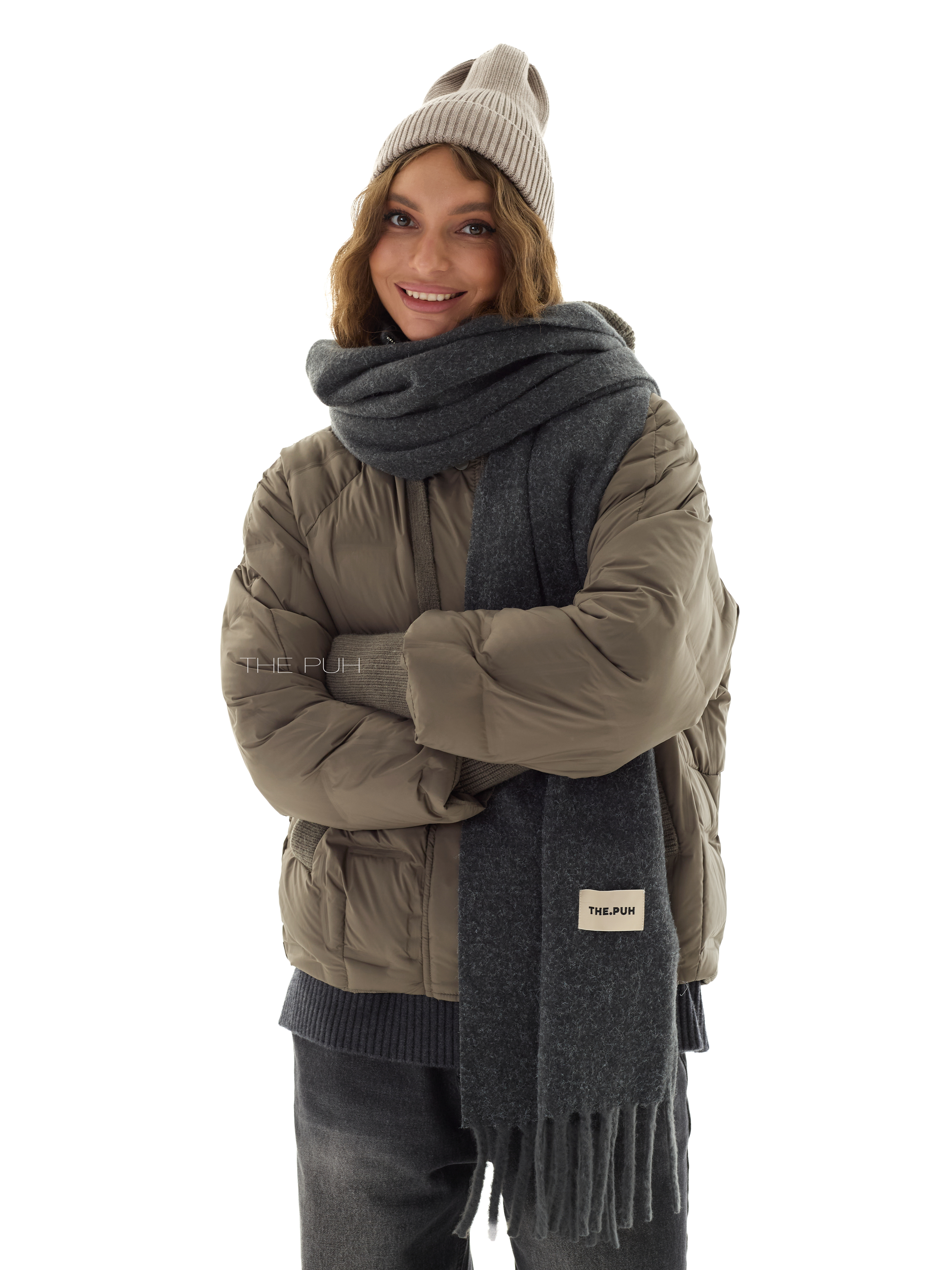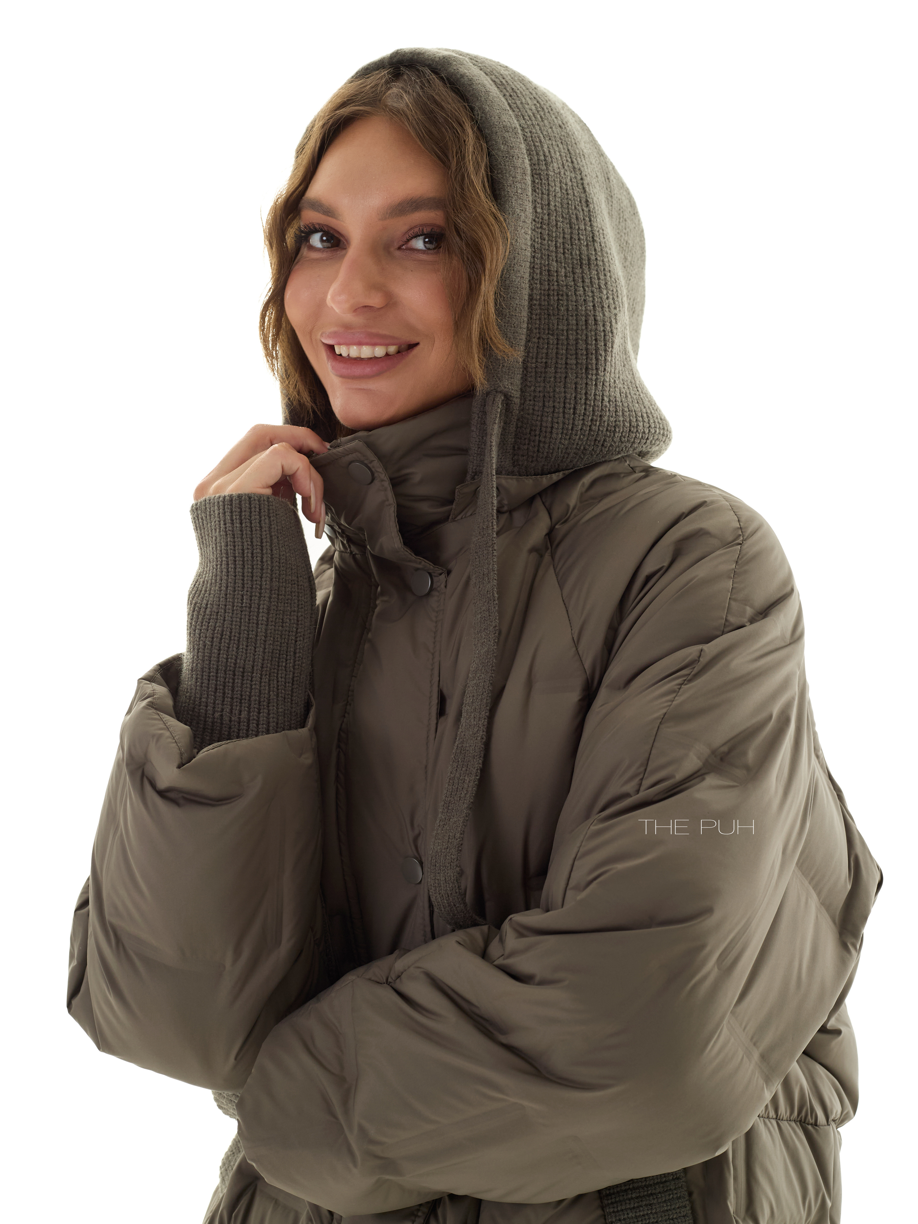 Короткая куртка-пуховик в цвете хаки со съемным вязаным капюшоном. Модель утеплена натуральным гусиным пухом и идеально подойдет на позднюю осень и первые заморозки.