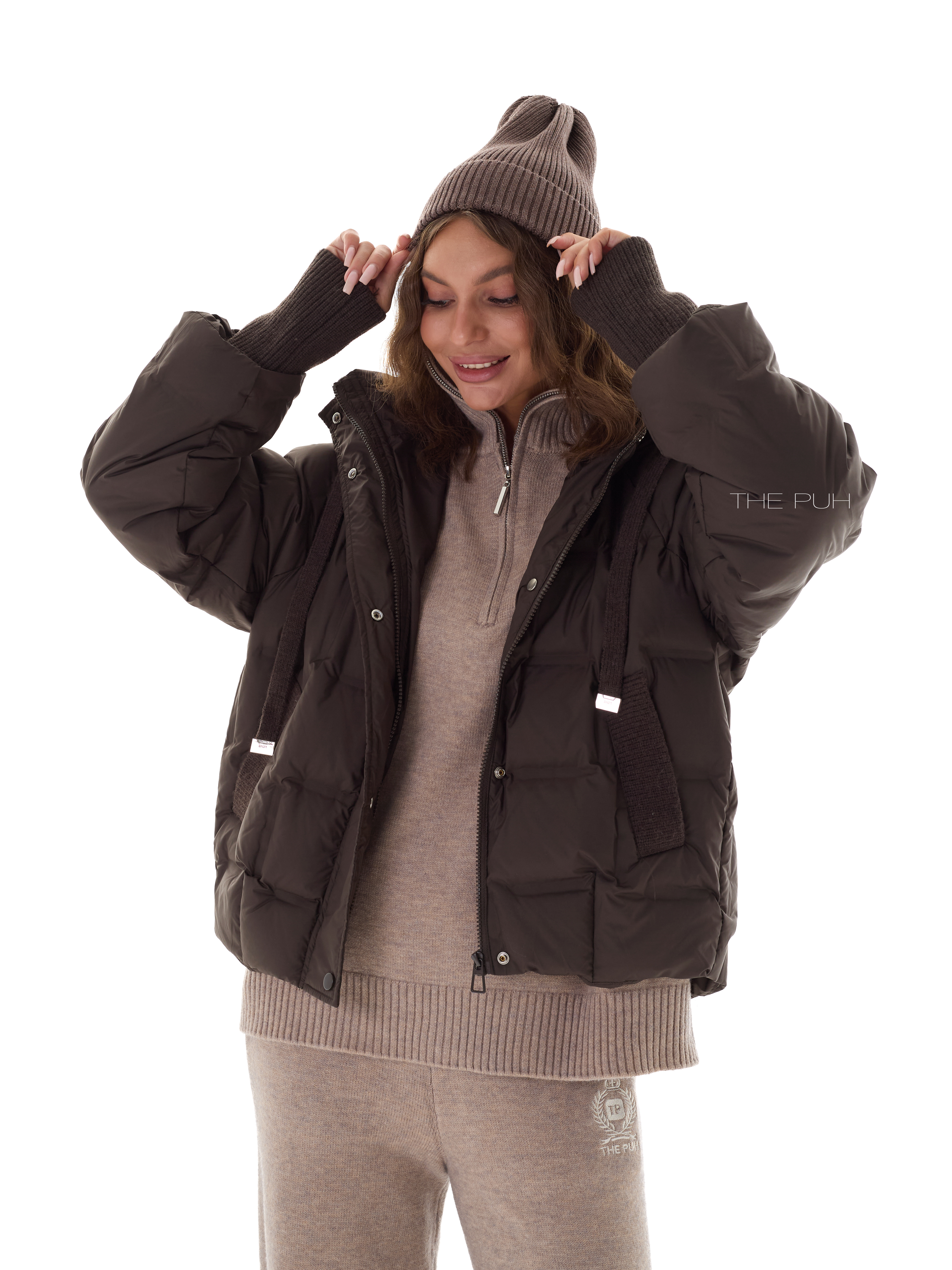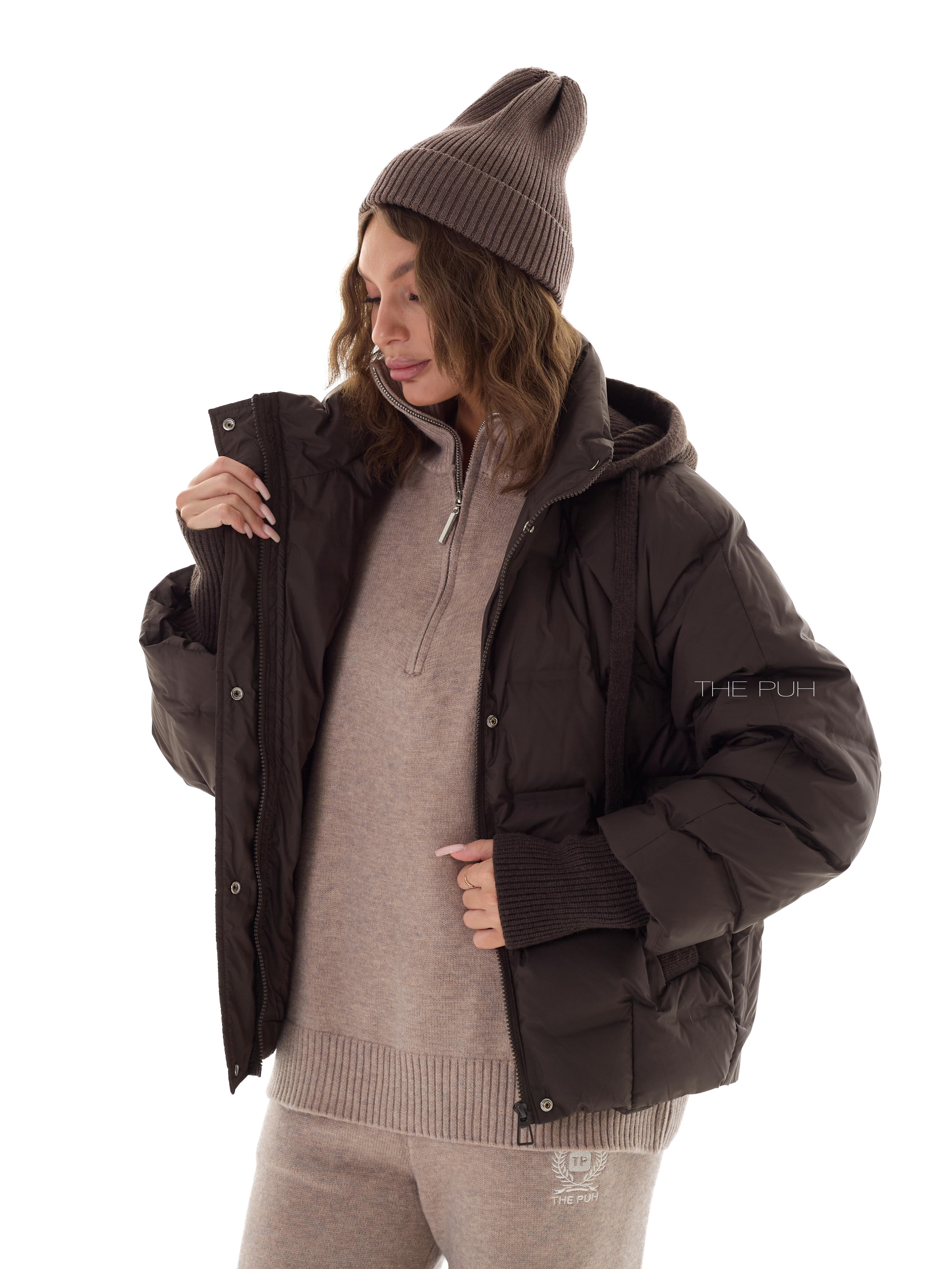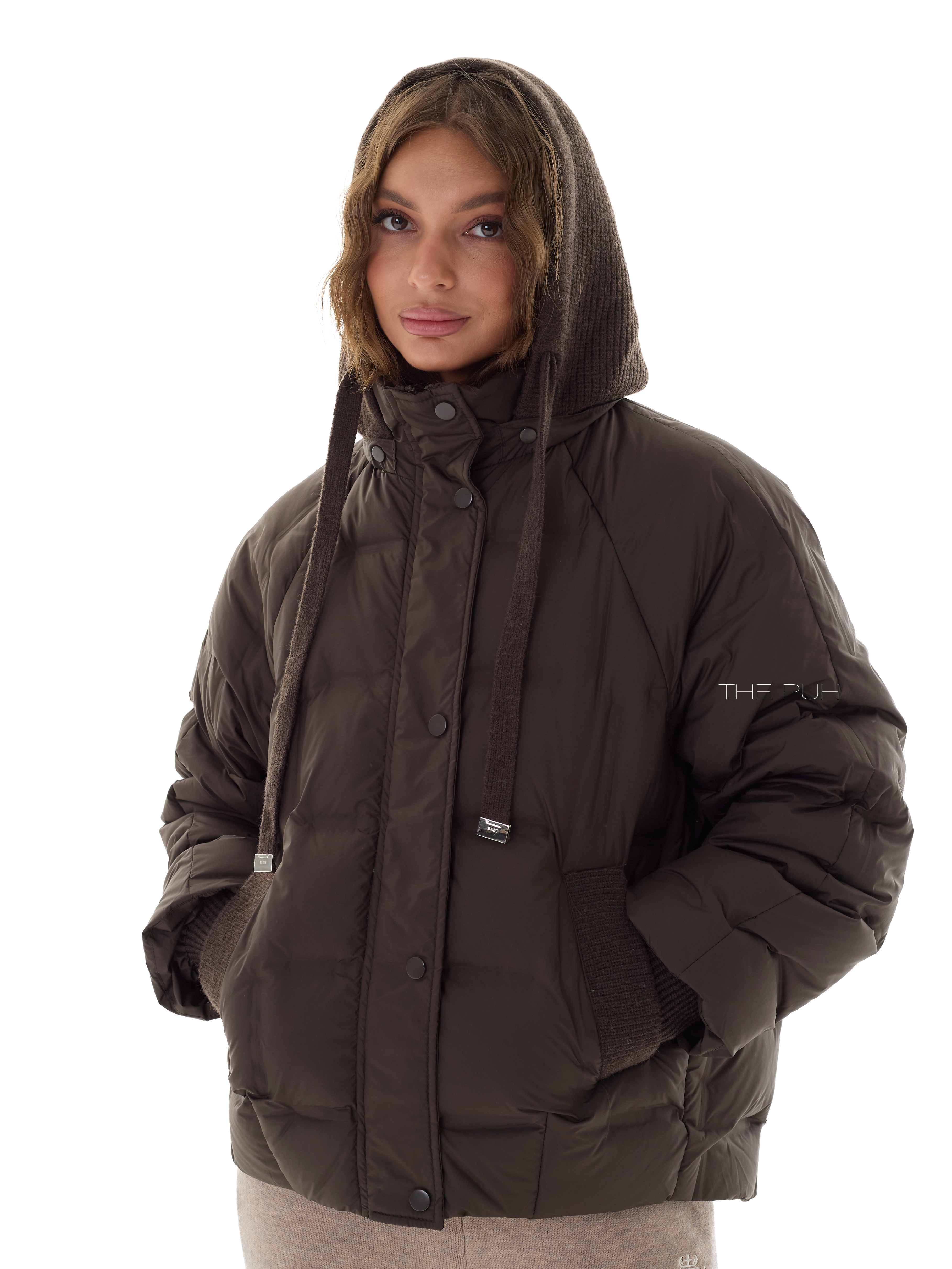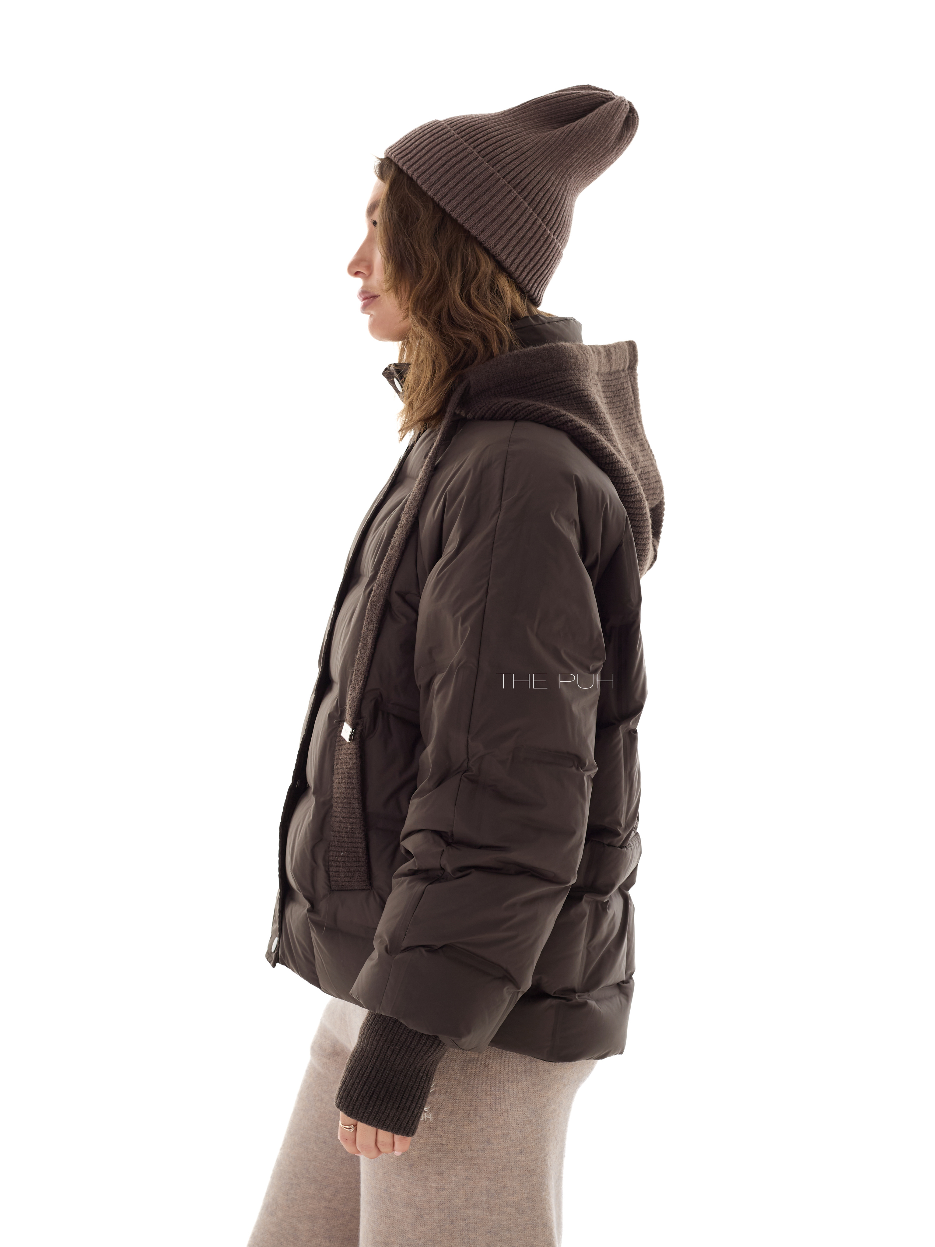 Короткая куртка-пуховик в цвете шоколад со съемным вязаным капюшоном. Модель утеплена натуральным гусиным пухом и идеально подойдет на позднюю осень и первые заморозки.