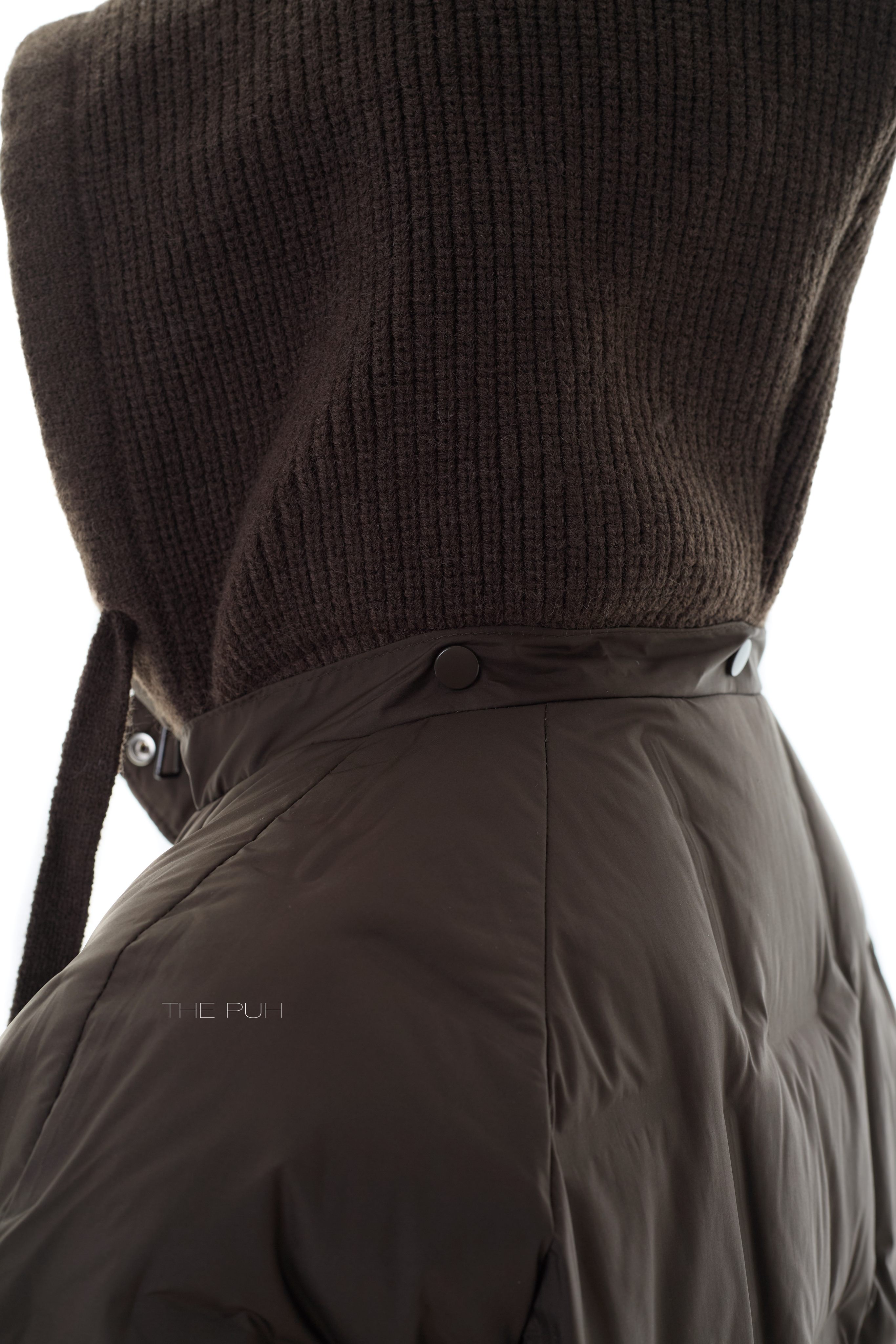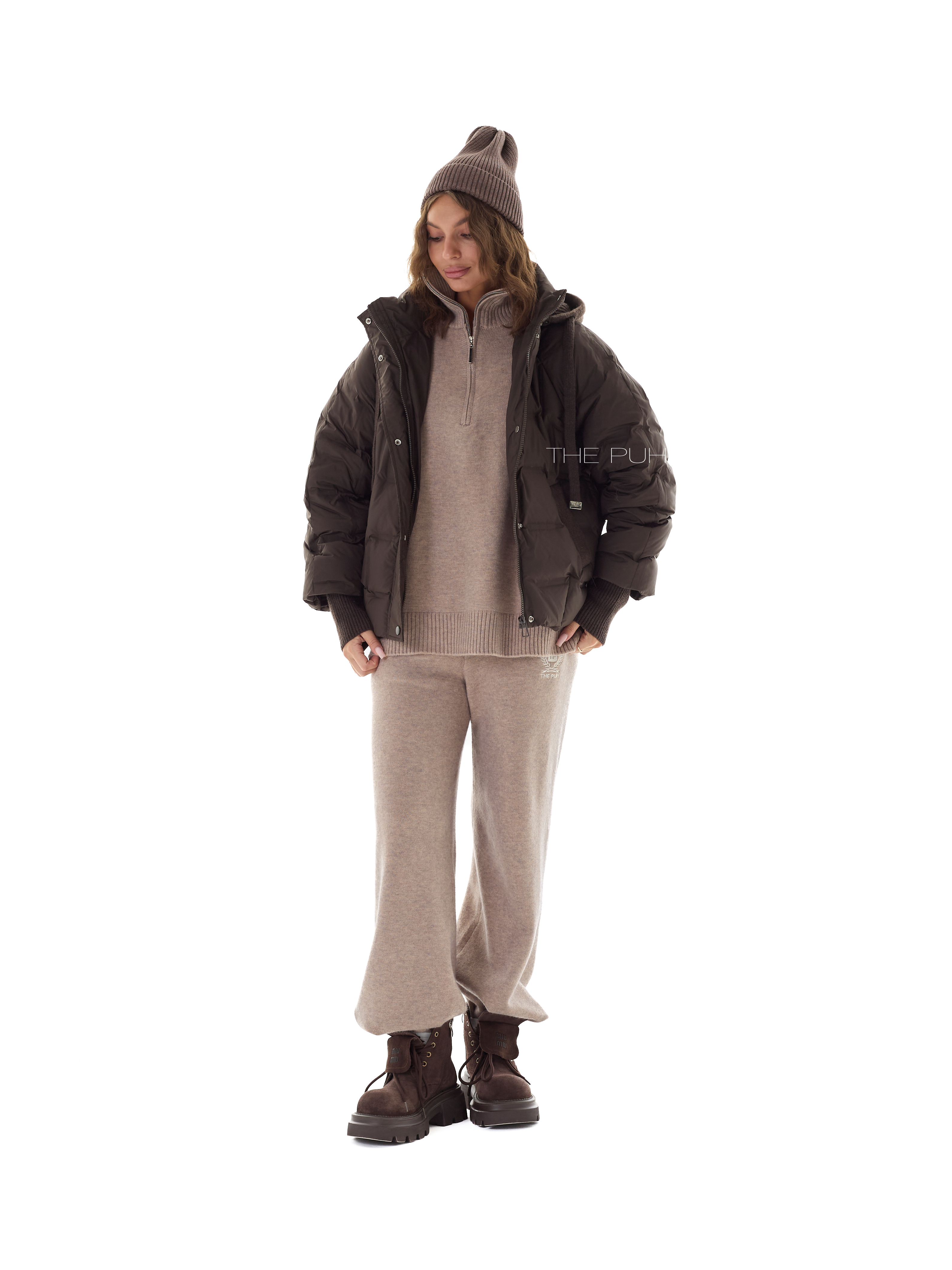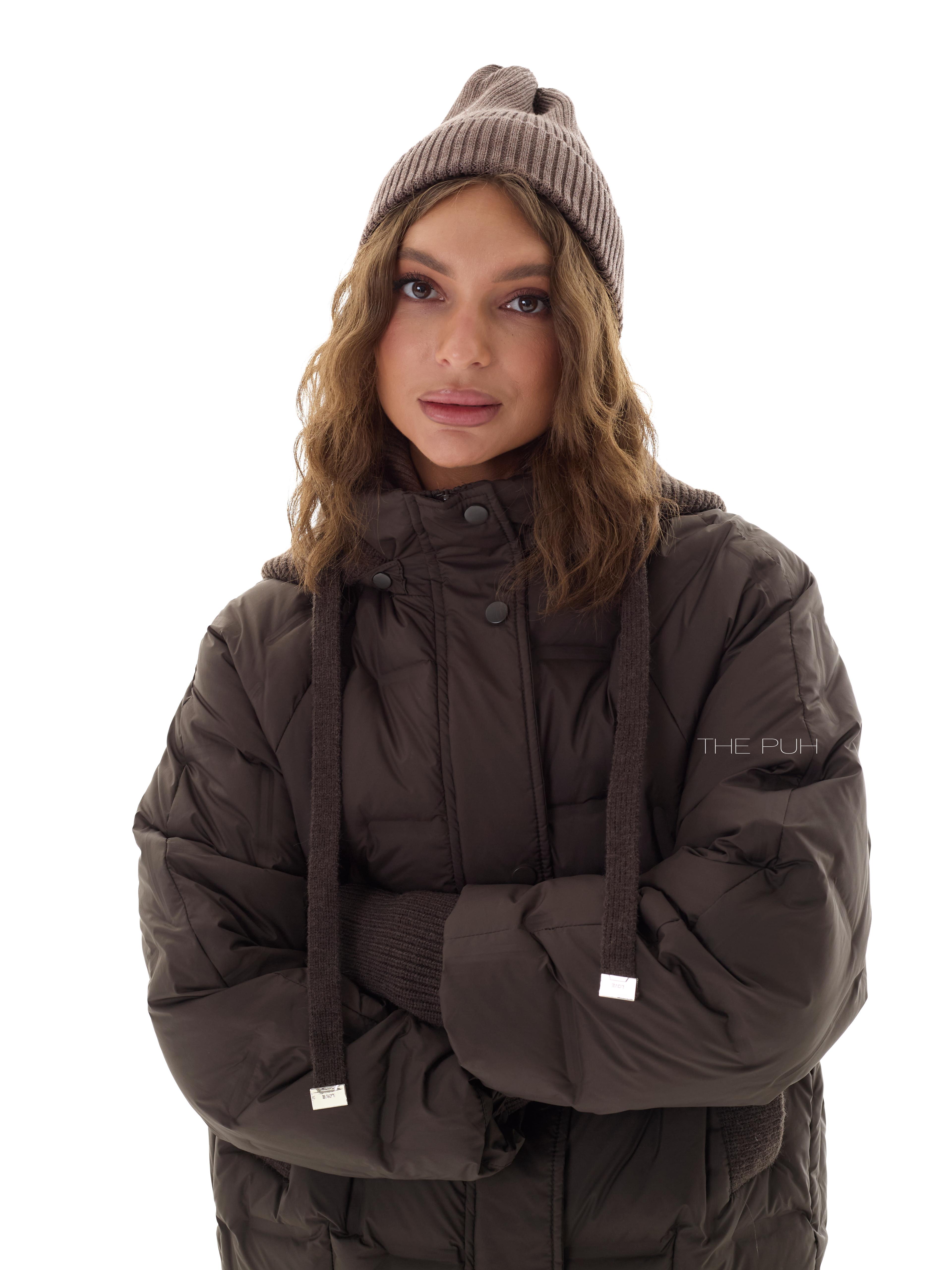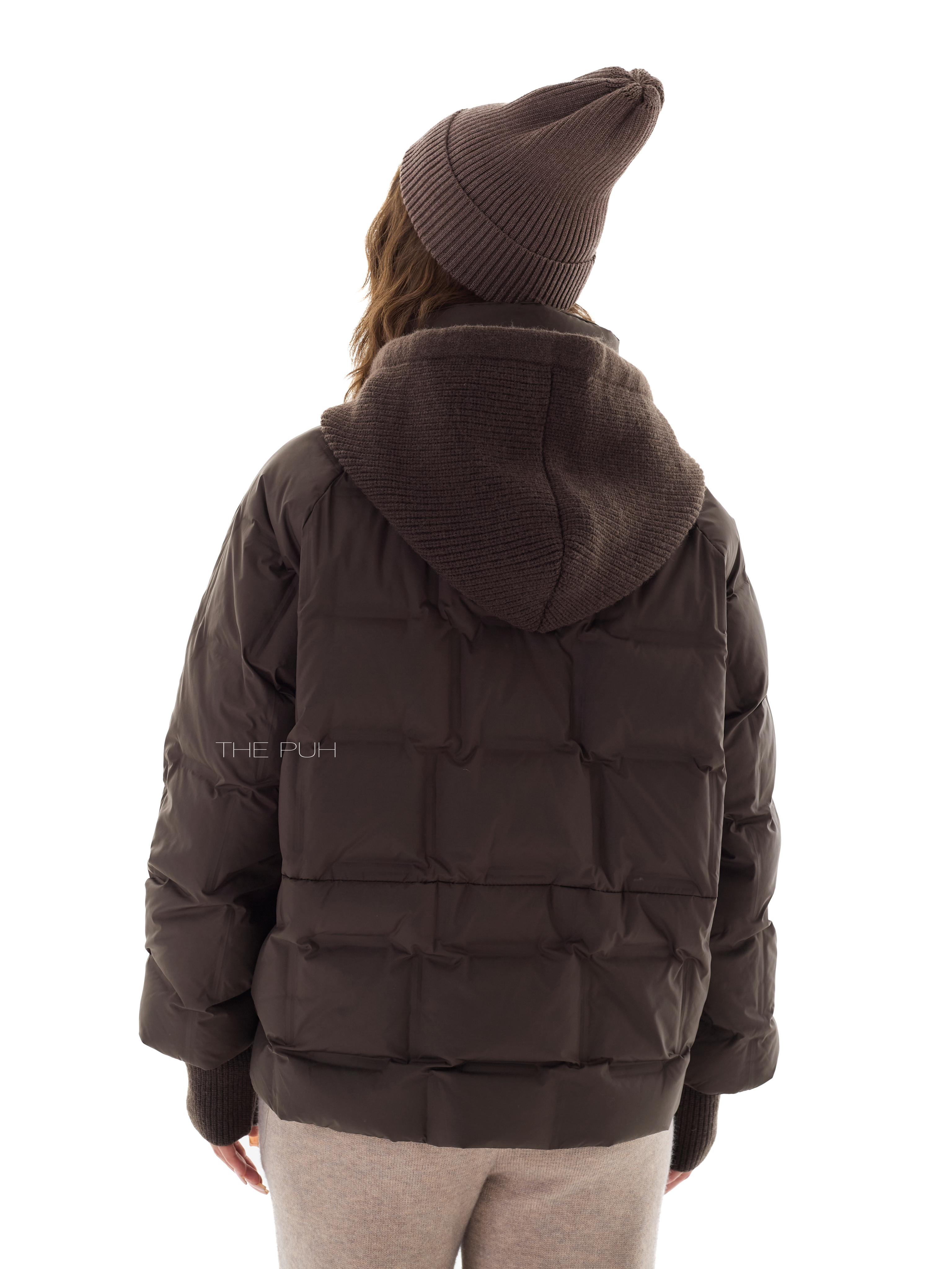 Короткая куртка-пуховик в цвете шоколад со съемным вязаным капюшоном. Модель утеплена натуральным гусиным пухом и идеально подойдет на позднюю осень и первые заморозки.