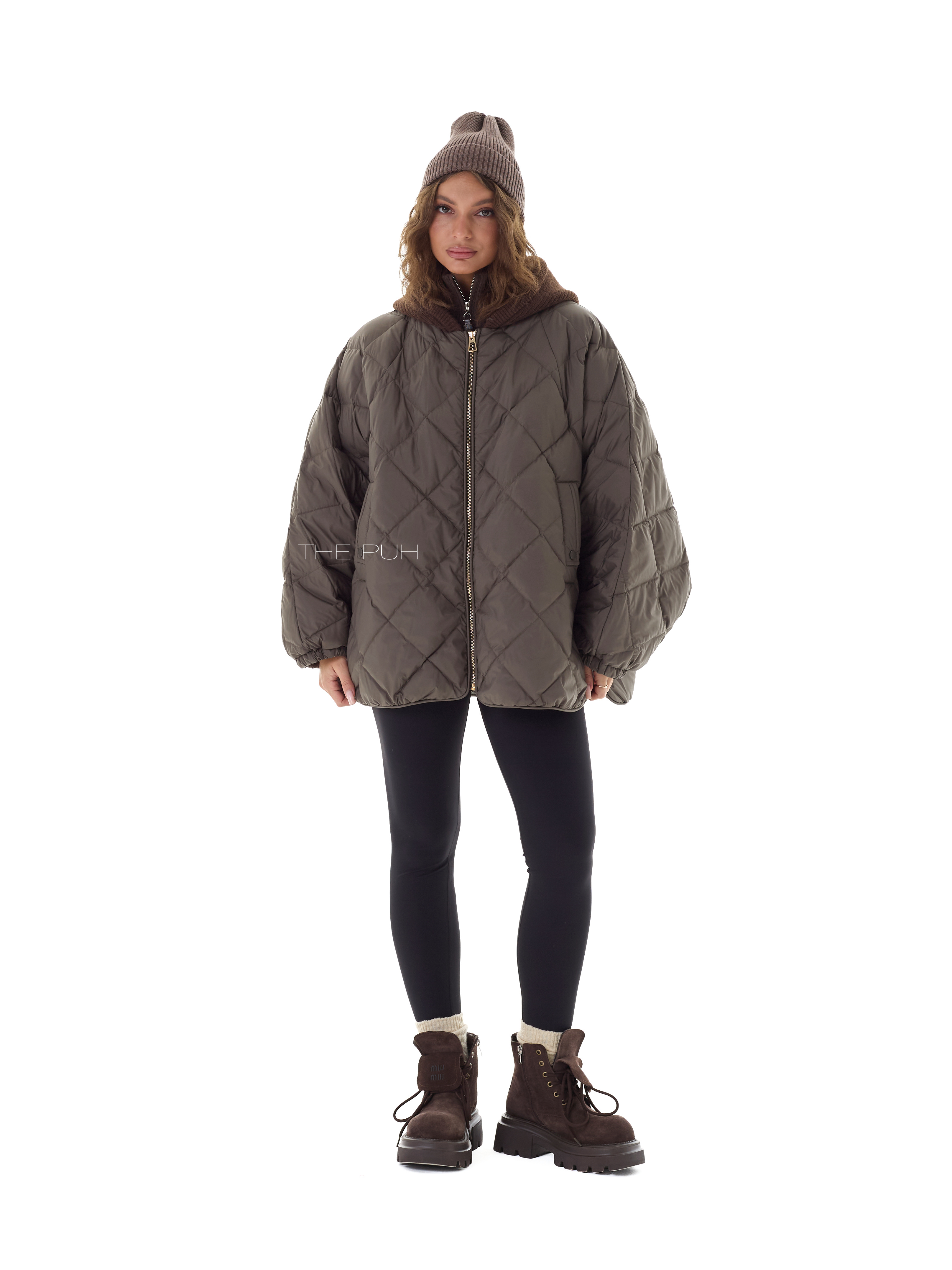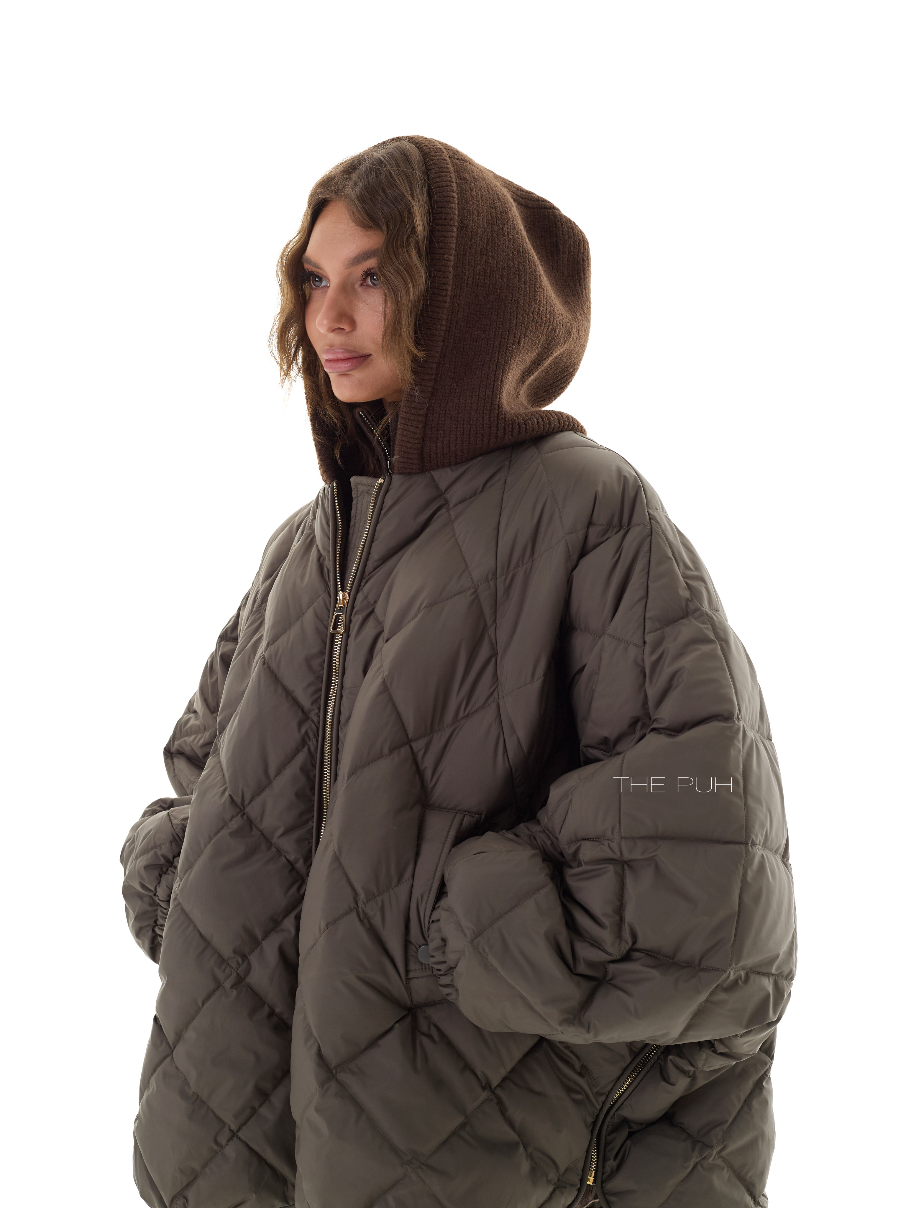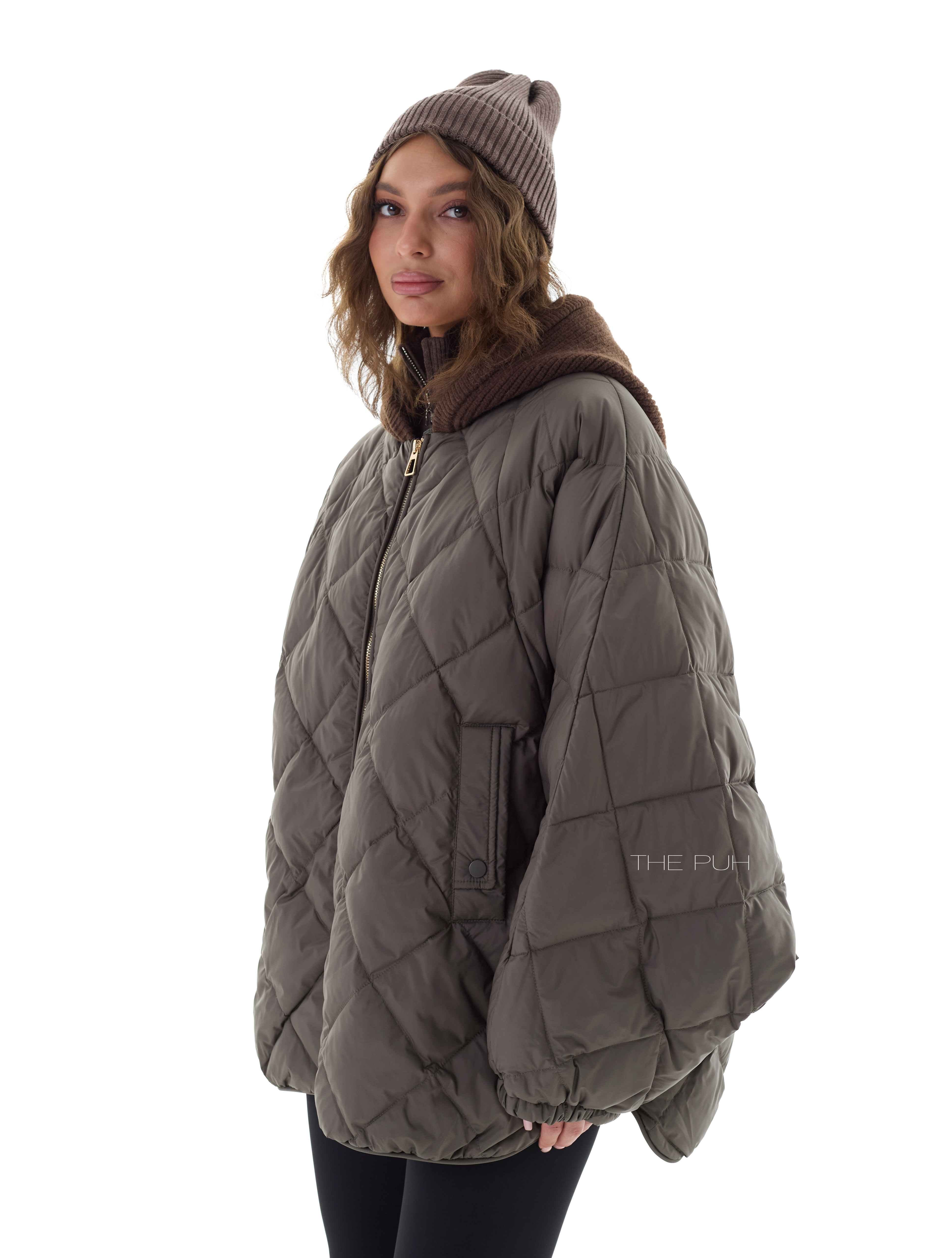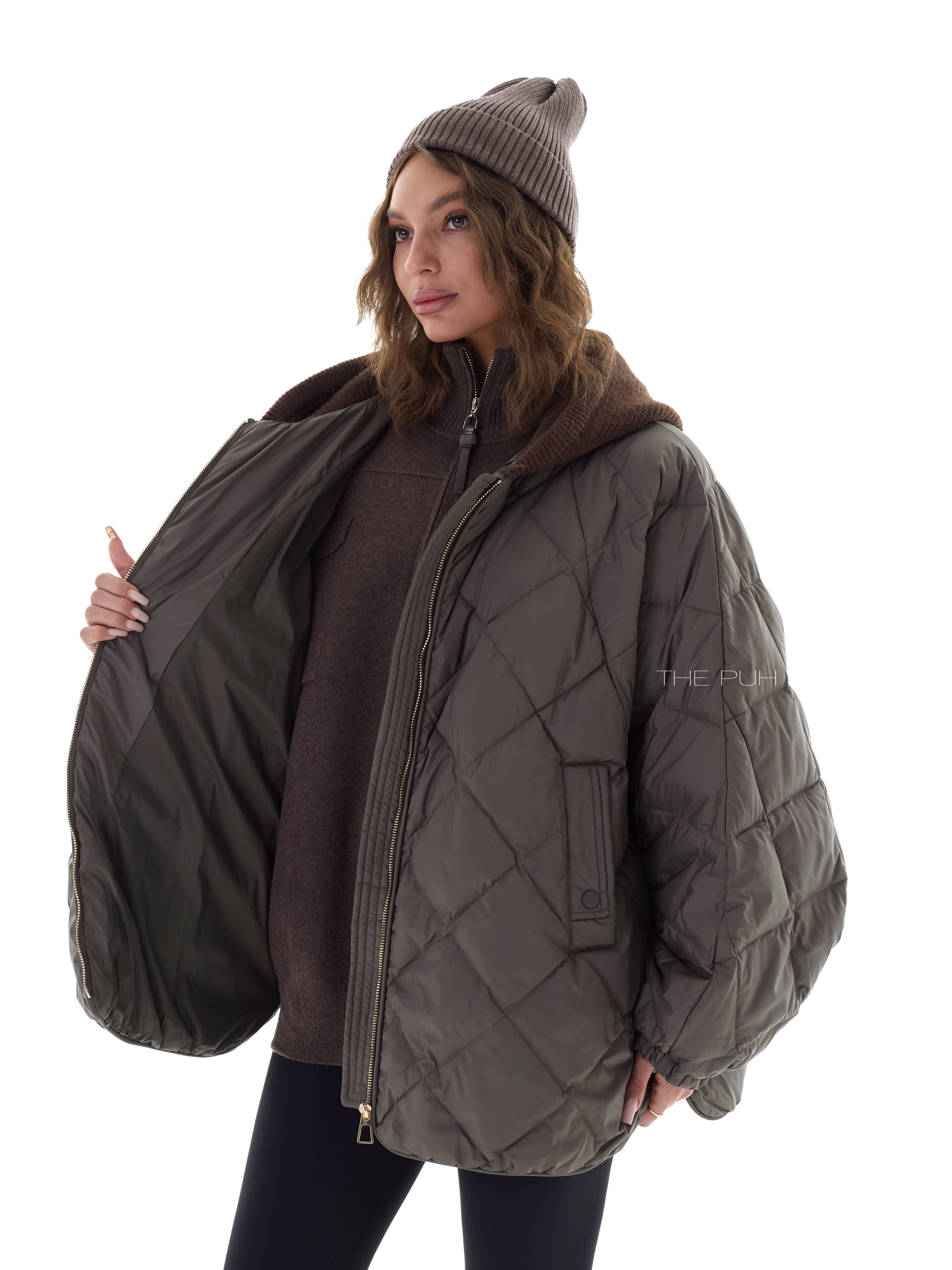 Стеганый пуховик в силуэте "летучая мышь" с коричневым трикотажным капюшоном. Модель в цвете хаки свободного силуэта дополнена кулиской на спинке, которая позволяет слегка корректировать силуэт по вашему вкусу. Модель утеплена натуральным гусиным пухом и идеально подойдет на позднюю осень и первые заморозки.