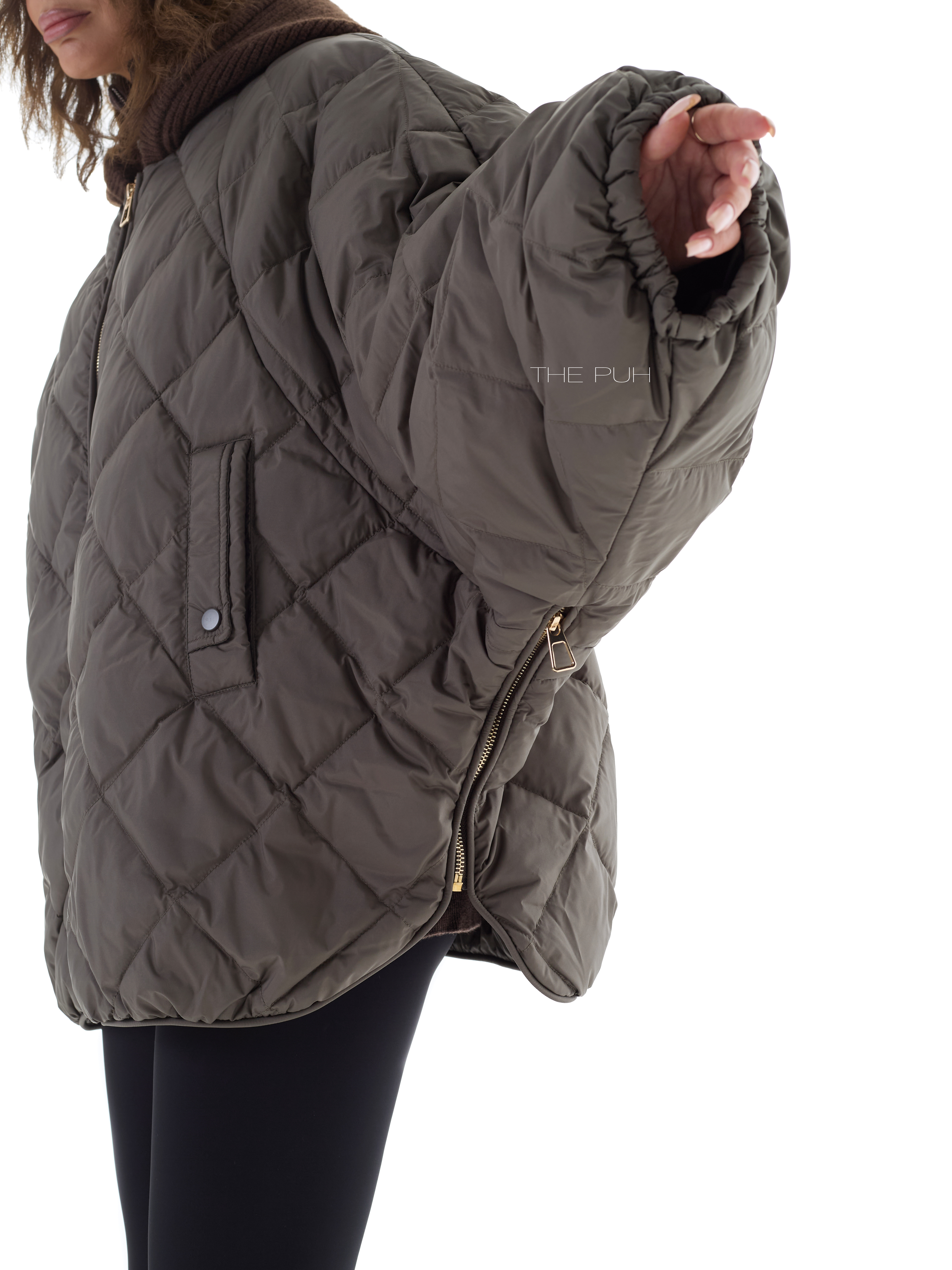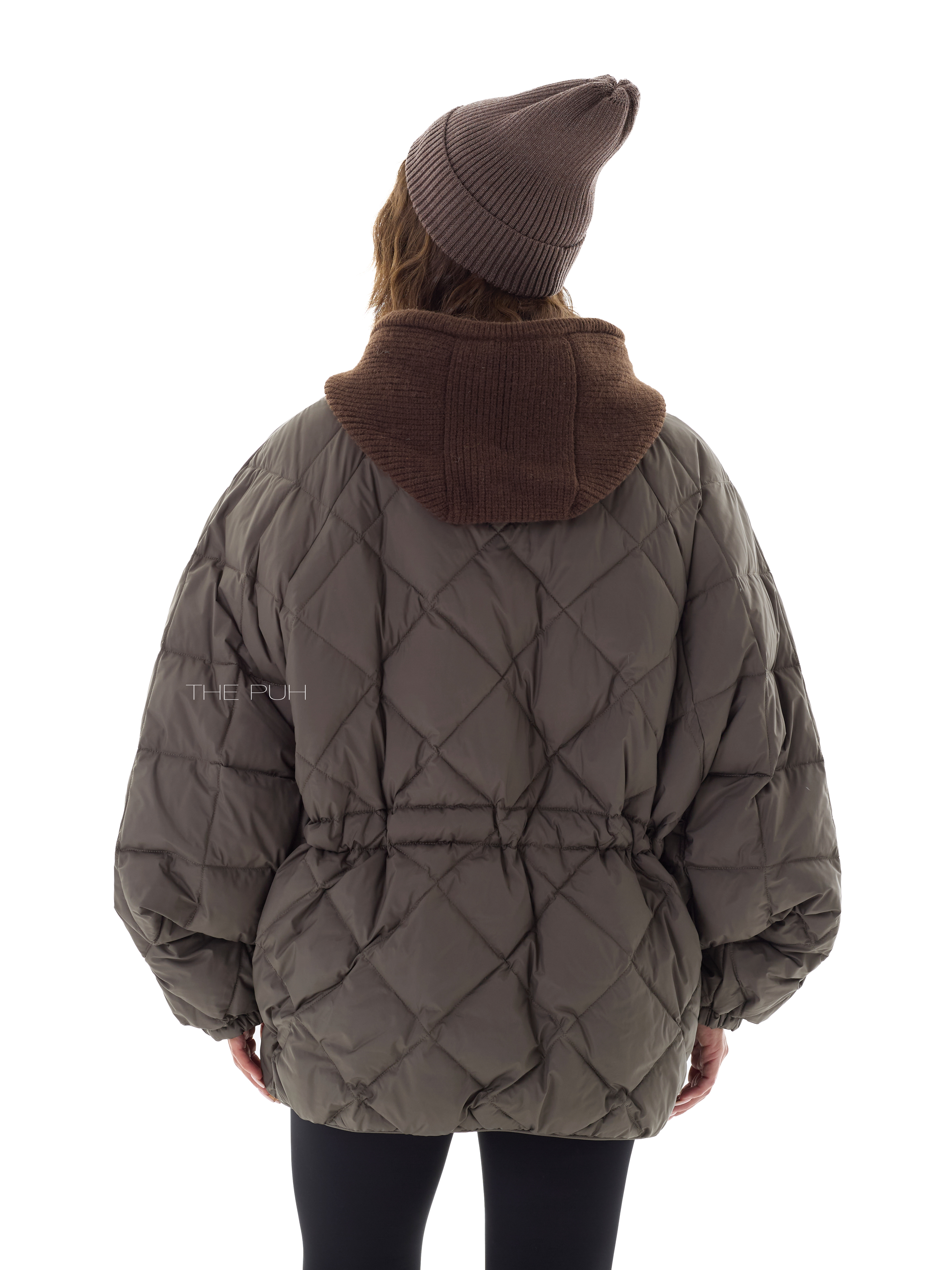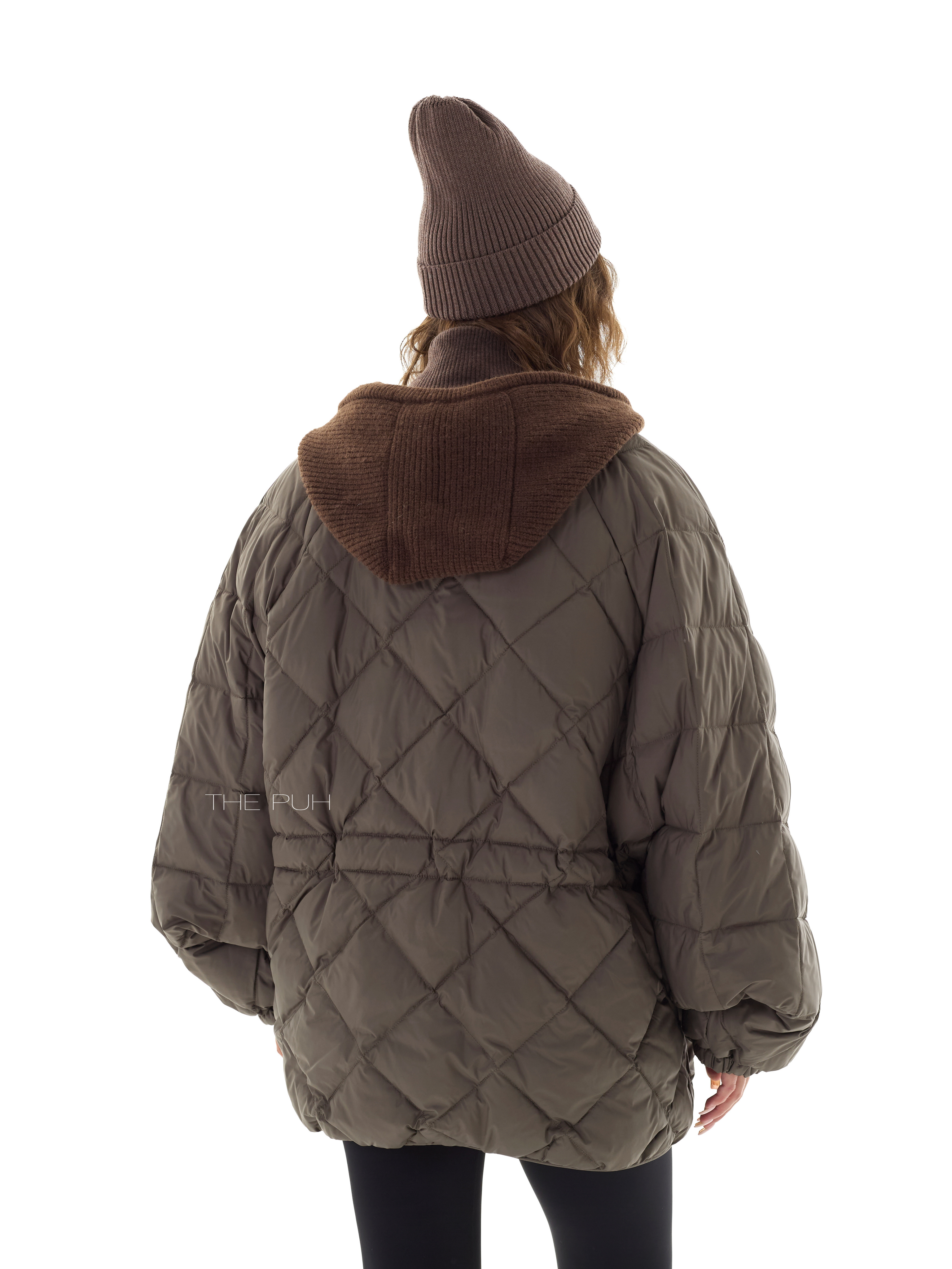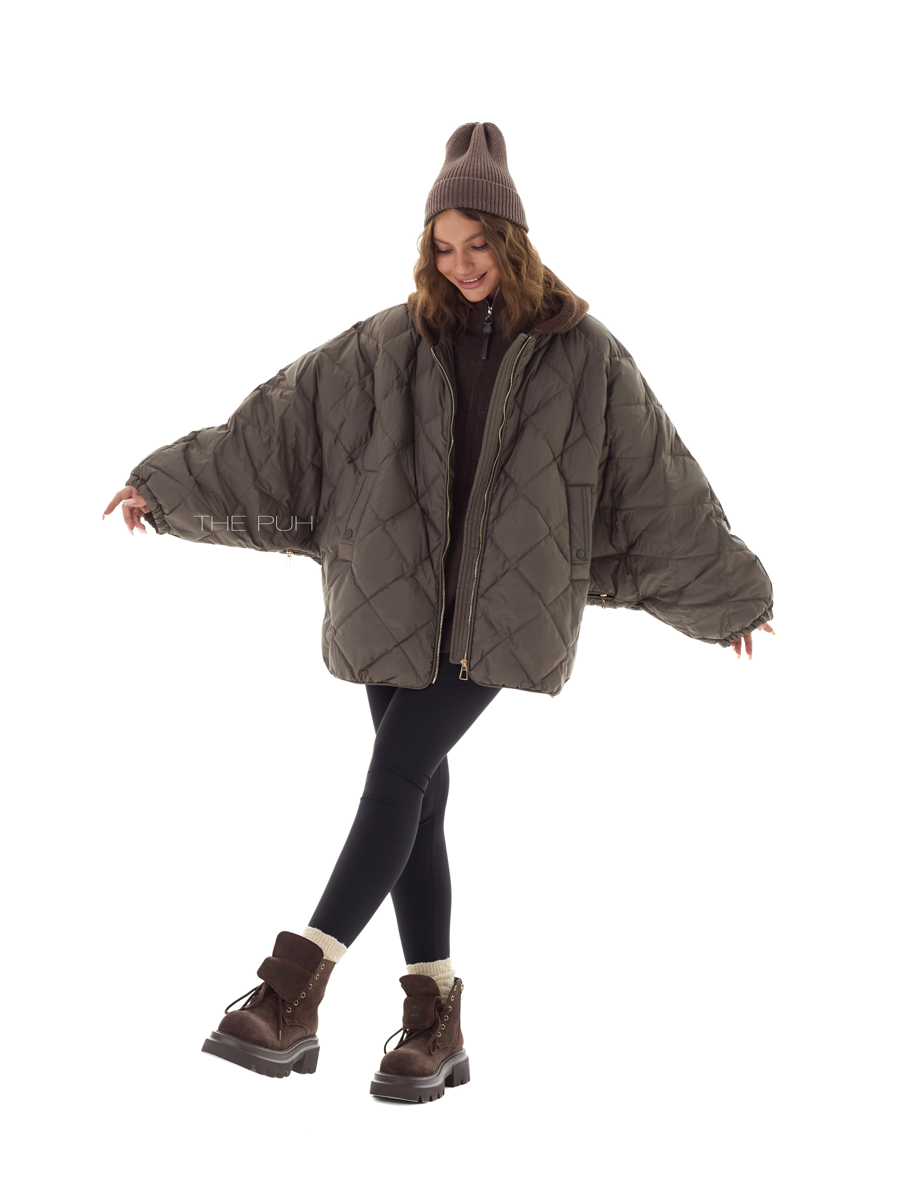 Стеганый пуховик в силуэте "летучая мышь" с коричневым трикотажным капюшоном. Модель в цвете хаки свободного силуэта дополнена кулиской на спинке, которая позволяет слегка корректировать силуэт по вашему вкусу. Модель утеплена натуральным гусиным пухом и идеально подойдет на позднюю осень и первые заморозки.