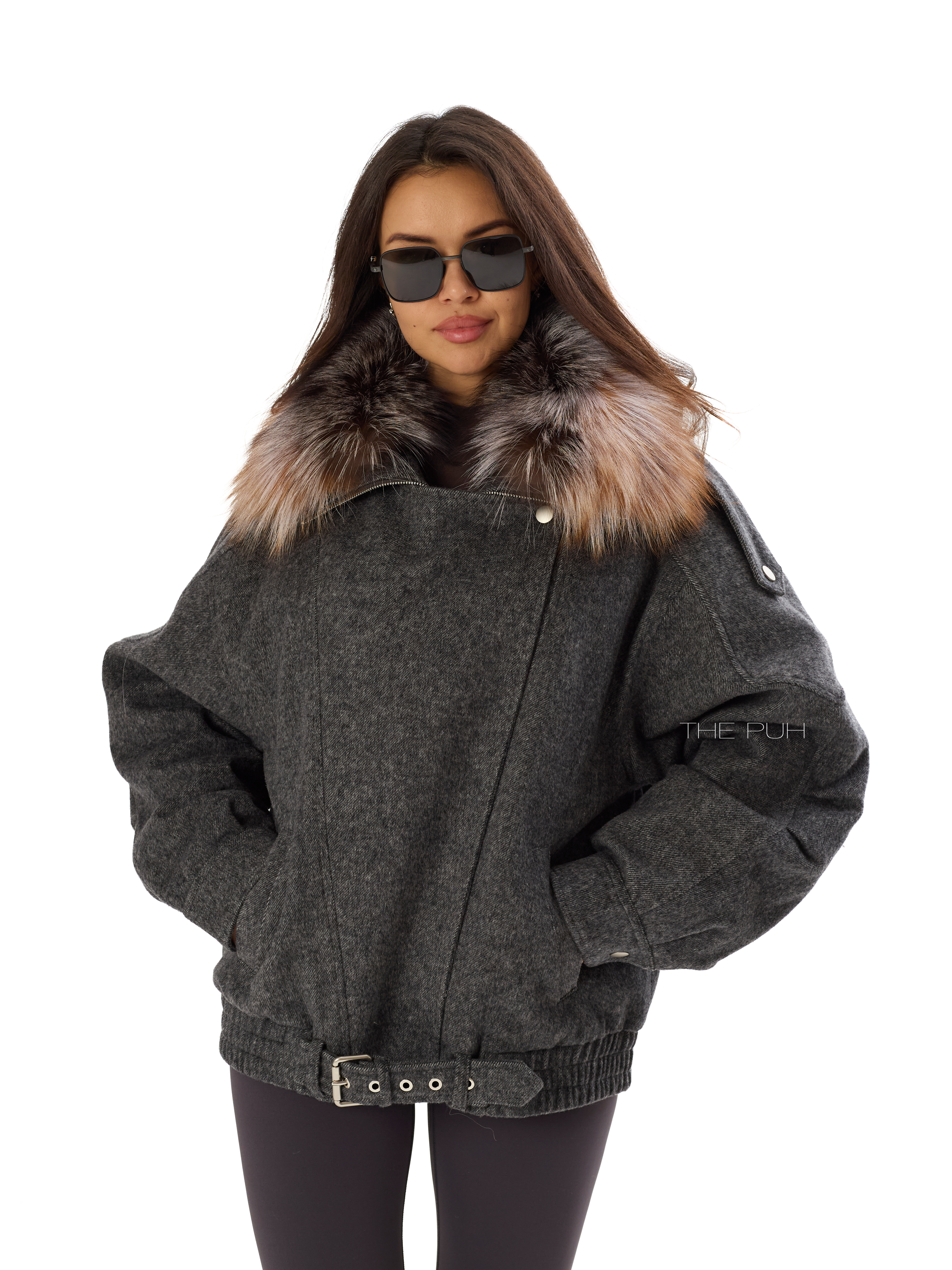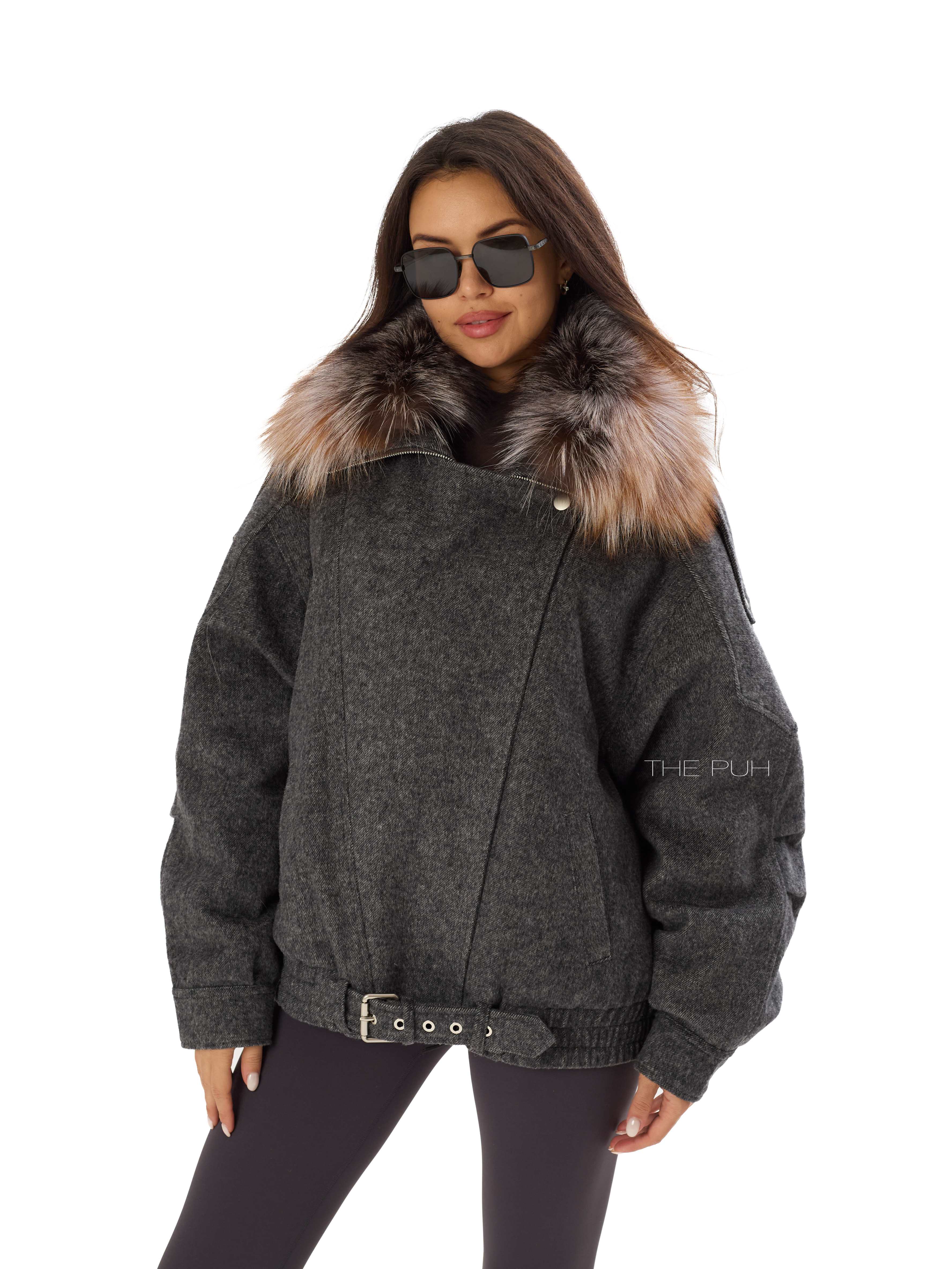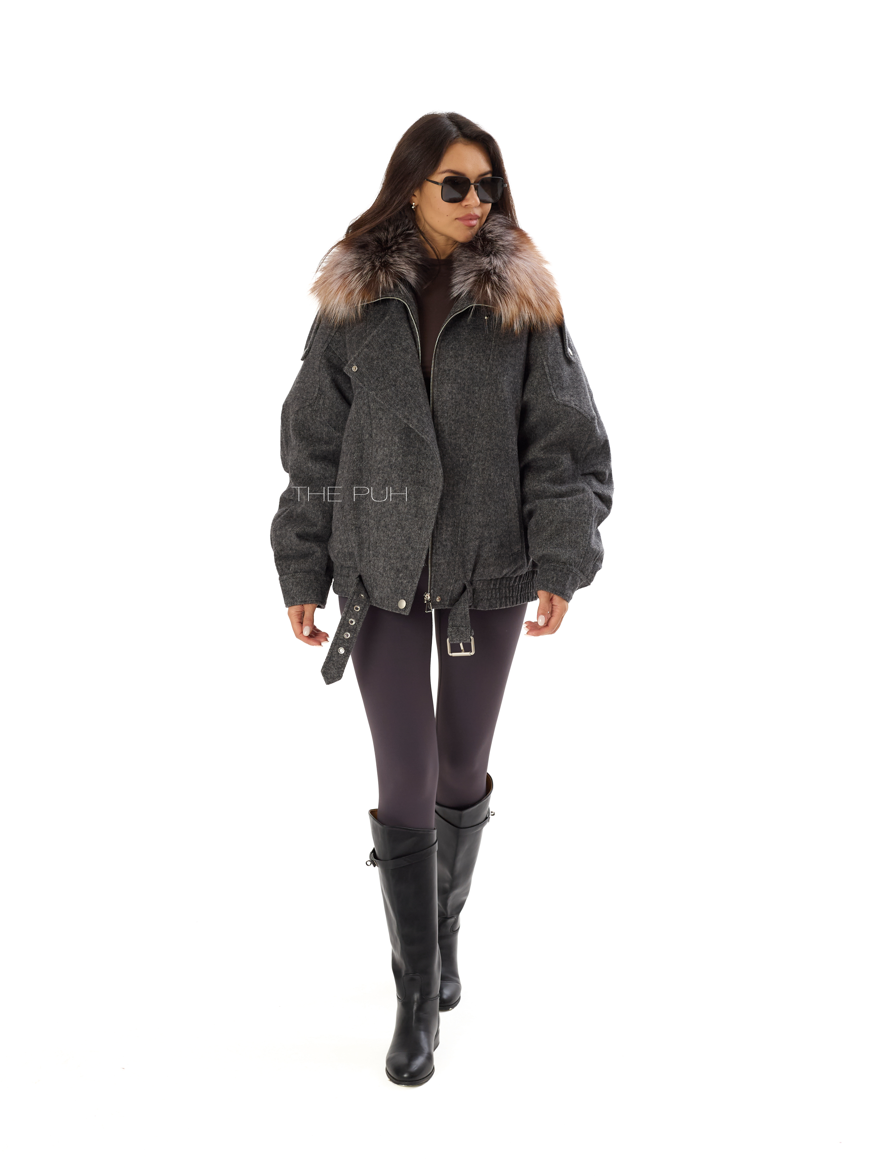 Шерстяная куртка темно-серого цвета с меховым воротником и утепленным подкладом с натуральным пухом. Модель до середины бедра дополнена широкой ветрозащитной планкой и ремешком с пряжкой. Воротник из меха енота снимается.