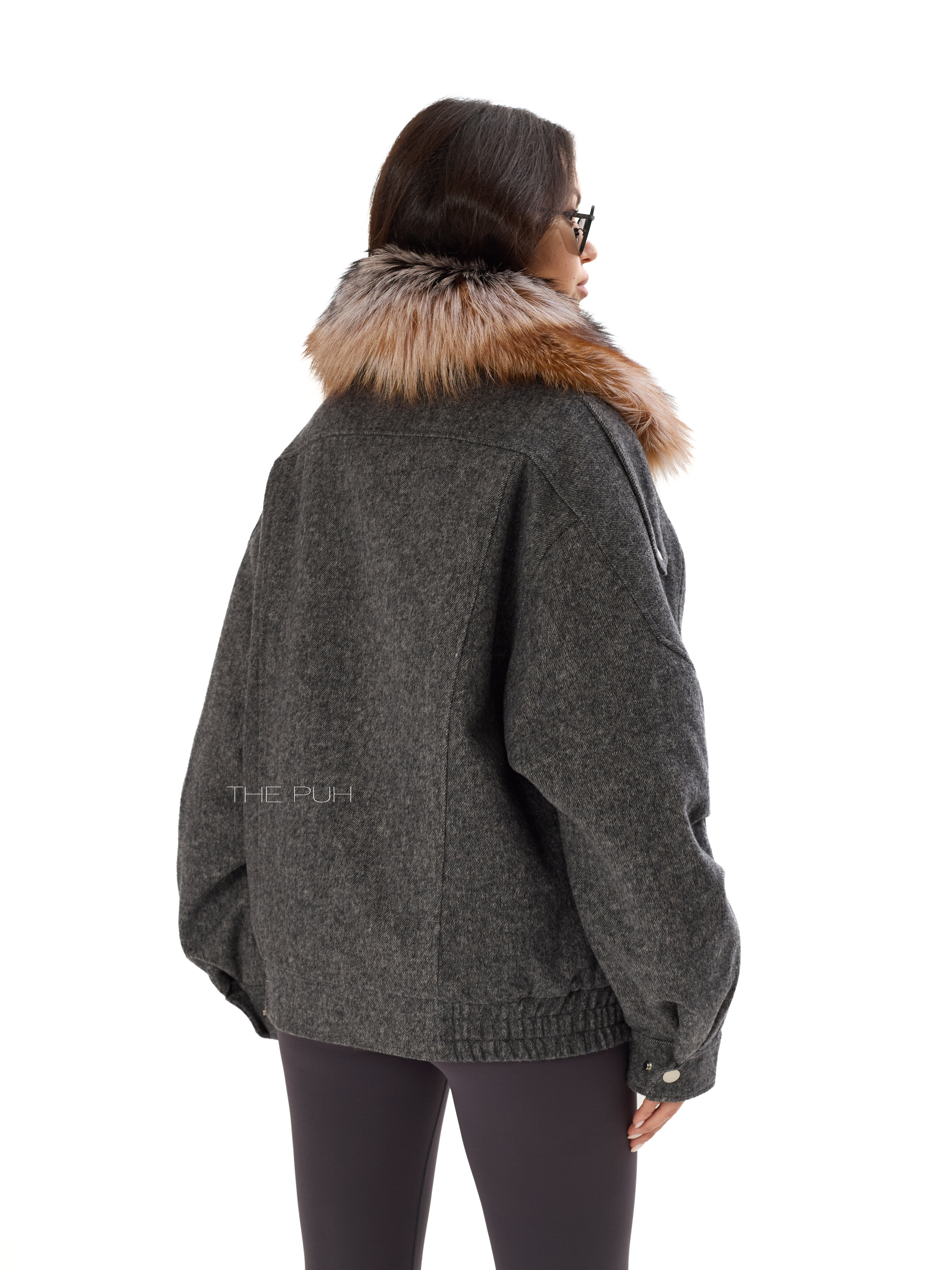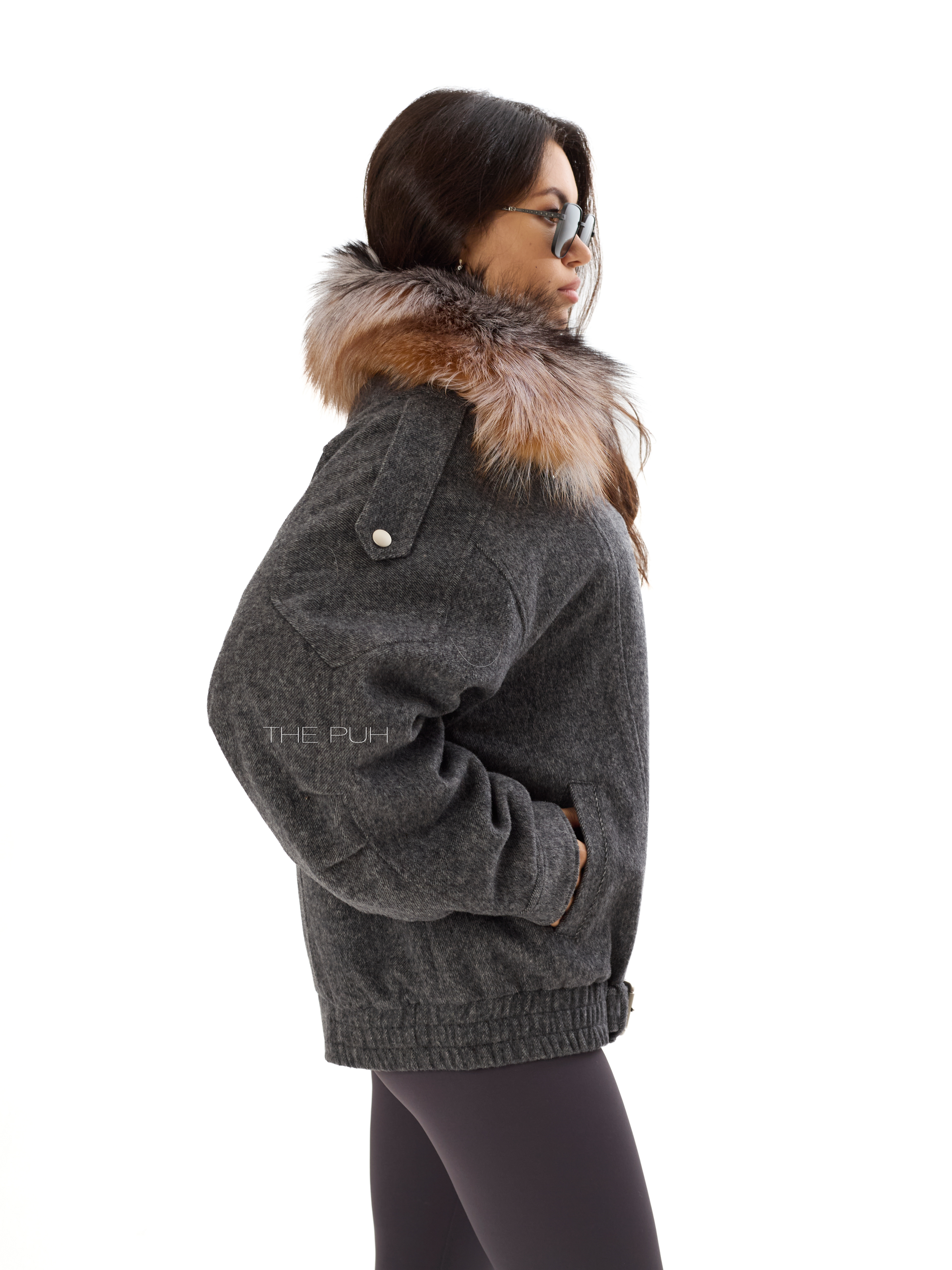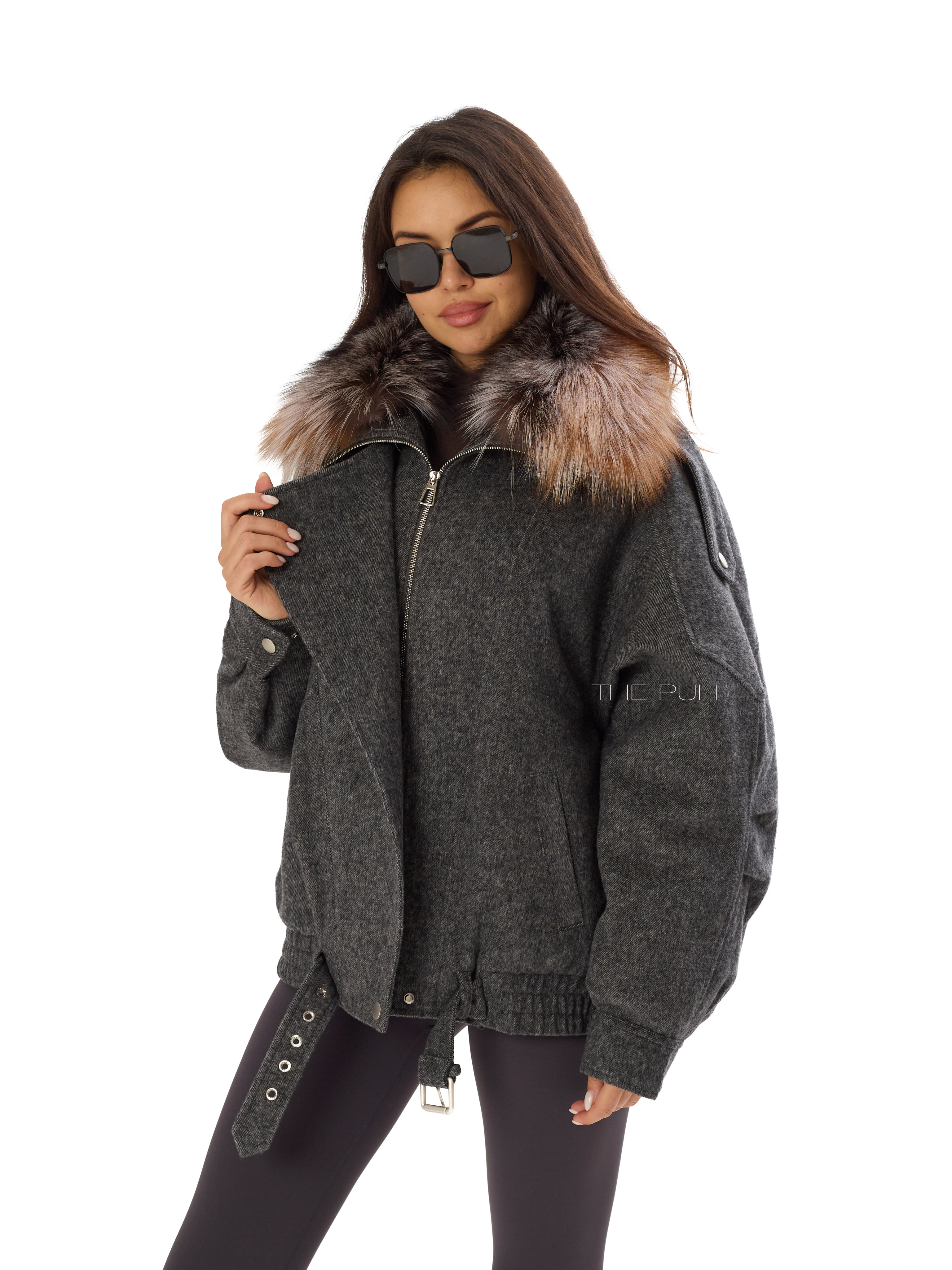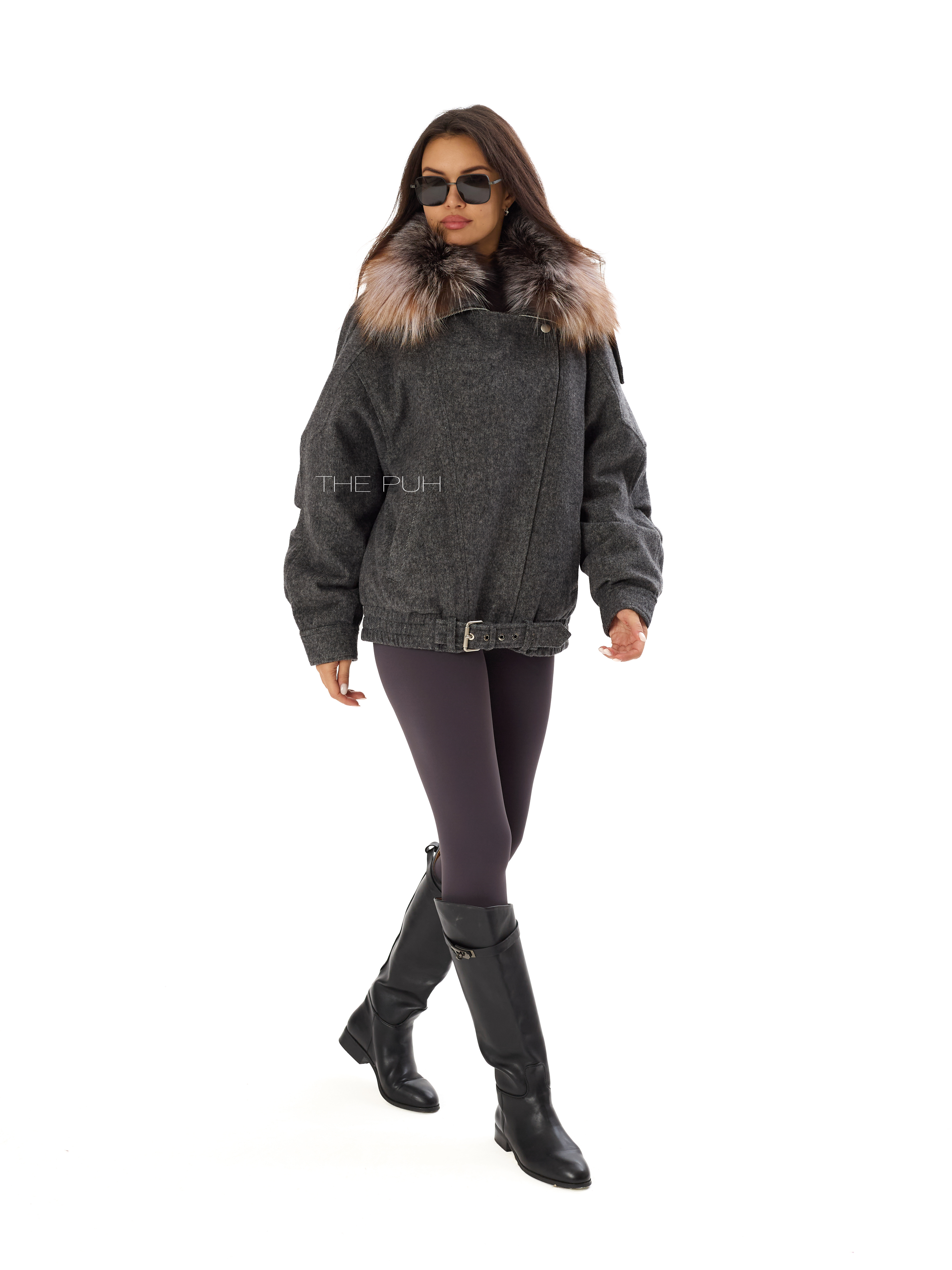 Шерстяная куртка темно-серого цвета с меховым воротником и утепленным подкладом с натуральным пухом. Модель до середины бедра дополнена широкой ветрозащитной планкой и ремешком с пряжкой. Воротник из меха енота снимается.