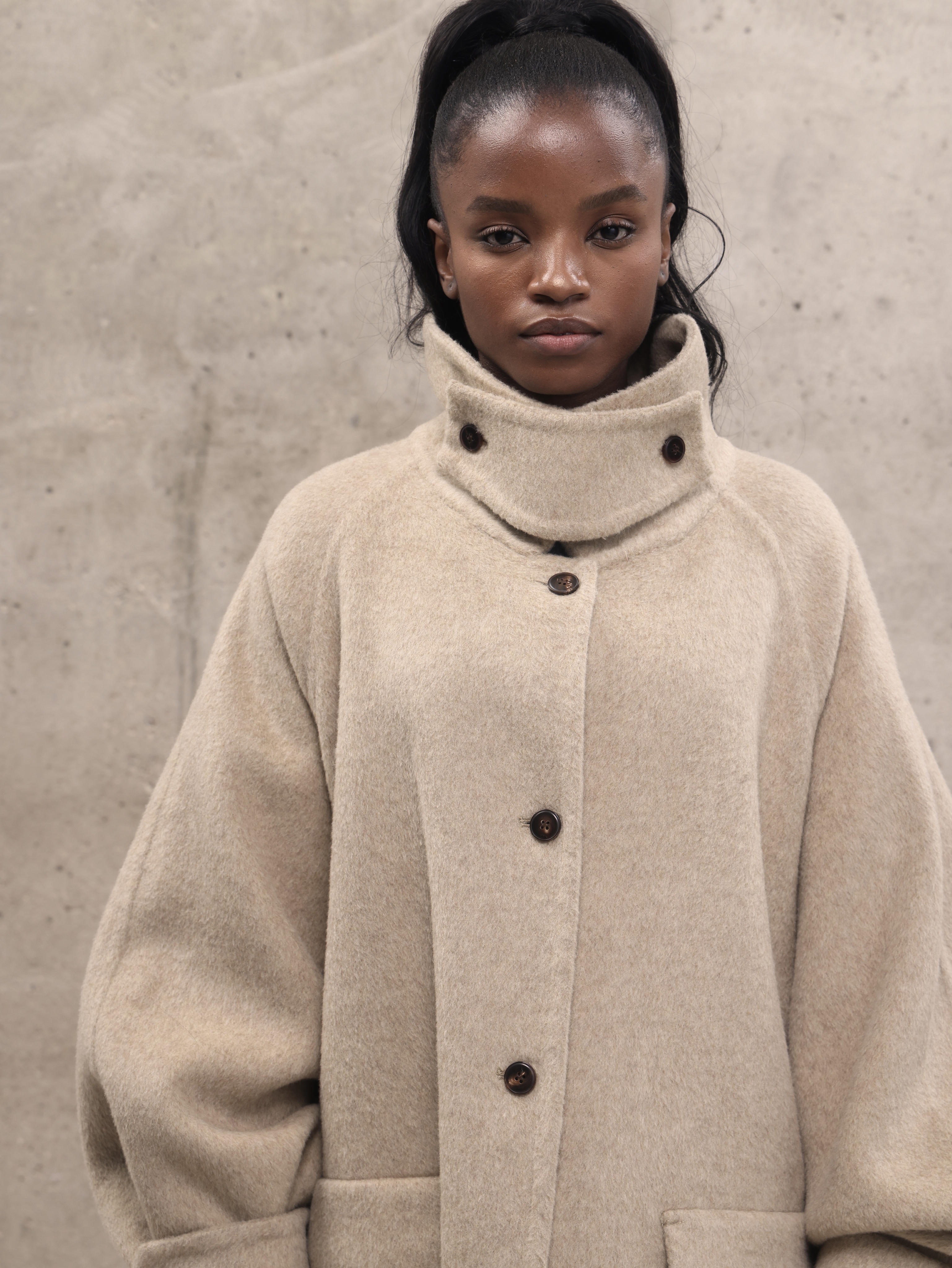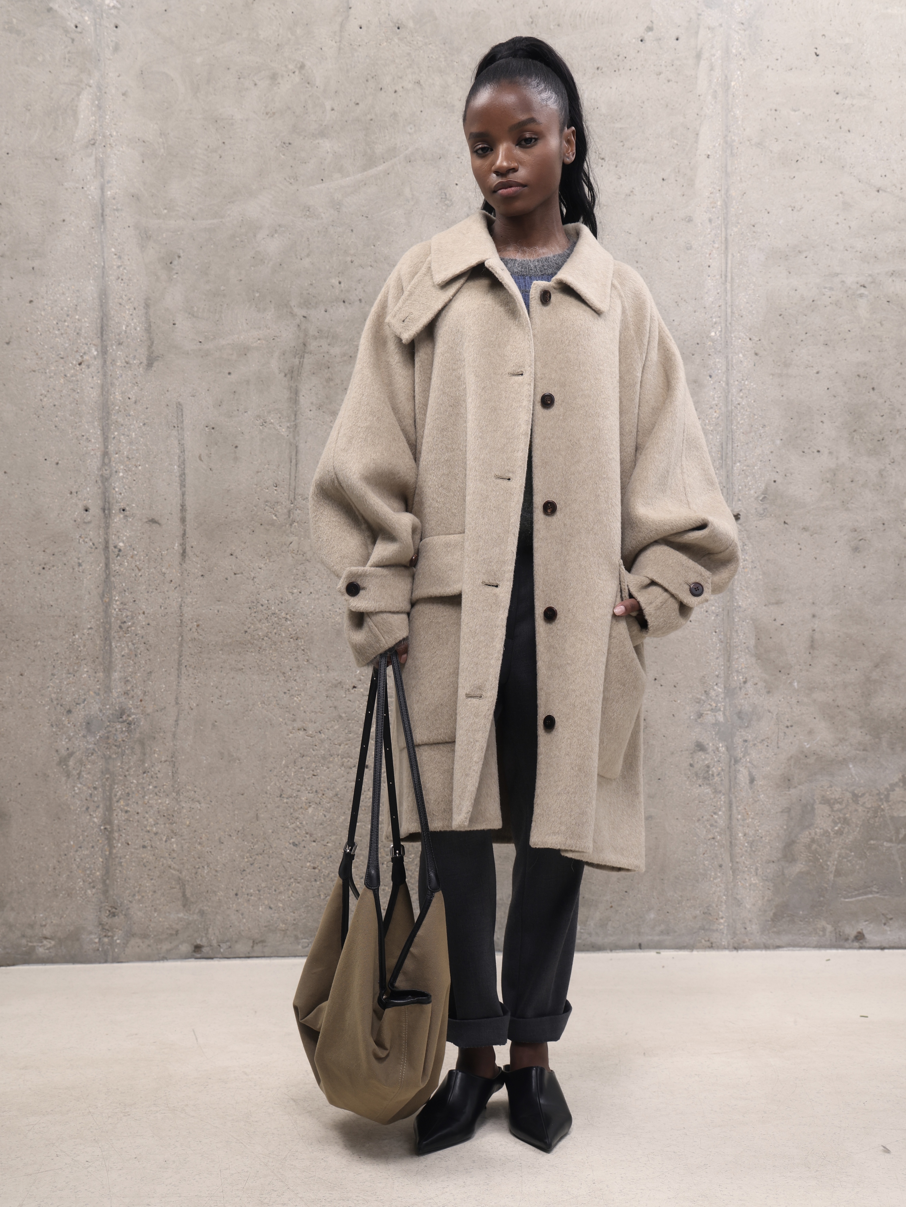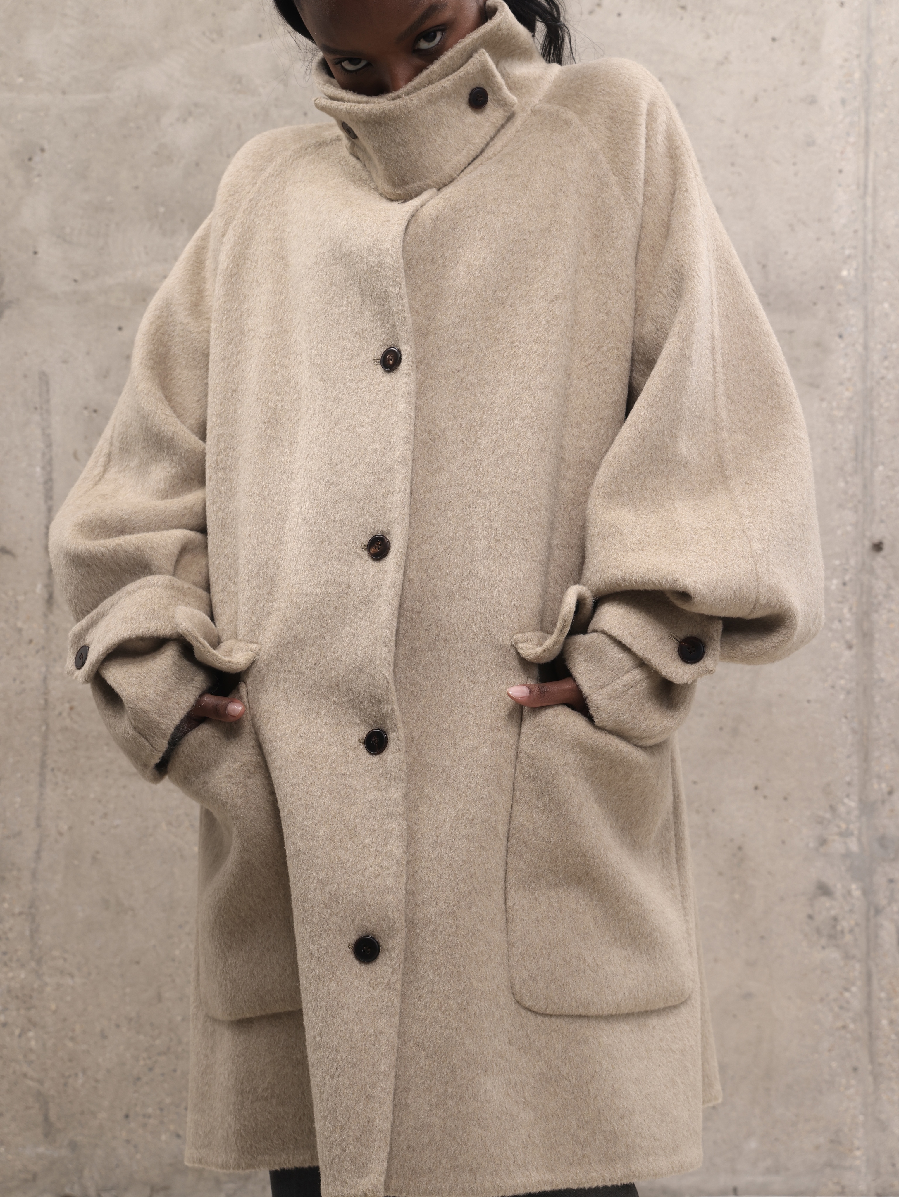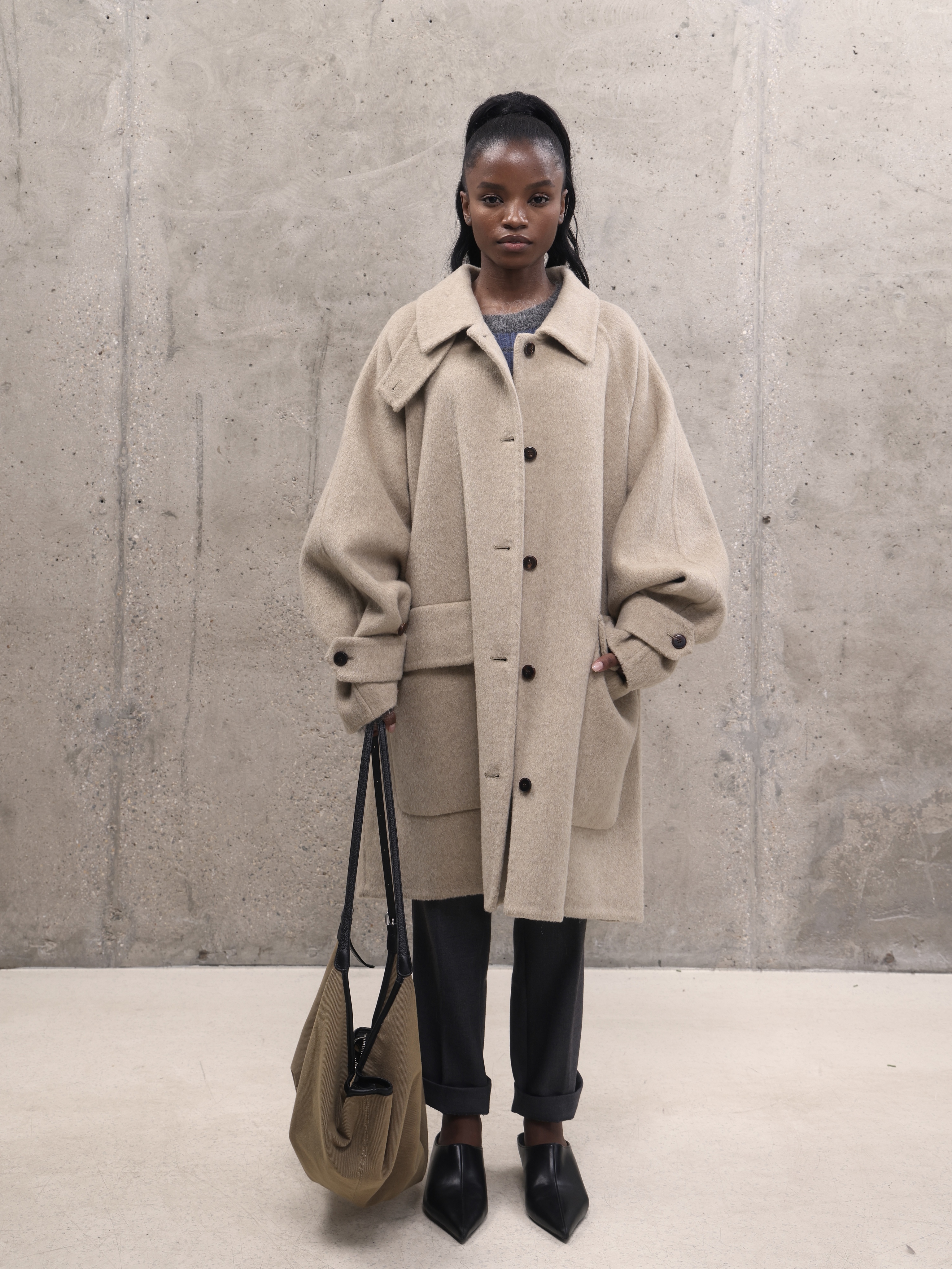 Шерстяное осеннее пальто бежевого цвета. Модель объемного кроя средней длины дополнена отложным воротником, который при необходимости можно поставить в стойку - и он защитит от ветра и непогоды.