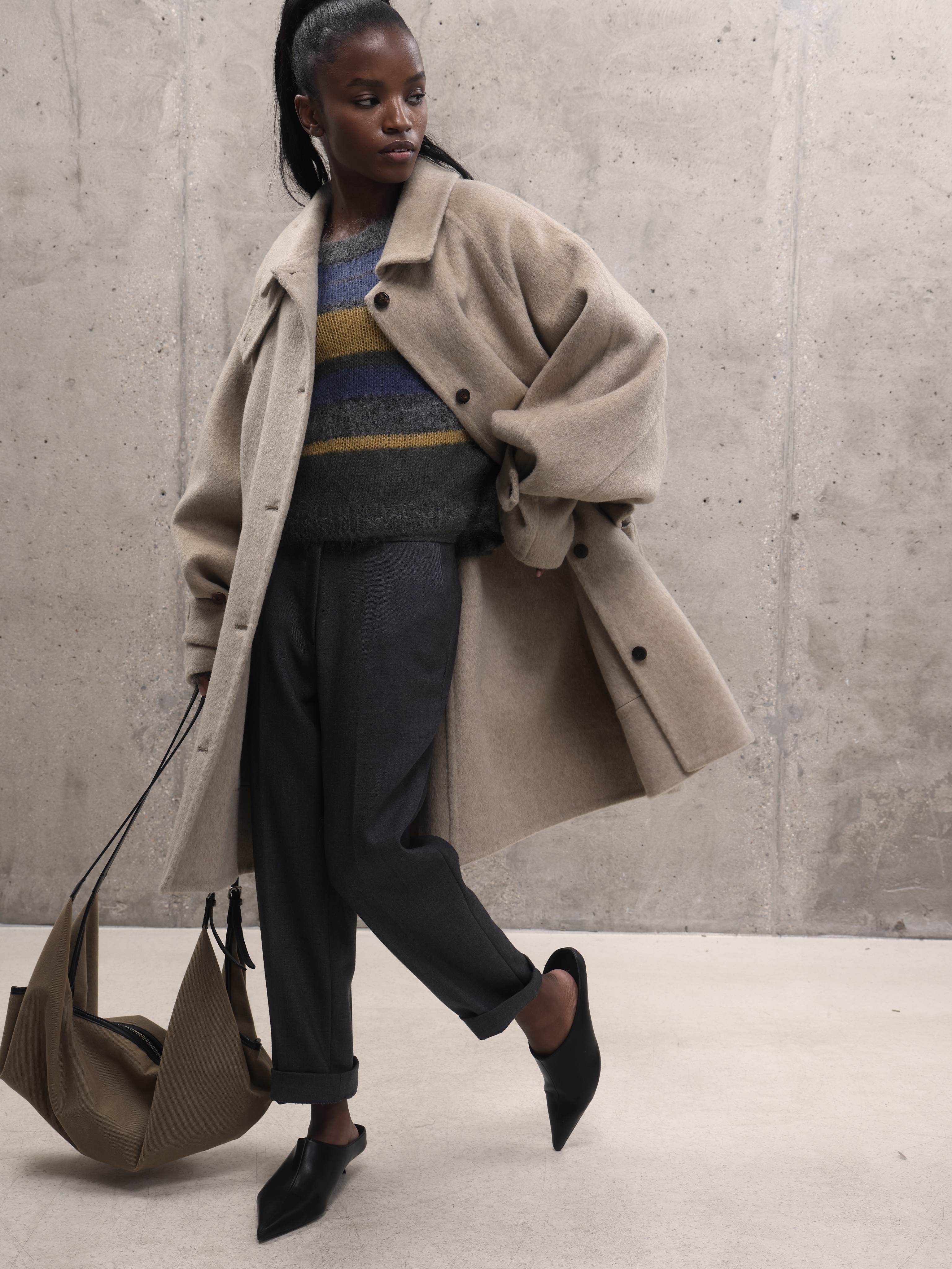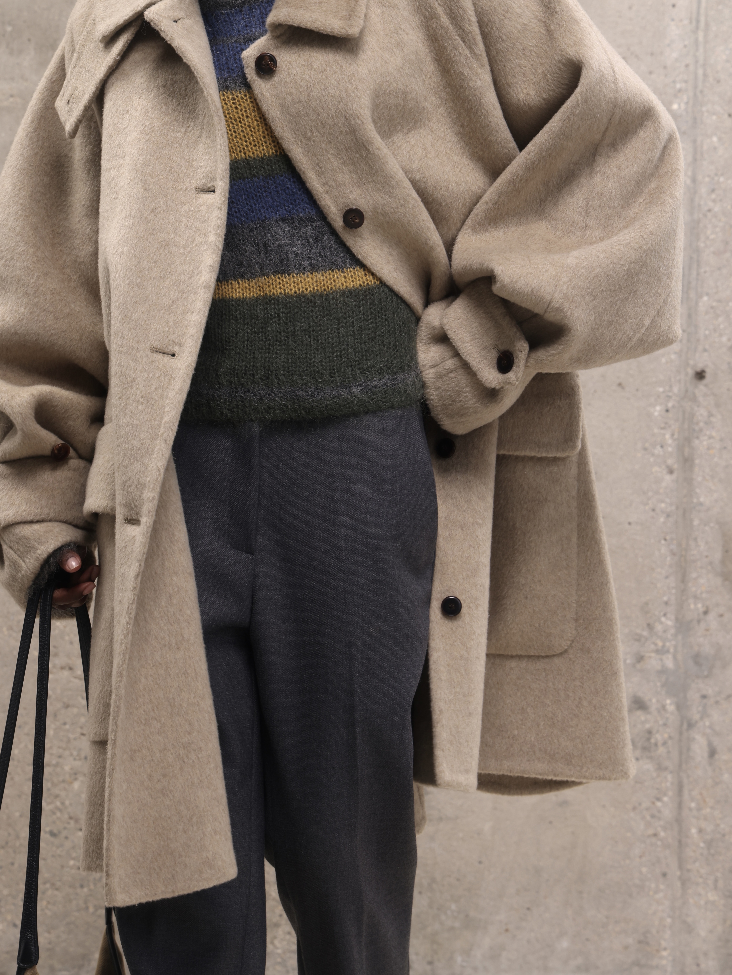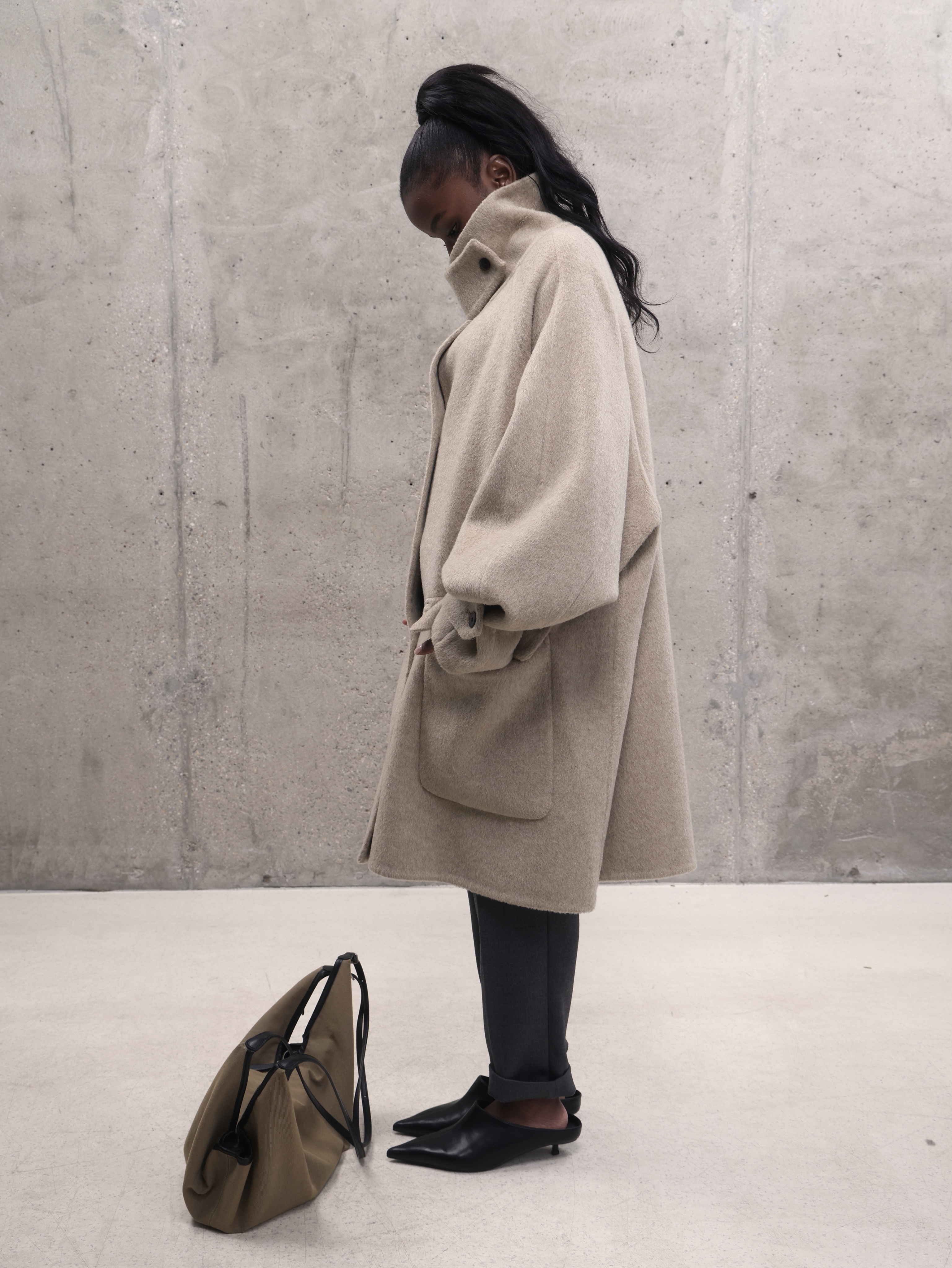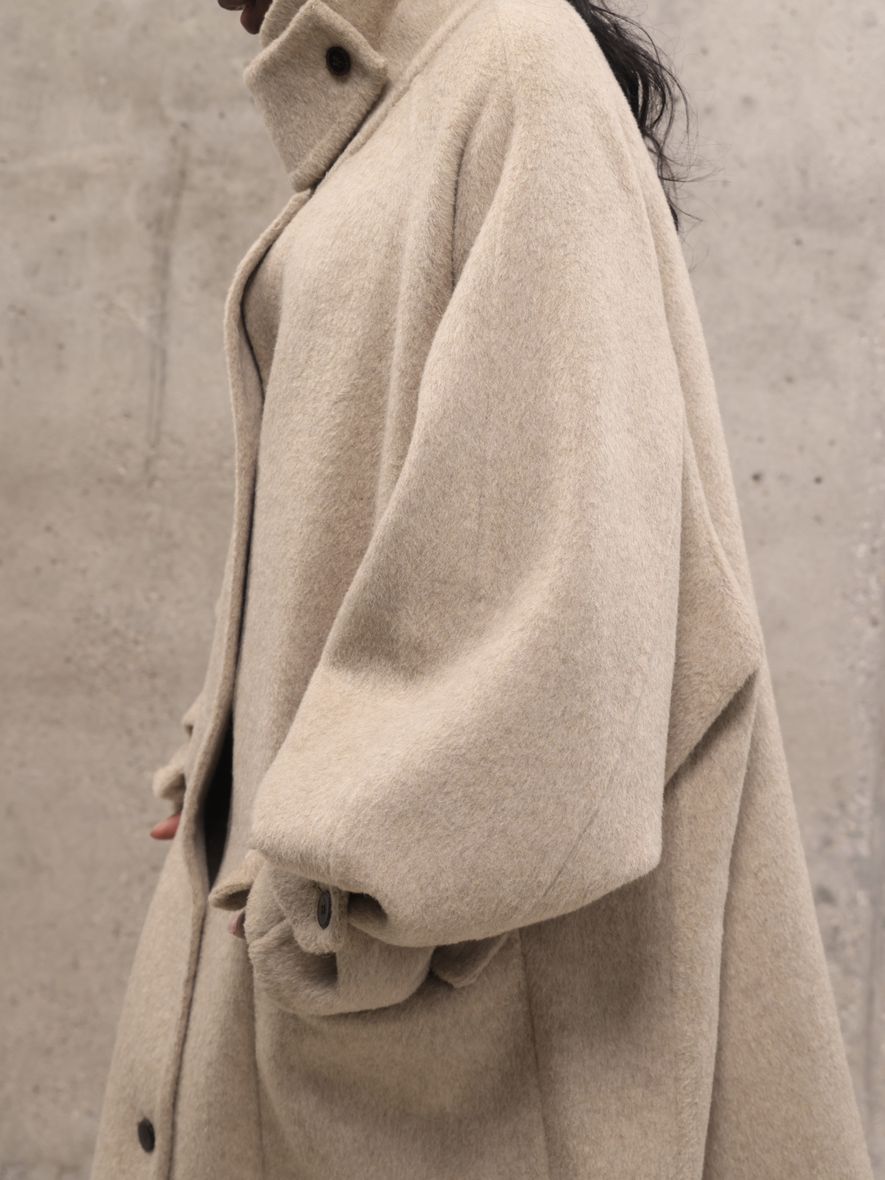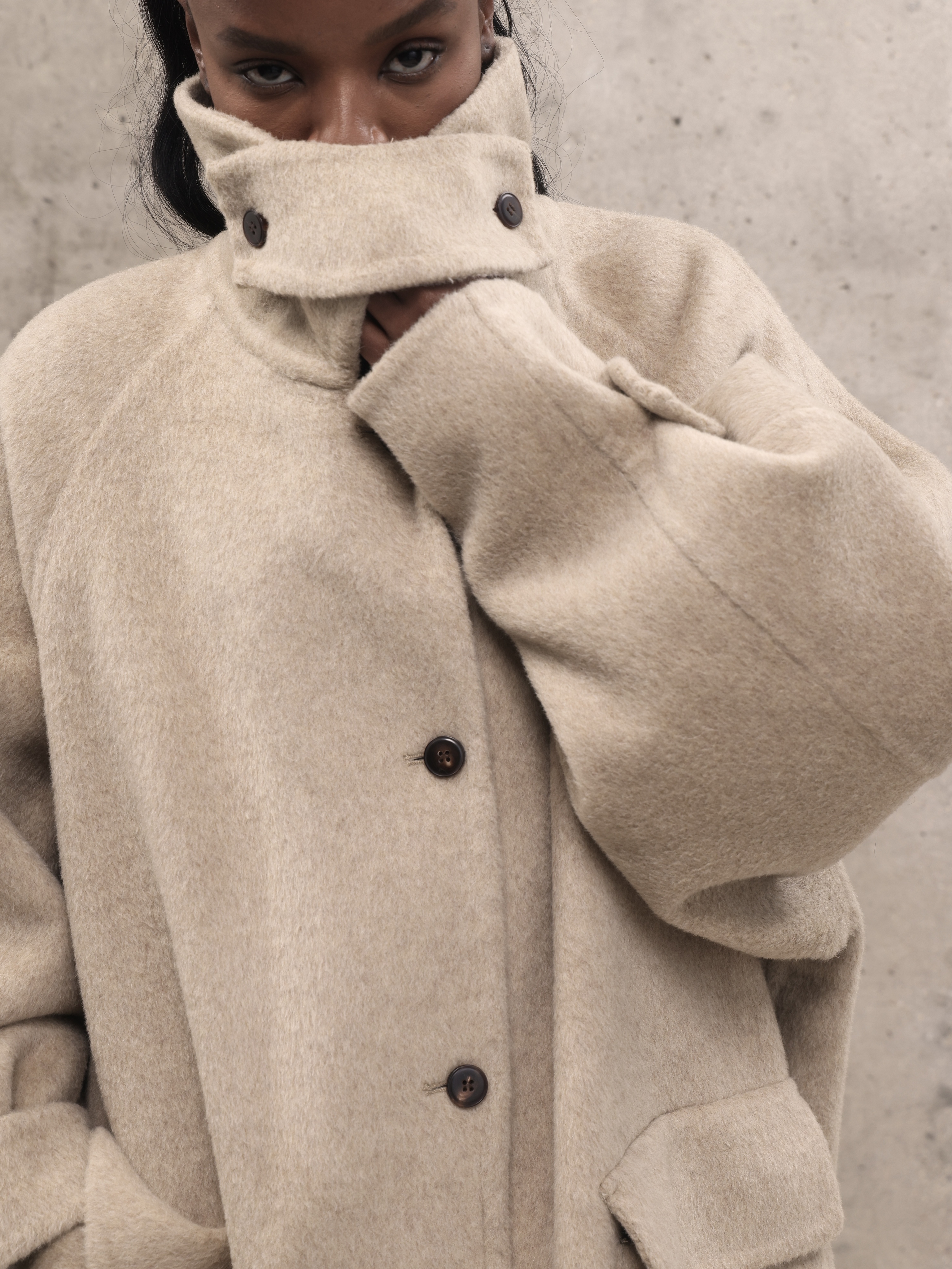 Шерстяное осеннее пальто бежевого цвета. Модель объемного кроя средней длины дополнена отложным воротником, который при необходимости можно поставить в стойку - и он защитит от ветра и непогоды.
