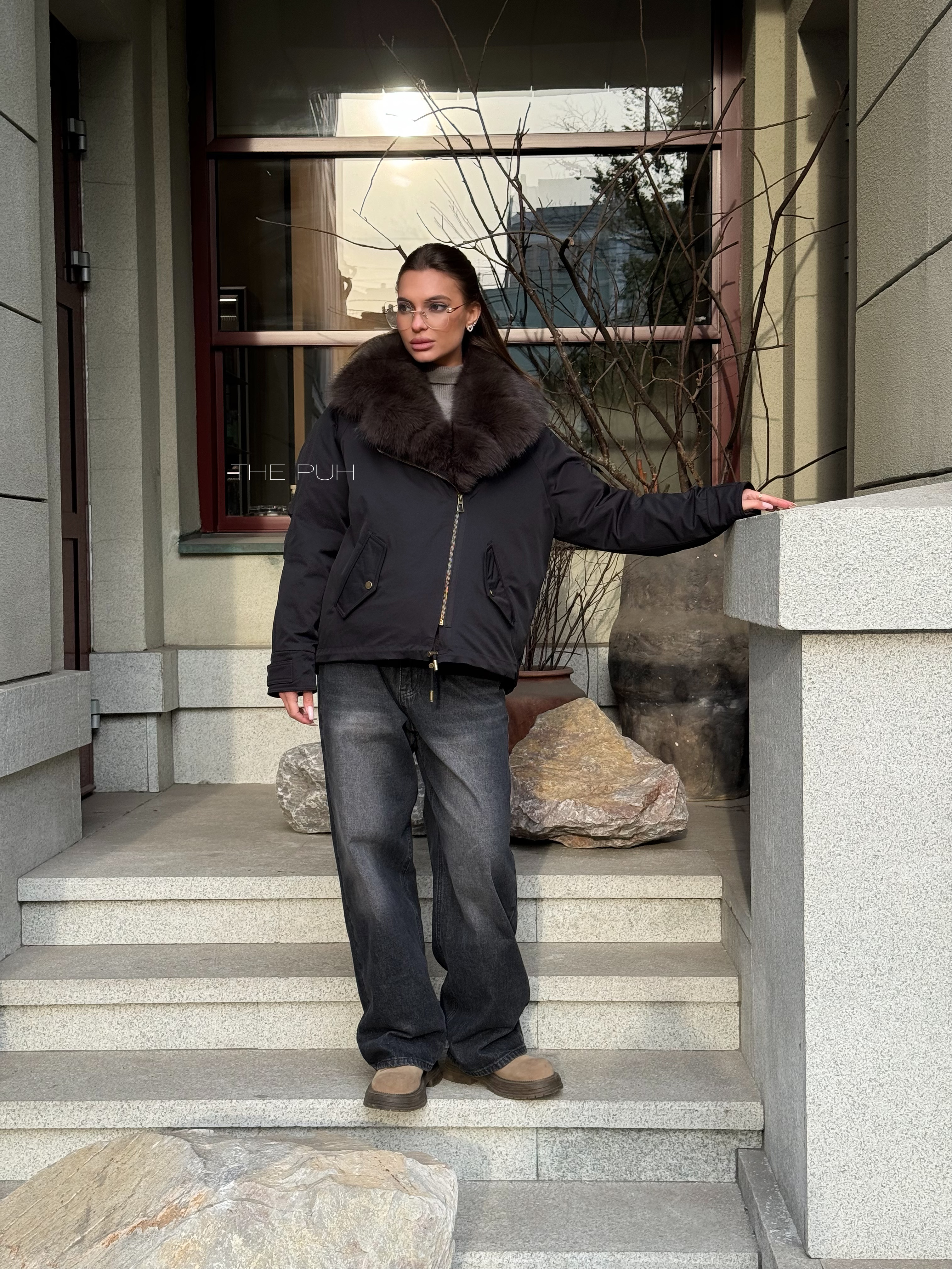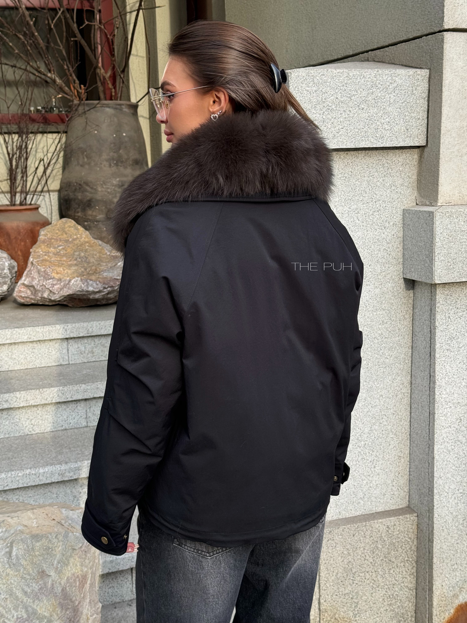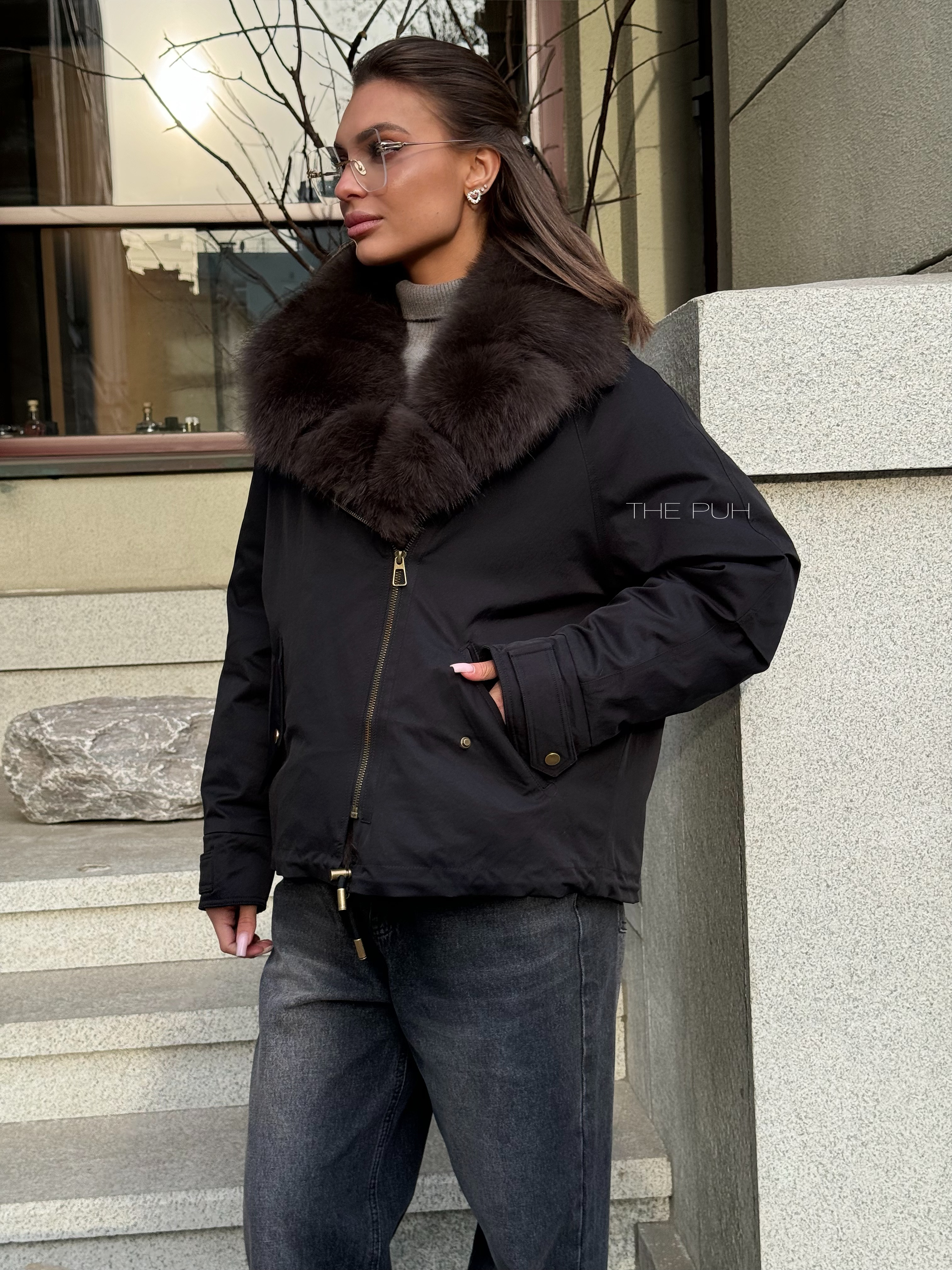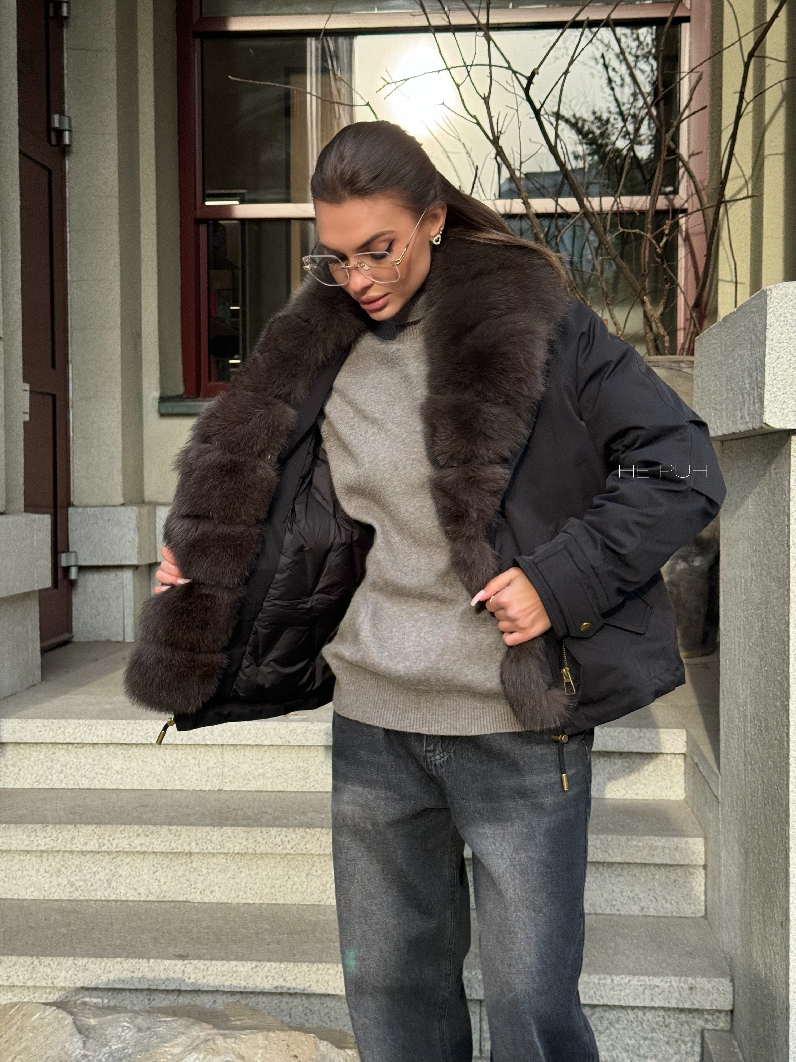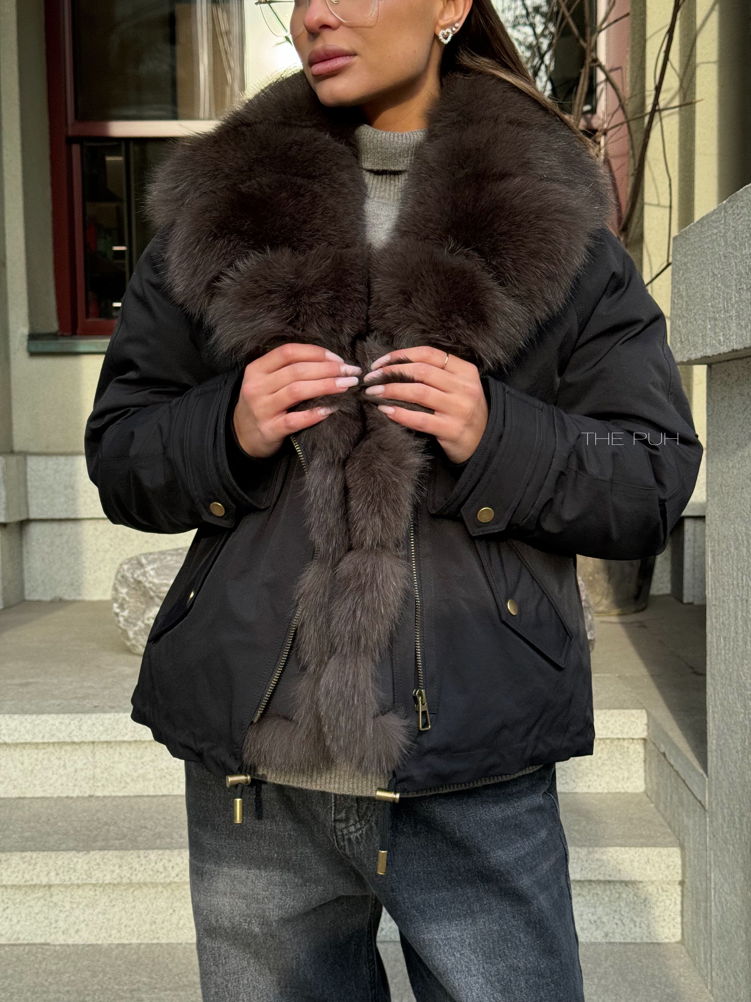 Короткая черная парка с утеплителем из натурального пуха и съемным меховым воротником из песца.