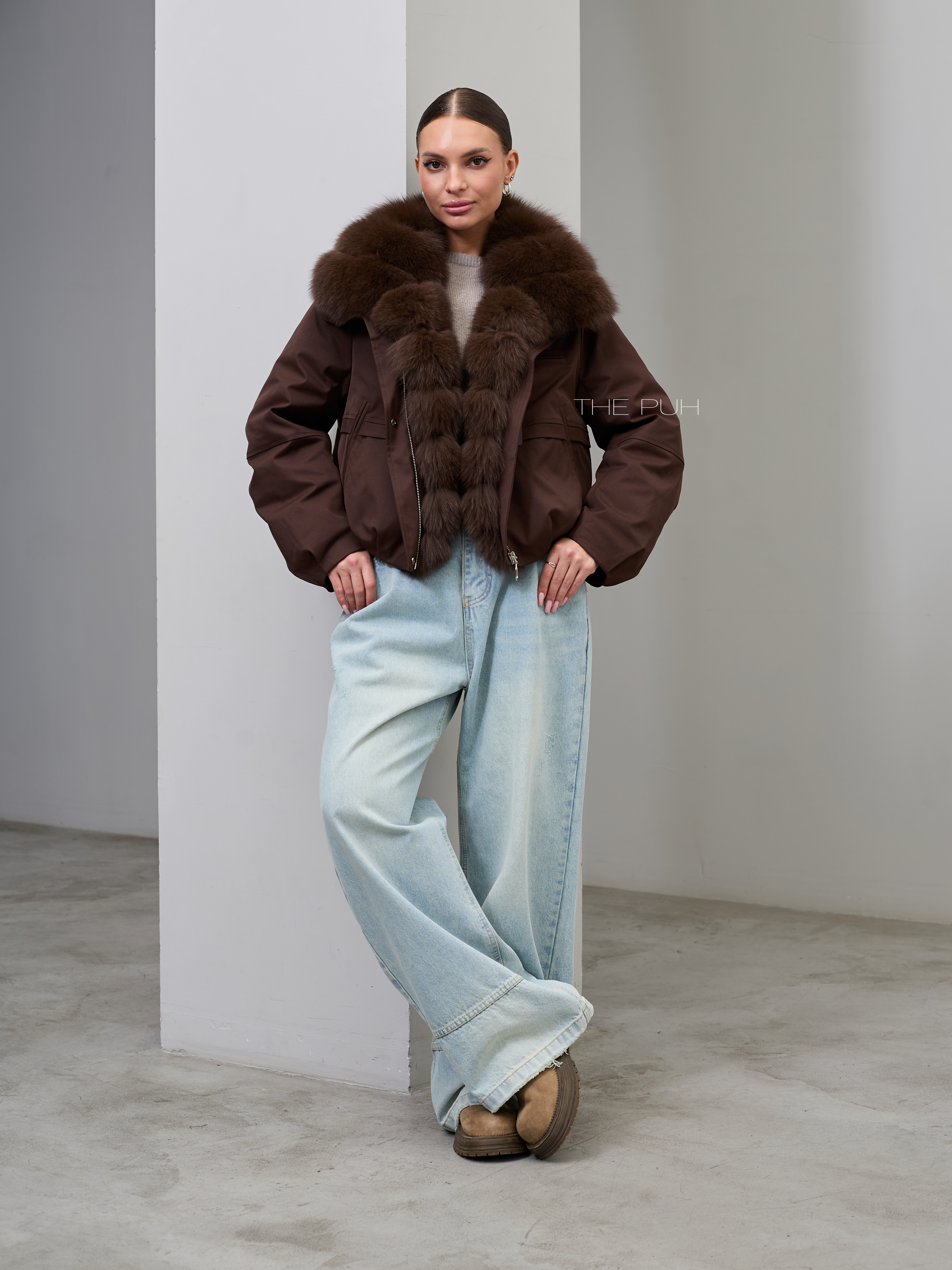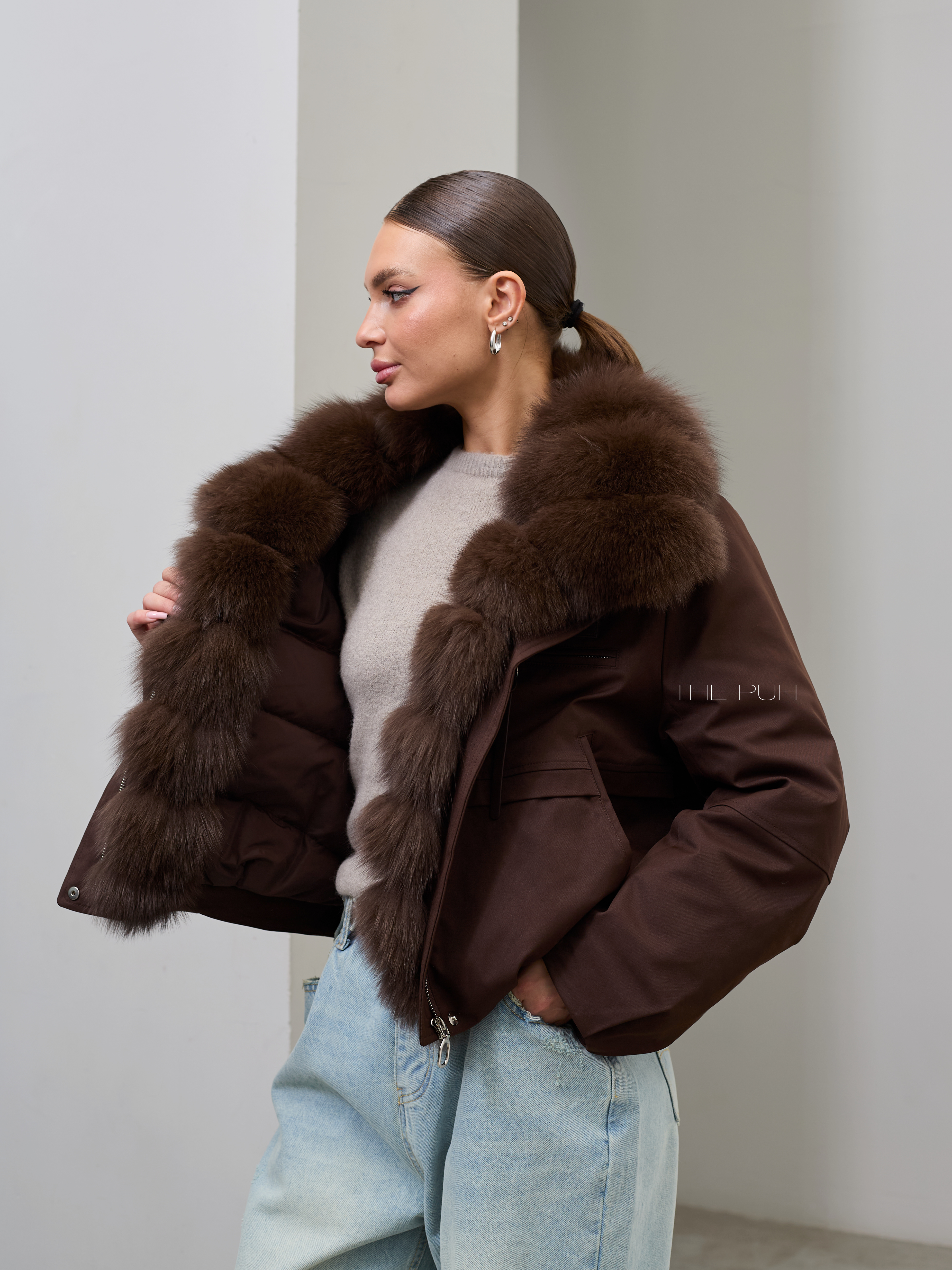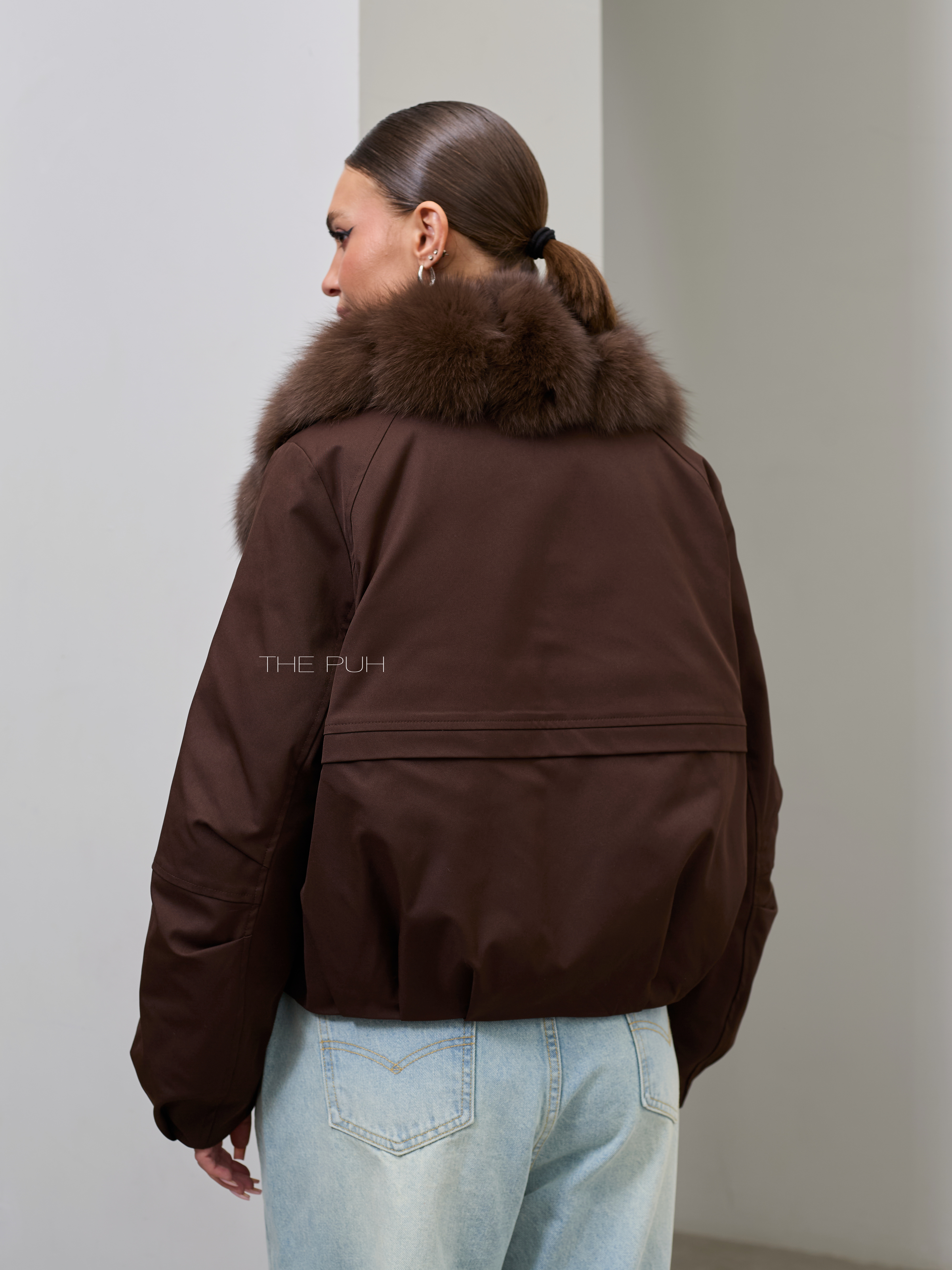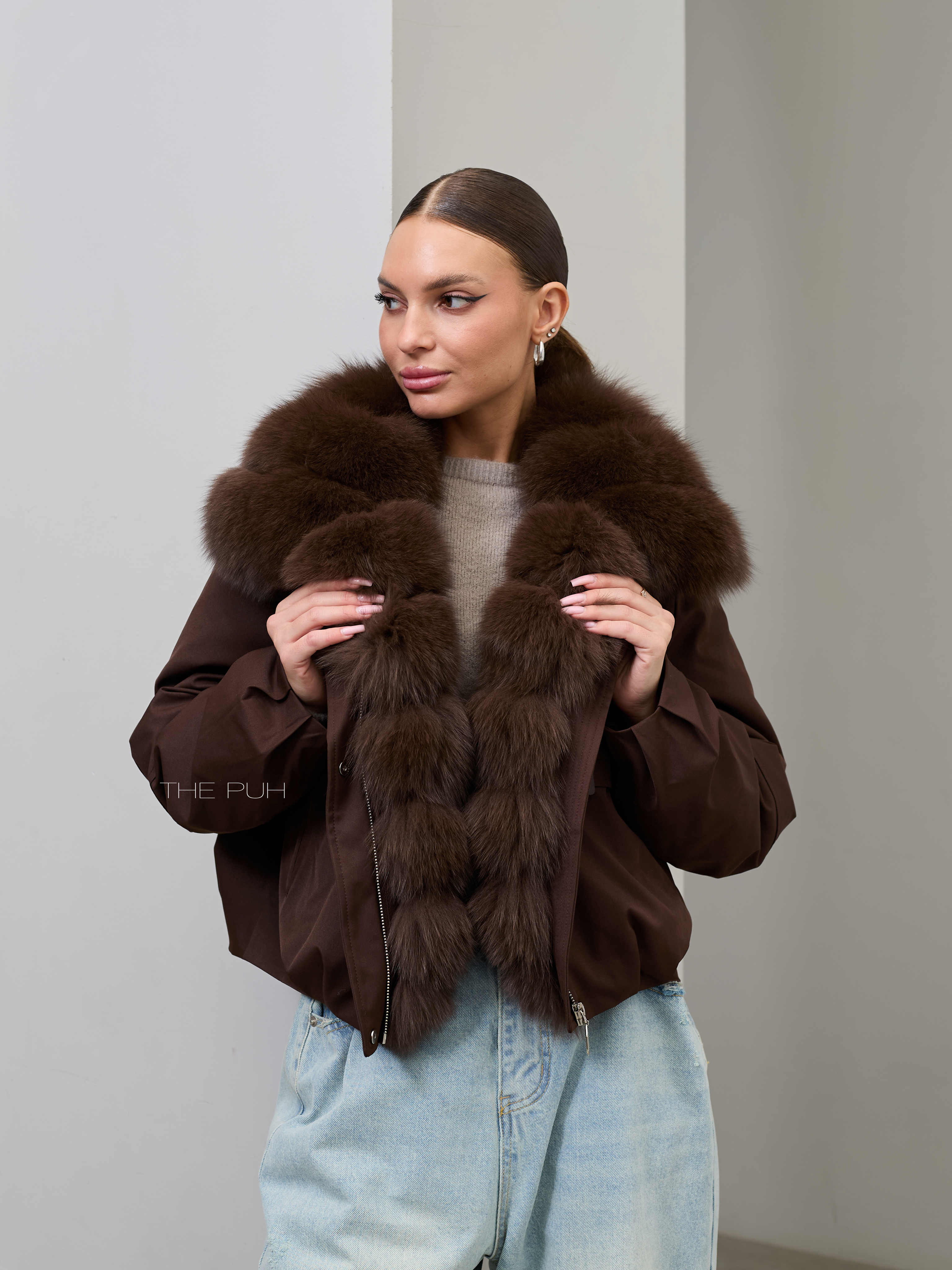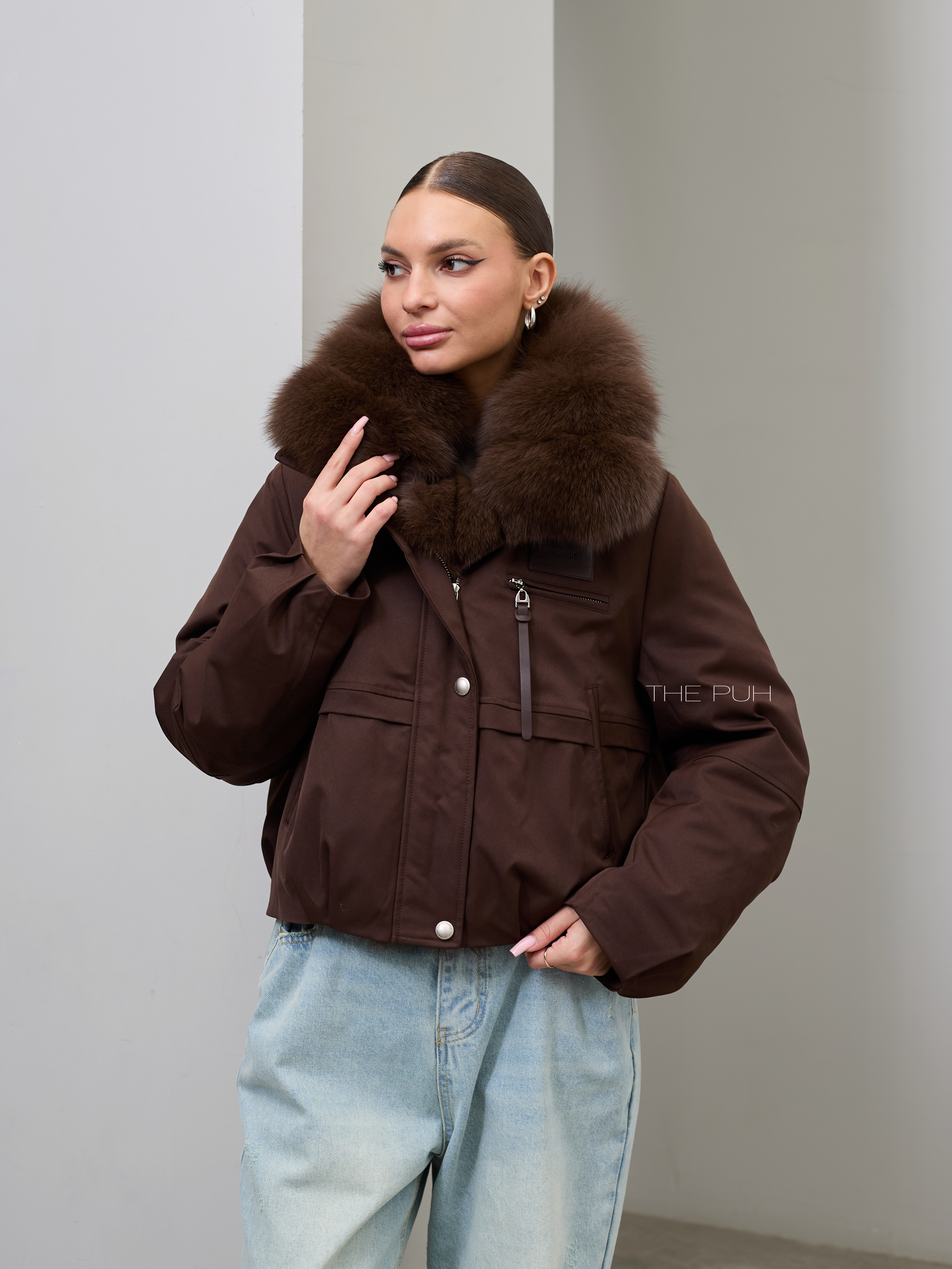 Короткая шоколадная парка с утеплителем из натурального пуха и съемным меховым воротником из песца.