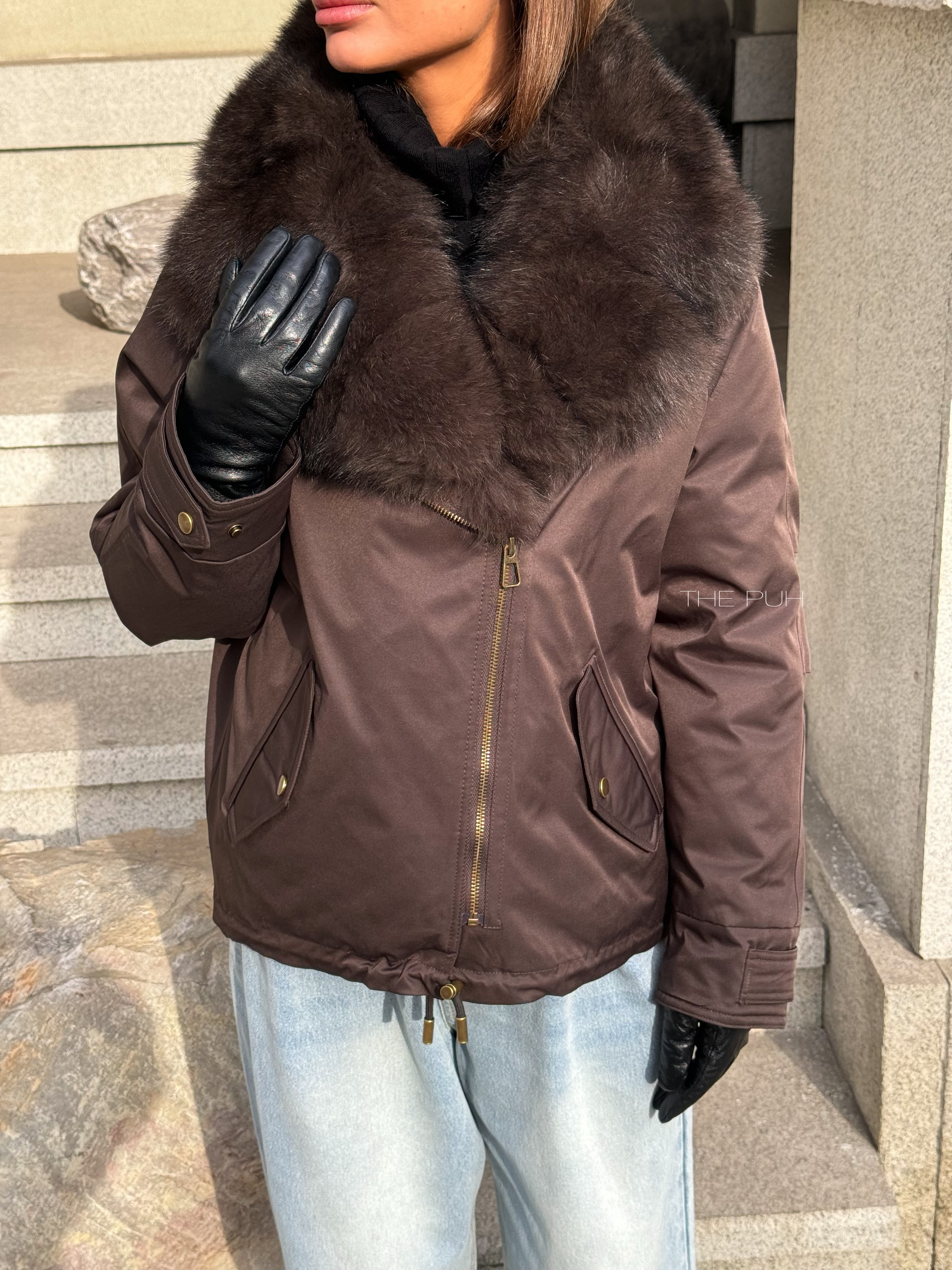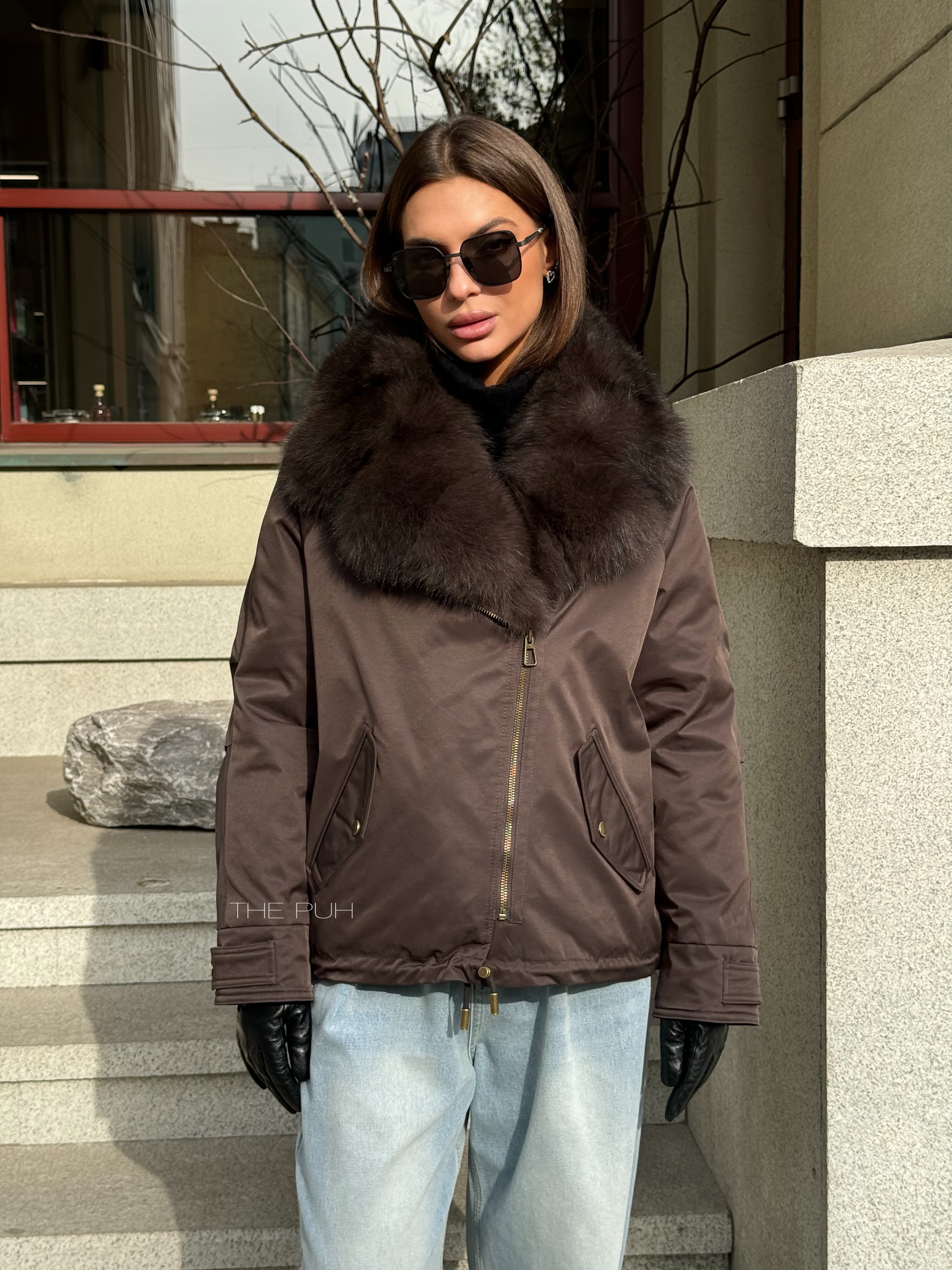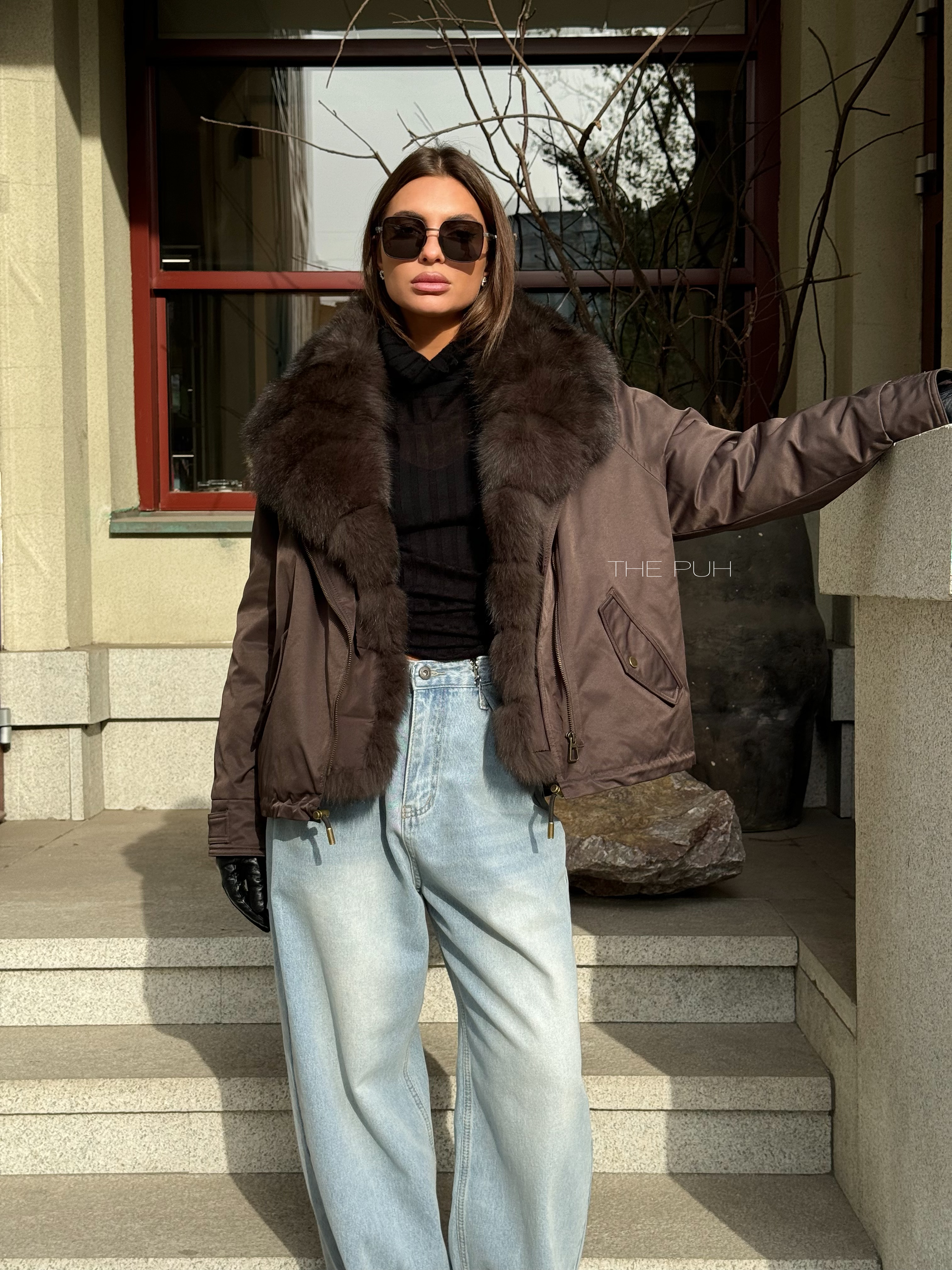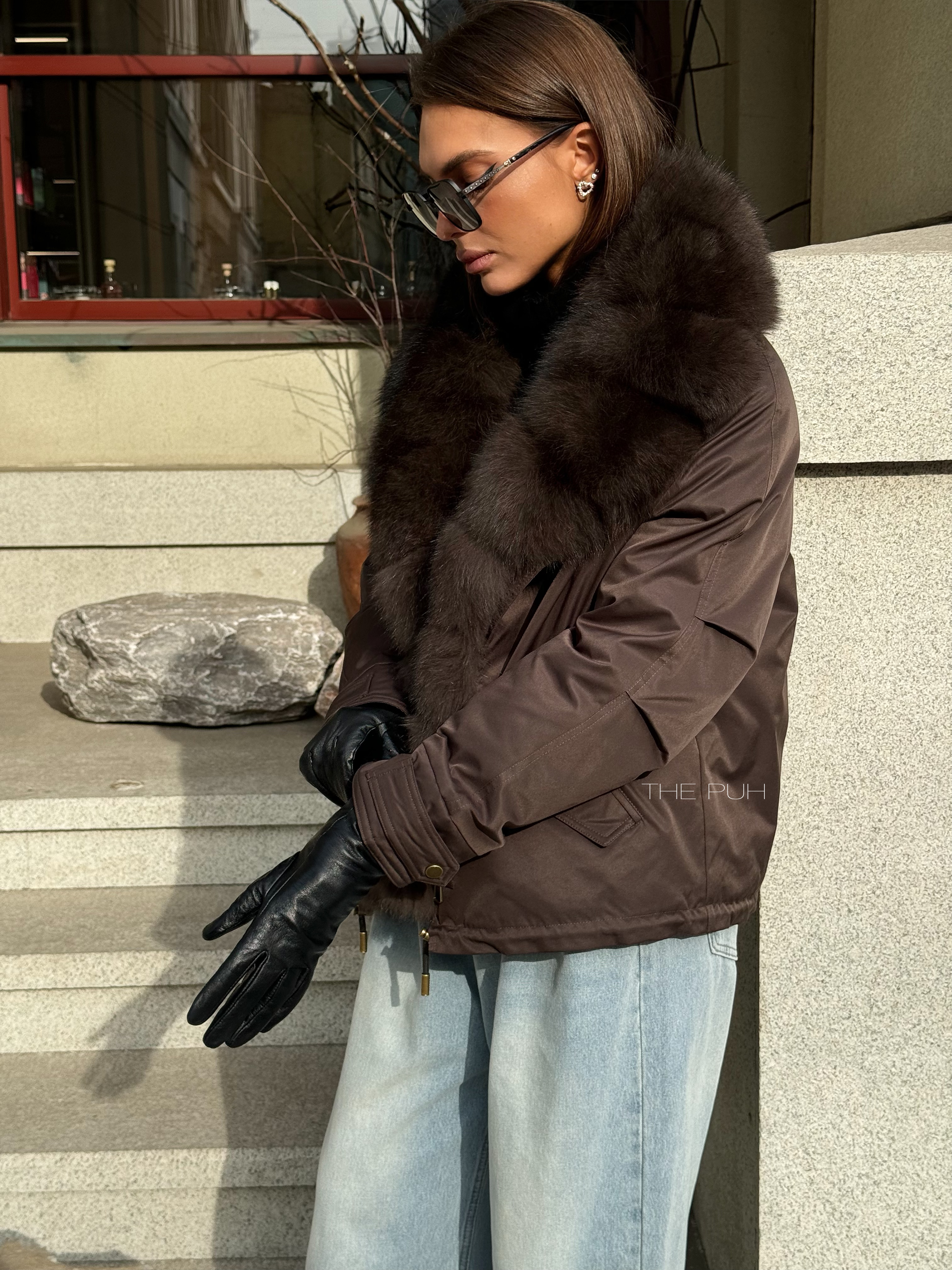Короткая шоколадная парка с утеплителем из натурального пуха и съемным меховым воротником из песца.