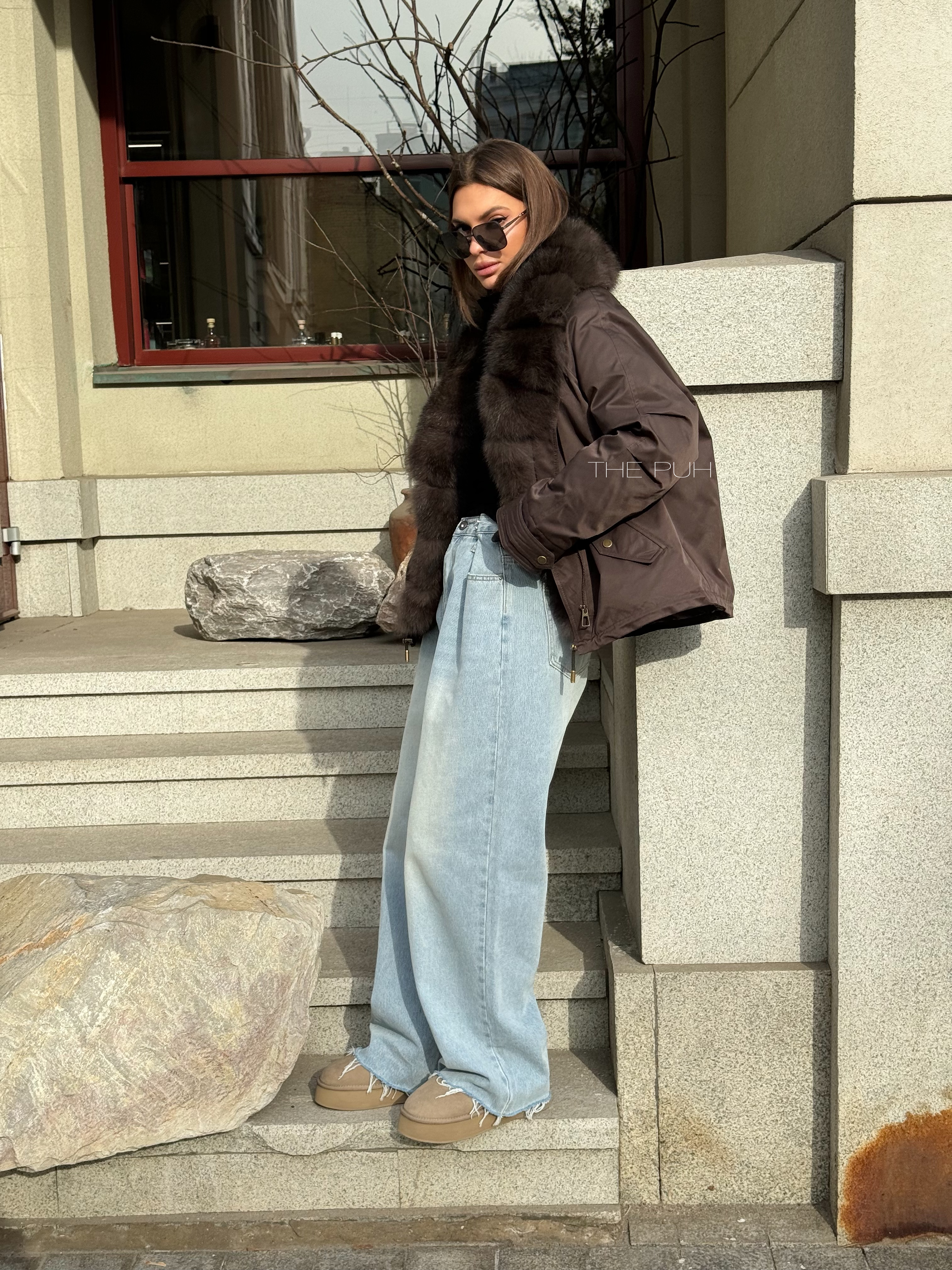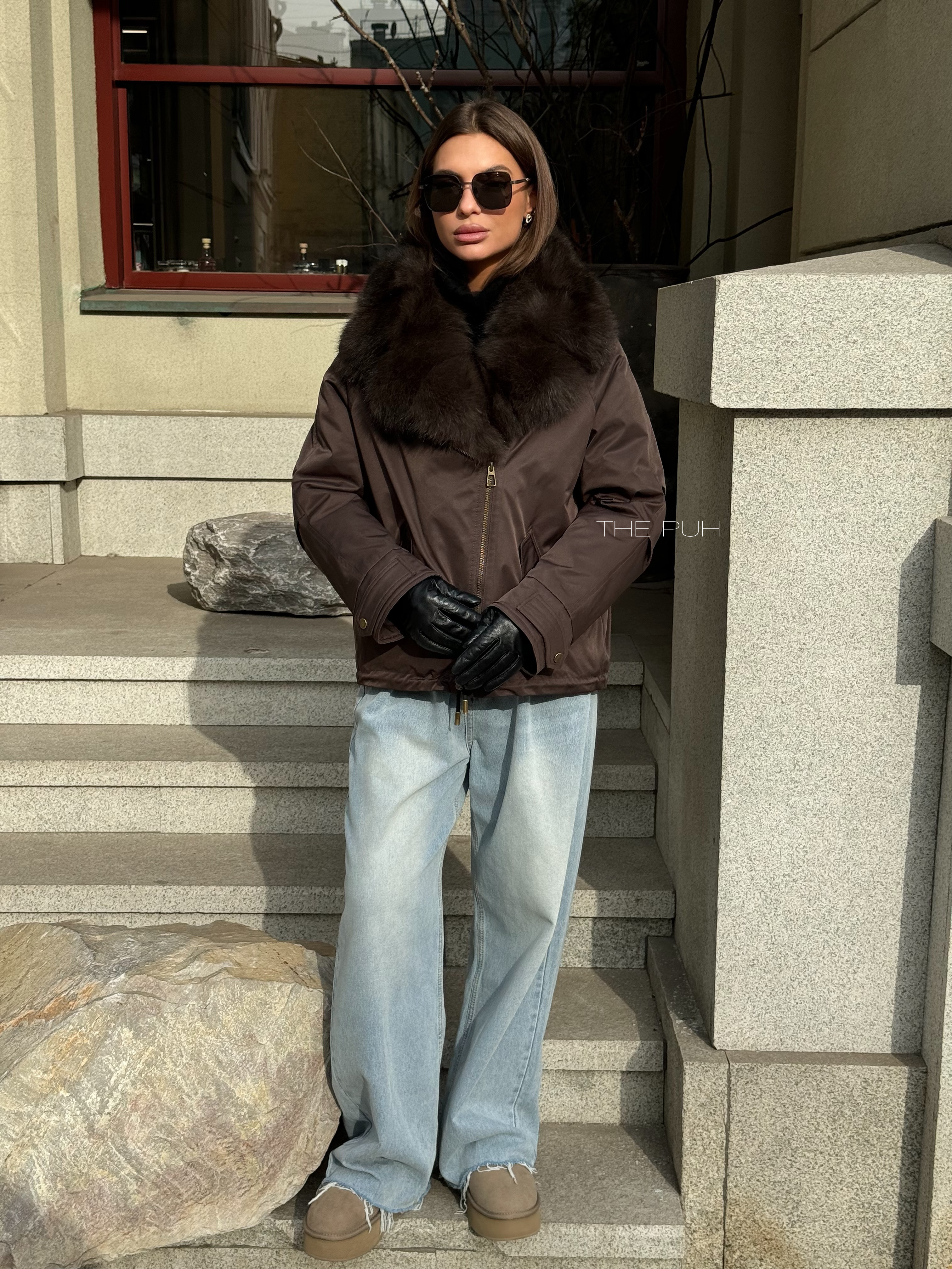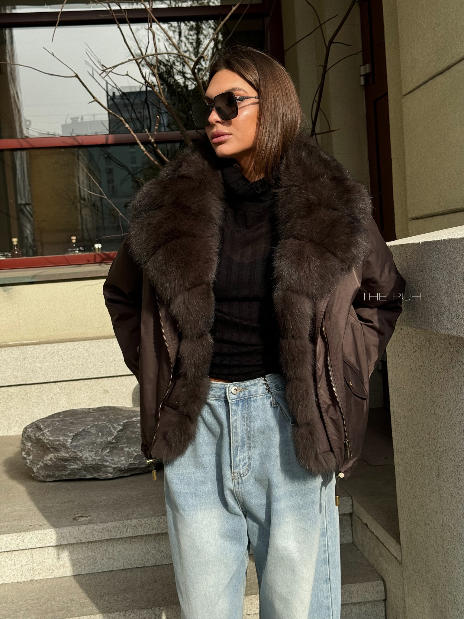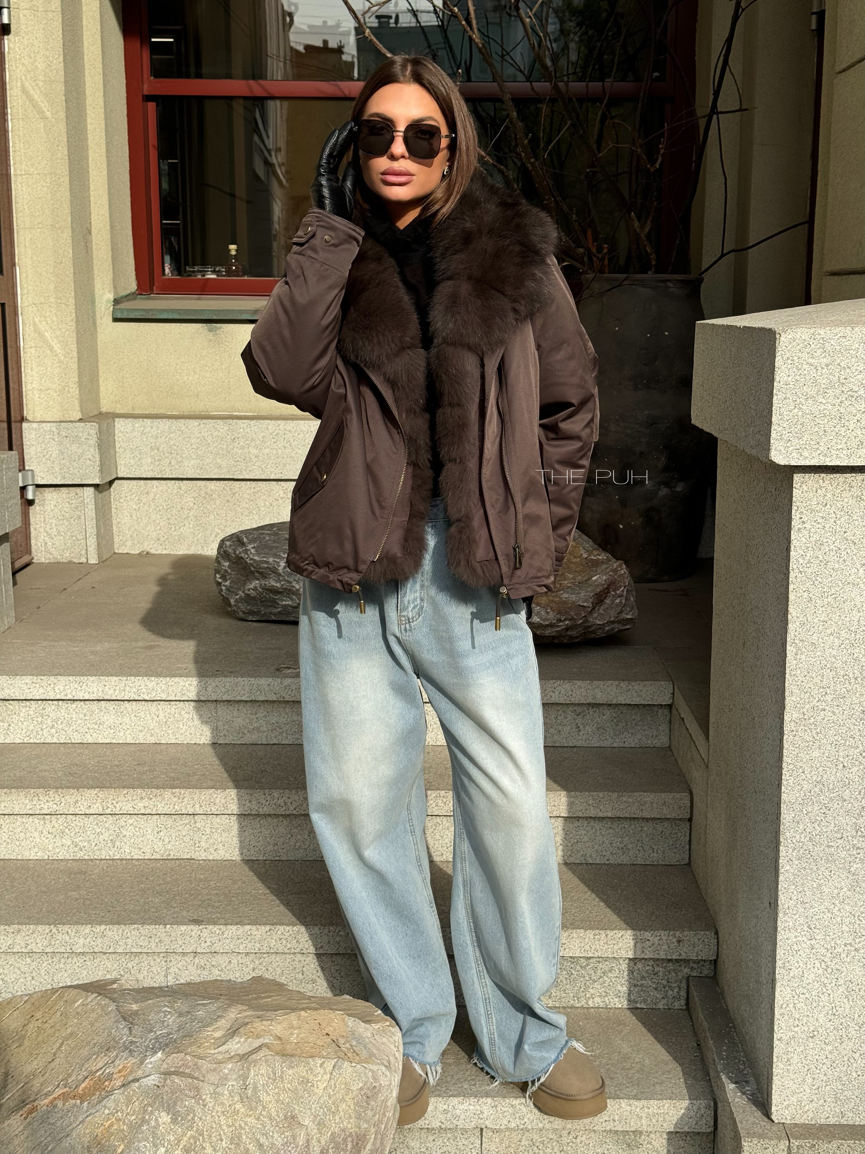 Короткая шоколадная парка с утеплителем из натурального пуха и съемным меховым воротником из песца.