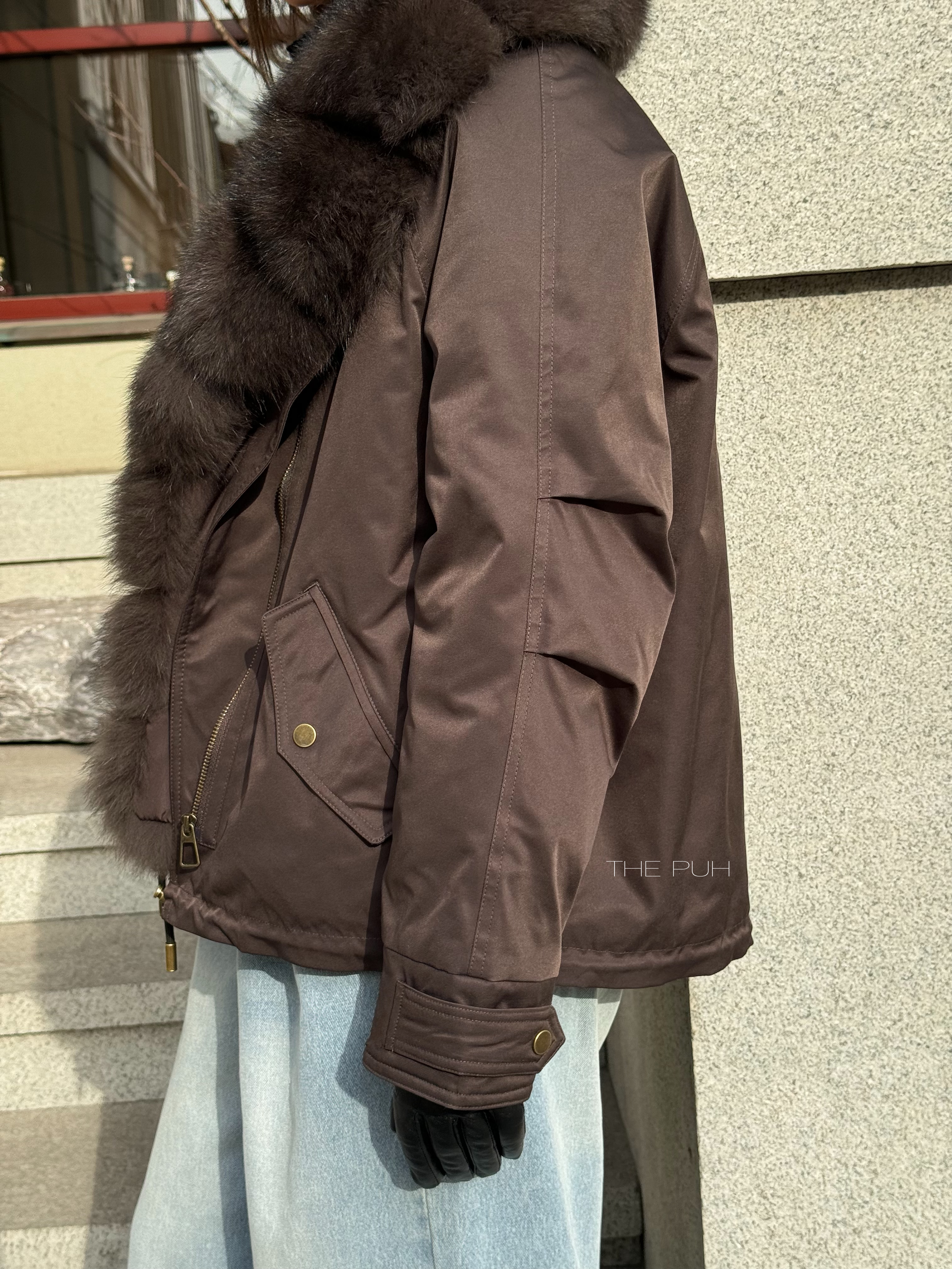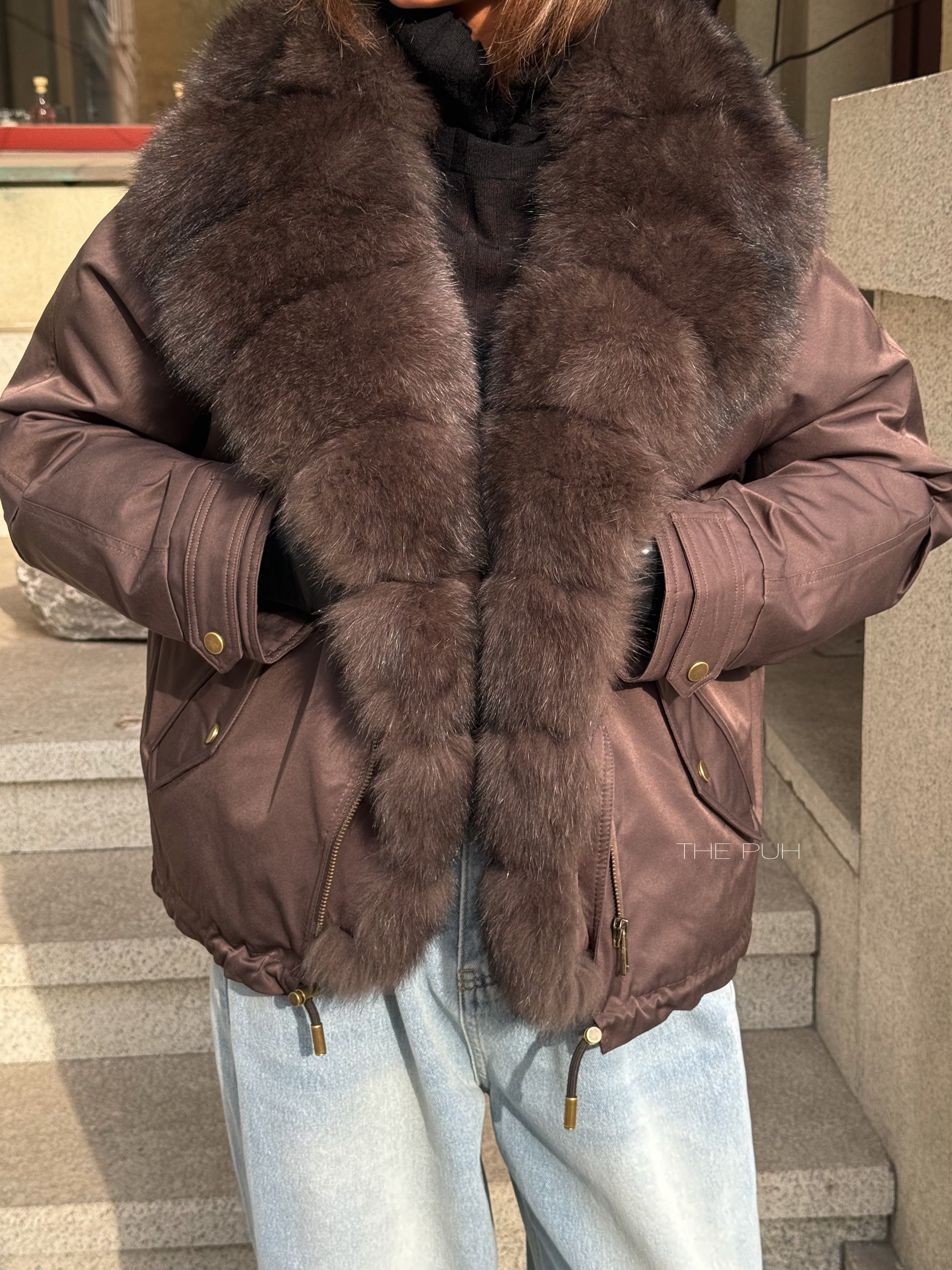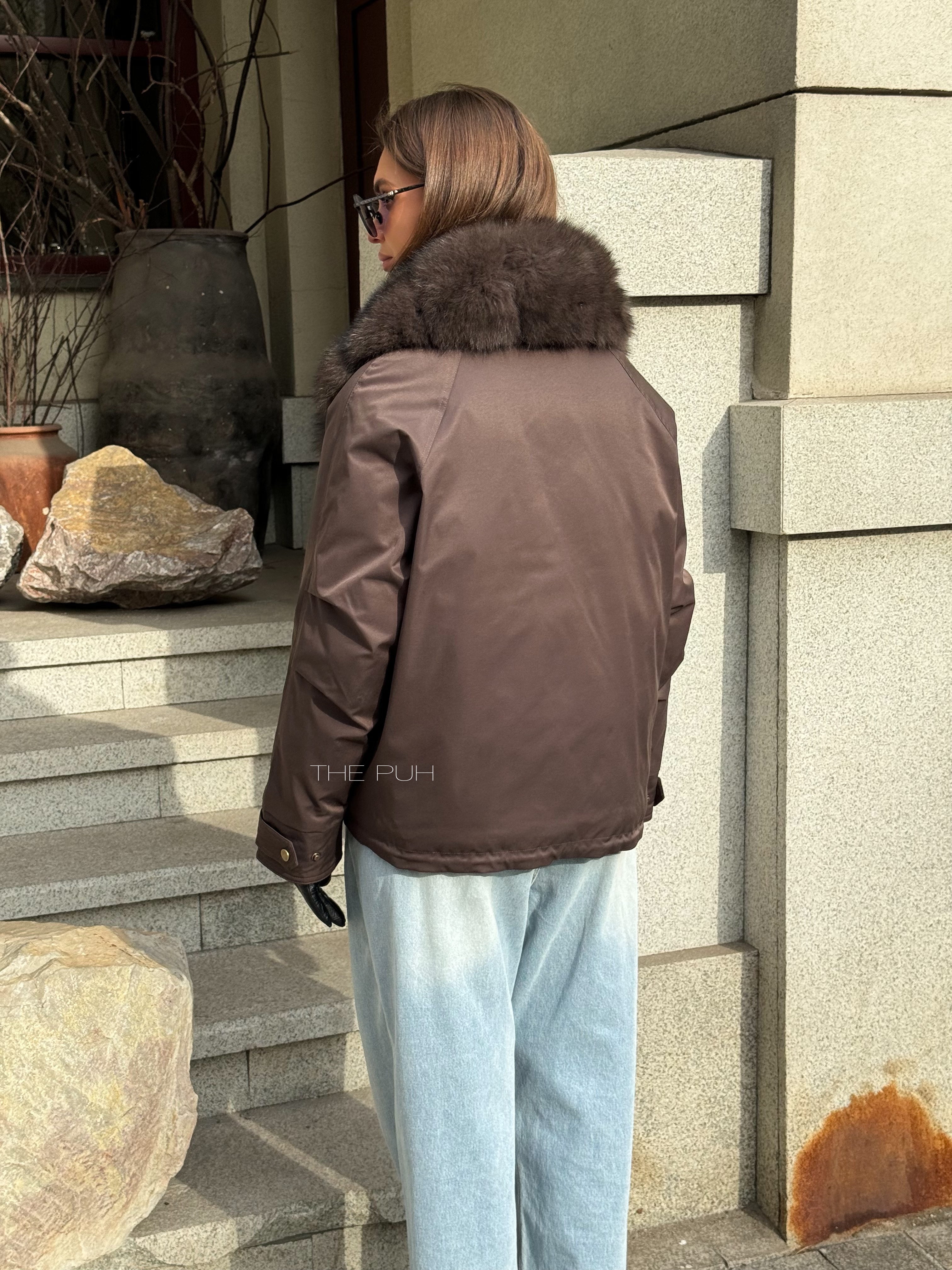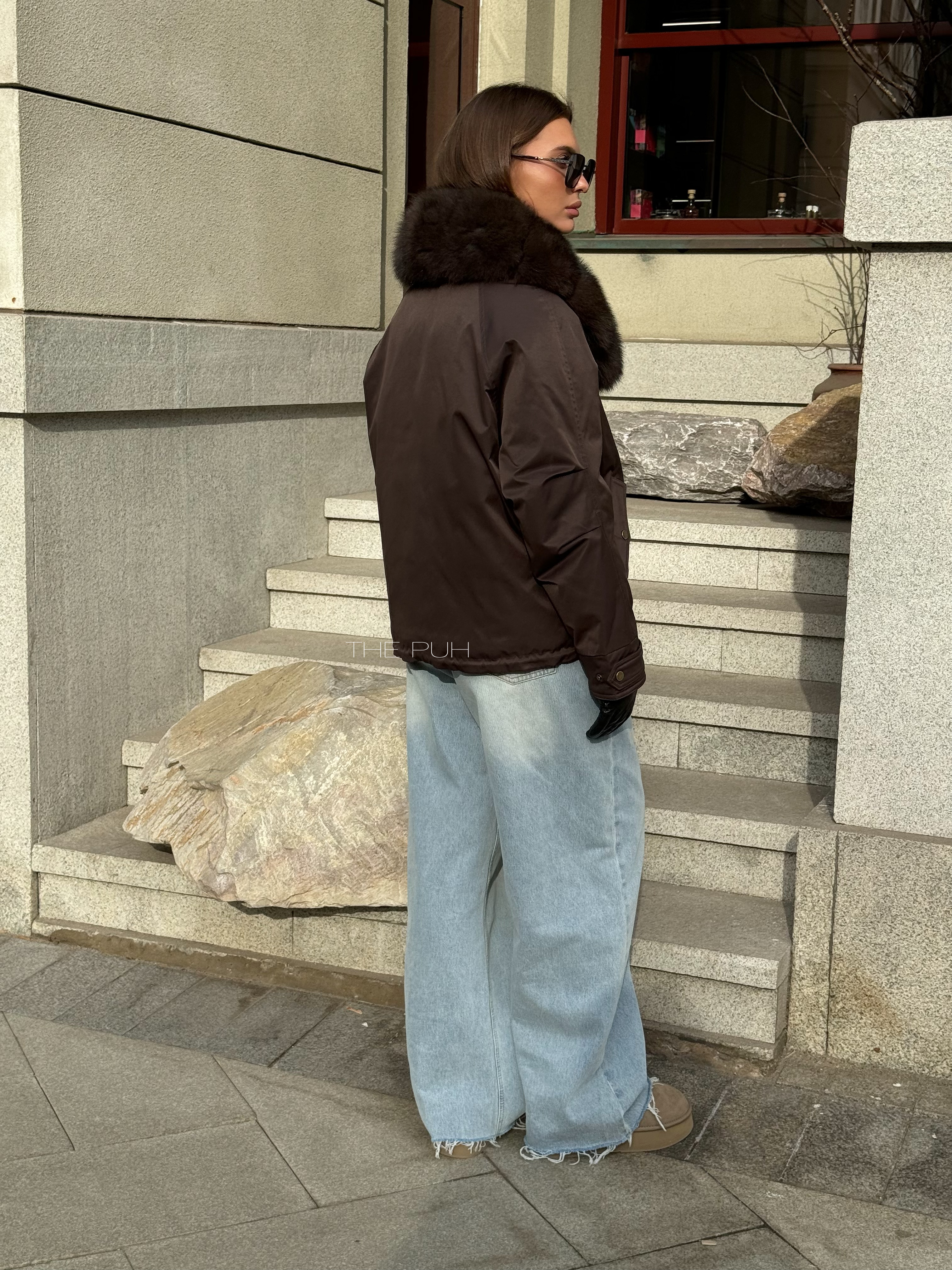 Короткая шоколадная парка с утеплителем из натурального пуха и съемным меховым воротником из песца.