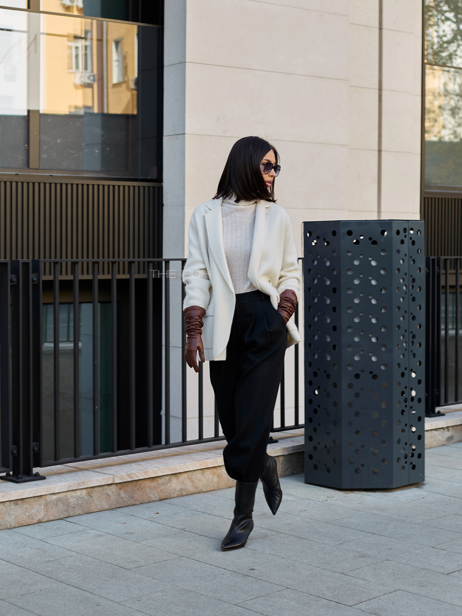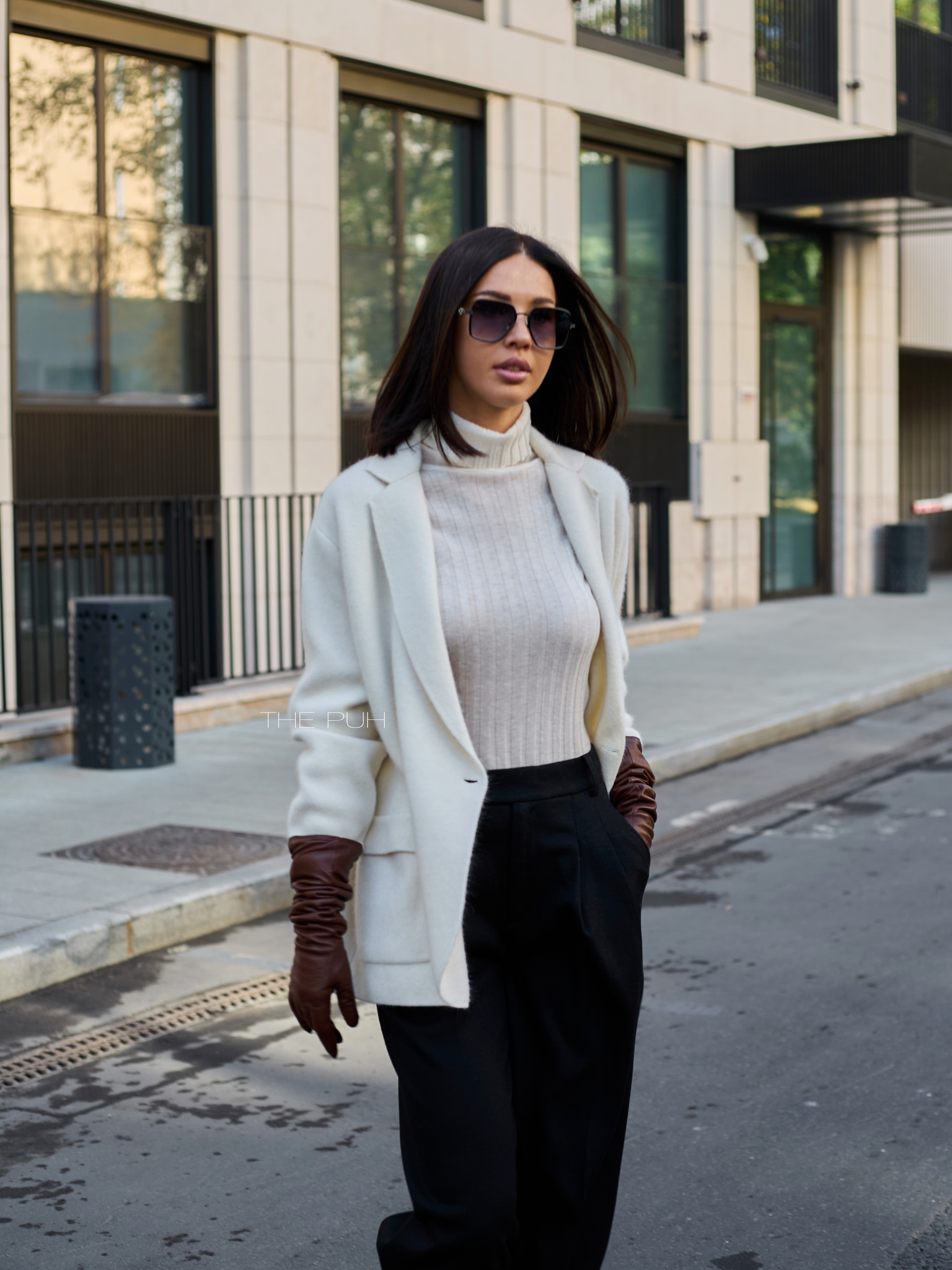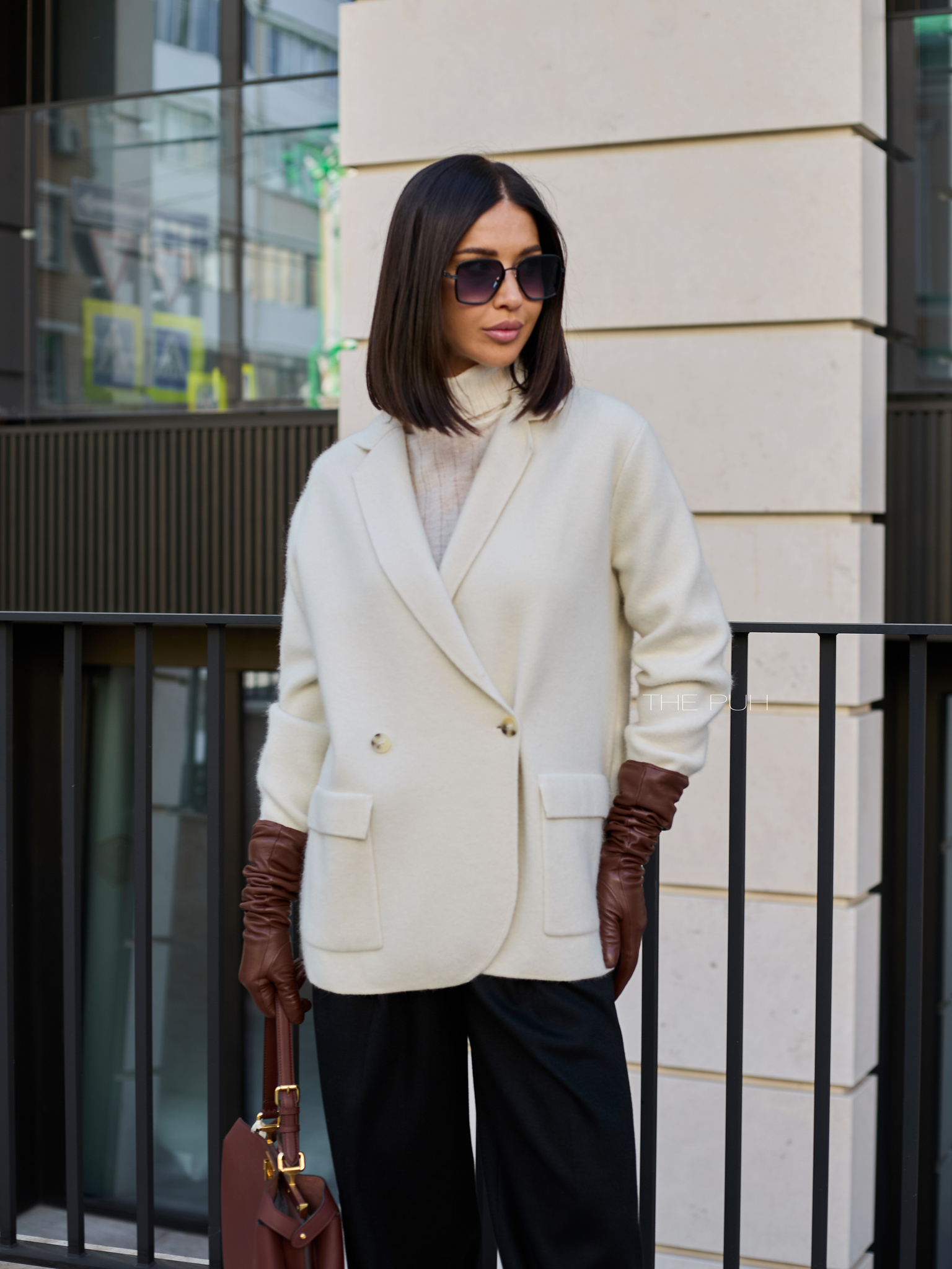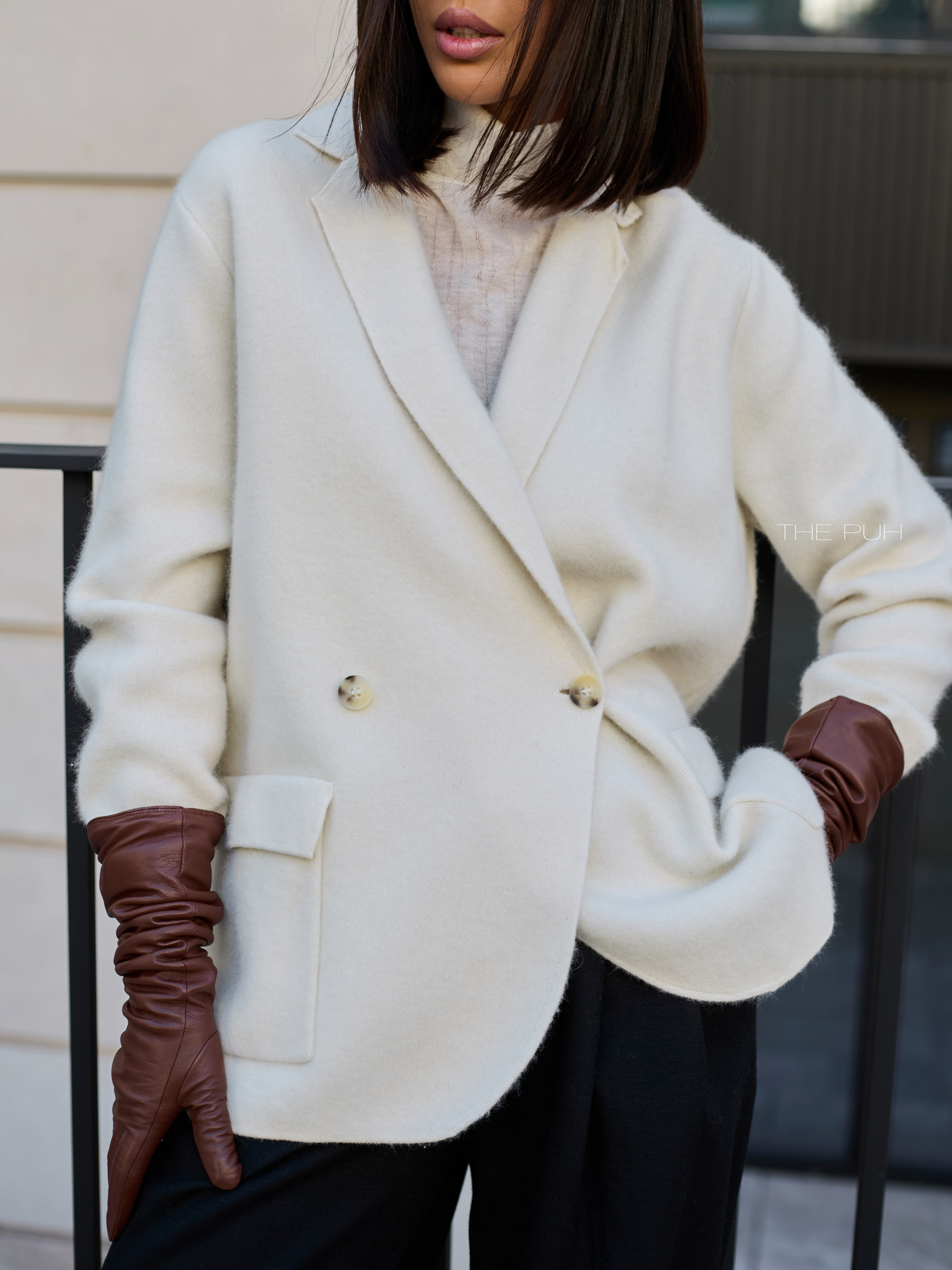 Свободный двубортный жакет на пуговицах выполнен из кашемира молочного цвета, который согреет даже в самые прохладные дни. Модель дополнена английским воротником и застегивается на 2 пуговицы. Такой жакет станет незаменимым спутником как в повседневной жизни, так и на особых мероприятиях – он прекрасно сочетается со всем гардеробом от джинсов до вечерних платьев.