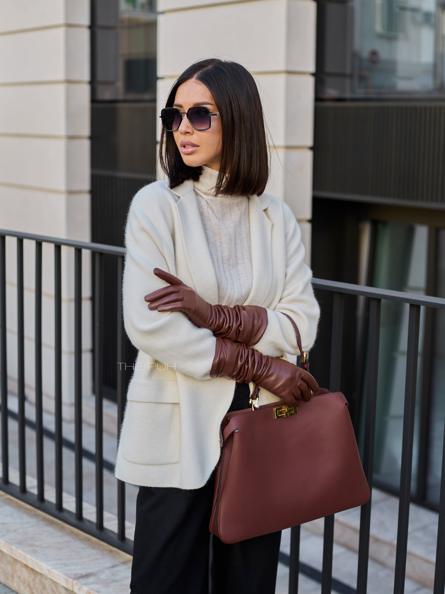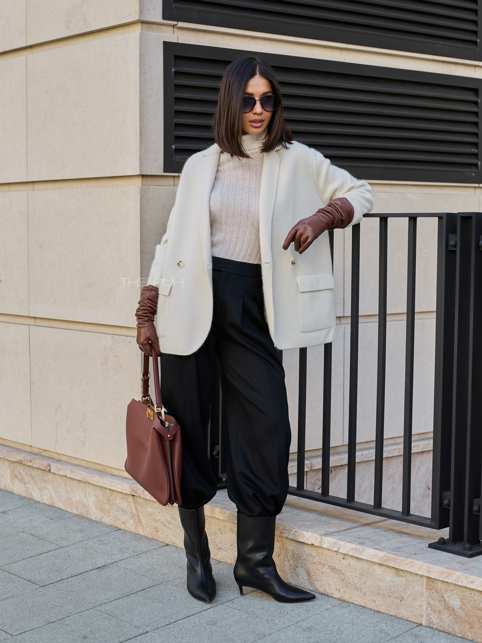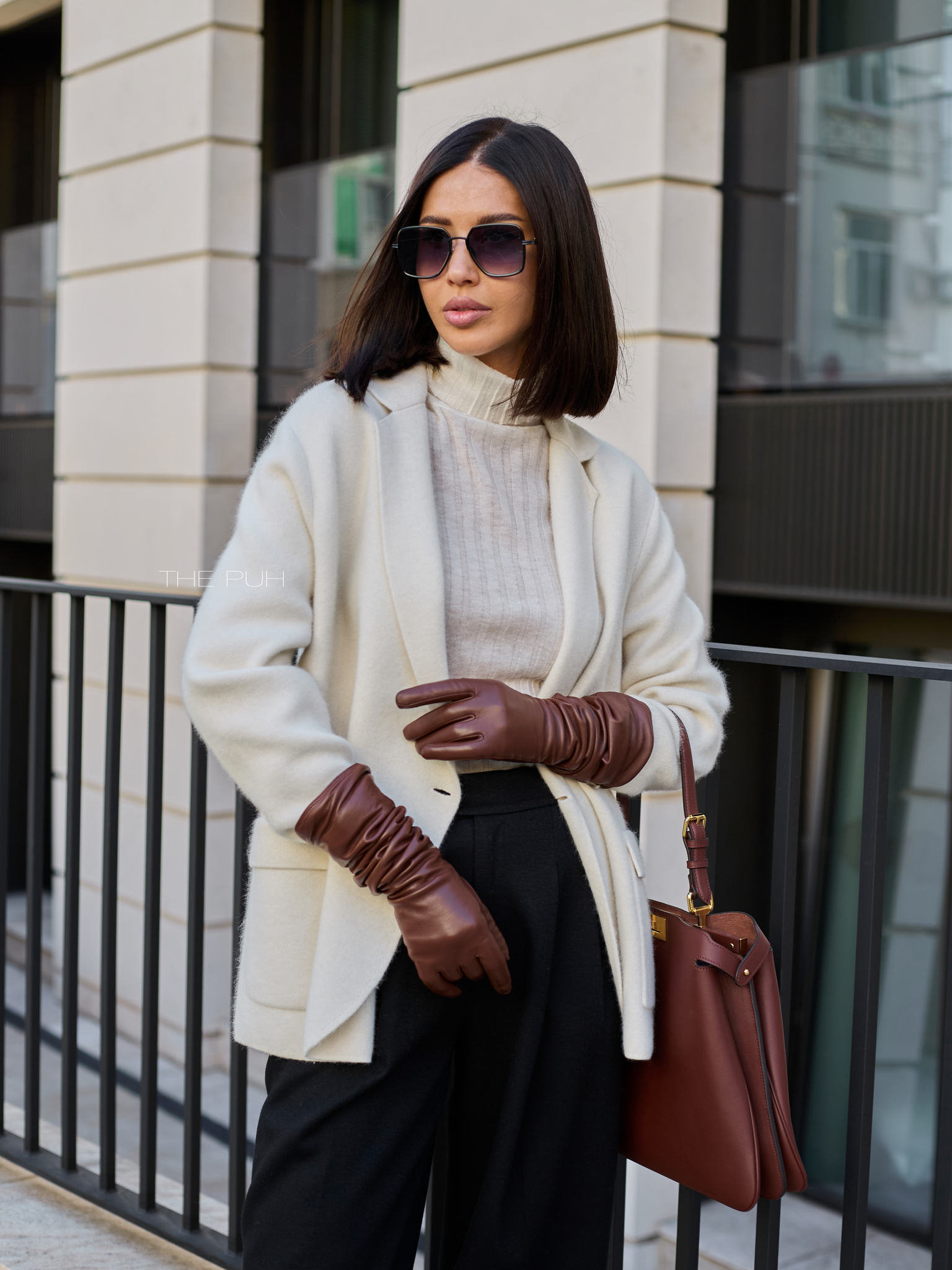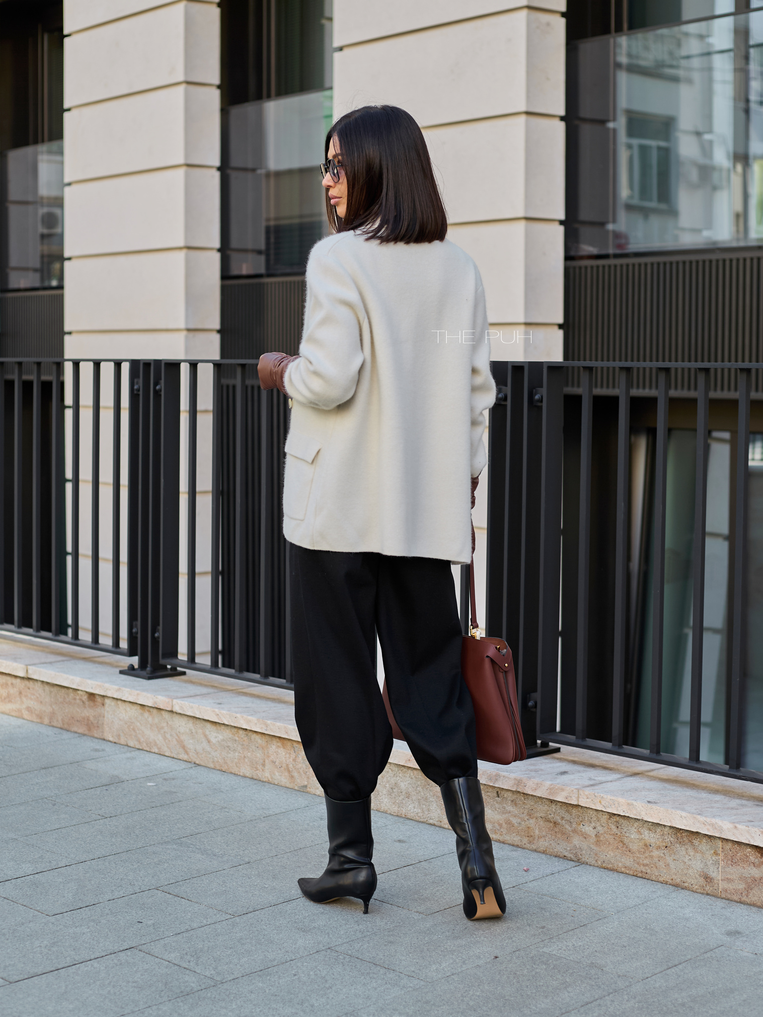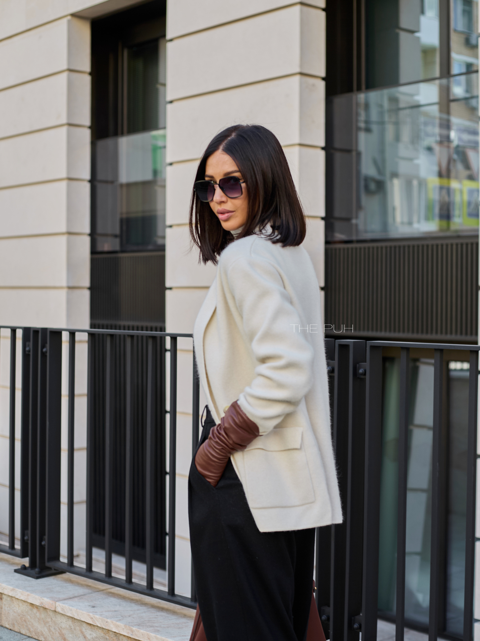 Свободный двубортный жакет на пуговицах выполнен из кашемира молочного цвета, который согреет даже в самые прохладные дни. Модель дополнена английским воротником и застегивается на 2 пуговицы. Такой жакет станет незаменимым спутником как в повседневной жизни, так и на особых мероприятиях – он прекрасно сочетается со всем гардеробом от джинсов до вечерних платьев.