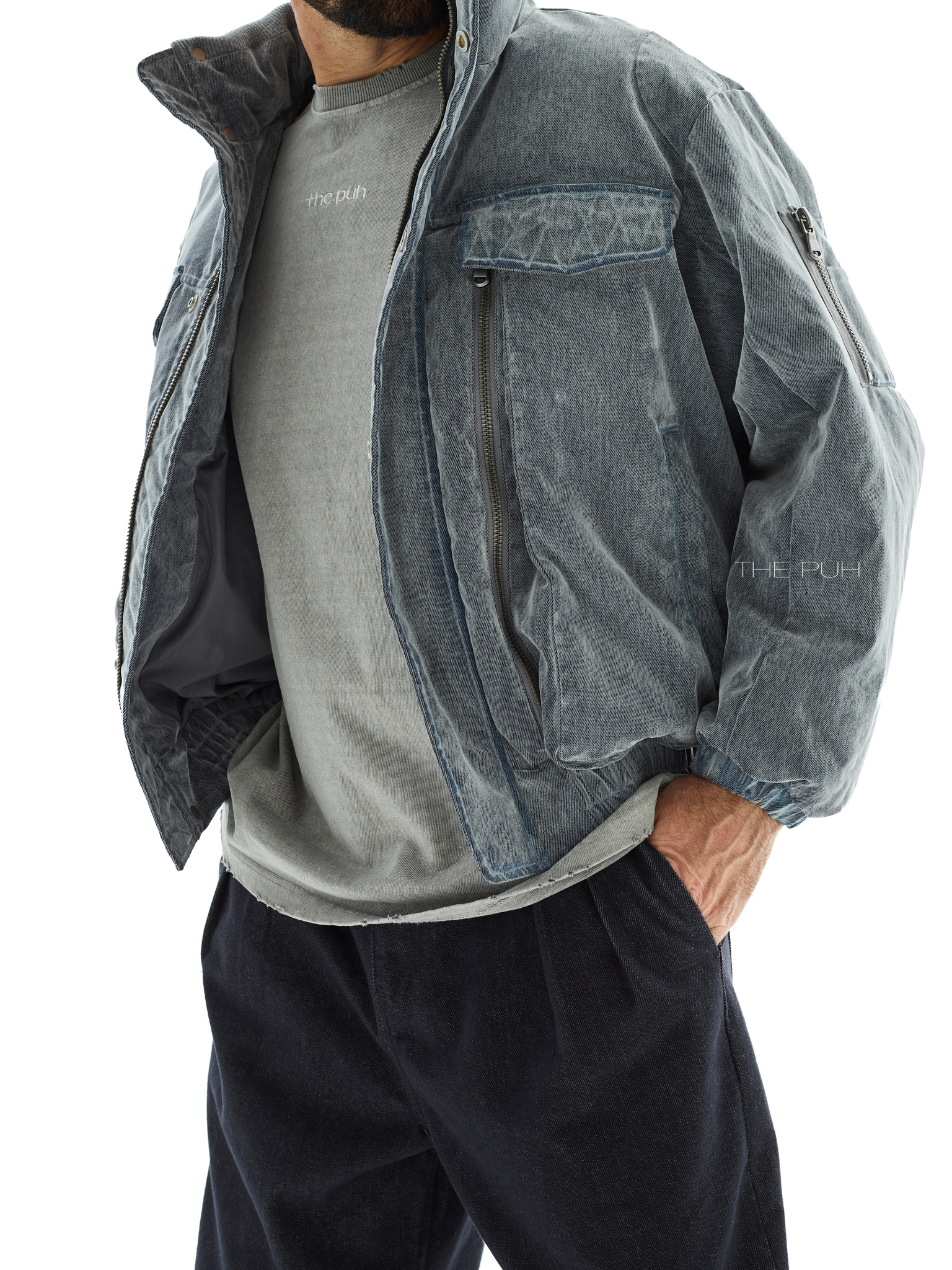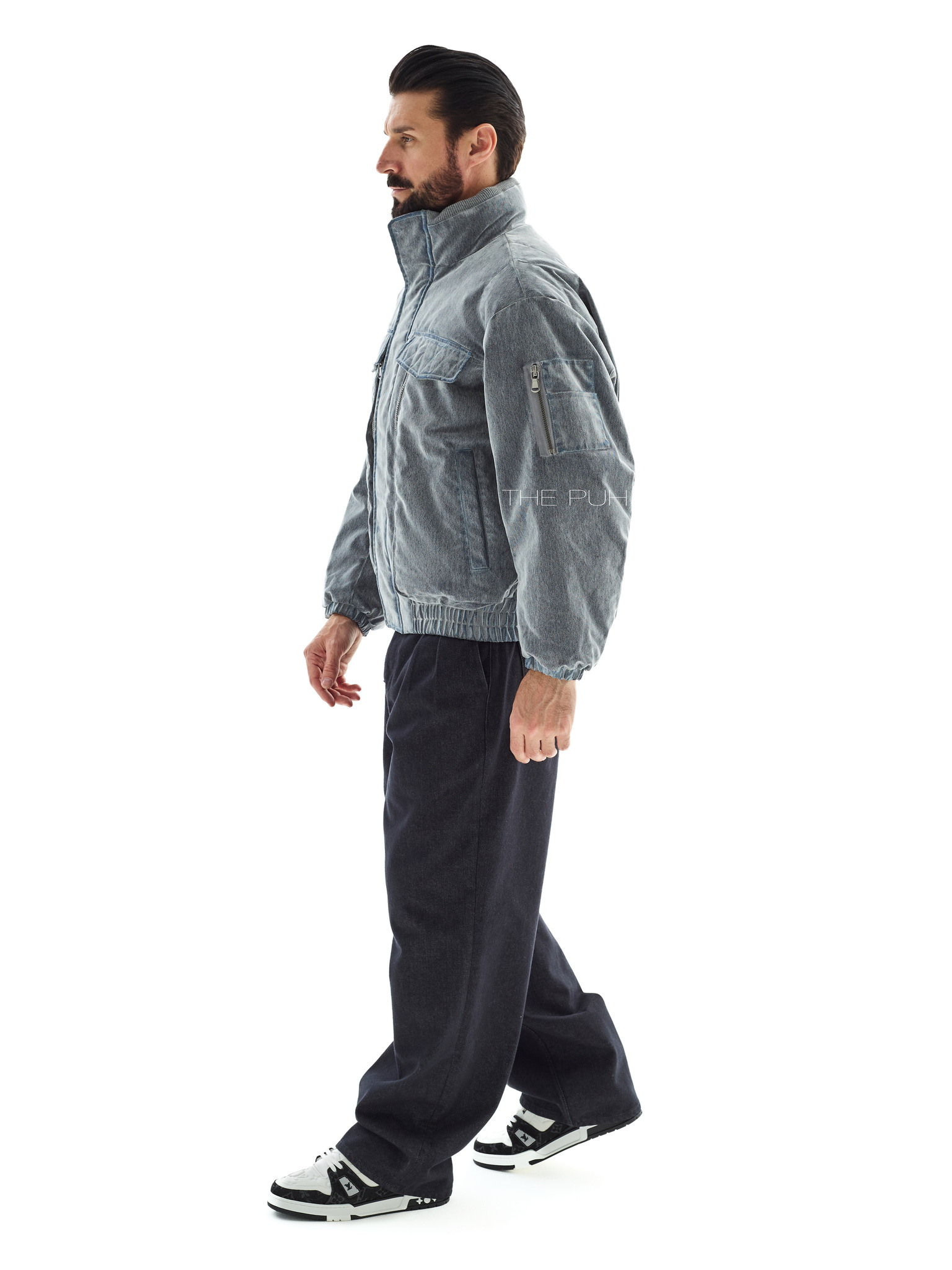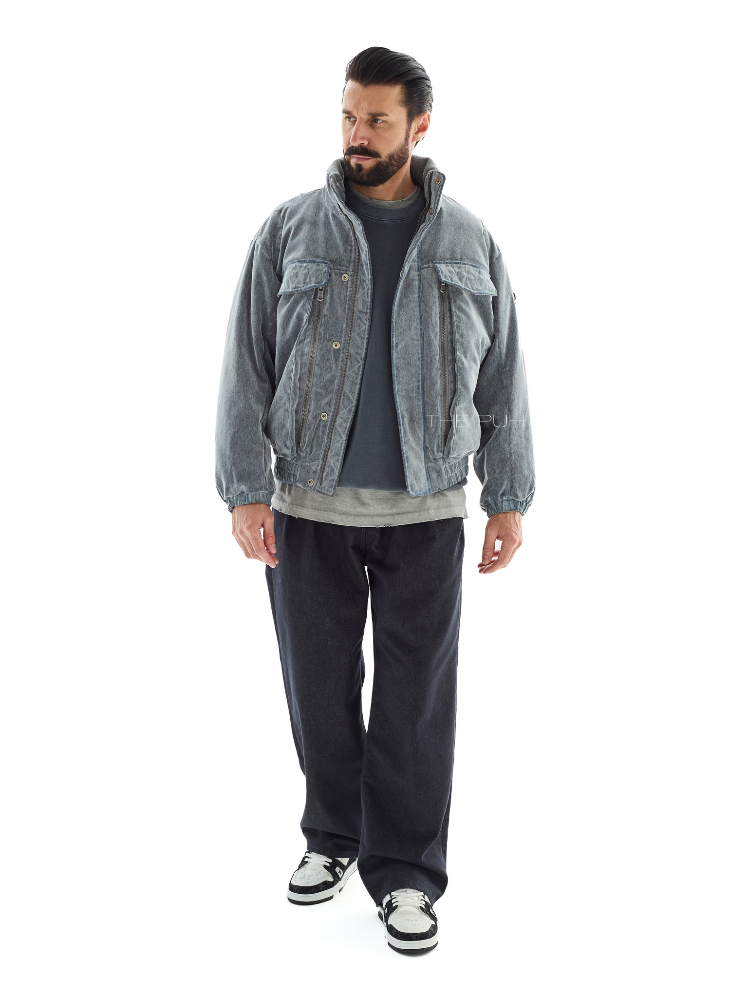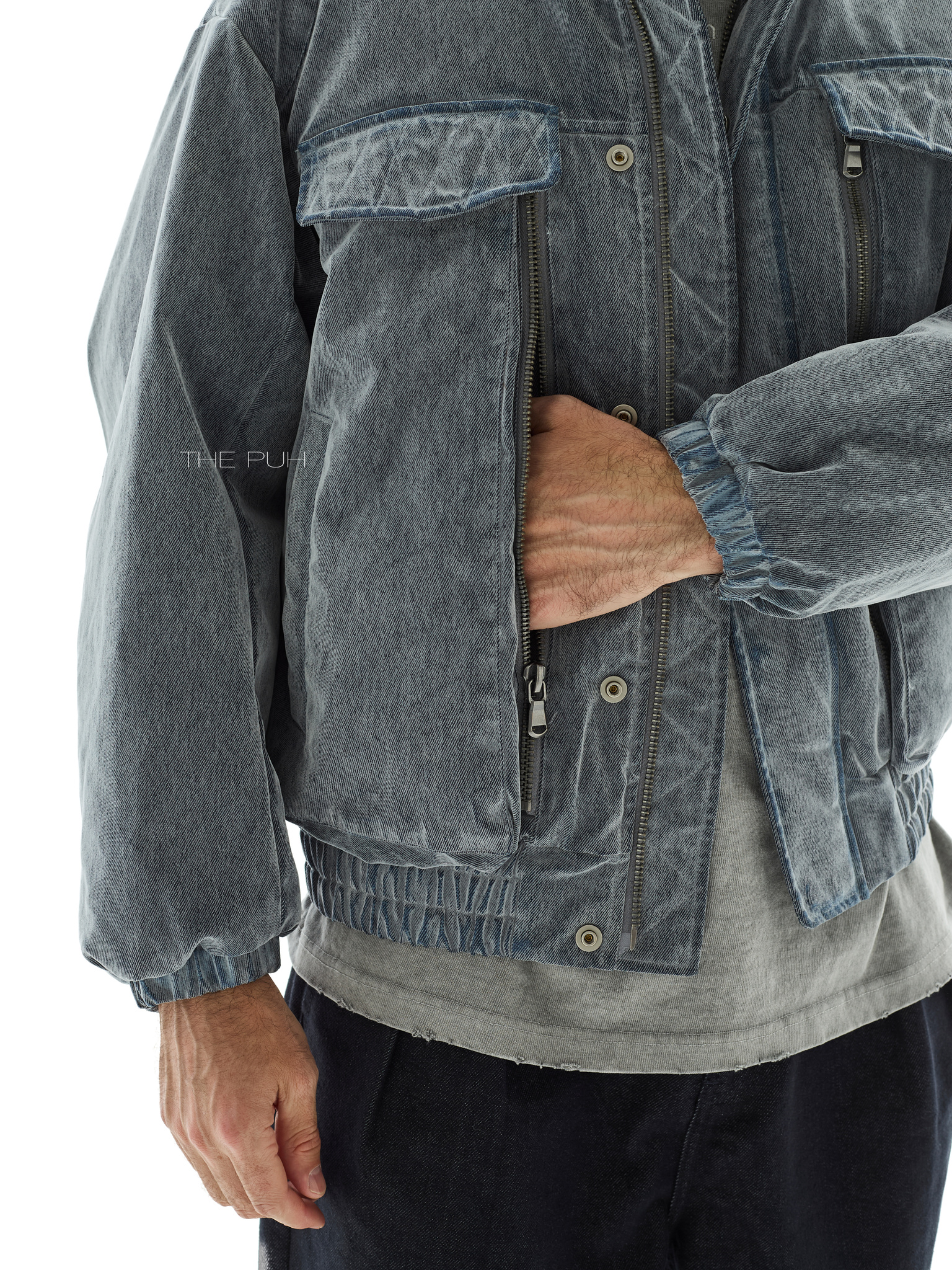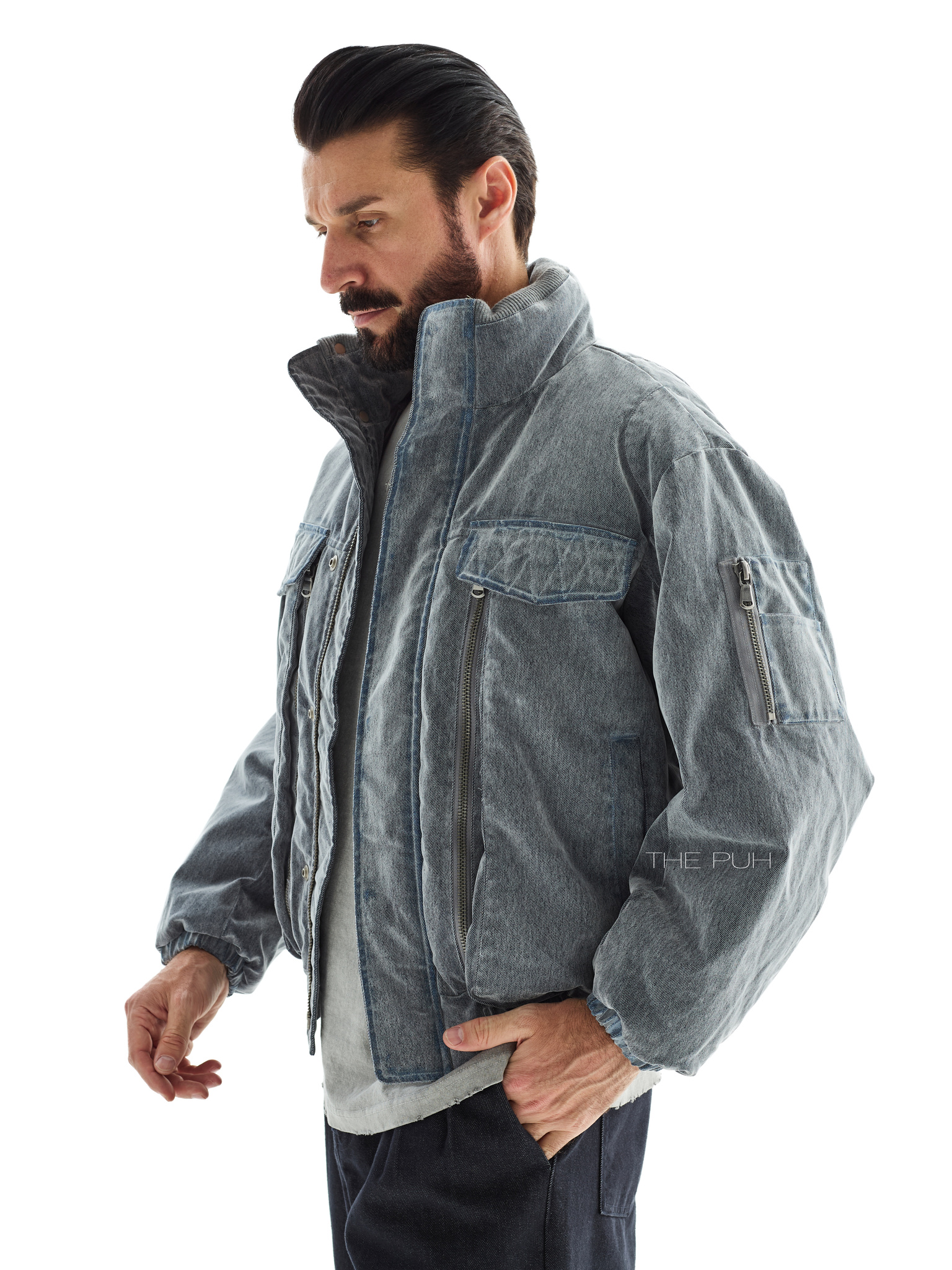 Объемный бомбер на молнии выполнен из серо-голубого денима с эффектом варки. Модель утеплена гусиным пухом и декорирована стегаными клапанами и карманами на молниях спереди.