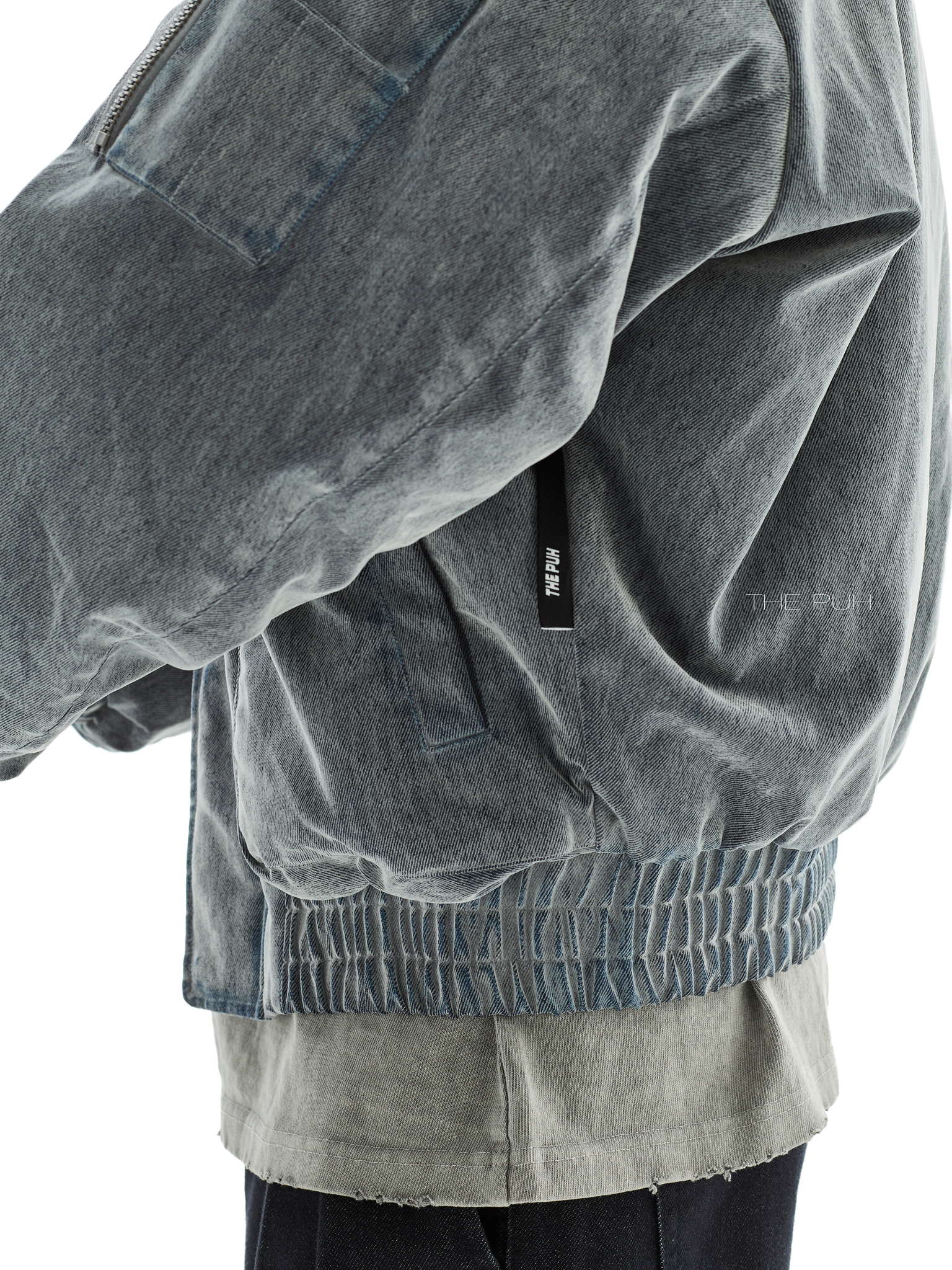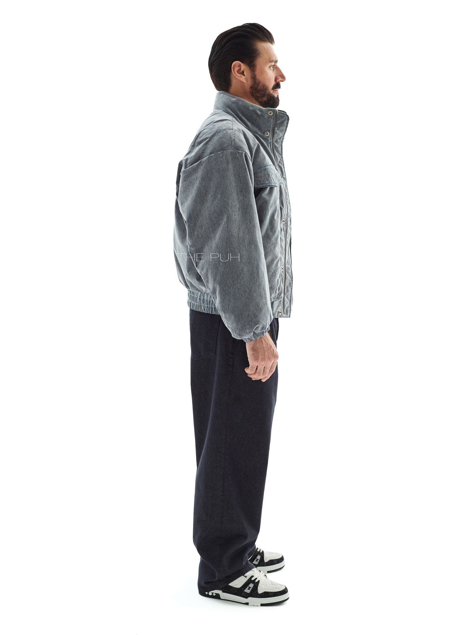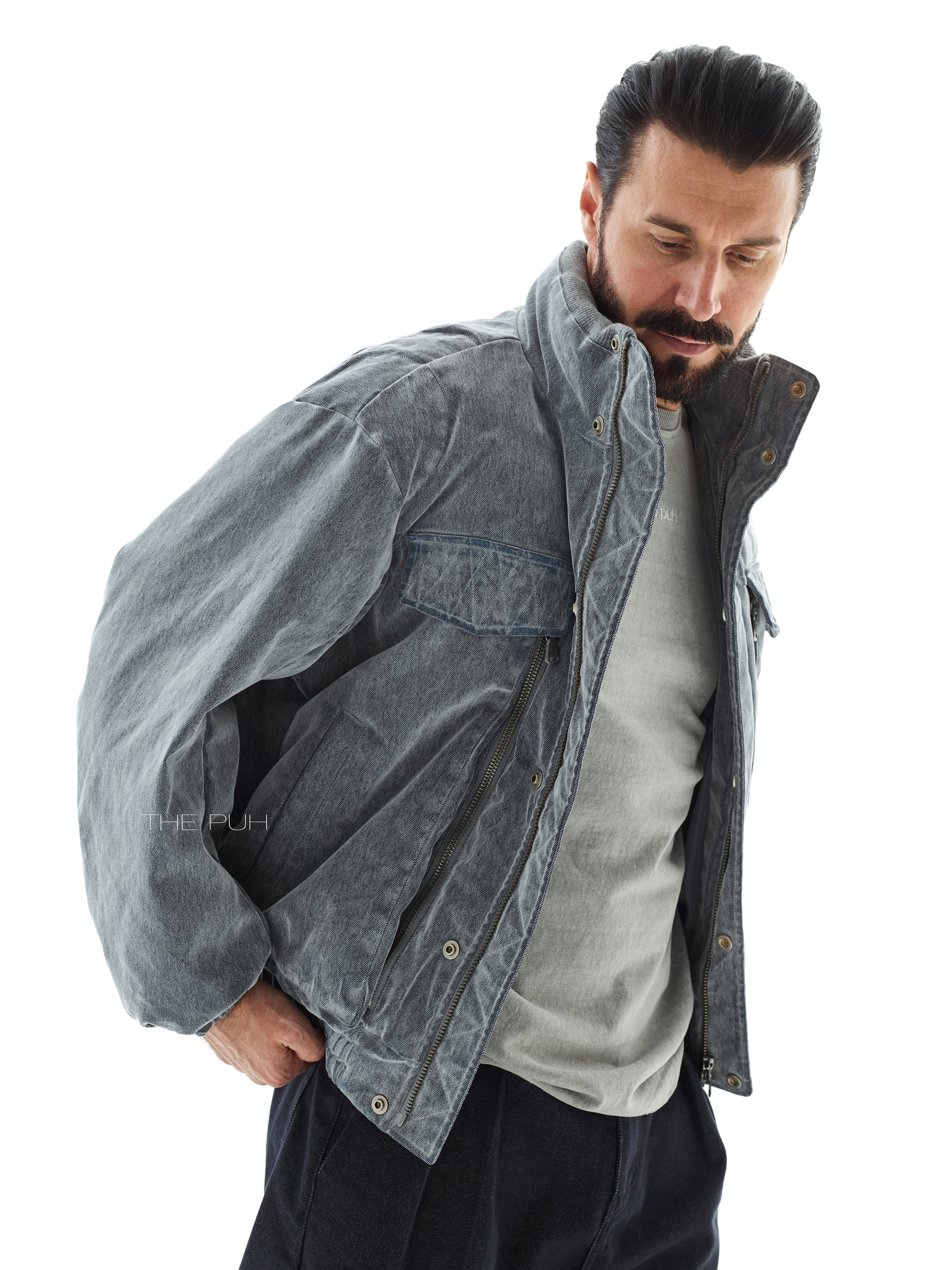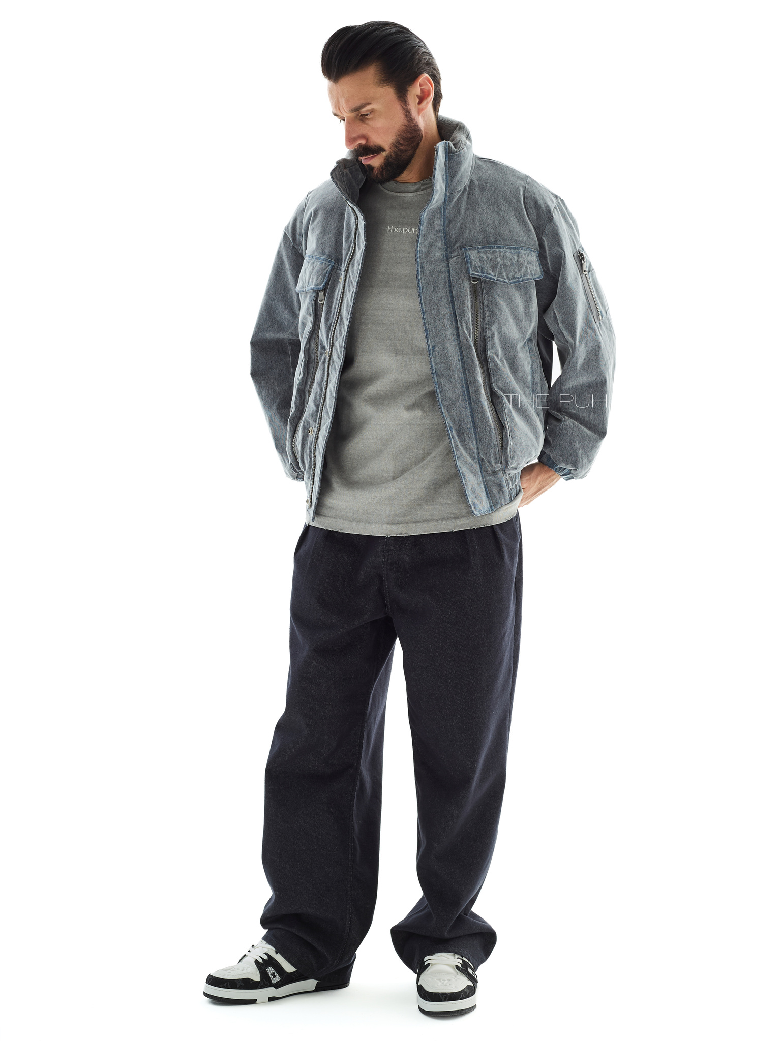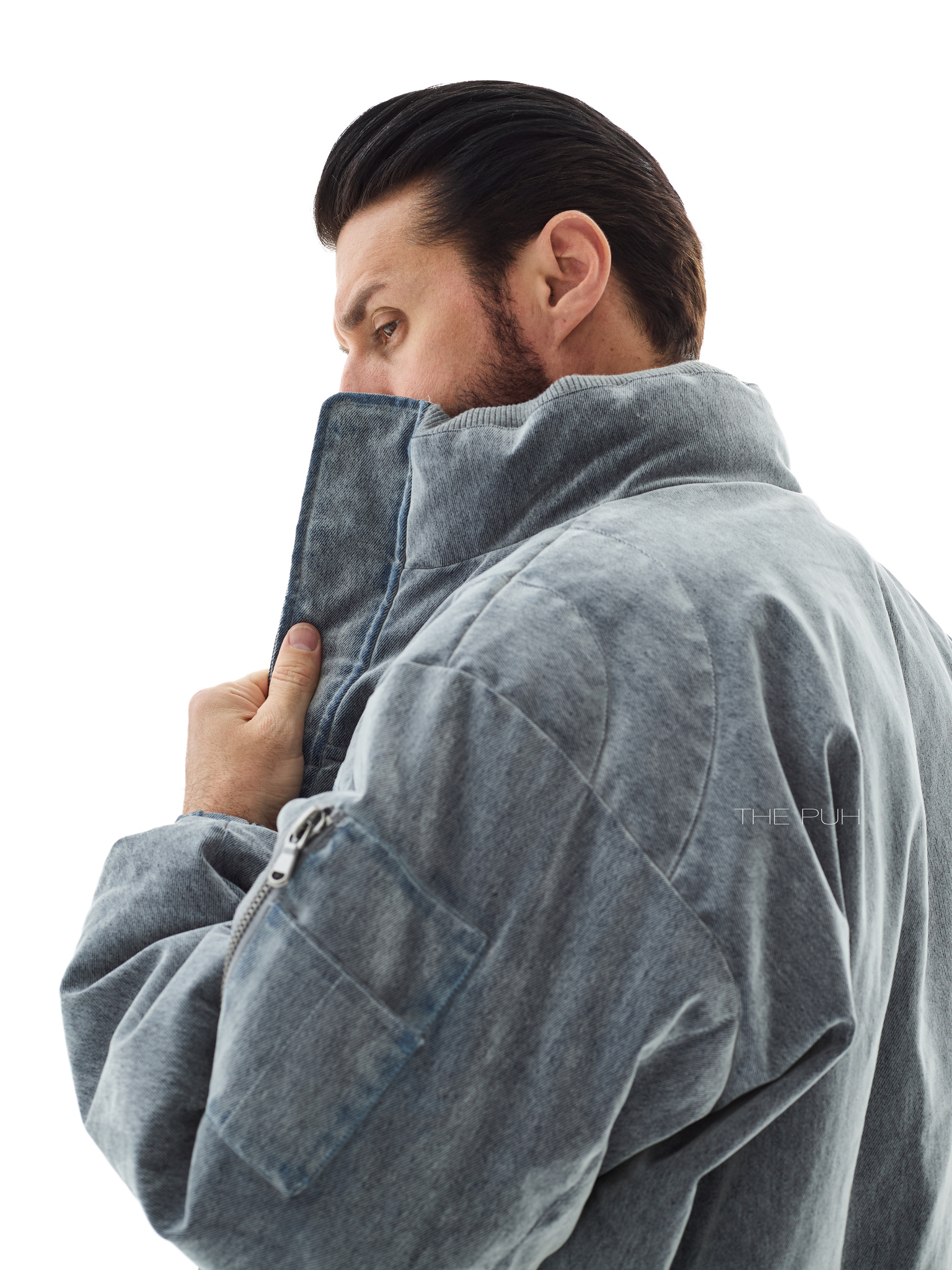 Объемный бомбер на молнии выполнен из серо-голубого денима с эффектом варки. Модель утеплена гусиным пухом и декорирована стегаными клапанами и карманами на молниях спереди.