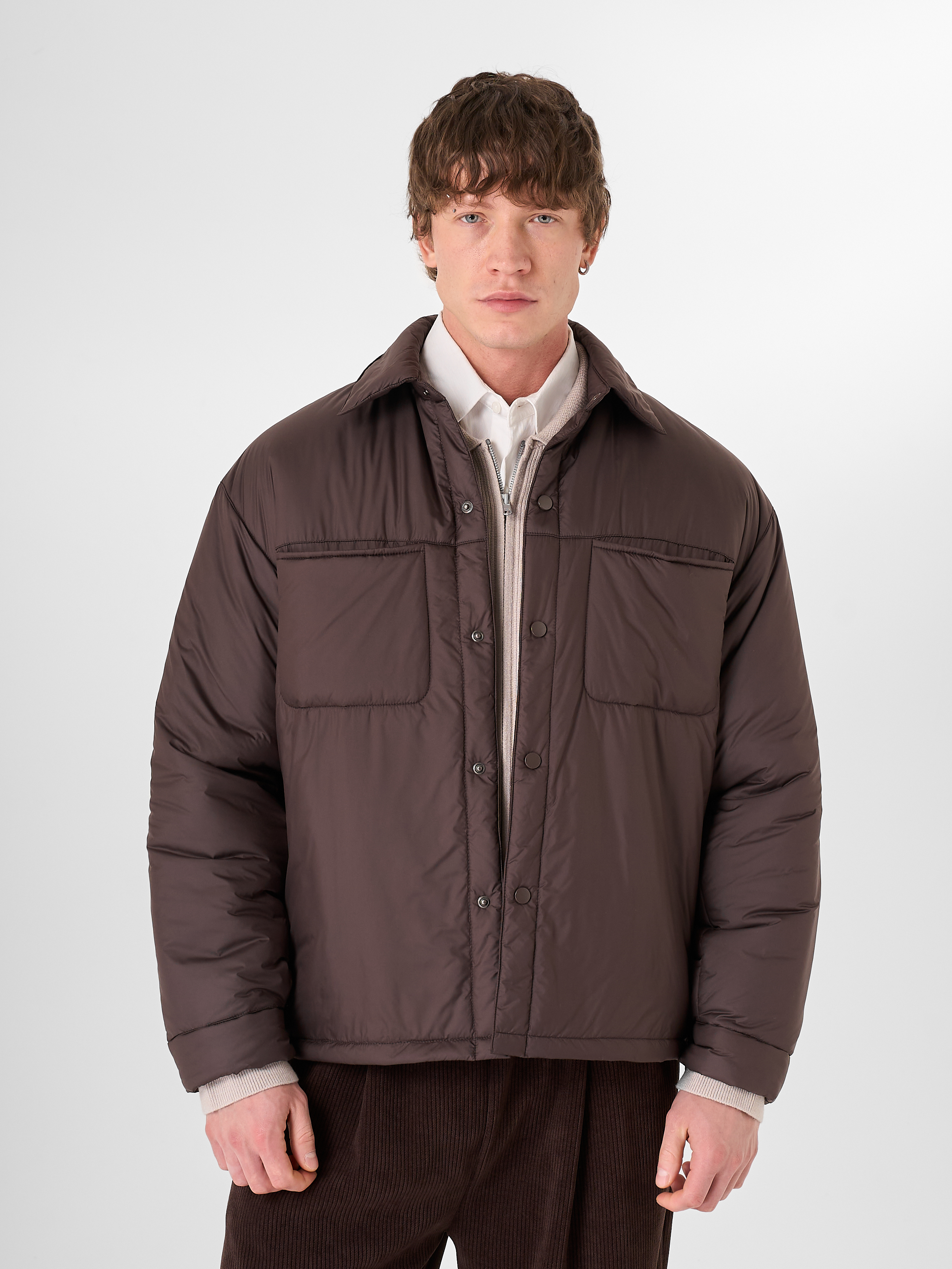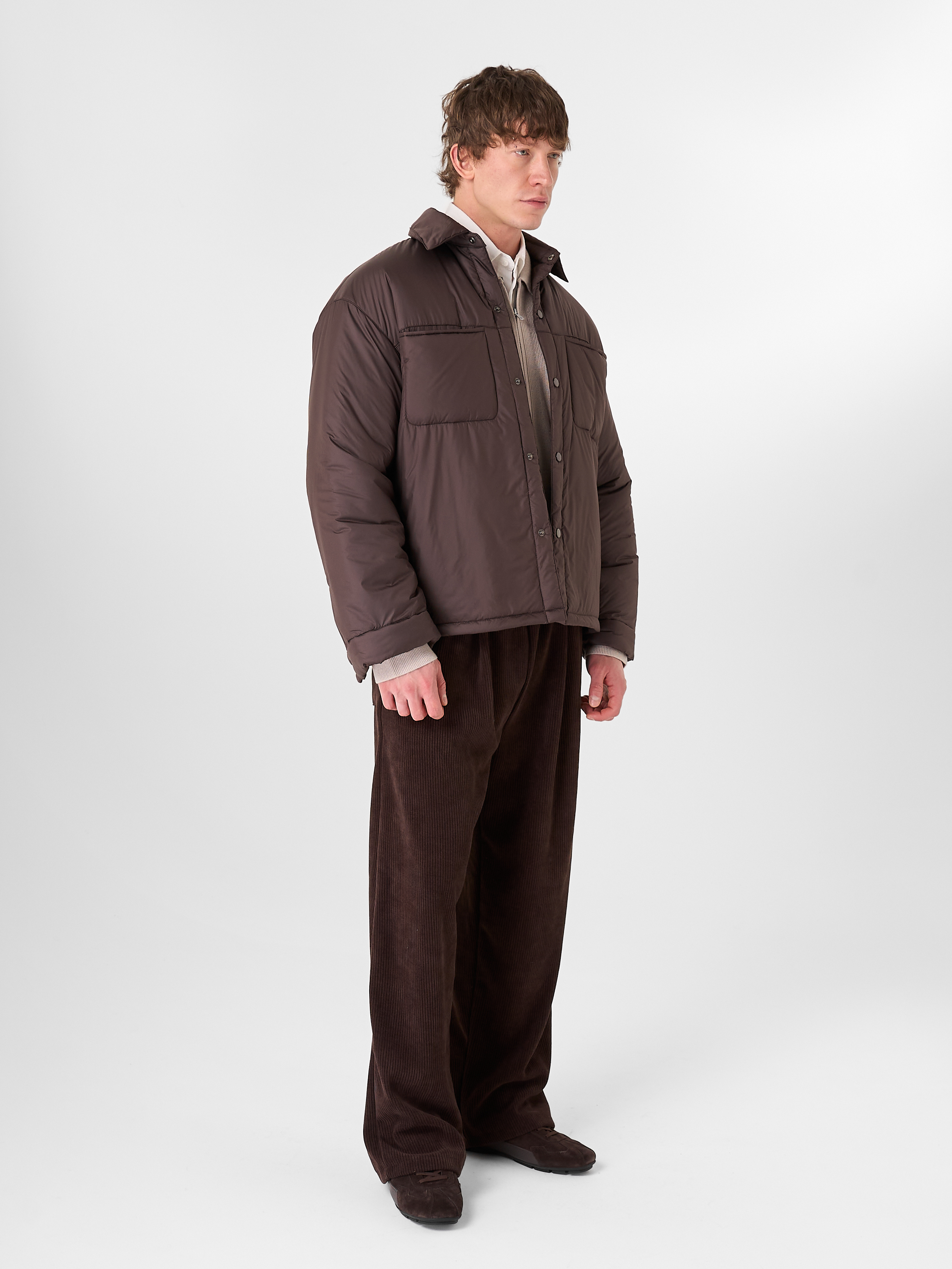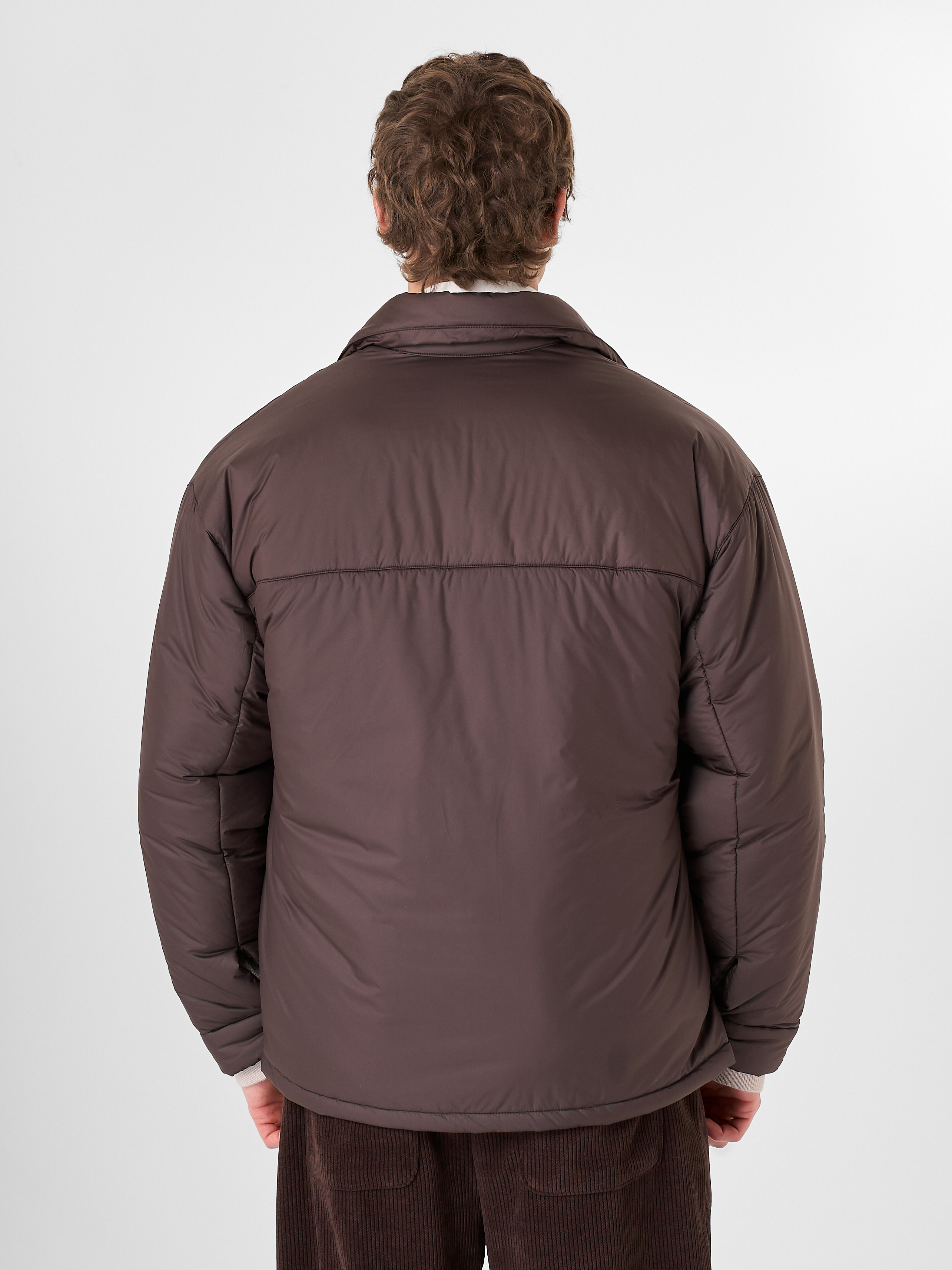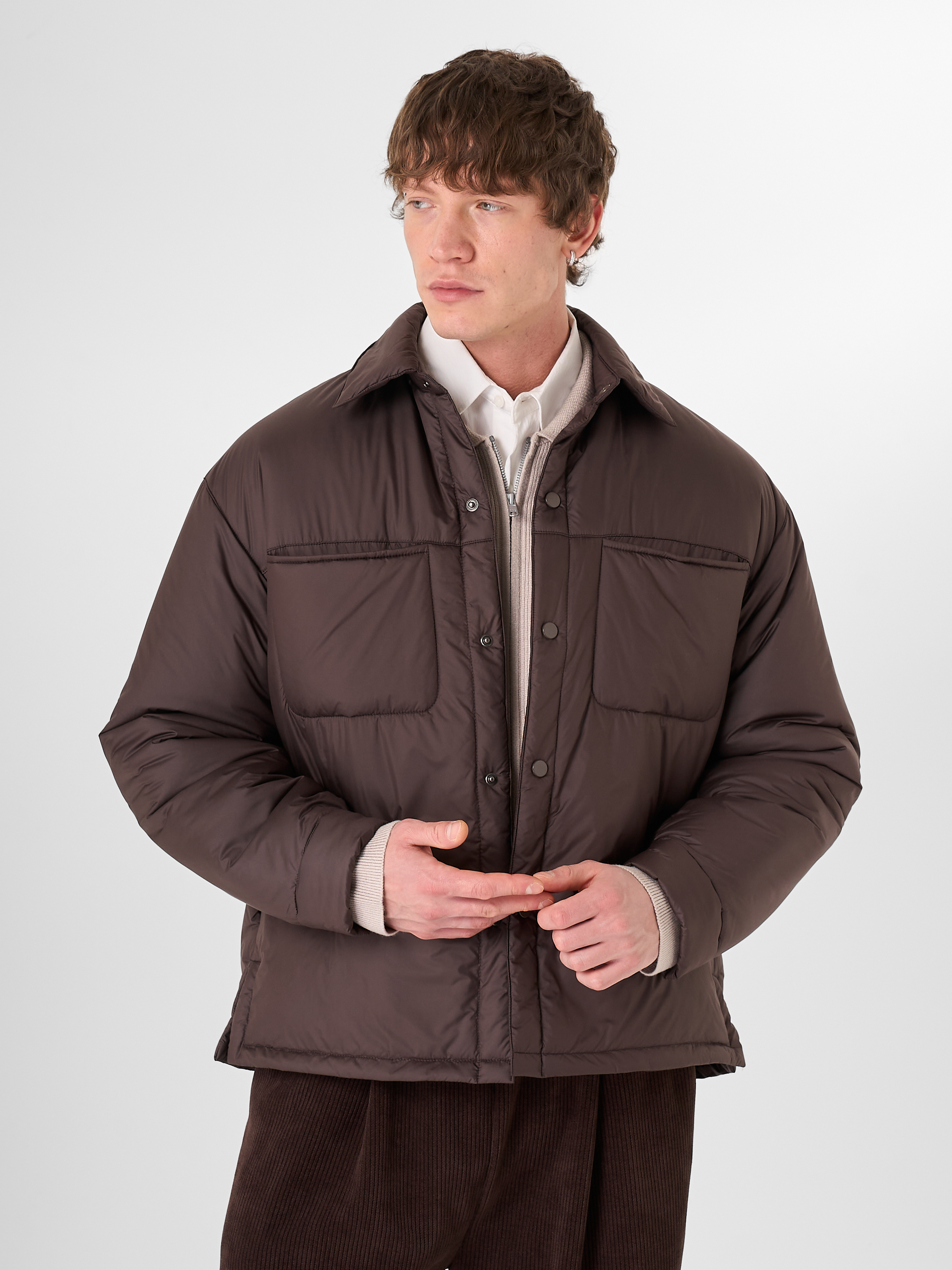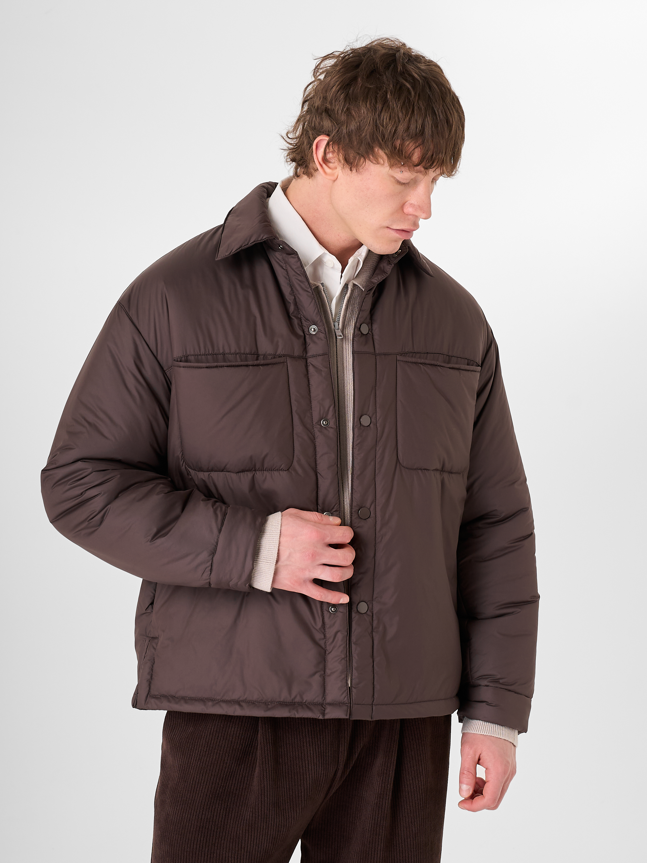 Куртка-рубашка шоколадного цвета утеплена натуральным гусиным пухом. Модель прямого кроя на кнопках с отложным воротником и двумя нагрудными карманами.
