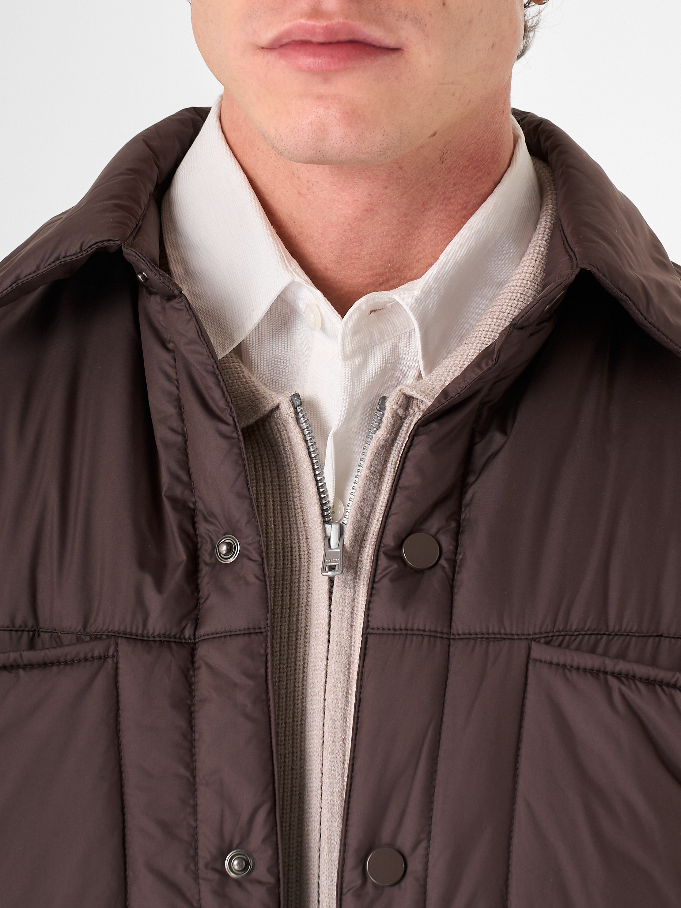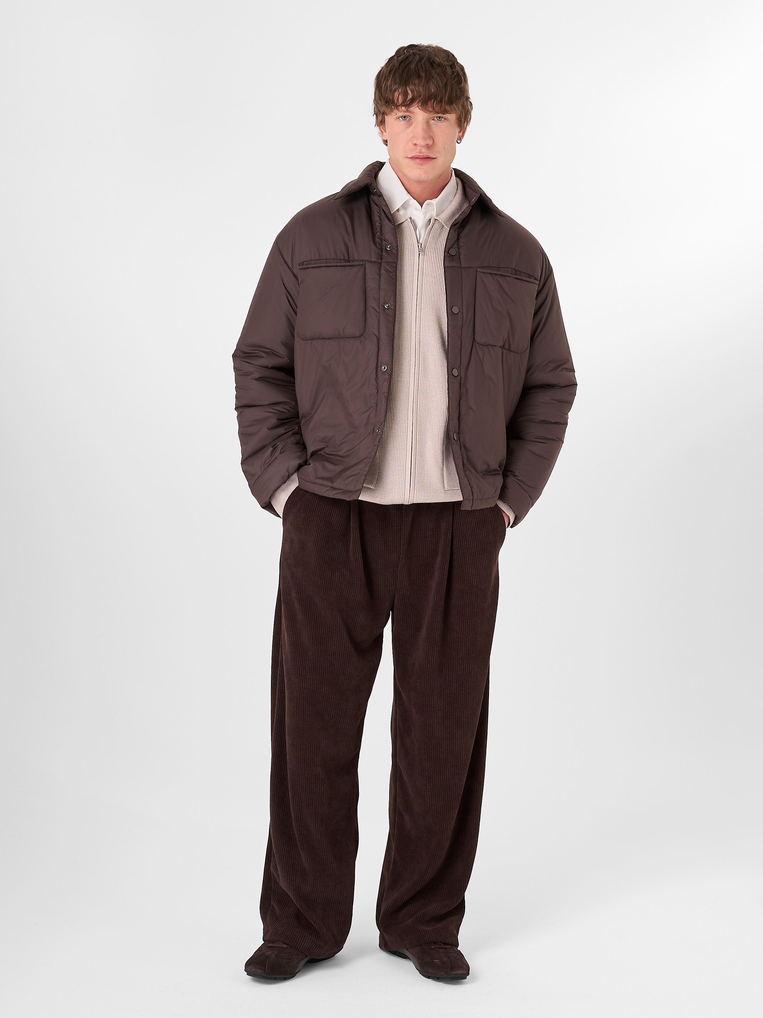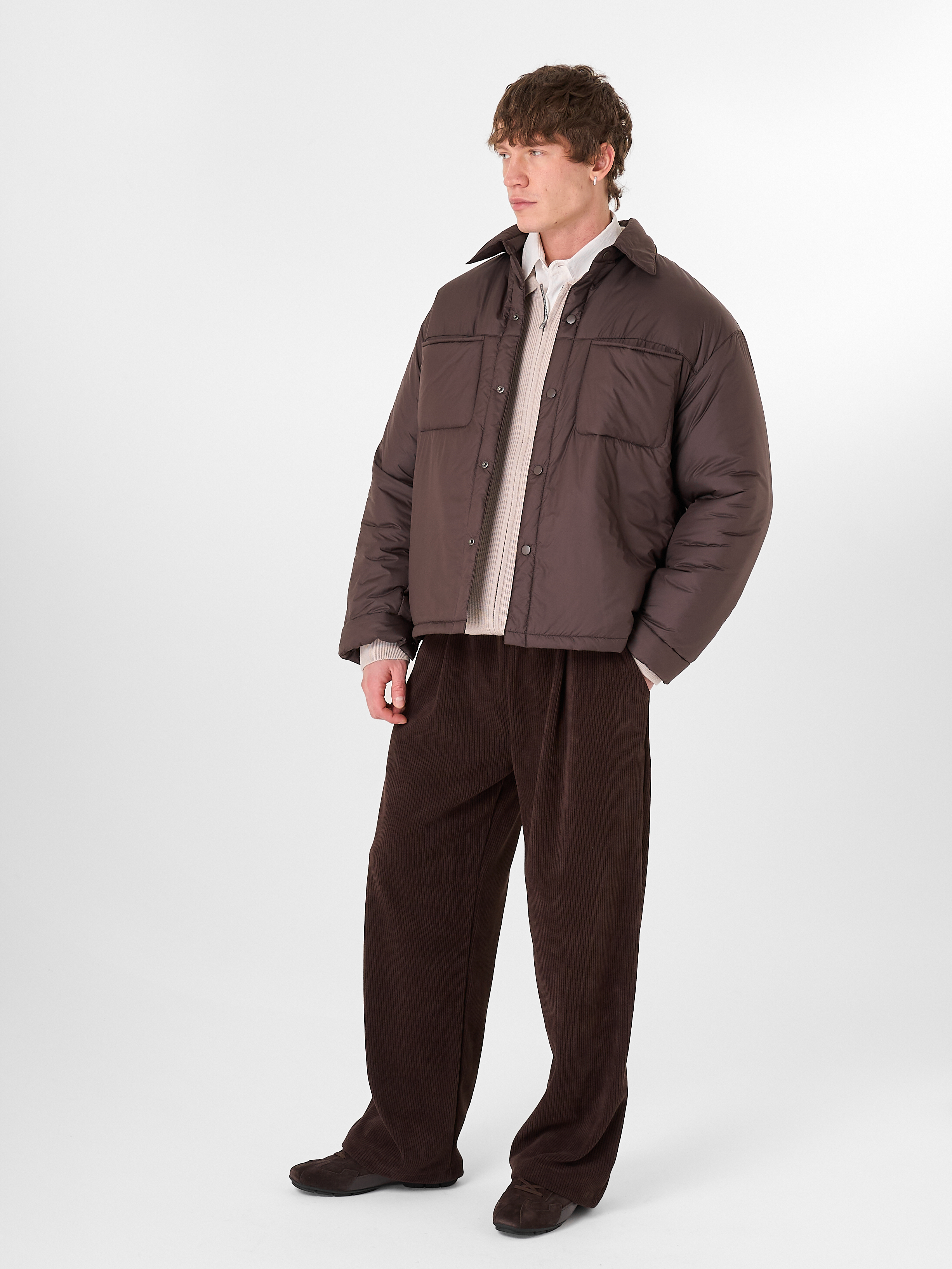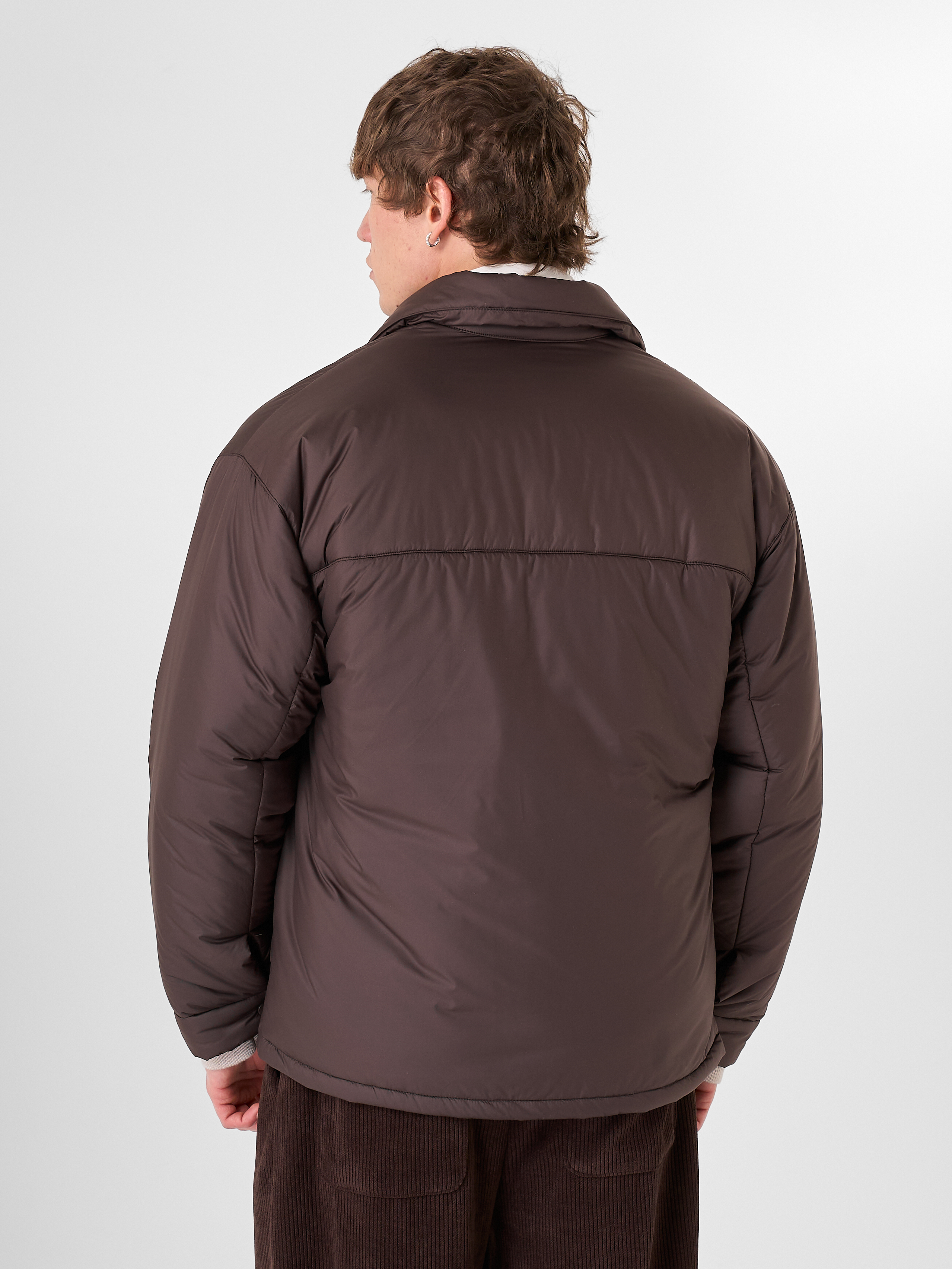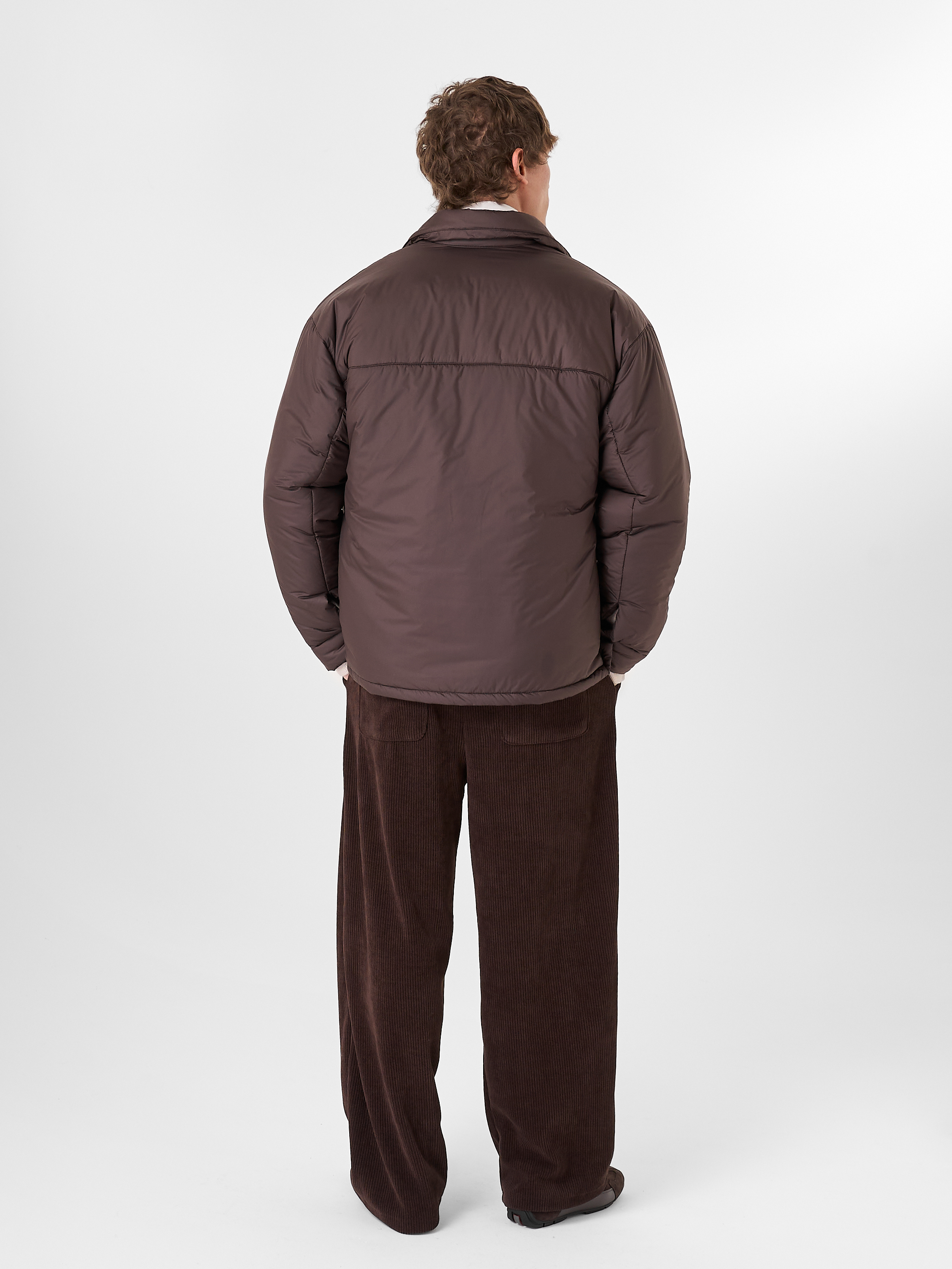 Куртка-рубашка шоколадного цвета утеплена натуральным гусиным пухом. Модель прямого кроя на кнопках с отложным воротником и двумя нагрудными карманами.