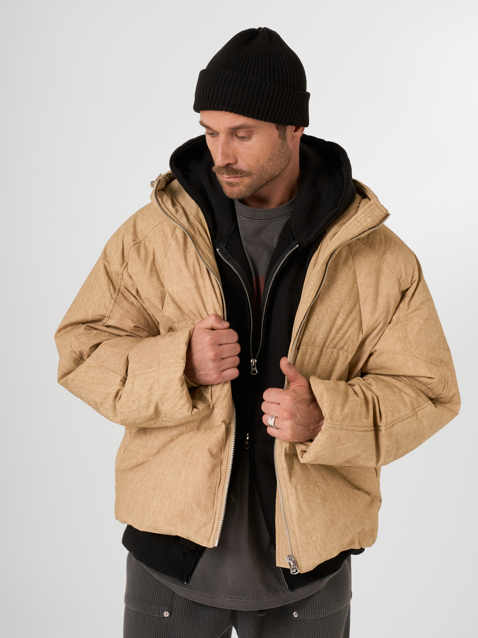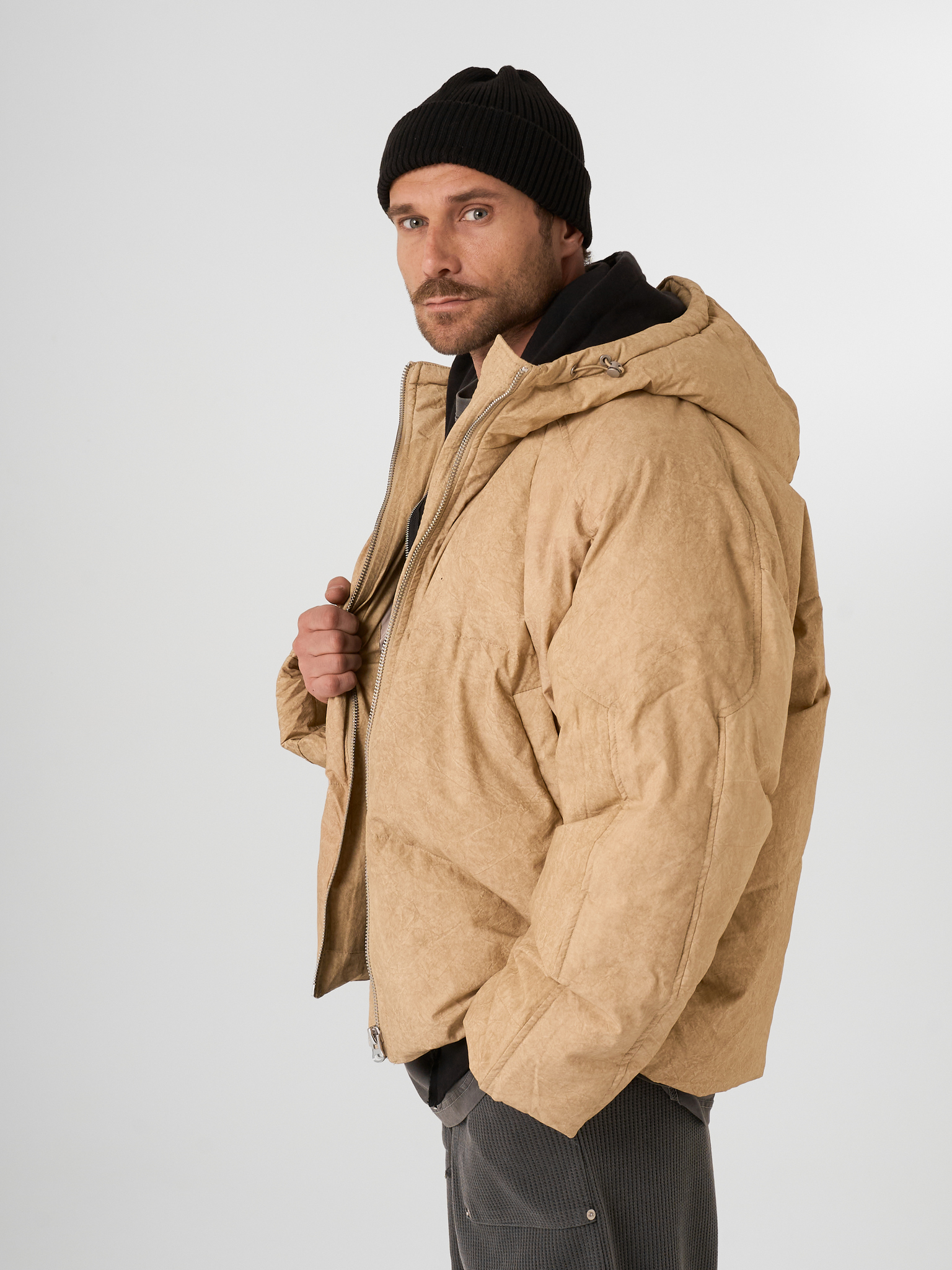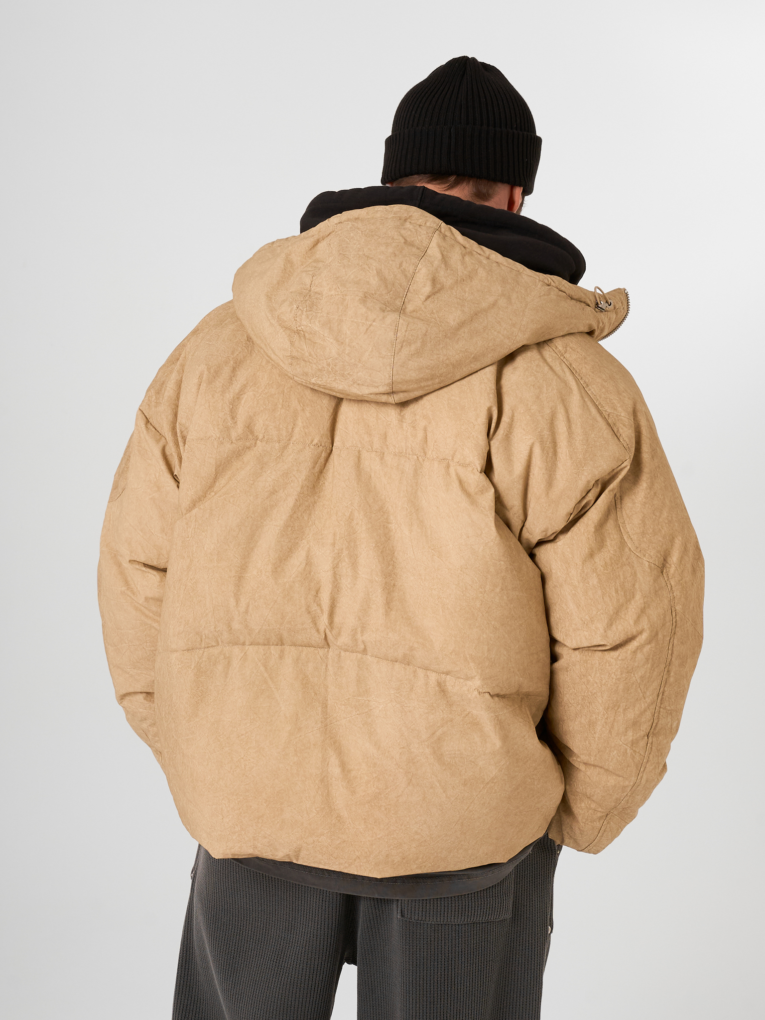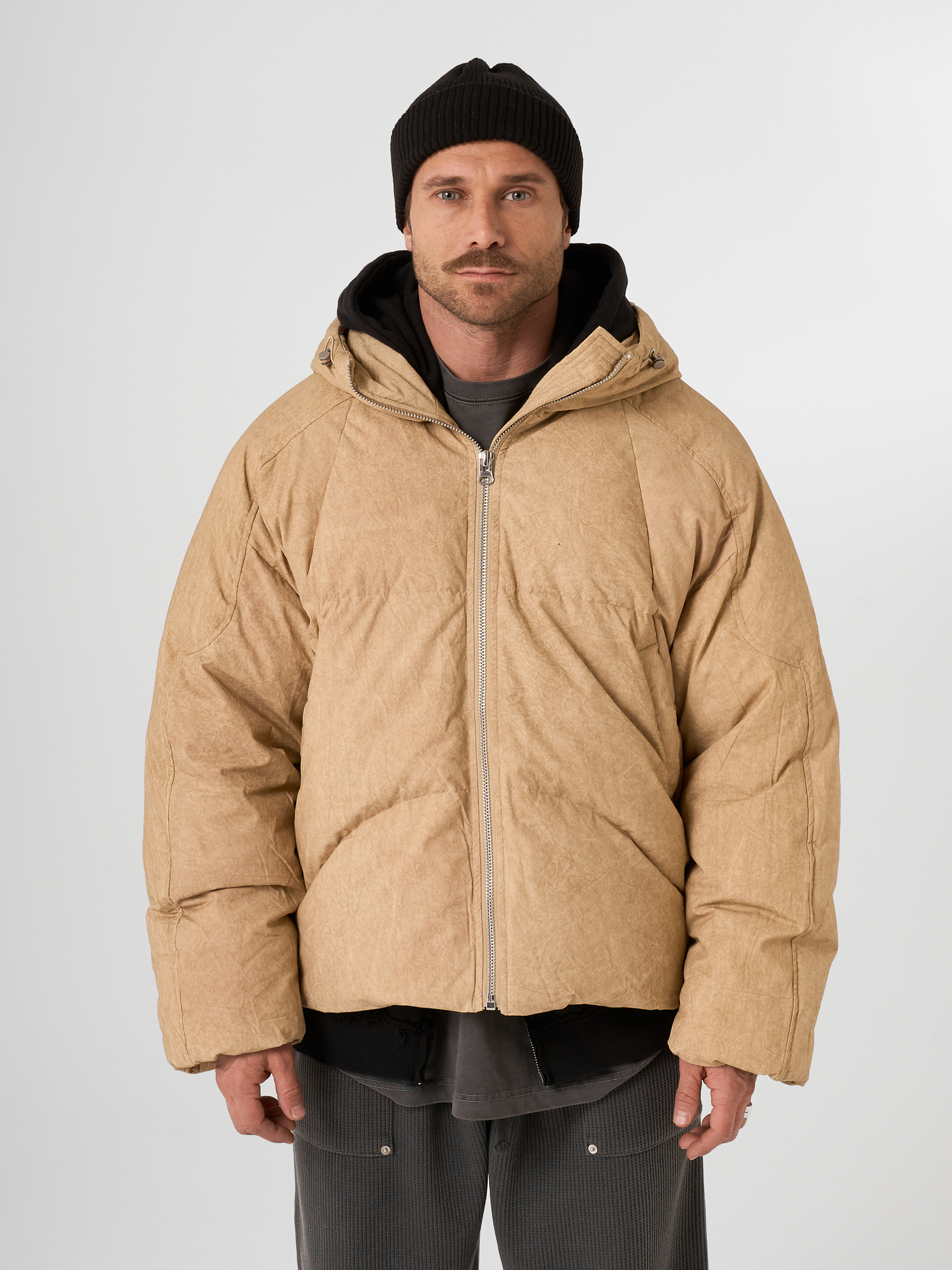 Объемный бежевый пуховик выполнен из матового текстиля и улеплен натуральным гусиным пухом. Модель на молнии с капюшоном.