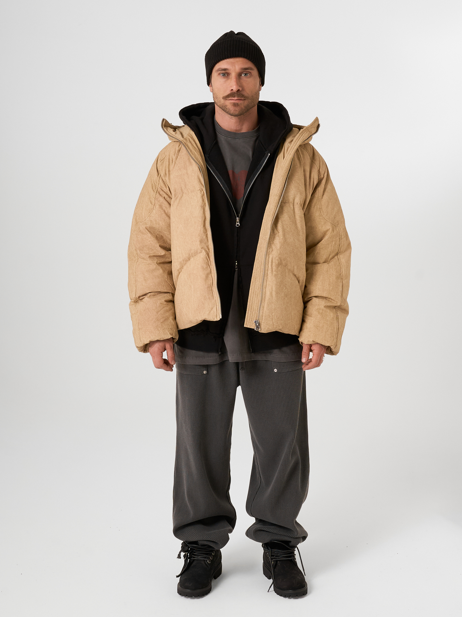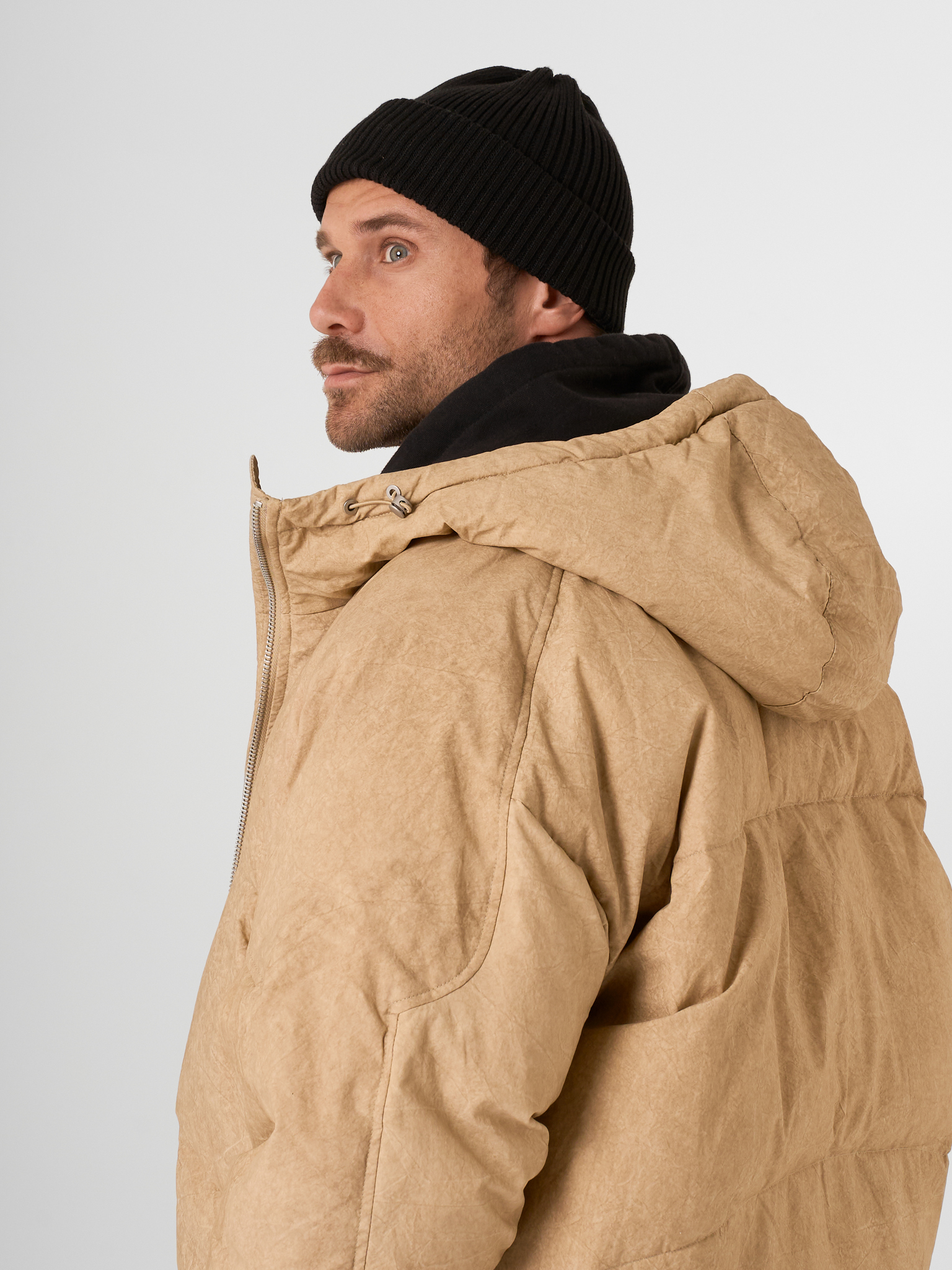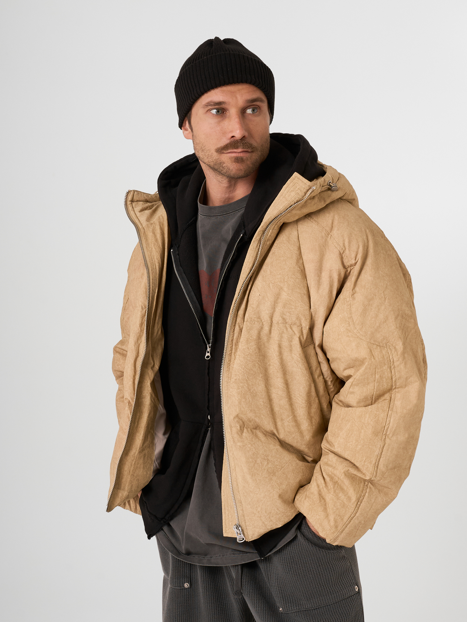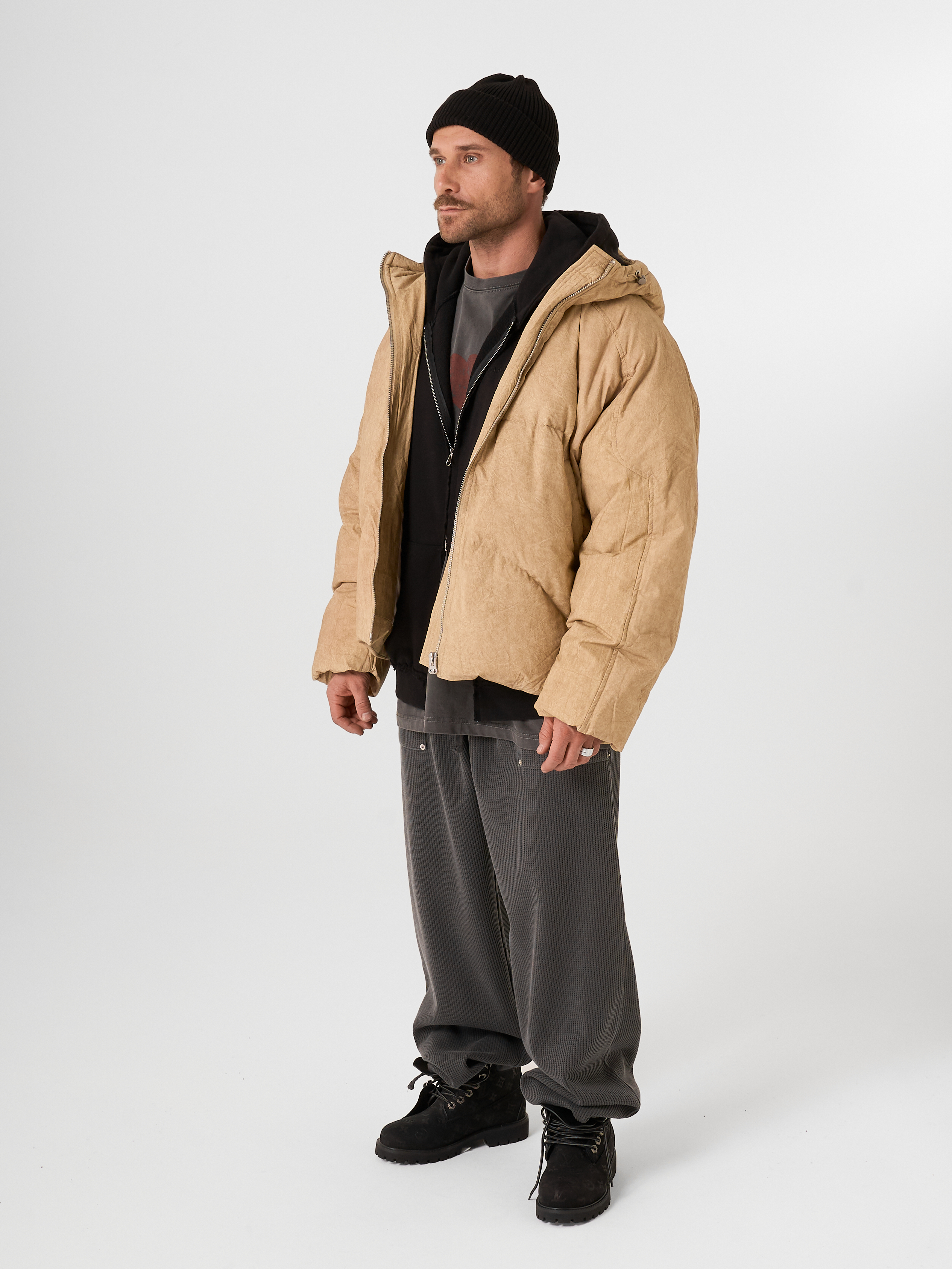 Объемный бежевый пуховик выполнен из матового текстиля и улеплен натуральным гусиным пухом. Модель на молнии с капюшоном.