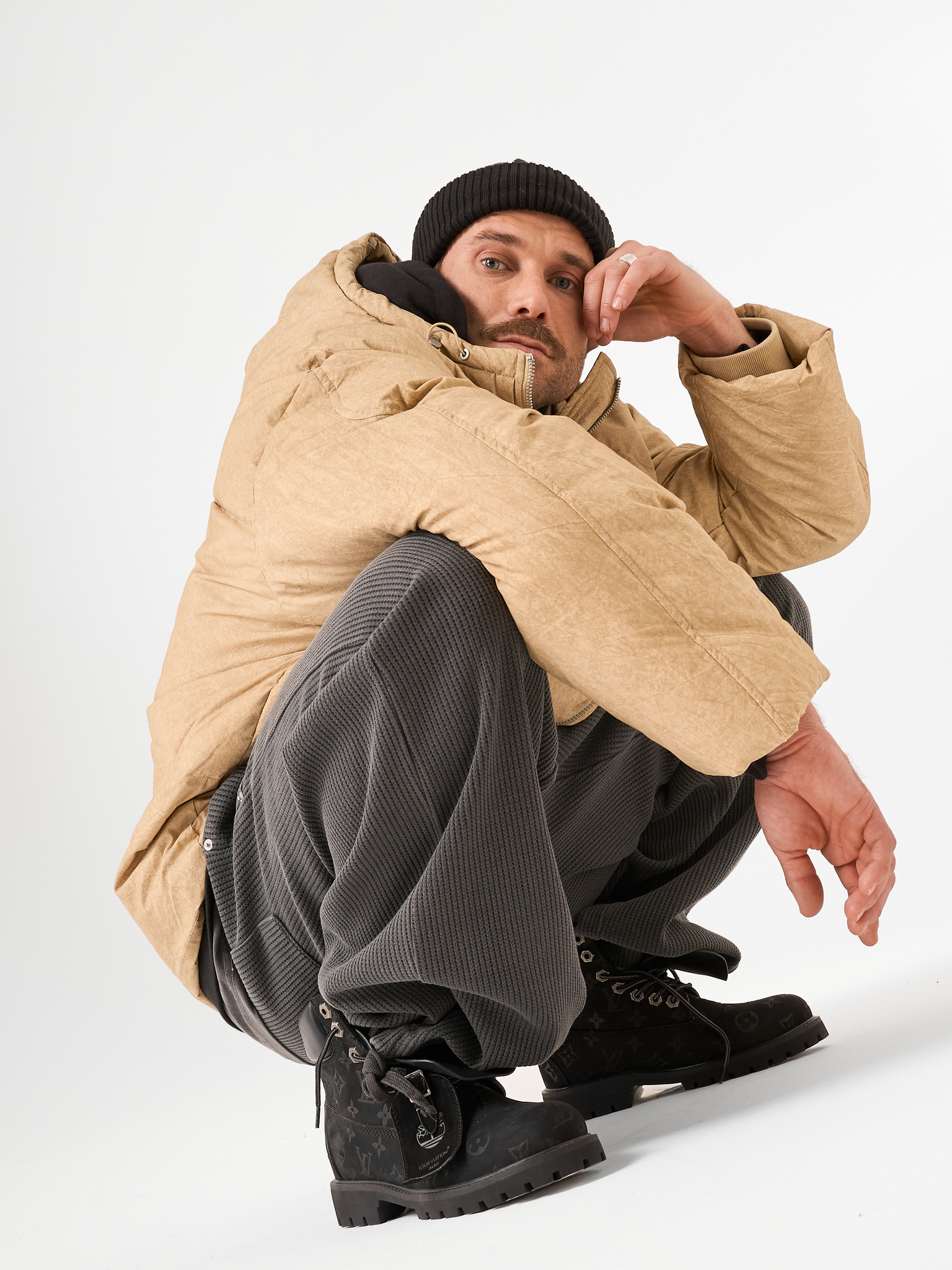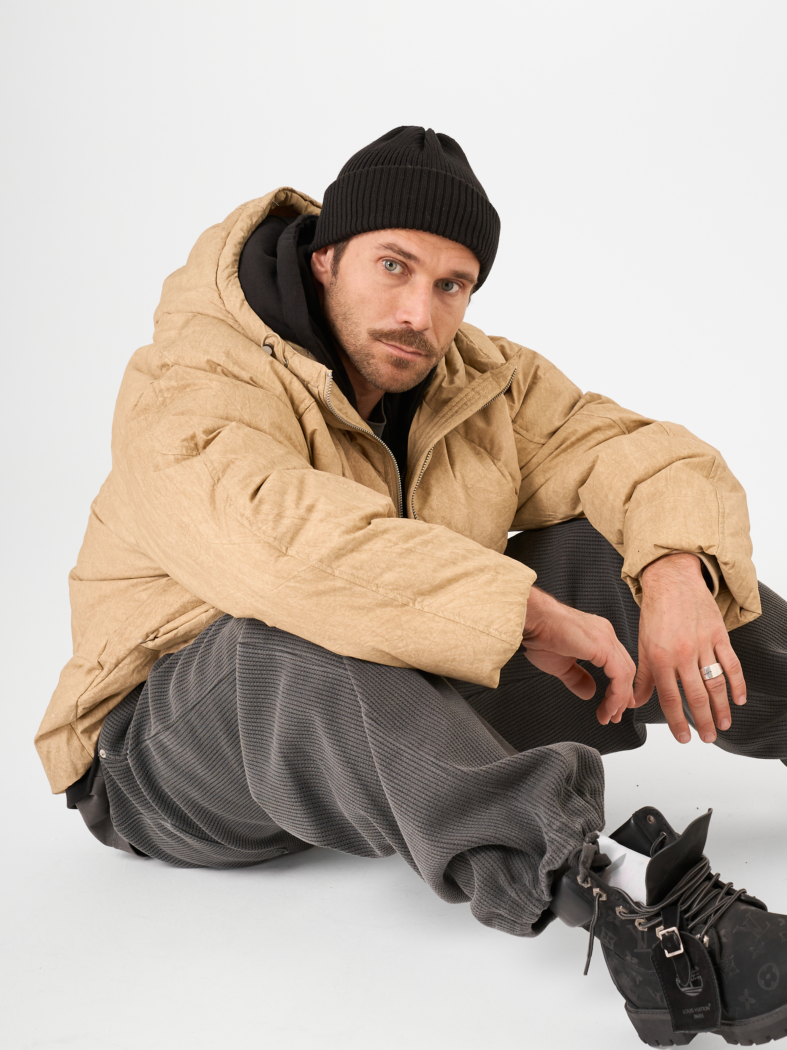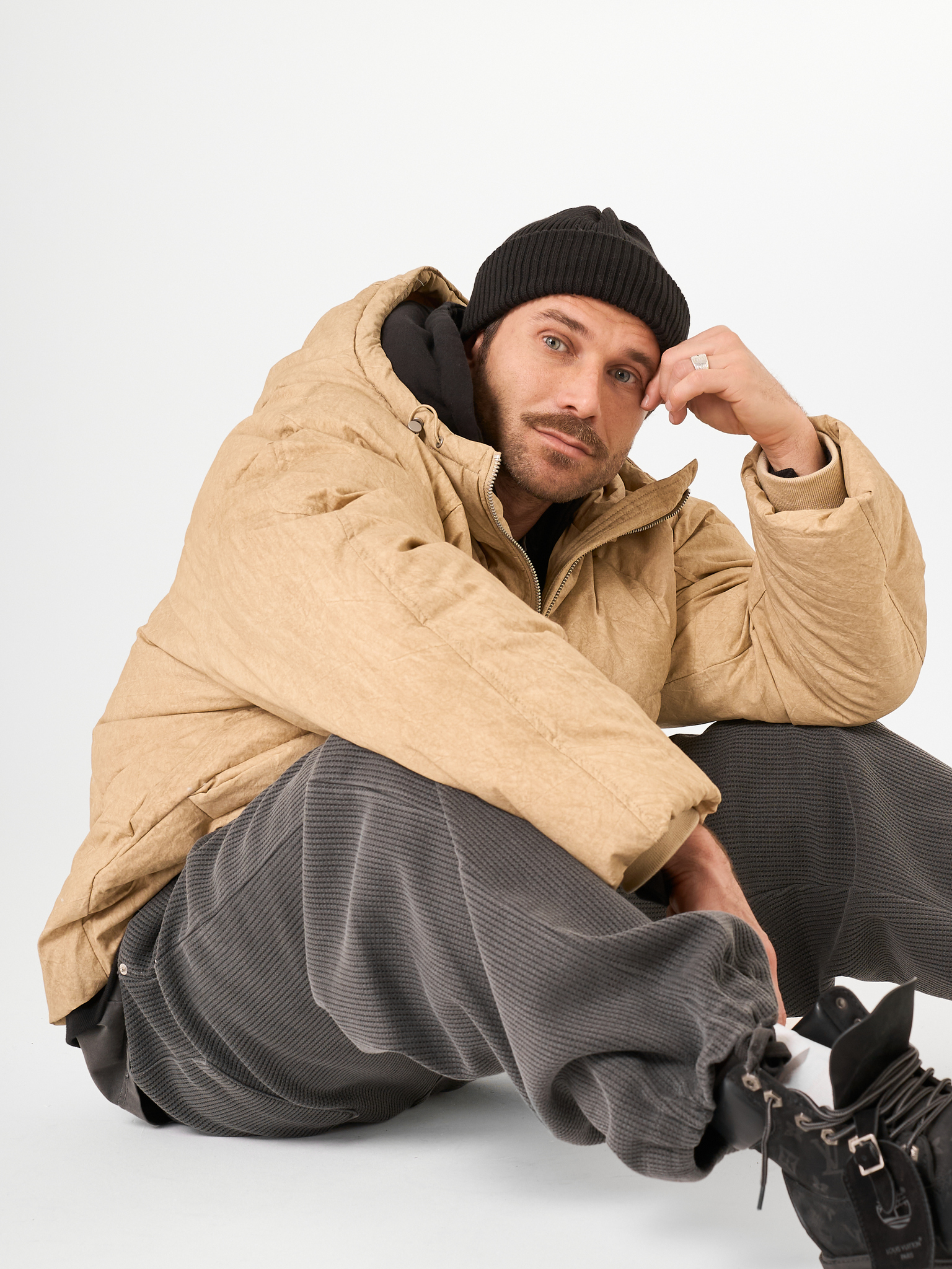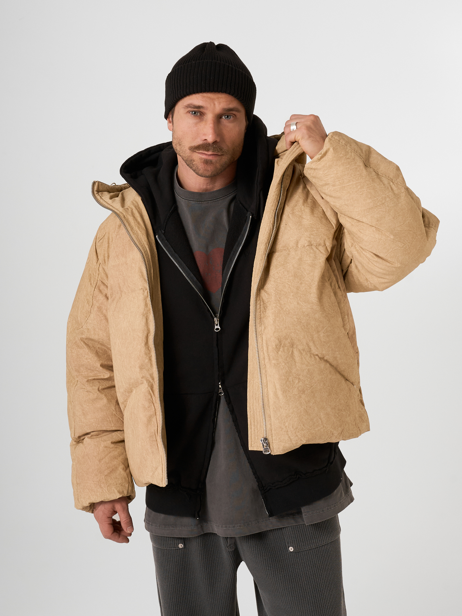 Объемный бежевый пуховик выполнен из матового текстиля и улеплен натуральным гусиным пухом. Модель на молнии с капюшоном.